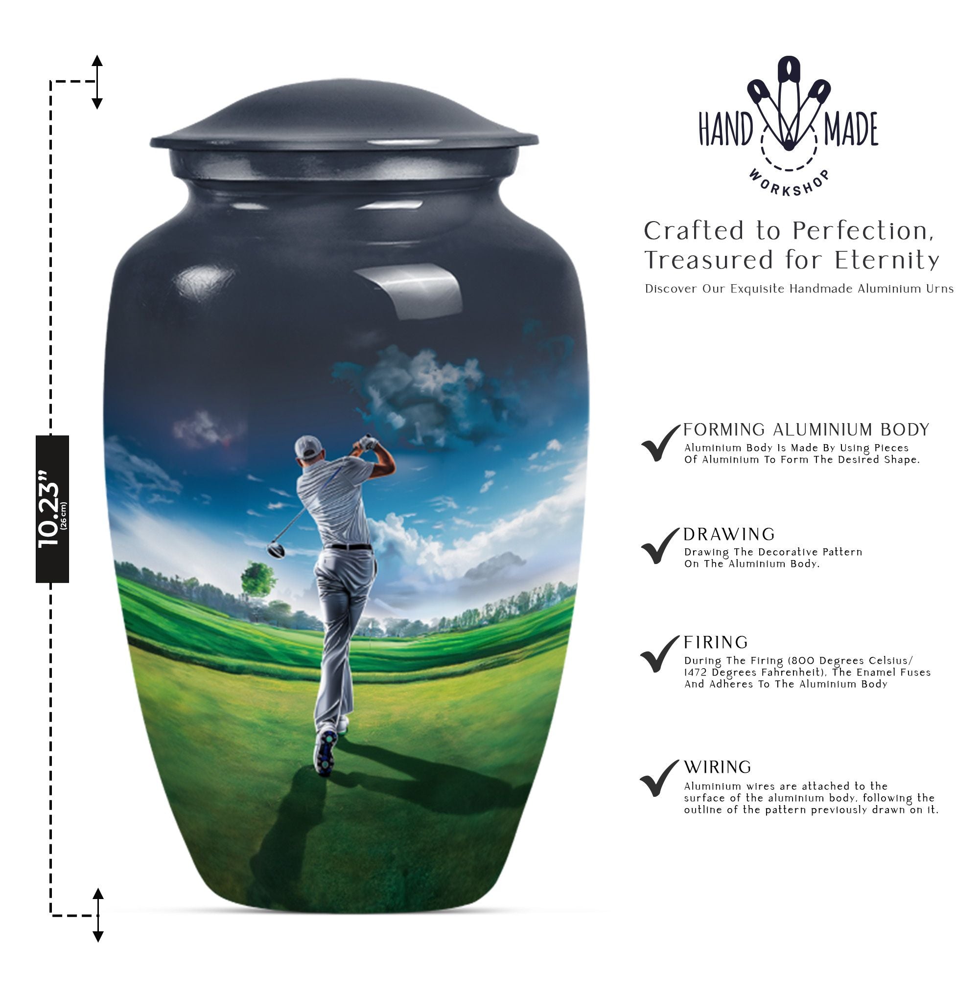 Expertly crafted with care and precision, this urn blends elegance with durability. Made from high-quality aluminium, its refined design captures the spirit of a devoted dad who loved golf. Ideal as urns for adult male dad or urn for ashes adult male dad, it features a secure screw-top lid and a smooth finish, making it both functional and stylish. Its size accommodates urns adult male small, ensuring it fits seamlessly in any memorial display.
