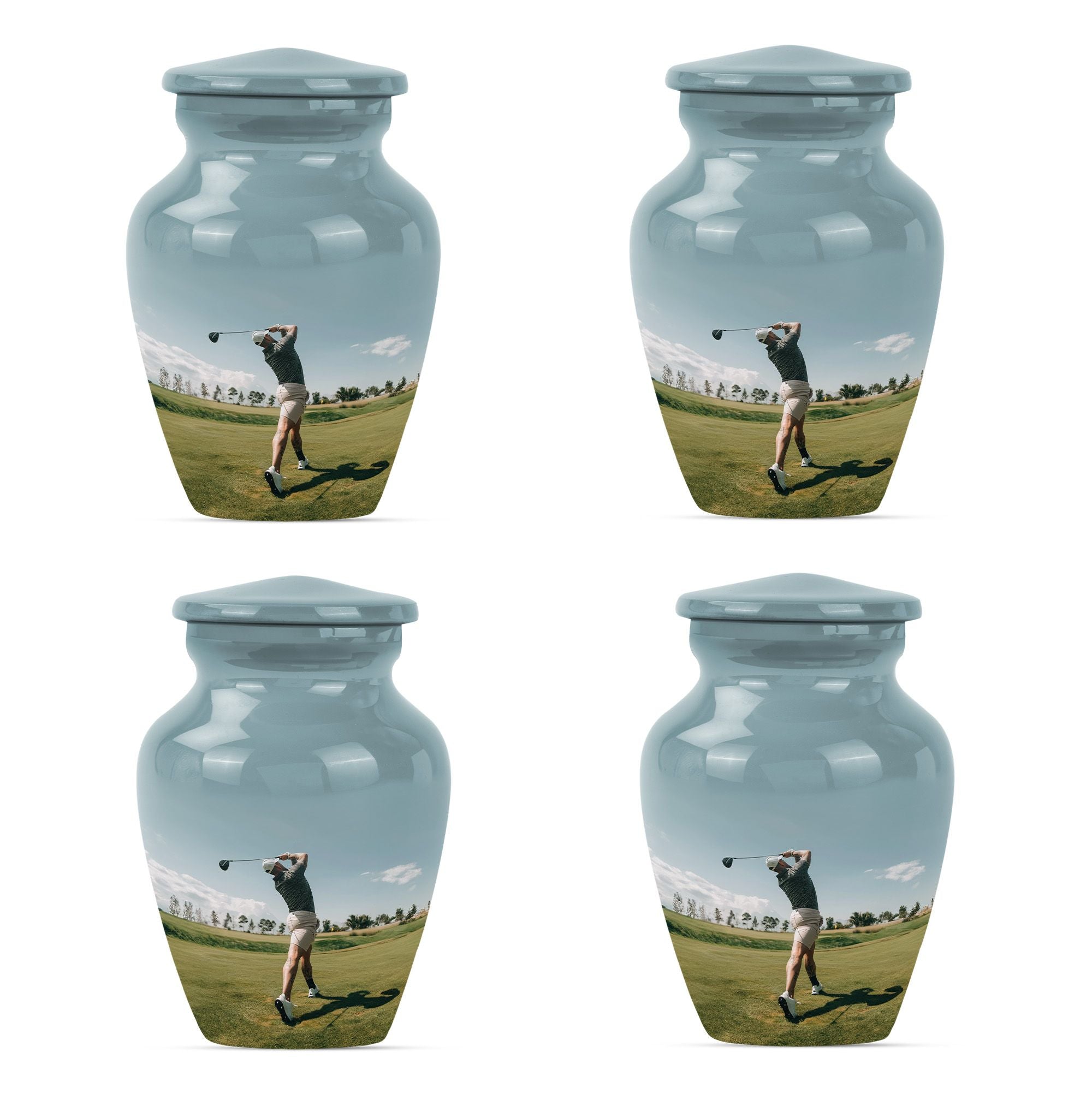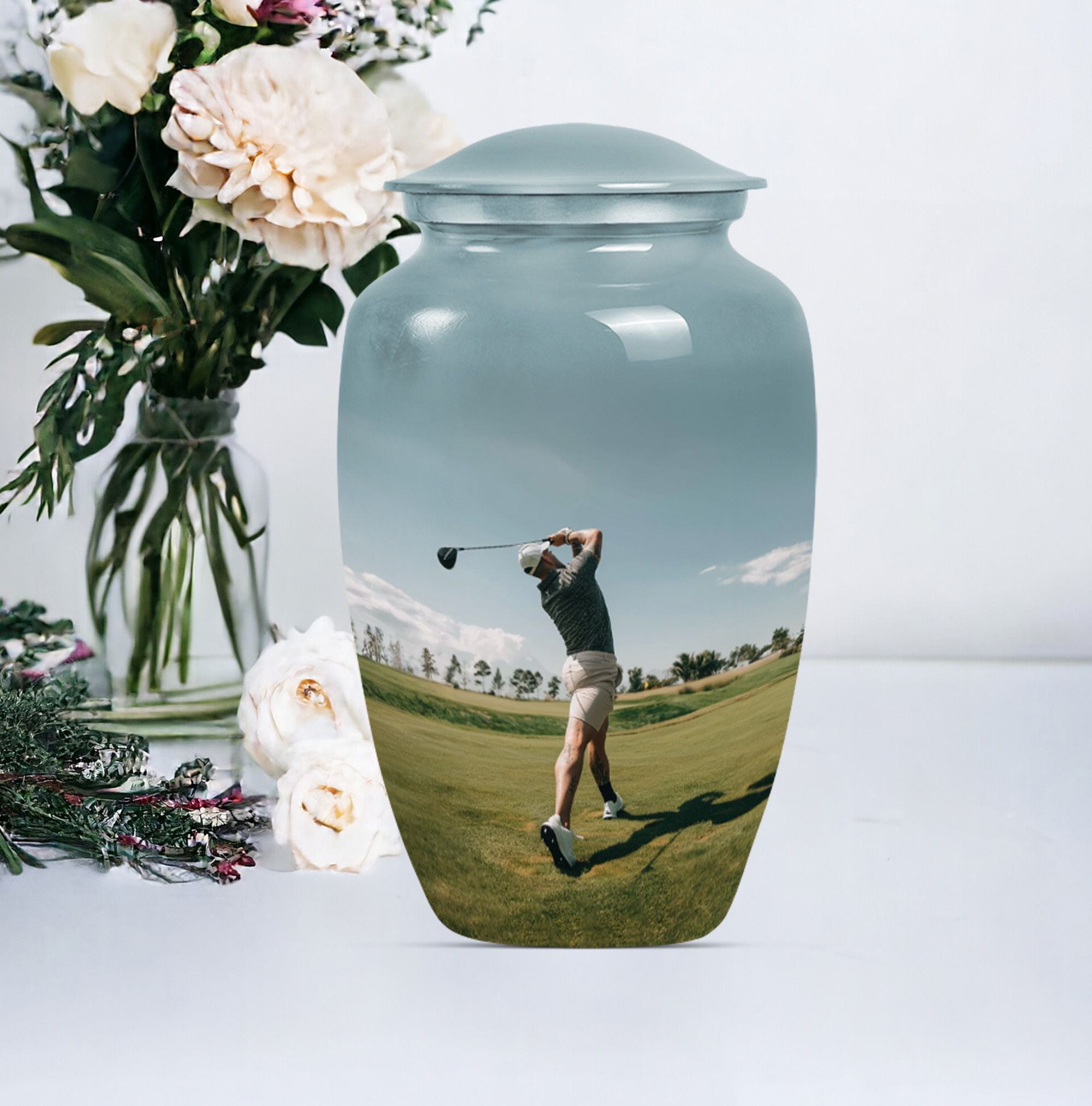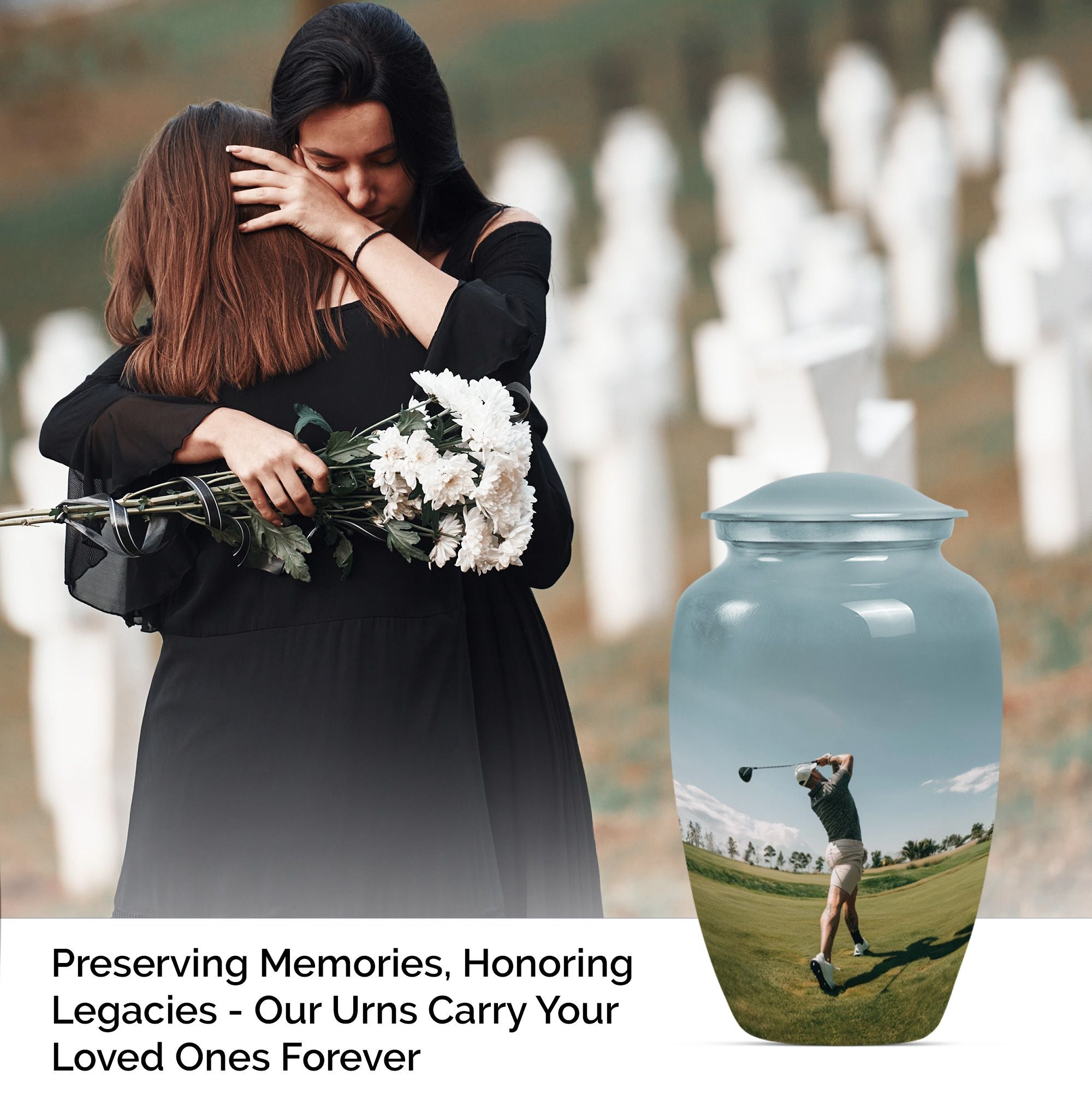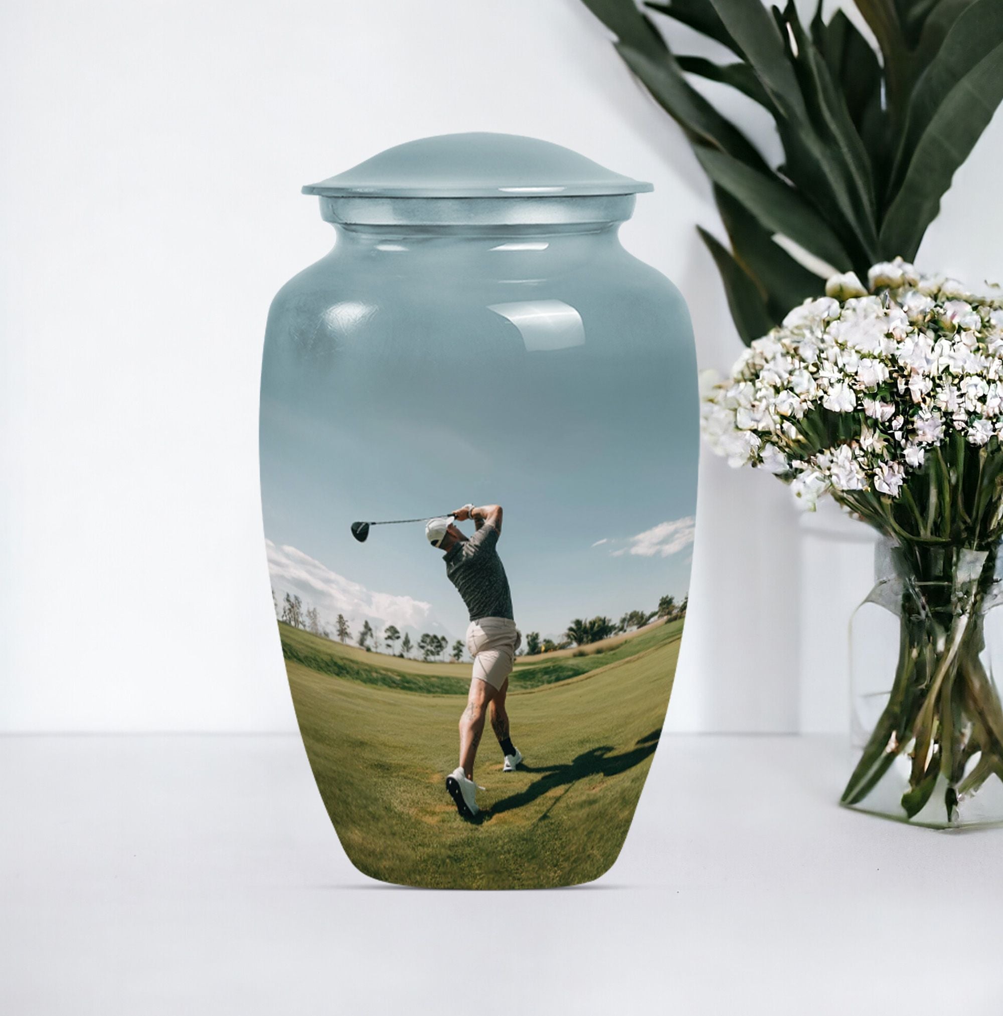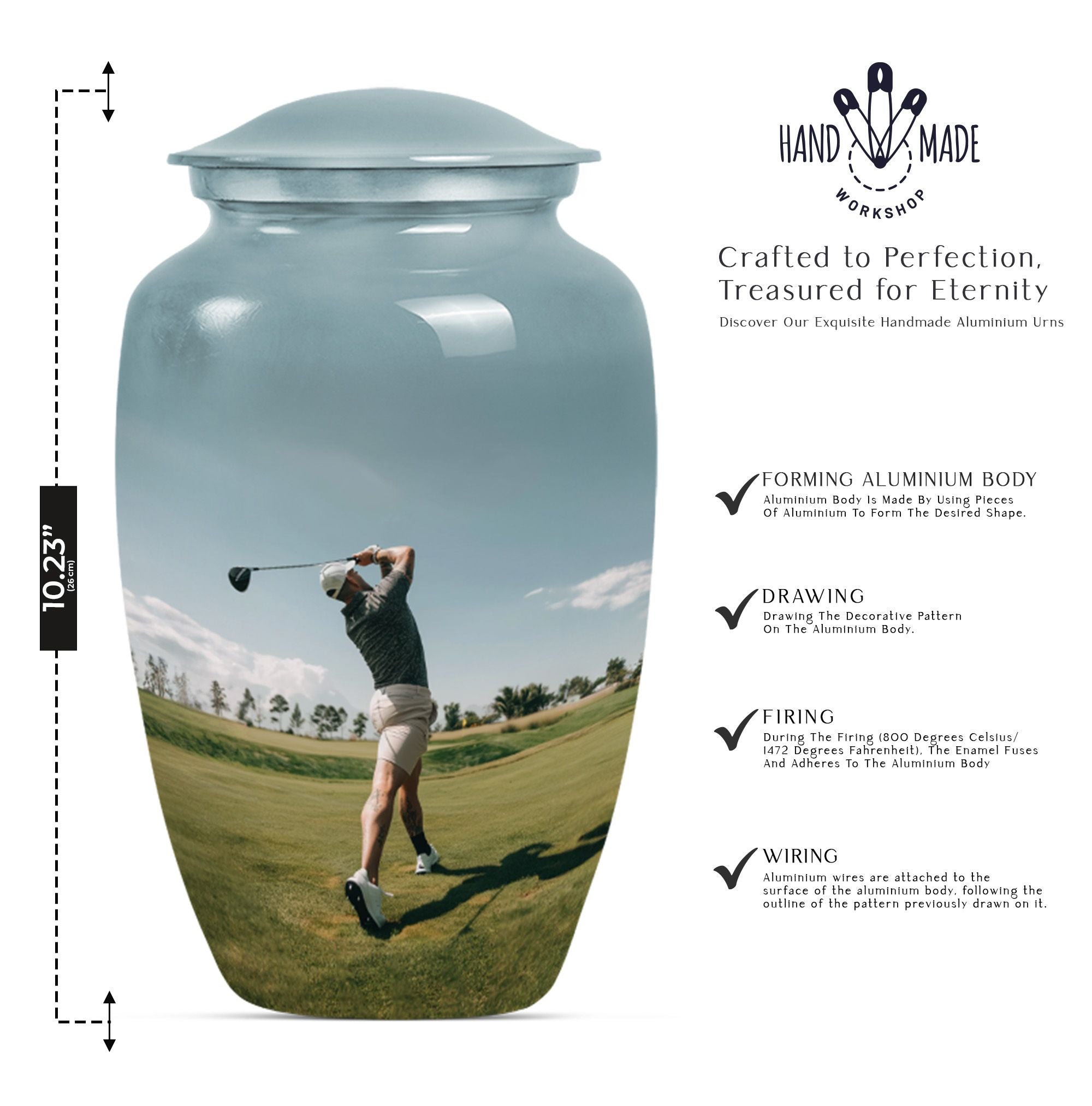 This elegantly-crafted Aluminium 10-inch urn is not just a simple vessel, but a thoughtful commemoration designed to house the ashes of your loved ones. Within its heaviness weighing 3.3 pounds, it signifies the preciousness and delicacy of the memories it holds inside. Its generous capacity of 200 cubic inches allows it to accommodate the remains of a loved one comfortably. Along with the classic urn, you also receive a soft velvet pouch, adding an extra layer of protection and respect to the ashes' containment. The abstract theme that this large urn embodies offers a timeless appeal, acting as a physical reminder of spiritual connections. Our golf Urn incorporates options for customizations, letting you personalize with engraved names, making it a unique memento. This cremation memorial urn offers an excellent way to honor and remember your loved ones. Often searched for as burial urn for human ashes, this is a perfect choice cremation urn man, urn for ashes for women or cremation urns large. Embrace this loving way to express your respect, love, and remembrance.
