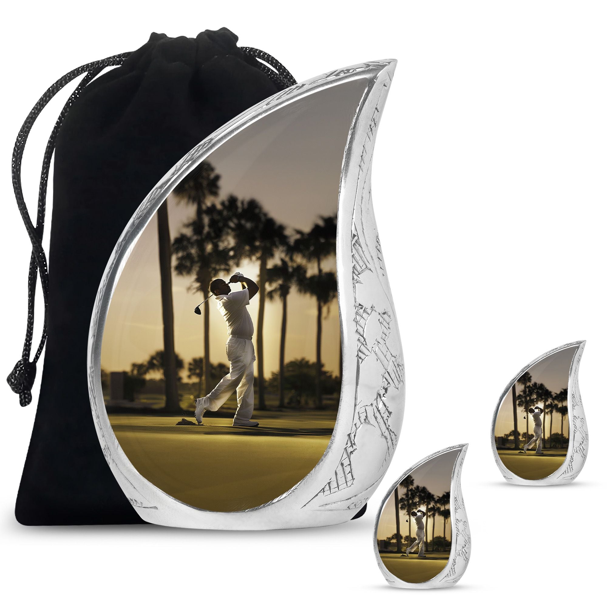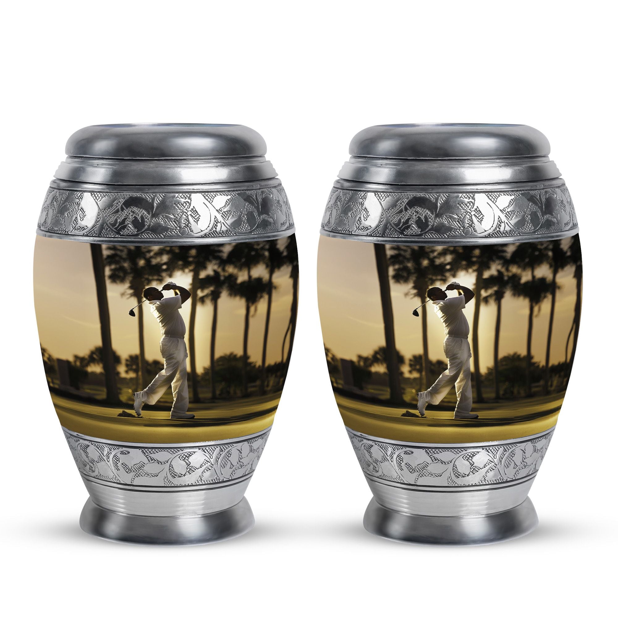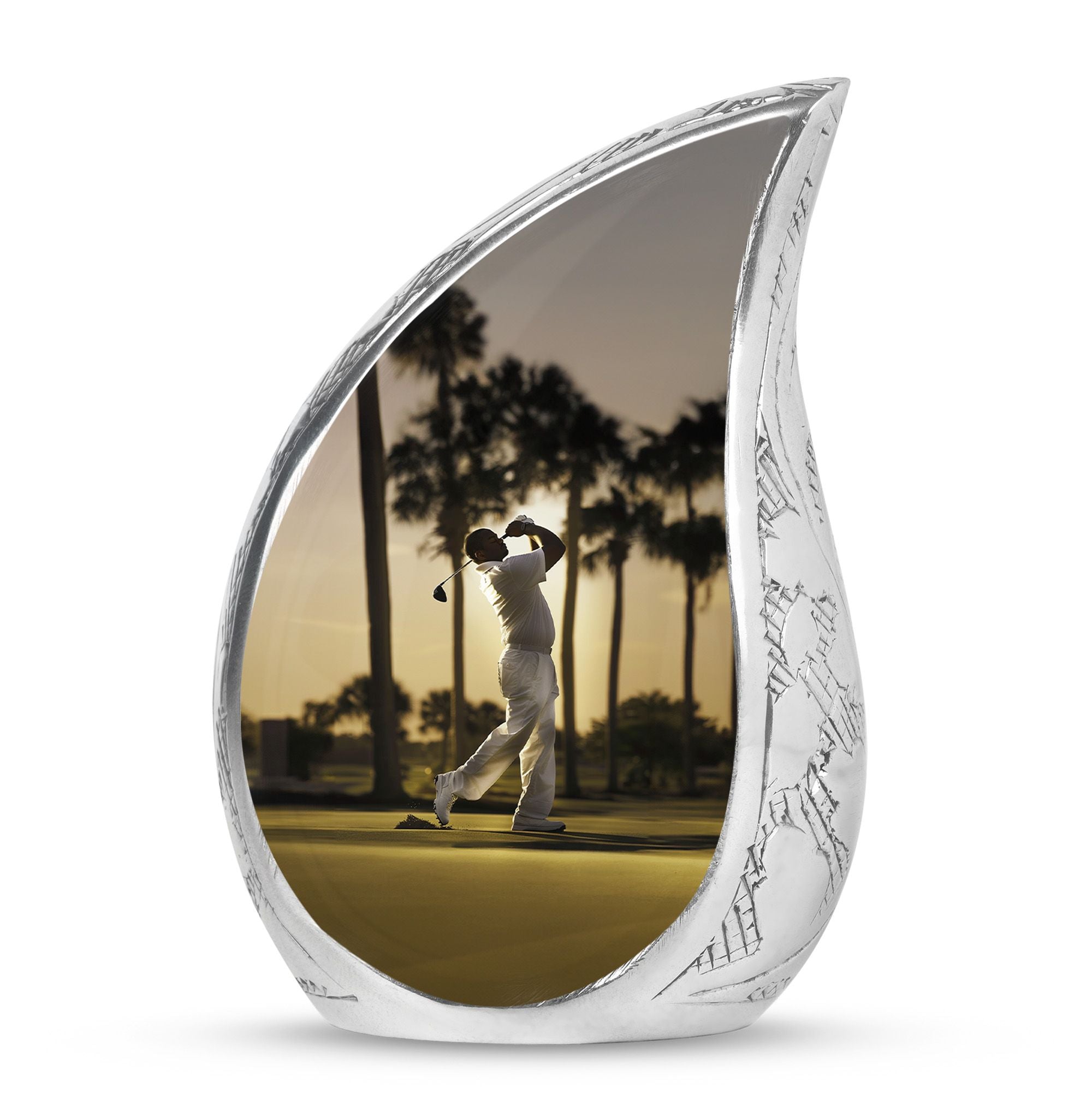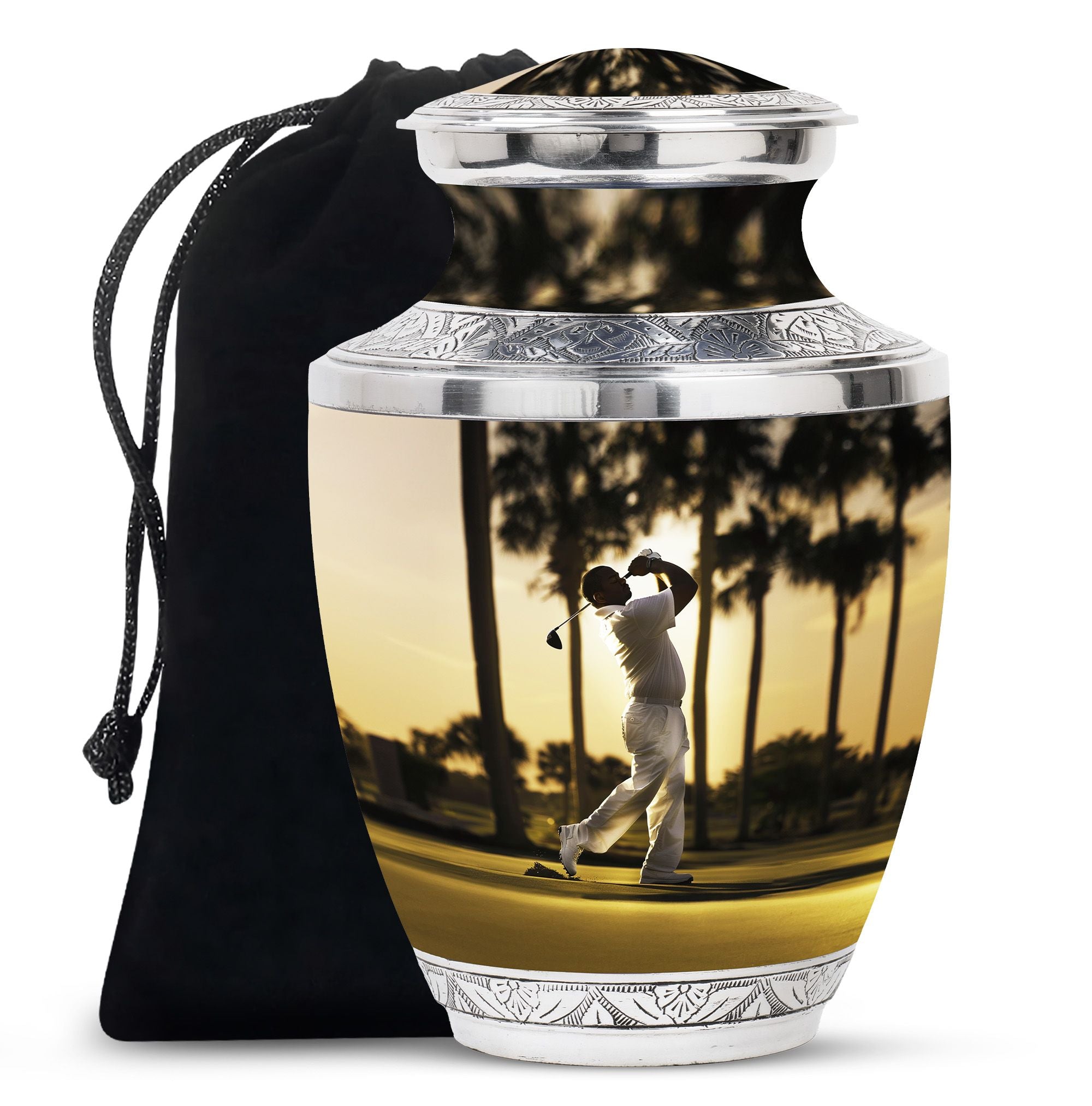 Made from durable aluminum, this urn blends artistry with strength. Its polished finish and elegant golf design make it a unique choice among funeral urns for mom and dad. With a secure screw-top lid and large capacity, it is ideal as a human urn for ashes adult male, while also serving as a meaningful option for urns for human ashes adult female small size or full size.