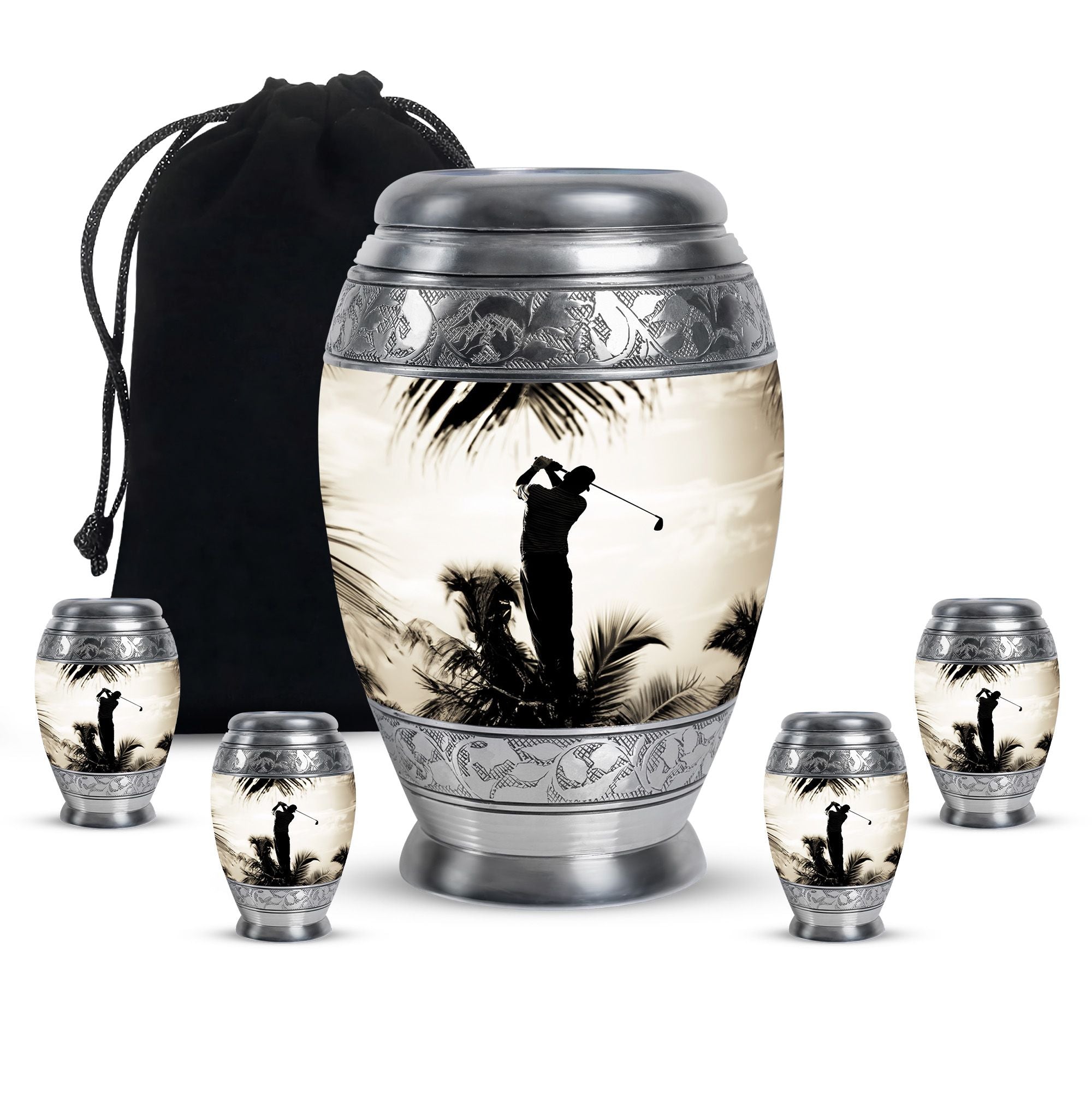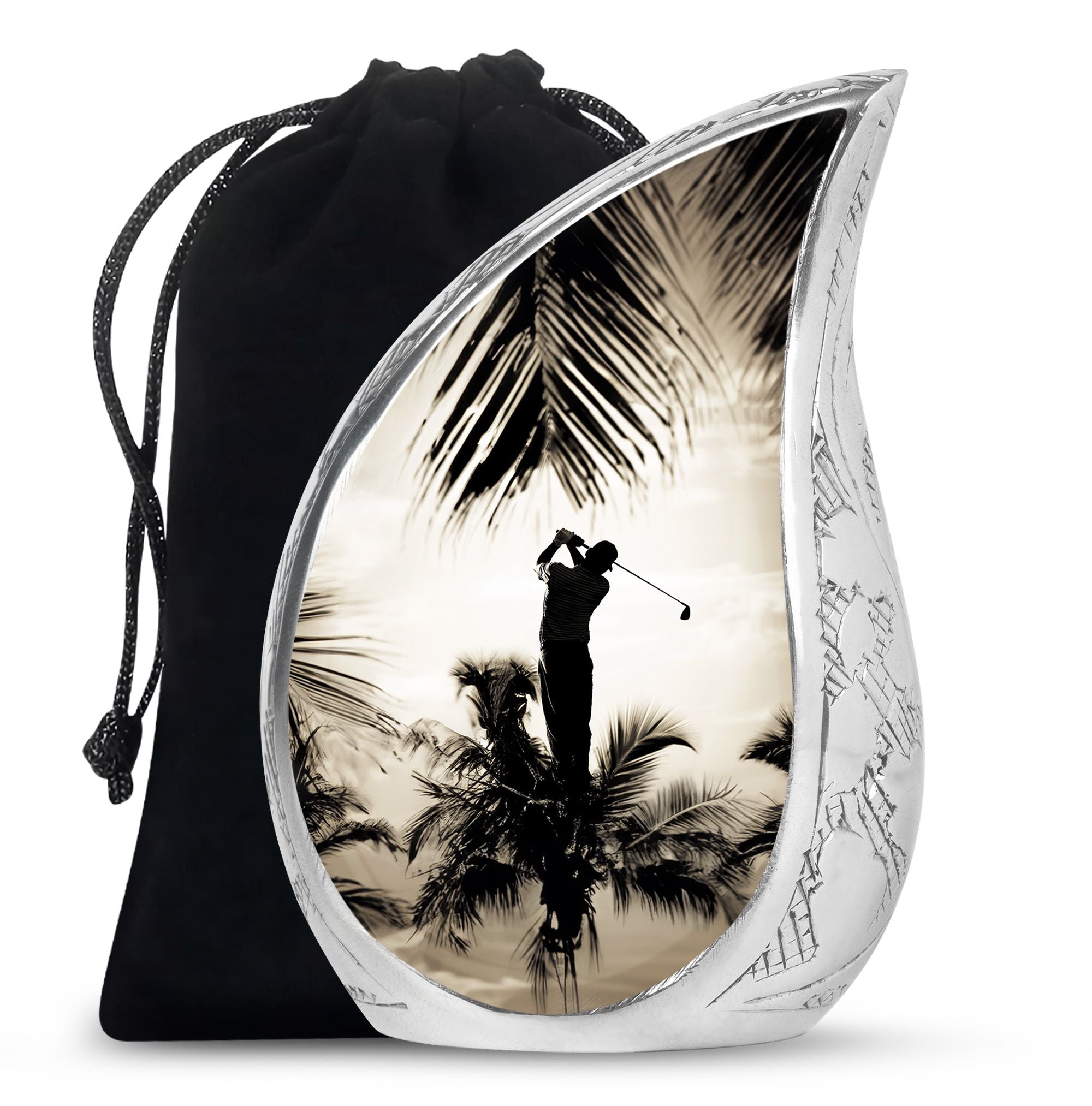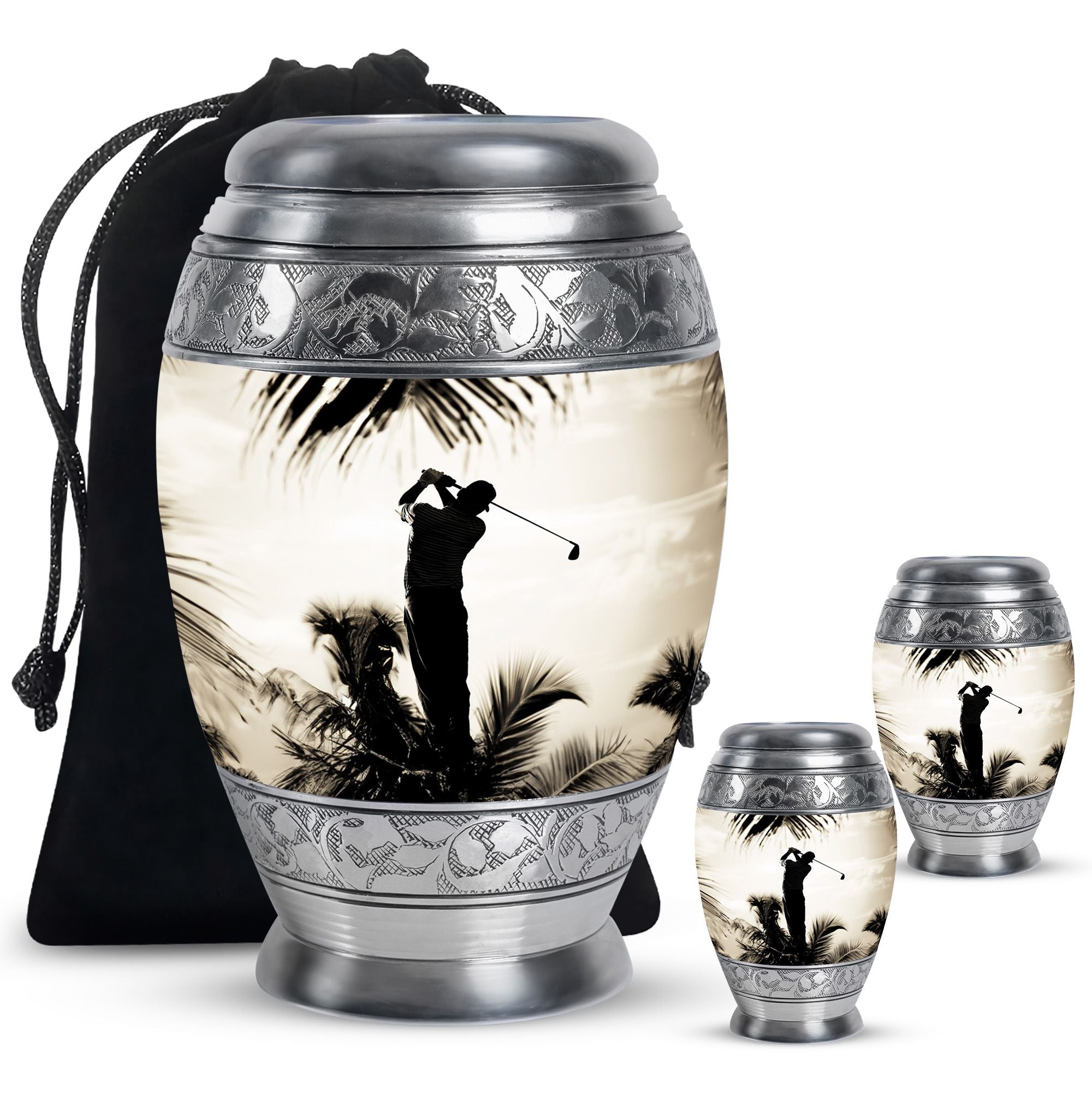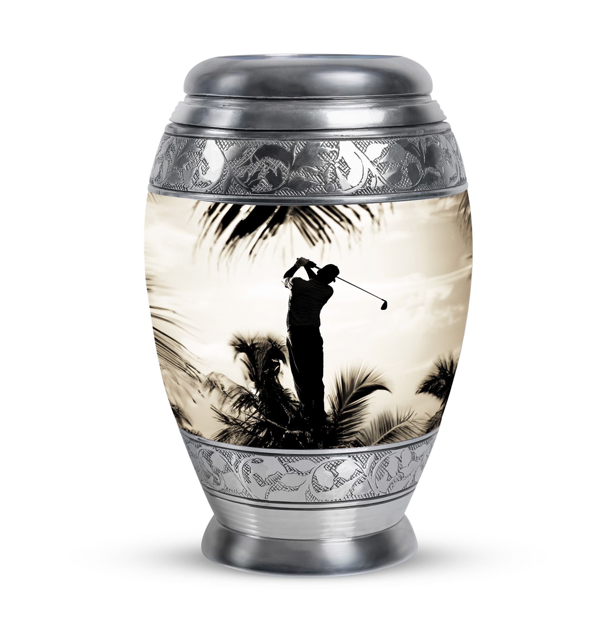 Crafted from durable aluminum, this urn showcases strength, elegance, and artistry. The polished surface and golf motif make it a distinctive large decorative urn, perfect for those who lived with a passion for the game. With a secure screw-top lid and generous capacity, it functions as a large funeral urn for home or burial, while the keepsake urns offer a way to hold memories close.