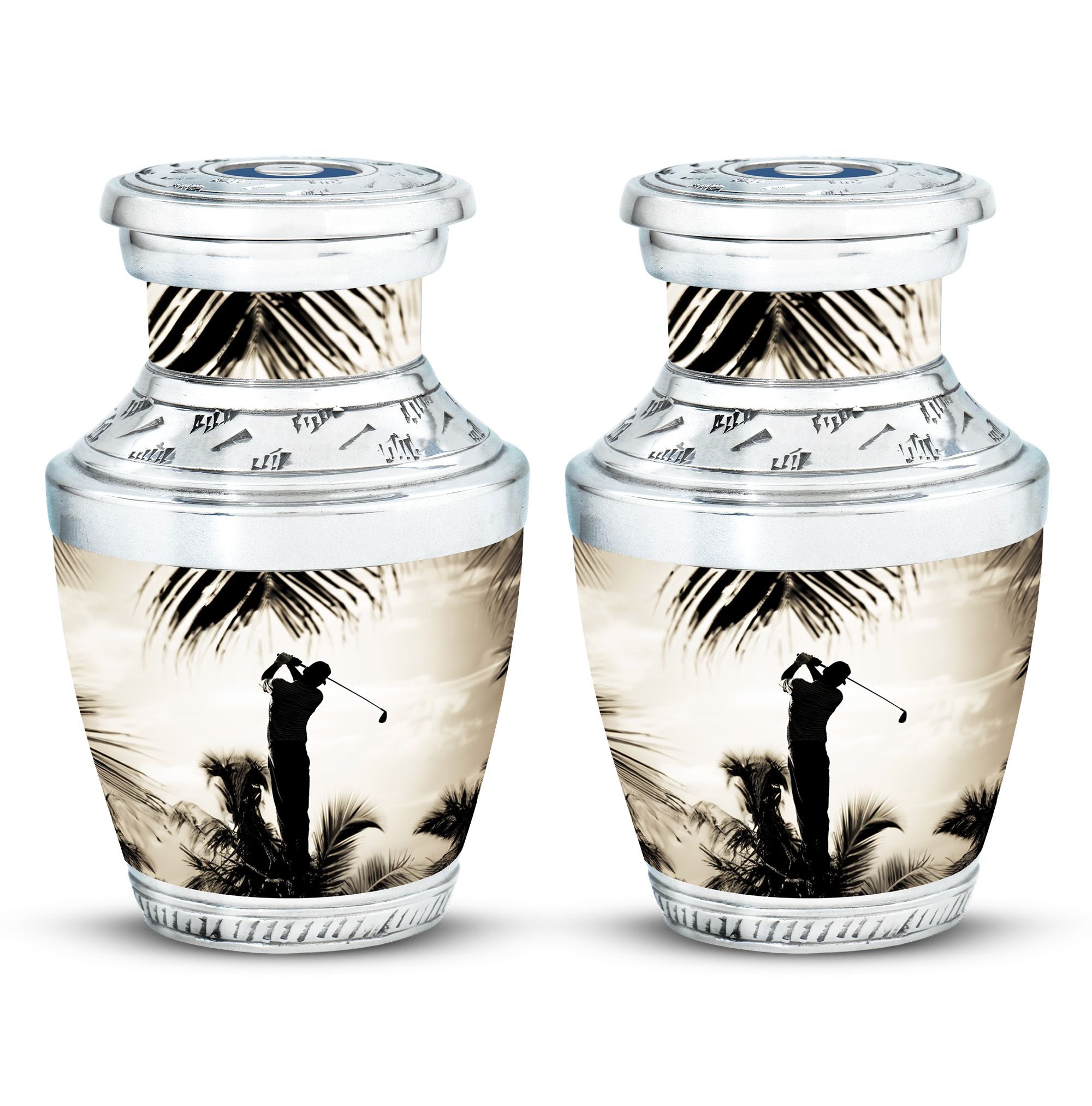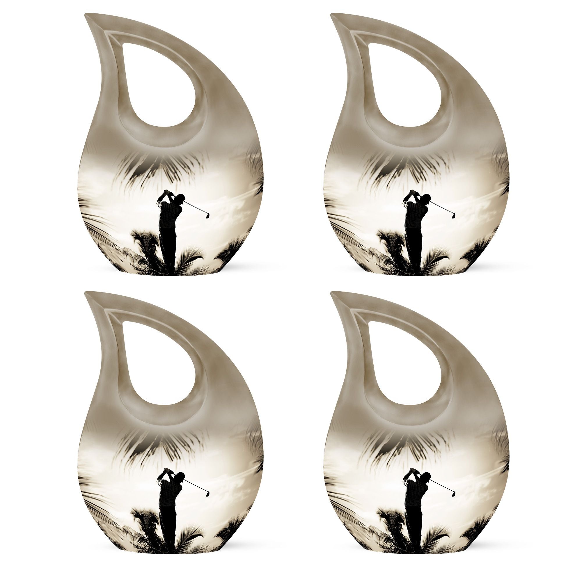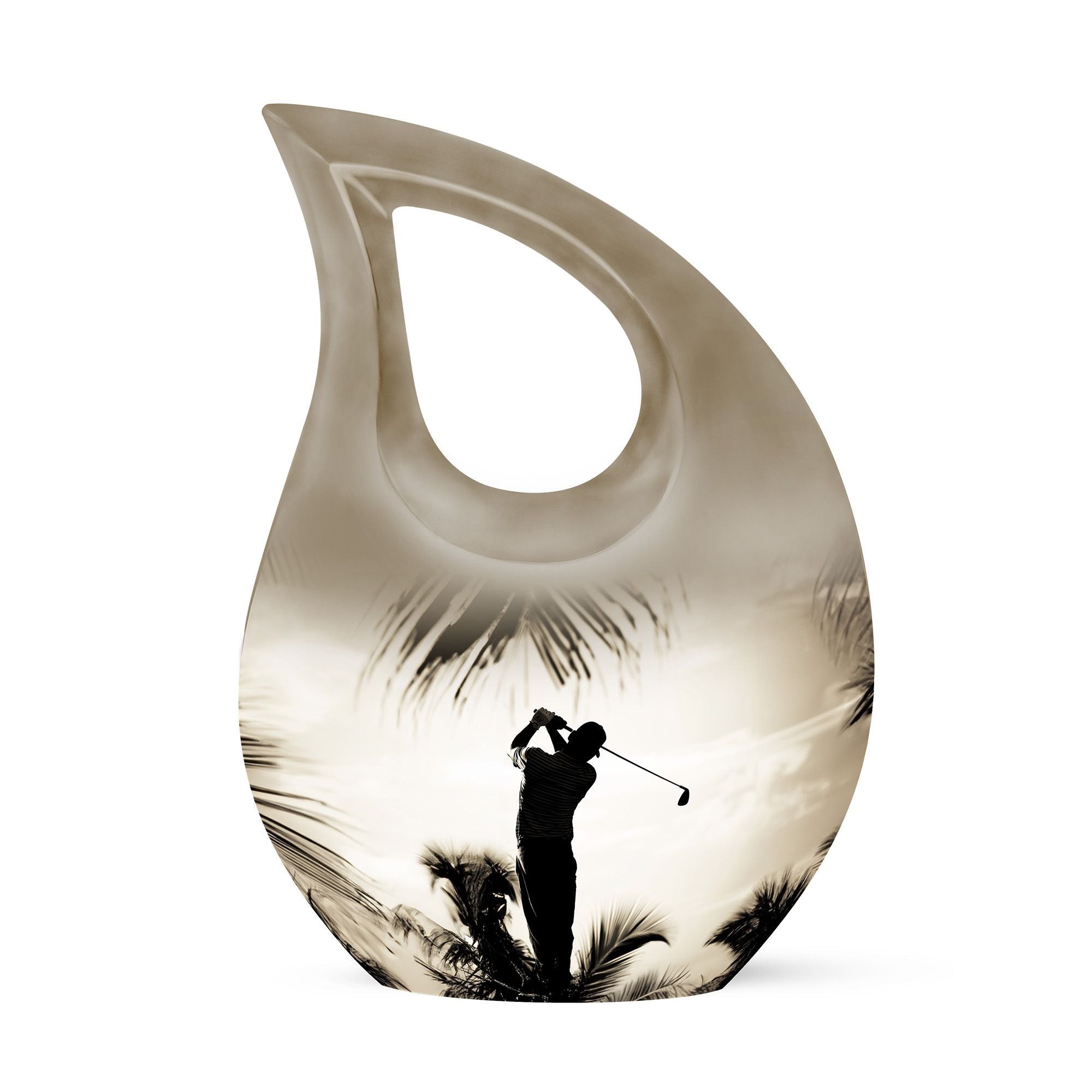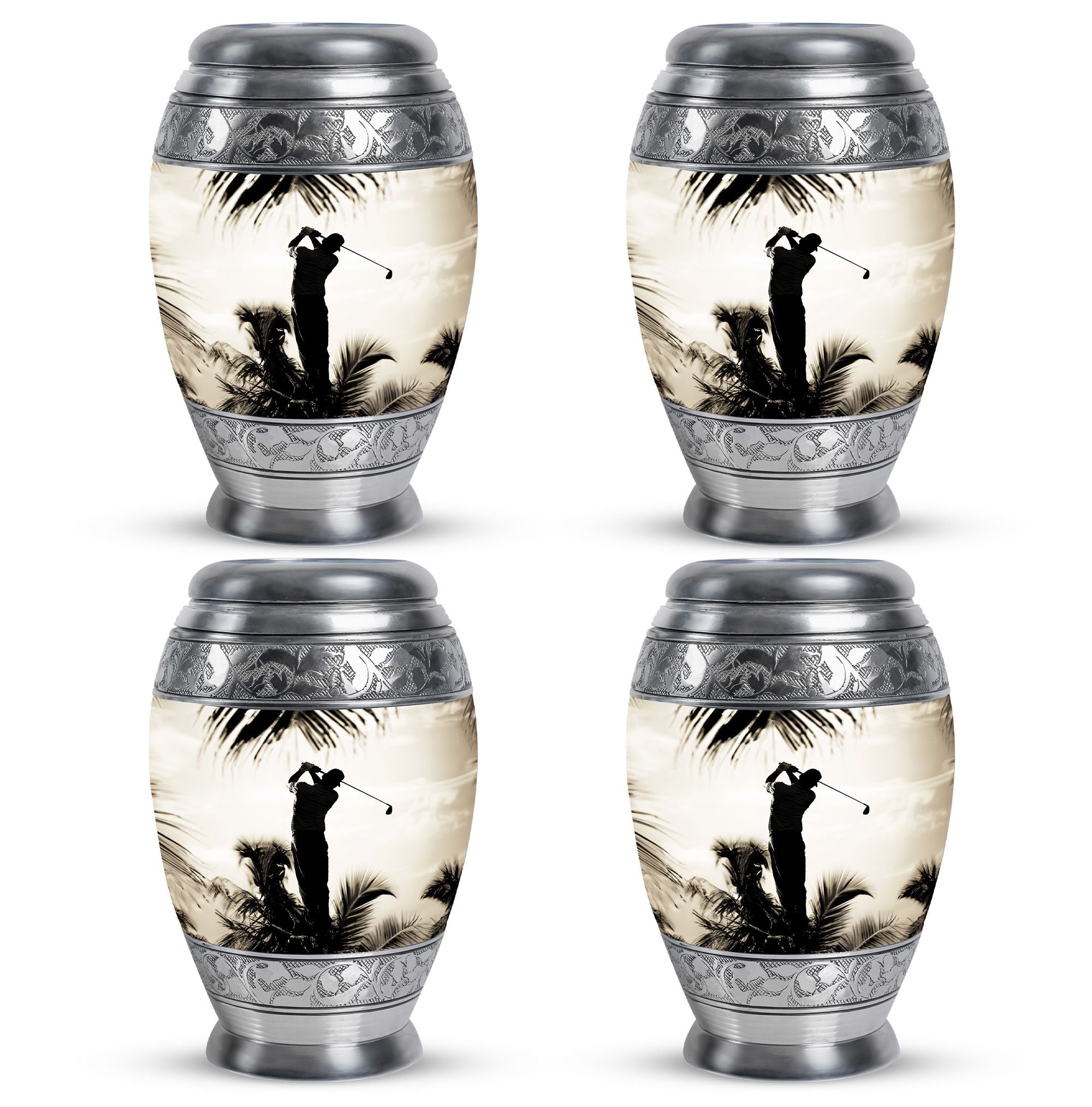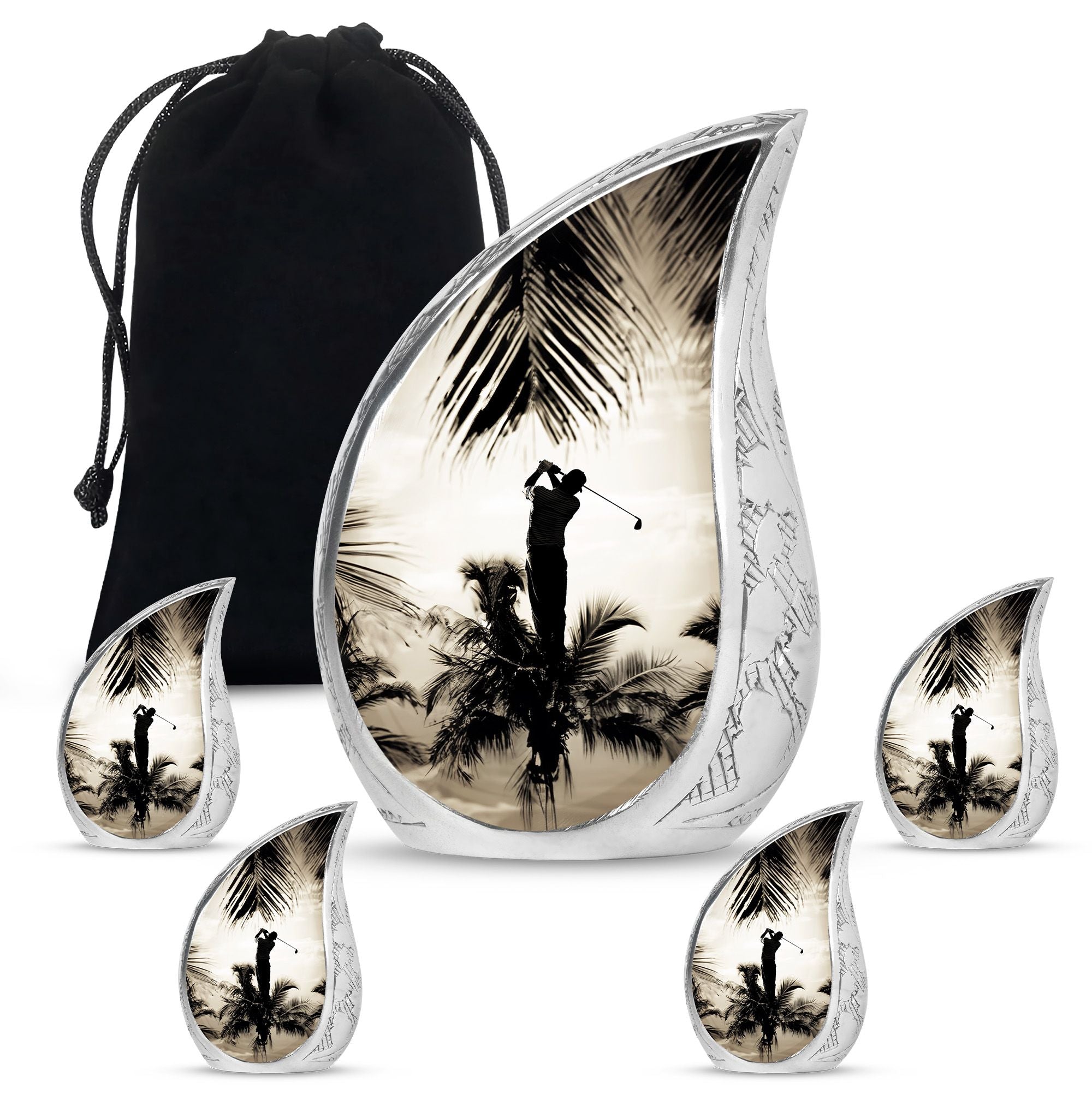 Crafted from durable aluminum, this urn showcases strength, elegance, and artistry. The polished surface and golf motif make it a distinctive large decorative urn, perfect for those who lived with a passion for the game. With a secure screw-top lid and generous capacity, it functions as a large funeral urn for home or burial, while the keepsake urns offer a way to hold memories close.