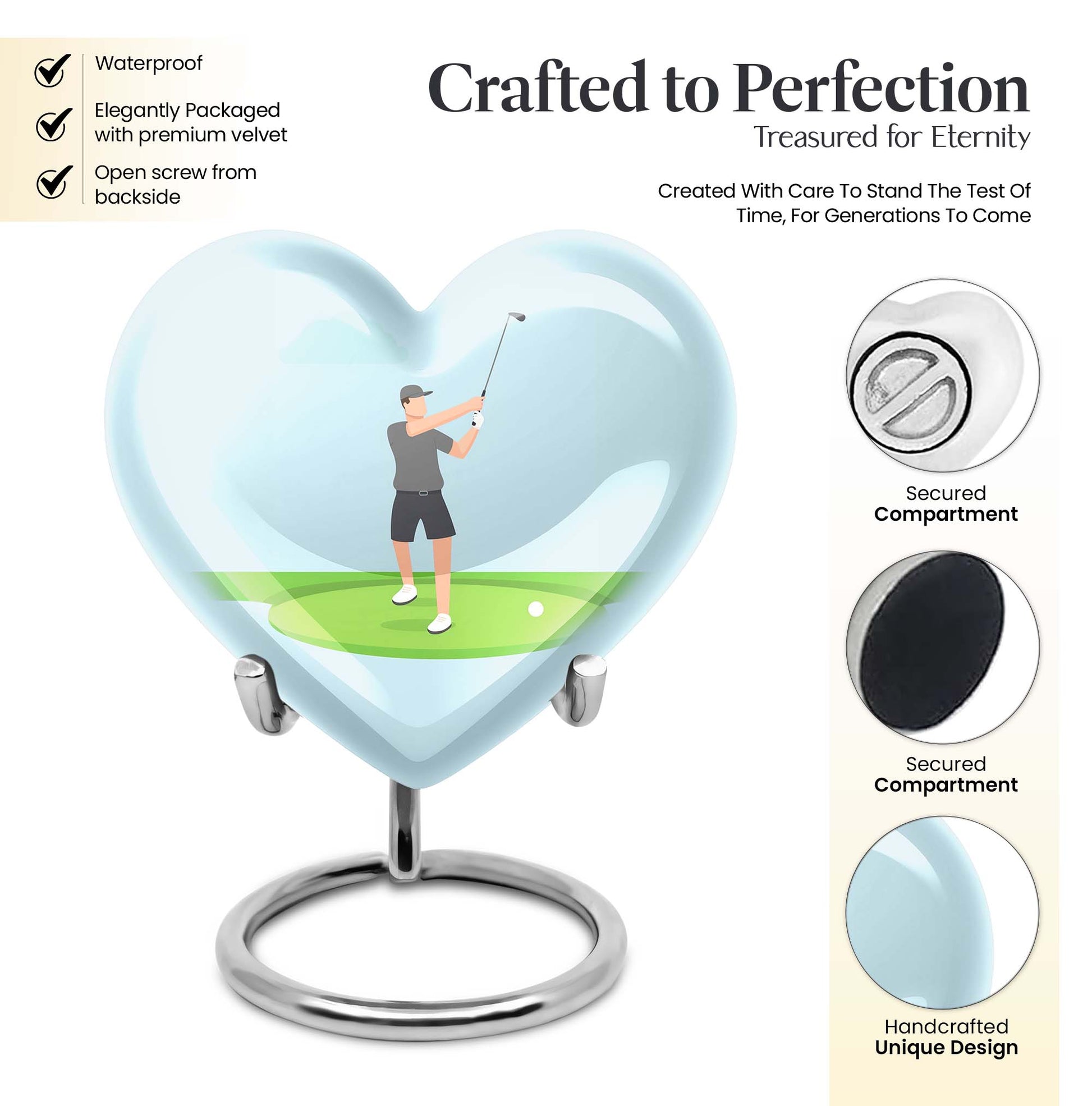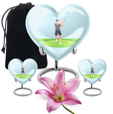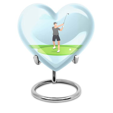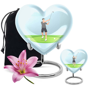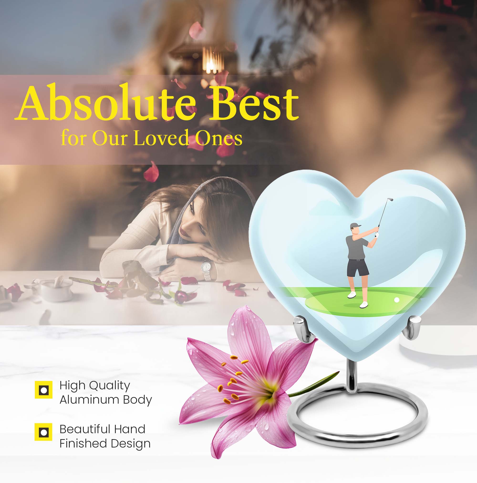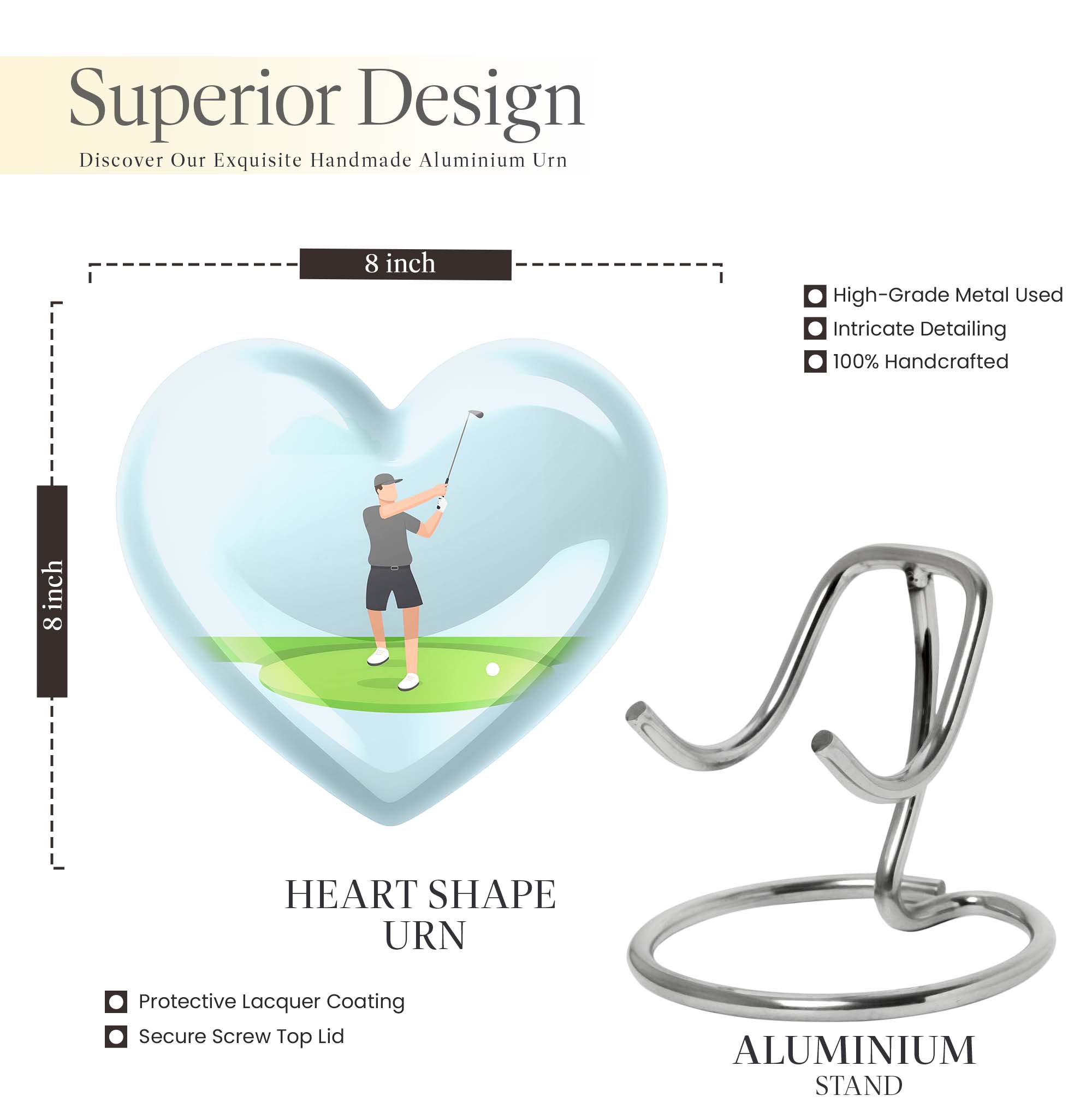 Honor your beloved's memory with our meticulously crafted 10-inch golf urn, an exemplary piece from our memorial funeral urn range. Tailored for those cherishing a unique blend of abstract theme and resonance with golf, this large urn elevates your remembrance ceremonies. Constructed using high-quality aluminium, the heart urn weighs a sturdy 3.3 pounds, an enduring tribute to your loved one. With a spacious capacity of 200 cubic inches, it accommodates the ashes properly, safeguarded within the complementary velvet pouch included in the package. Marking a distinct touch of personalization, you have the facility to engrave names on this cremation urn. Shop through our selection for such alluring urns for human ashes, and find the ideal piece that pays tribute to your loved one's distinctive life. May it be for mom cremation urn or funeral urns for burial, we provide peace, comfort, and solace during such trying times.