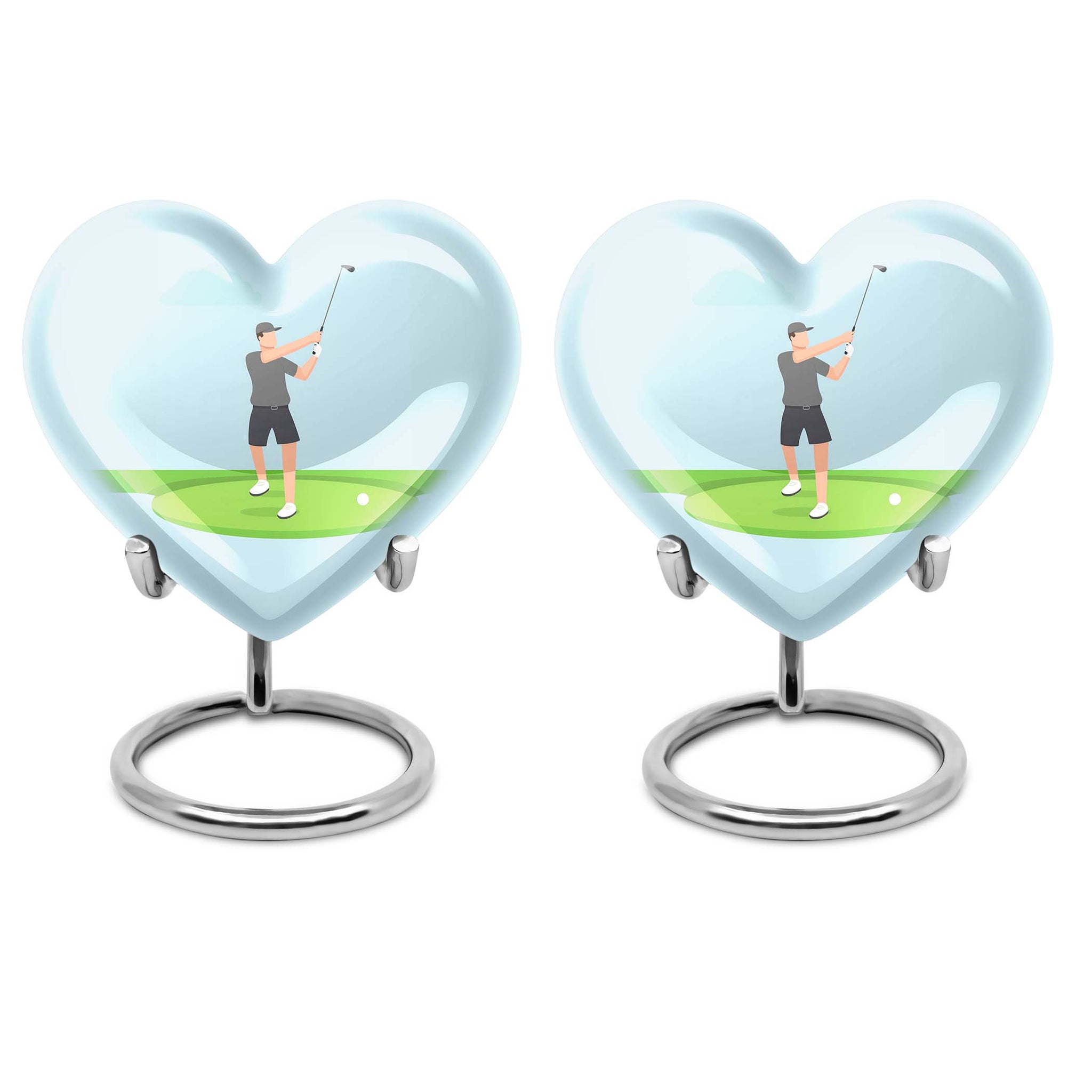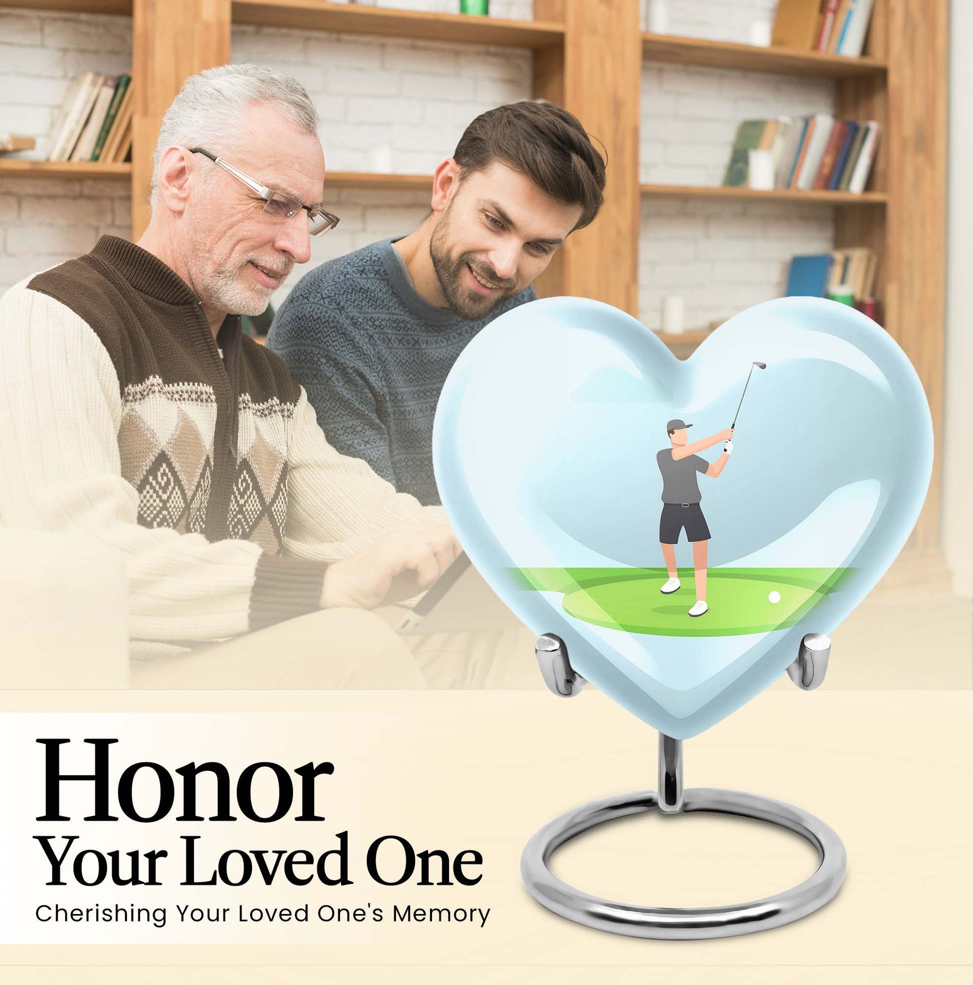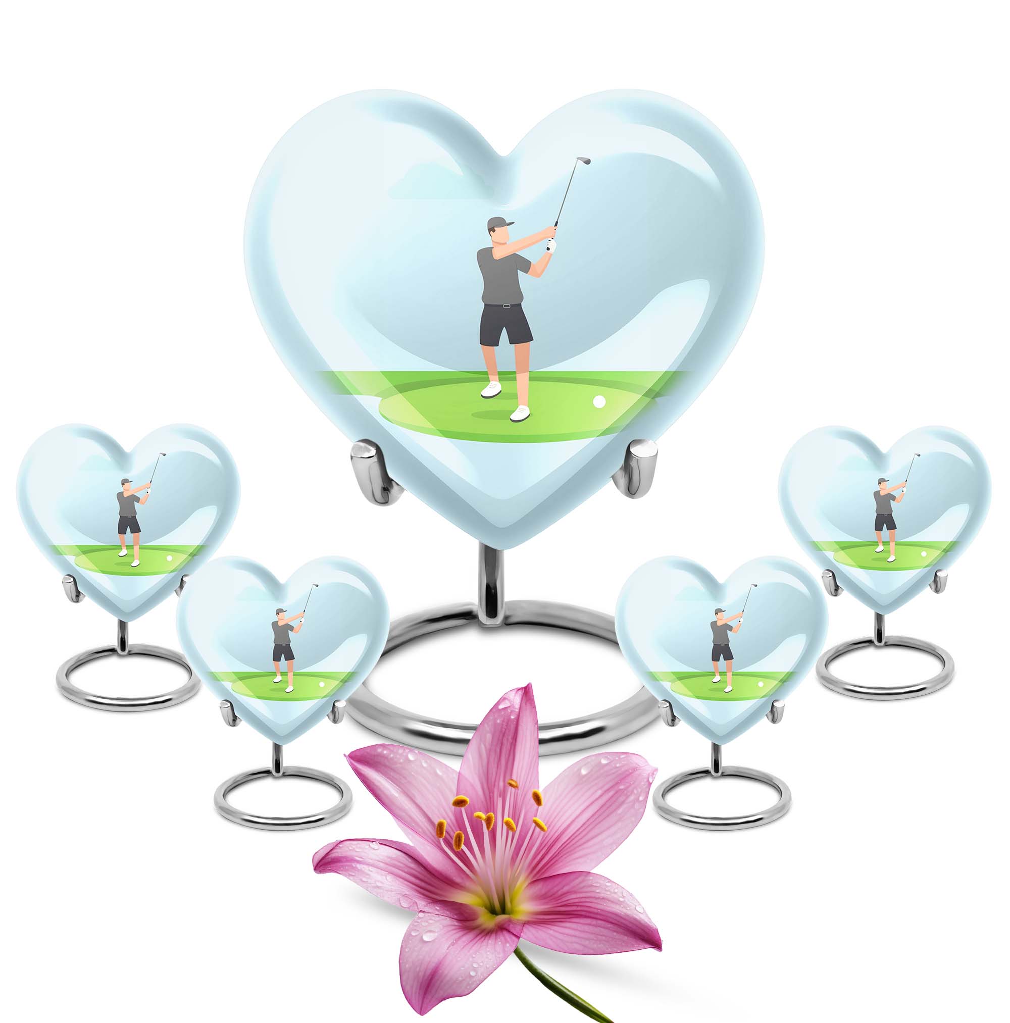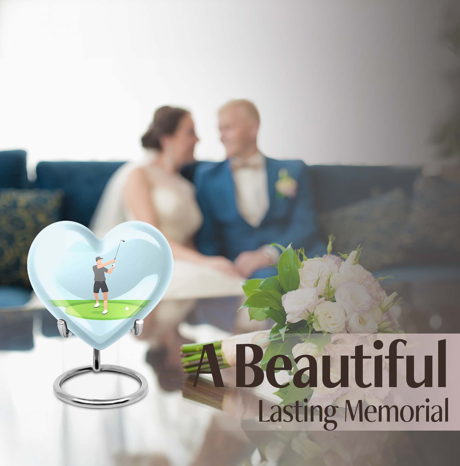 Honor your beloved's memory with our meticulously crafted 10-inch golf urn, an exemplary piece from our memorial funeral urn range. Tailored for those cherishing a unique blend of abstract theme and resonance with golf, this large urn elevates your remembrance ceremonies. Constructed using high-quality aluminium, the heart urn weighs a sturdy 3.3 pounds, an enduring tribute to your loved one. With a spacious capacity of 200 cubic inches, it accommodates the ashes properly, safeguarded within the complementary velvet pouch included in the package. Marking a distinct touch of personalization, you have the facility to engrave names on this cremation urn. Shop through our selection for such alluring urns for human ashes, and find the ideal piece that pays tribute to your loved one's distinctive life. May it be for mom cremation urn or funeral urns for burial, we provide peace, comfort, and solace during such trying times.