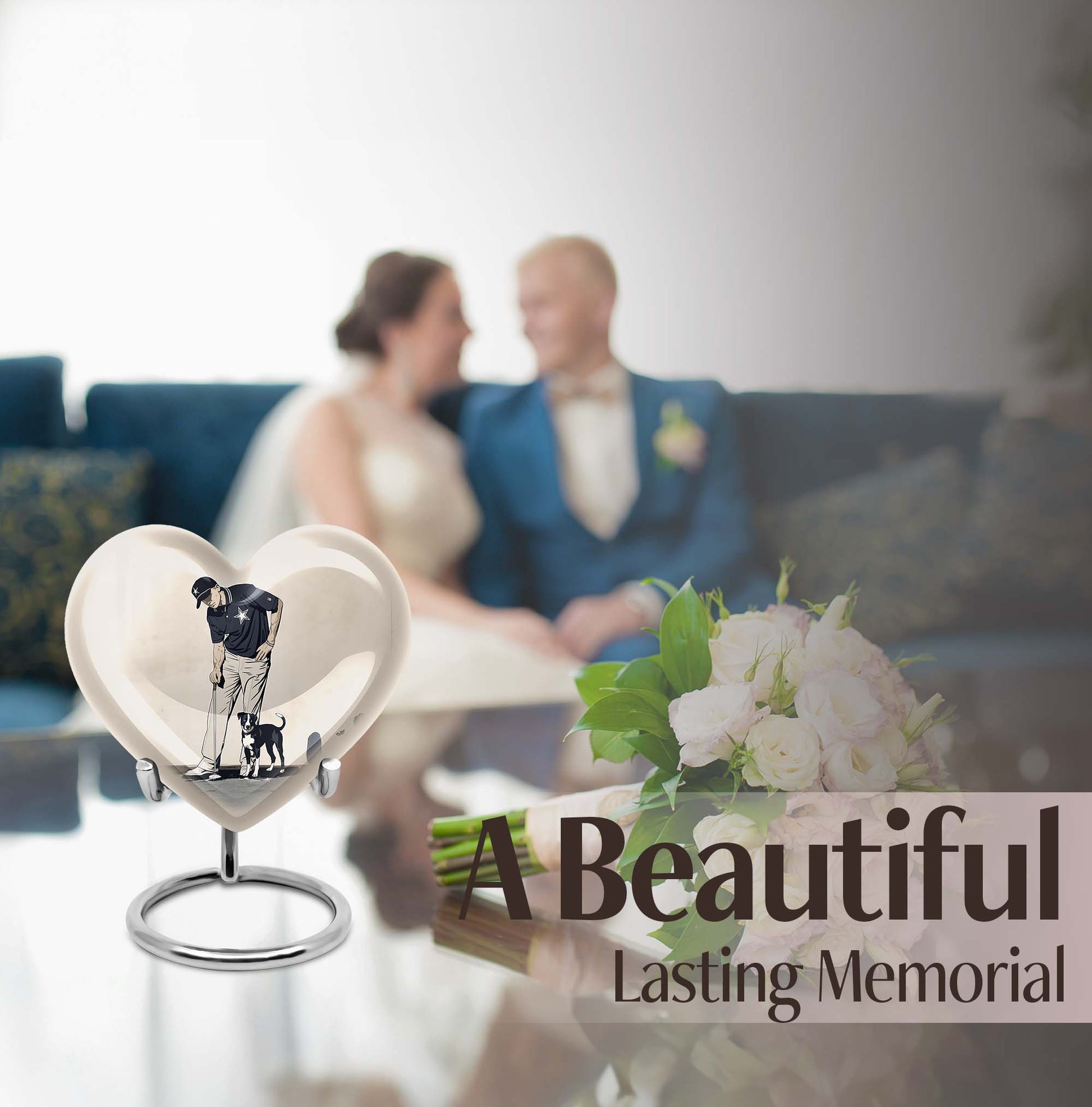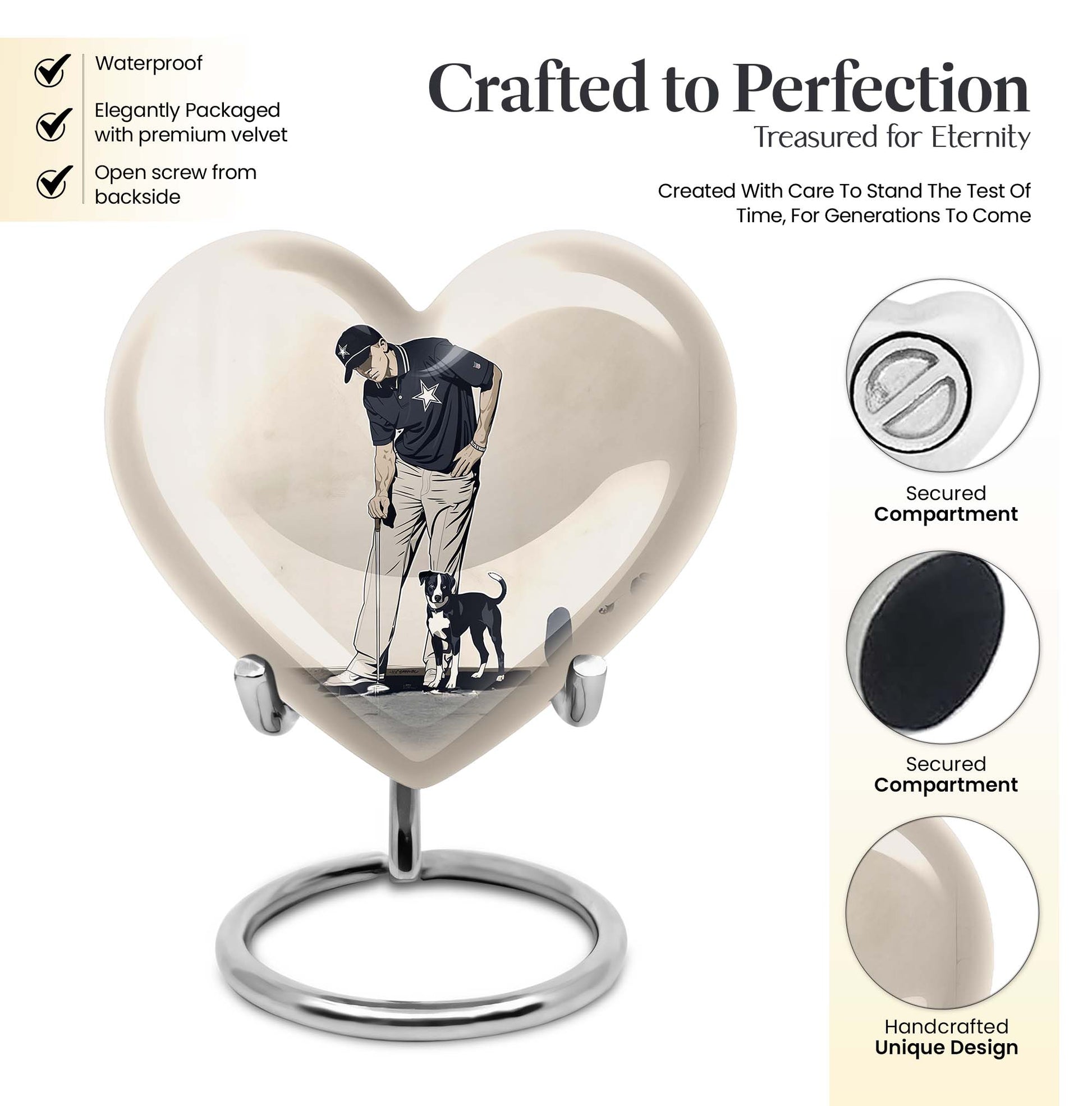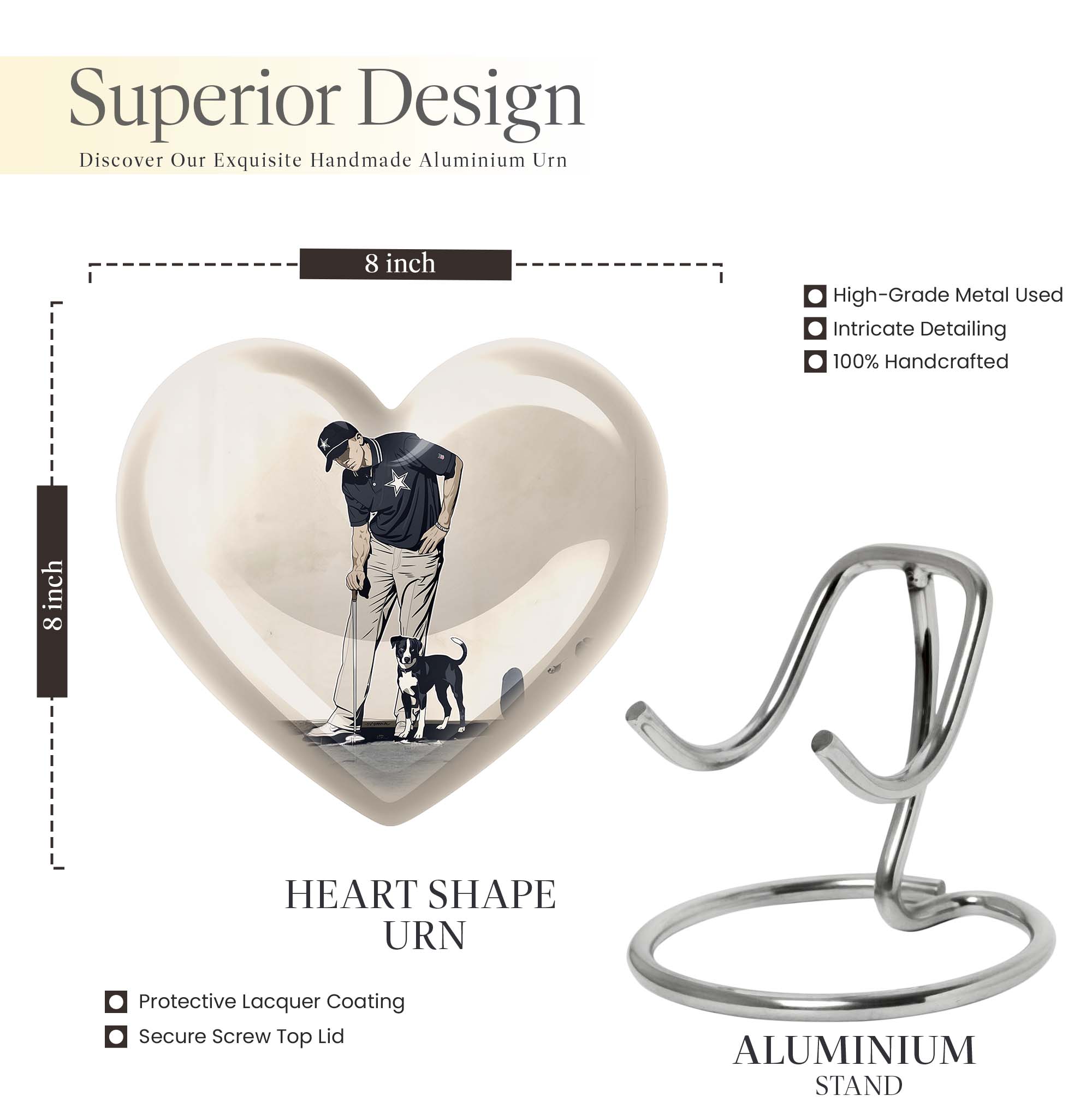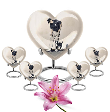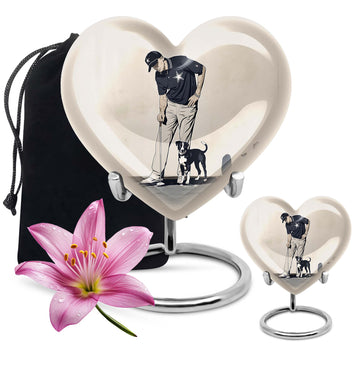 Experience peace and remembrance with our meticulously crafted golf urn, an exquisive epitome of the Memorial Ceremony Supplies realm. Seamlessly blend honoring your loved one with their passion for golf, with this distinctive, 10 Inch heart-shaped abstract-themed urn. Made from durable, high-quality aluminium, this large urn is built to last; ensuring the cherished memories of your loved ones endure. It has ample capacity of 200 cubic inches, perfectly suited to hold adult human ashes. Weighing 3.3 pounds with its 10-inch height, it's a palpable tribute to your dear departed, and the heartfelt sentiments you long to convey. The cremation medium urn comes with a complimentary velvet pouch, providing a dignified containment for the ashes. To add an intimate touch, personalize this memorial urn with engraved names. Primed for your needs as burial urn for adult ashes, whether for an adult female or a beloved companion. Remember the bounty of their spirit and celebrate it, with this masterfully constructed urn.