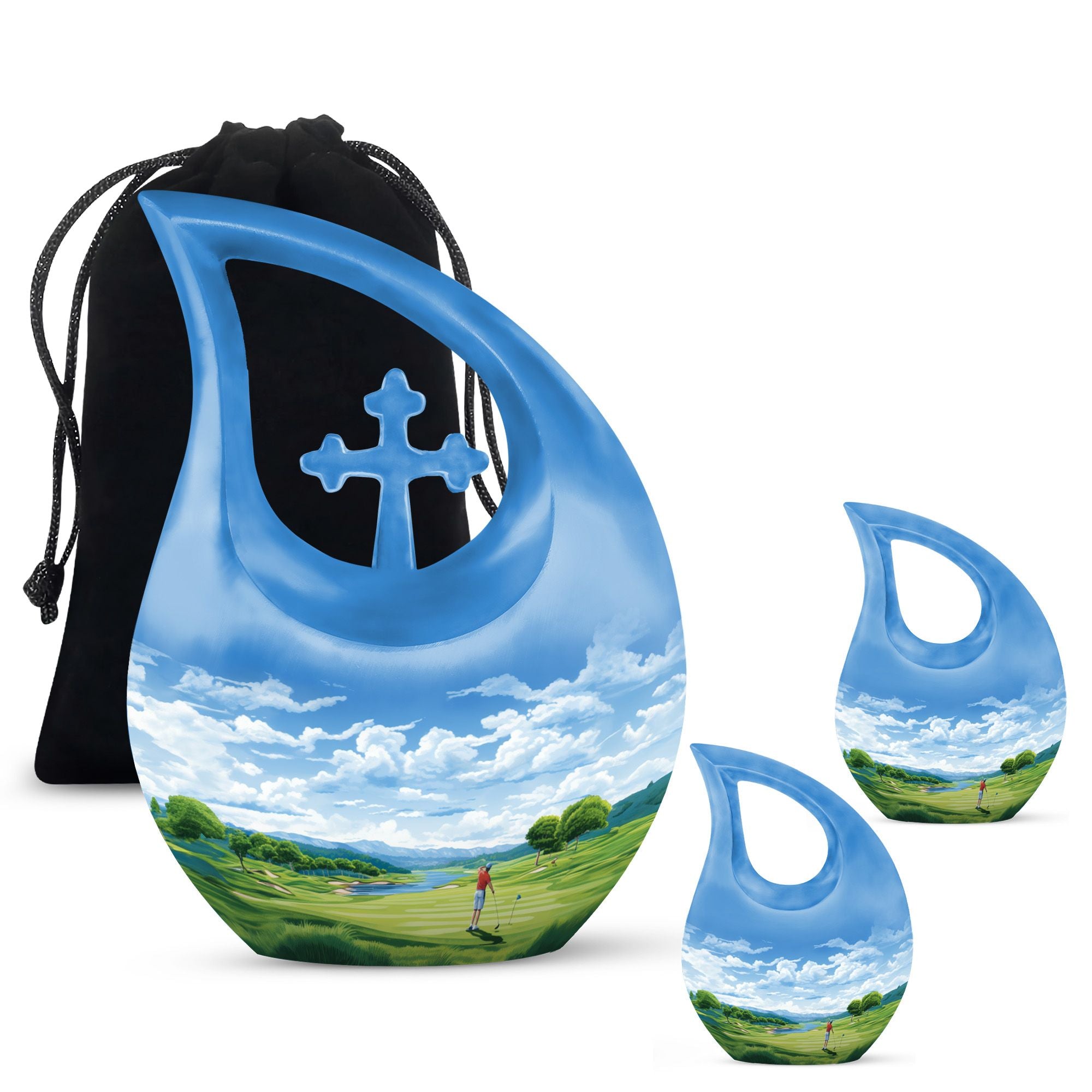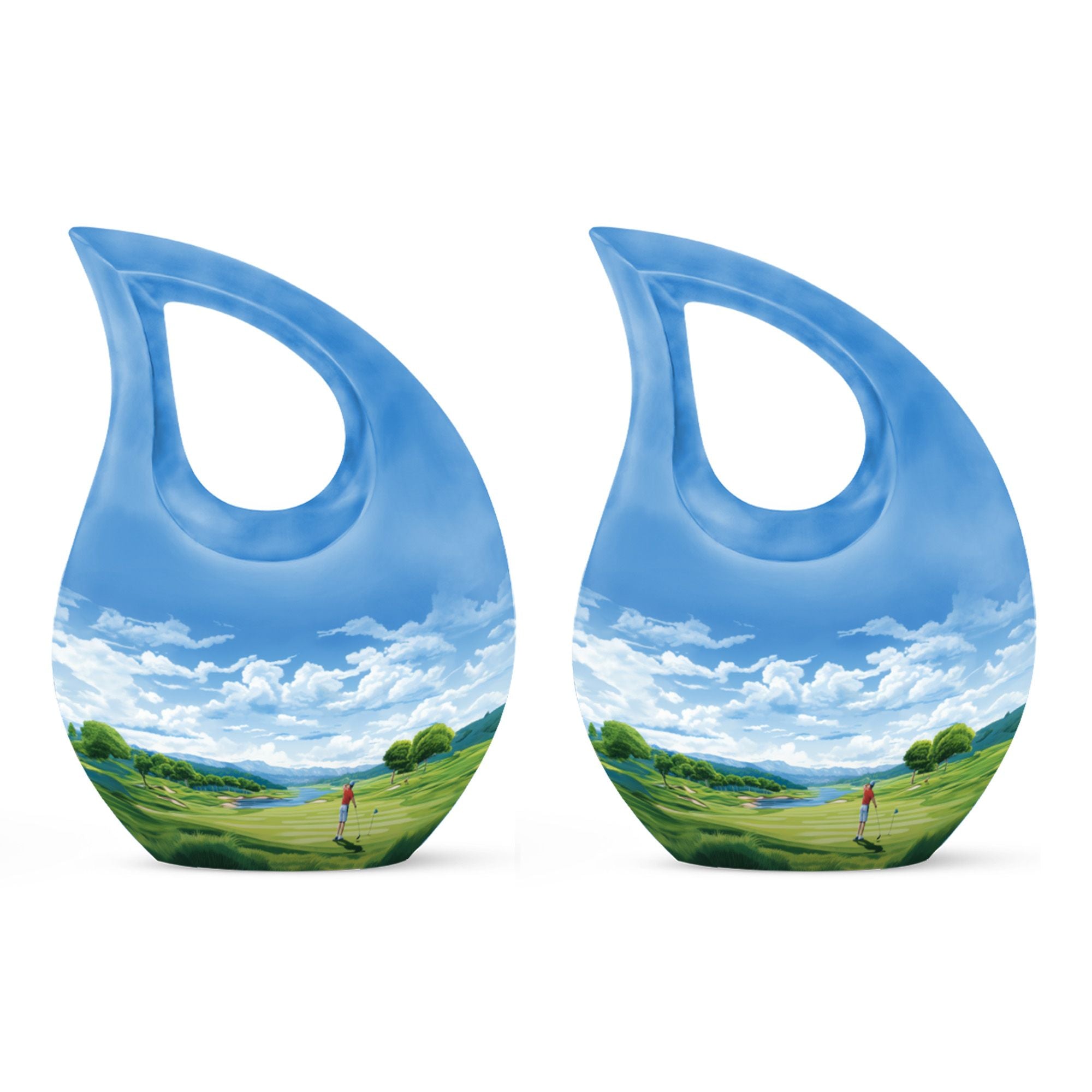 Crafted from durable aluminum, this landscape memorial urn for ashes features a tranquil golf-themed scene that reflects serenity, dedication, and a love for the outdoors. Standing 10 inches tall and holding 200 cubic inches of ashes, it serves beautifully for those searching for funeral urns for adult ashes men, adult urns for human ashes women, or a universal urn for men & women. Its secure screw-top lid ensures safe storage, while its elegant artwork makes it a meaningful choice for families. For shared remembrance, it pairs well with mini small urns for men, mini urn for ashes for women, ashes keepsake for men, cremation keepsakes for men, keepsakes for women, or matching funeral urns for women. Whether chosen as an urn for women & men, it honors life with grace and warmth.