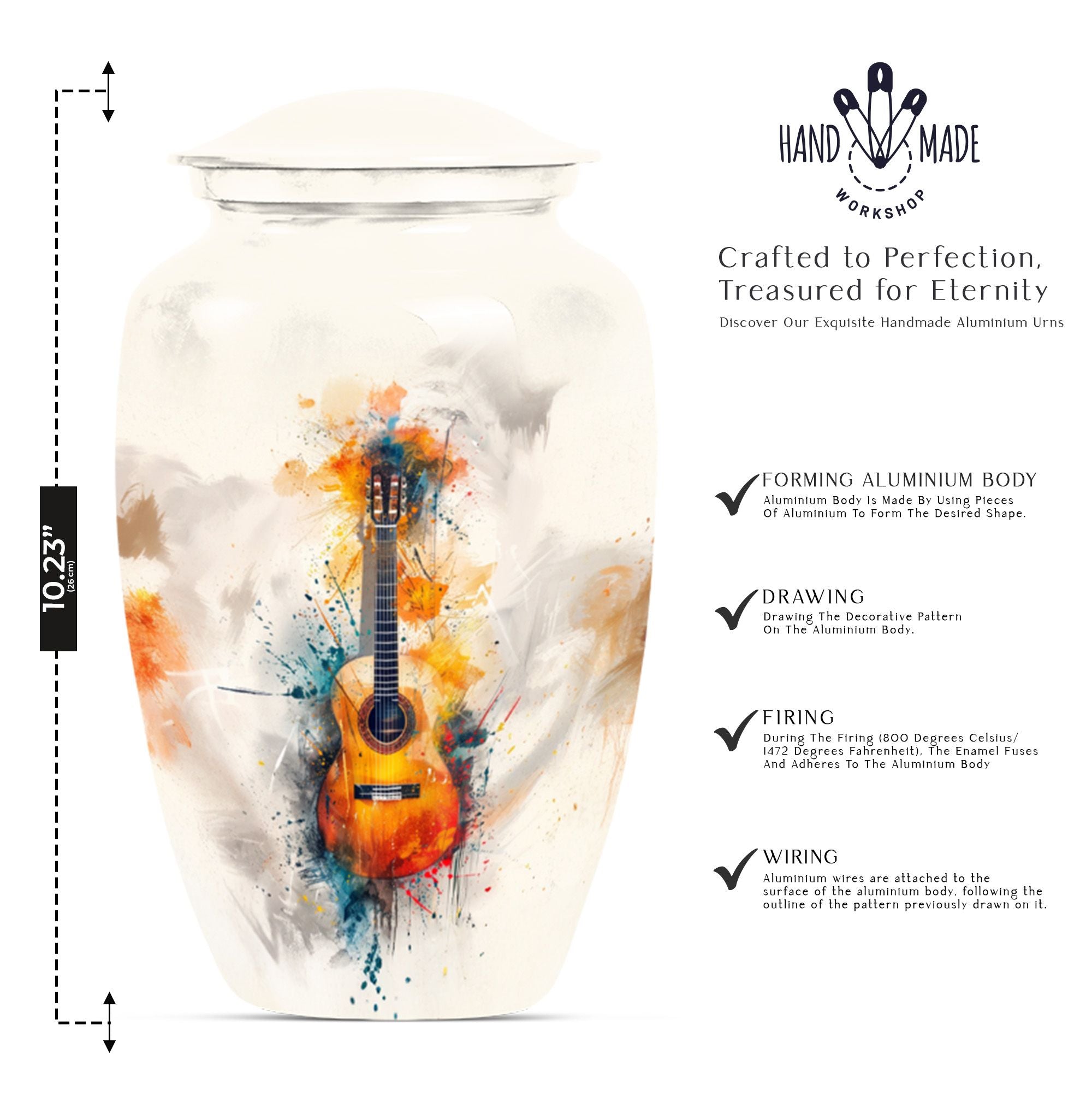 The Abstract-themed Guitar Urn brings a unique sense of solace and remembrance, nestling a touch of tranquility in its sound aesthetics. As a crucial implement in the category of Memorial Ceremony Supplies, this 10 Inch-sized large urn weighs 3.3 pounds with the capacity to accommodate 200 cubic inches of human ashes. The urn is made from the enduring Aluminium material expertly shaped into a Classic Urn structure. The package includes a velvet pouch, ensuring respectful containment of the ashes. Personalization options are available, allowing you to imprint engraved names, embellishing the urn with the indelible mark of memory. Keywords you might find useful for finding this product are 'Guitar Urn', 'funeral adult urns for human ashes', 'memorial urns', 'Memorial forever urns', 'urns for mom', 'funeral urns for ashes' and 'urn human women'. Ideal for adults and seniors looking for a dignified yet artistic way to treasure their dear departed.