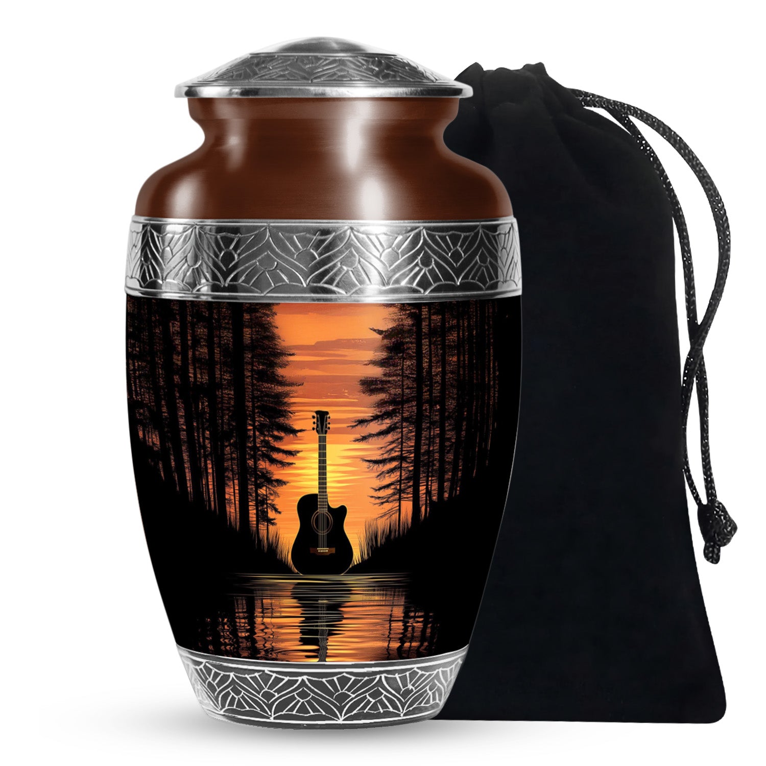 Crafted from durable aluminum, this sunset urn is designed to last. Its vivid sunset finish and artistic guitar motif make it a unique urn for human ashes and a thoughtful choice for those who lived with music in their soul. The secure screw-top lid ensures lasting protection, whether selected as burial urns for ashes, urns for burial in ground, or cremation urns for burial. Its 200 cubic inch capacity makes it suitable as adult funeral urns for display or burial urns for human ashes in ground.