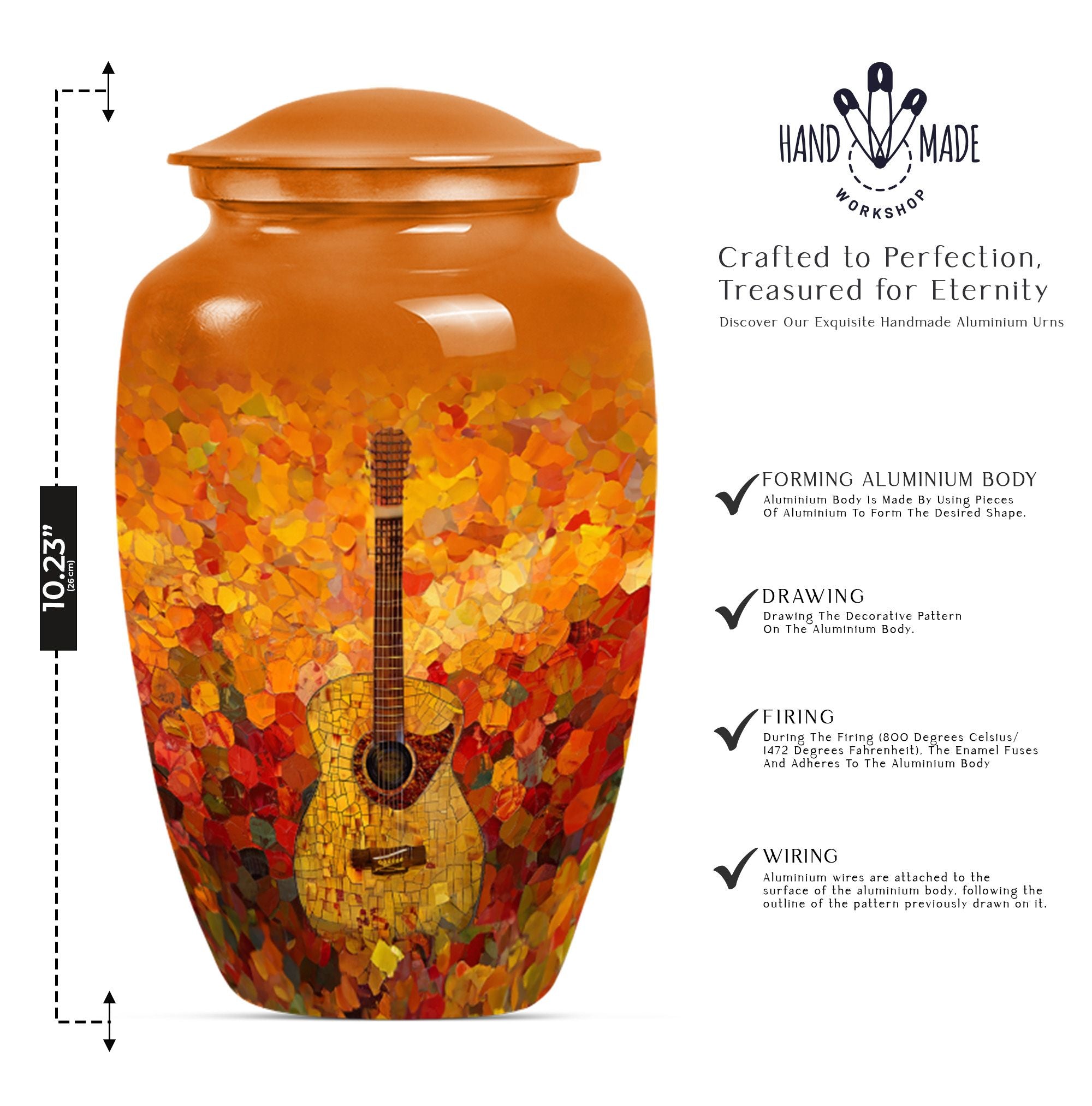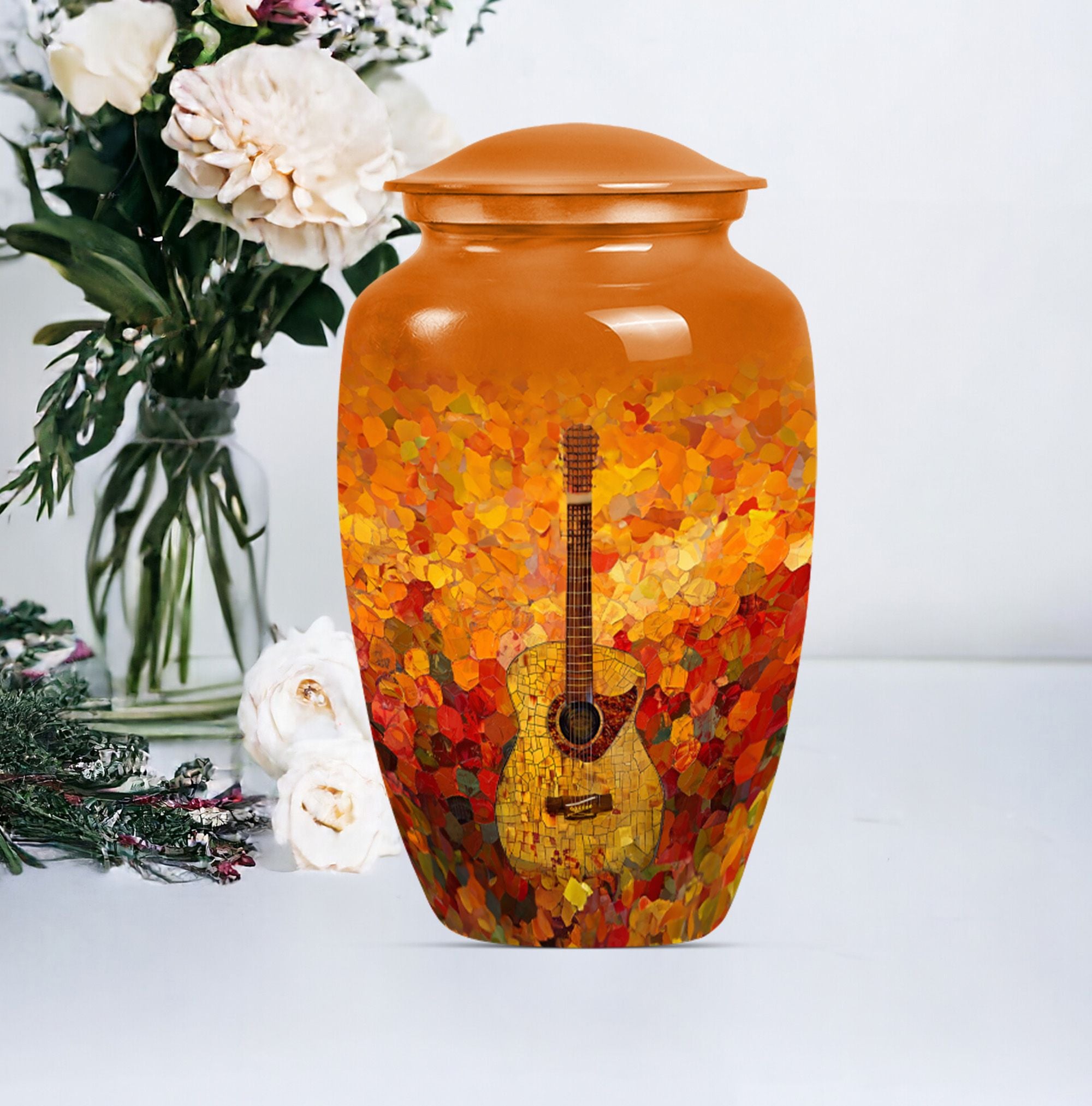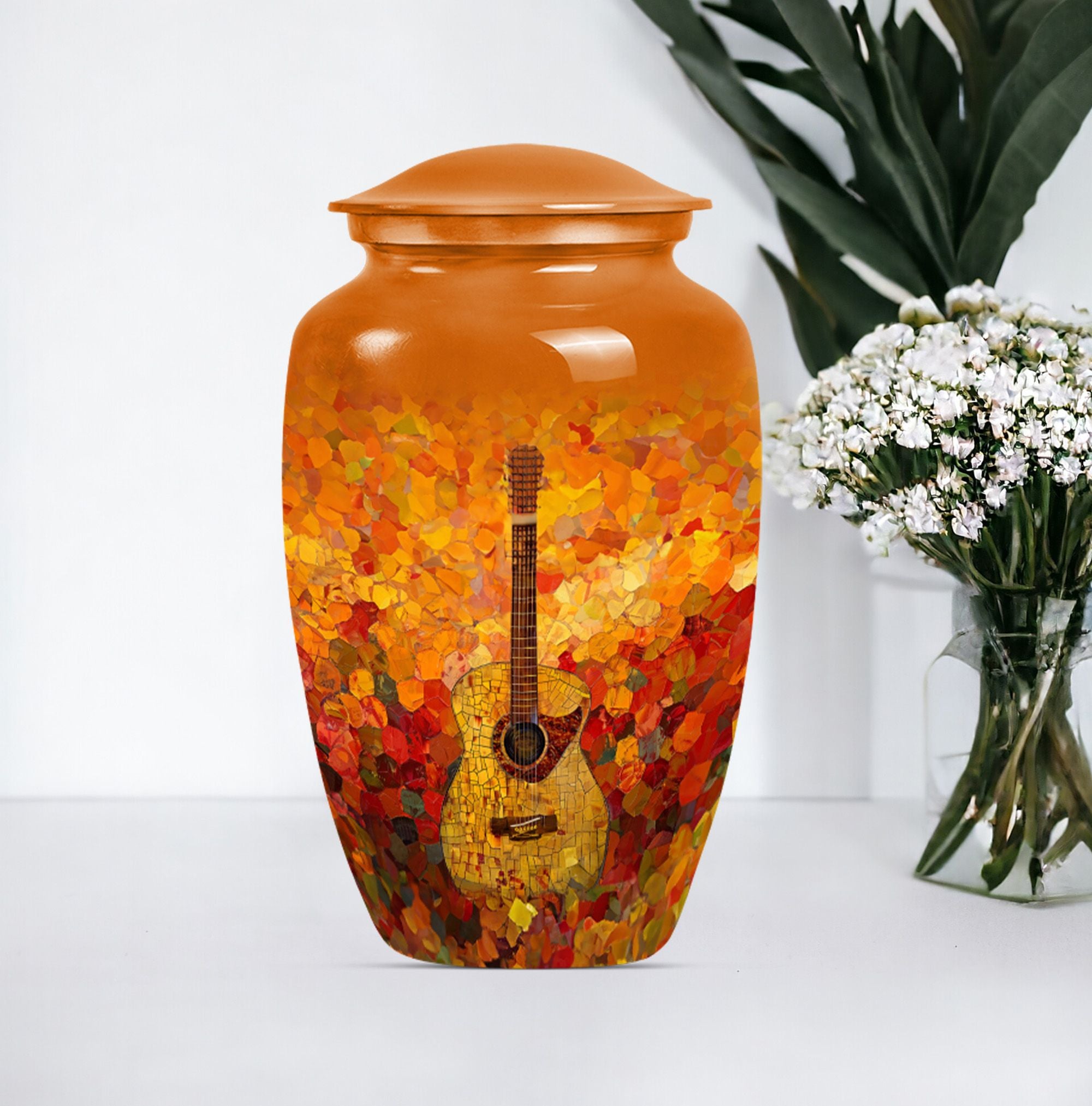 Remember your loved one with an artefact as extraordinary as they were. This crowning 10-inch crafted 'Guitar Urn' is the perfect cremation urn for adults. At 3.3 pounds with a 200 cubic inches capacity, it's more than just an urn for ashes—it's about keeping memories alive. Exhibiting an abstract theme, this large urn is fabricated from sturdy and lasting aluminium, symbolizing everlasting love and remembrance. Uniquely catered towards both male and female, it also qualifies as an elegant companion urn for two adults. Its size is perfect for display, or secure storage in the included velvet pouch. Personalize it with engraved names, adding a touch of intimacy and uniqueness. Complementing every space, this classic urn encapsulates cherished memories with integrity. Celebrate your loved one's life with this large metal urn, a special container for those irreplaceable ashes and ineffable memories.