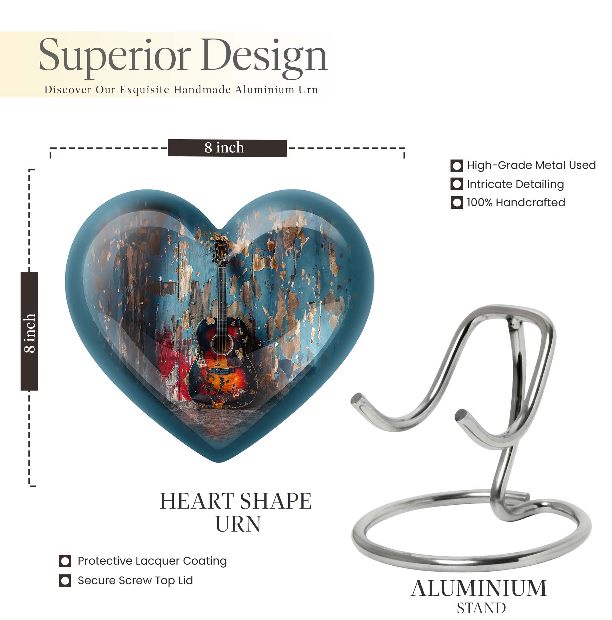 Display your eternal love and pay a respectful tribute to your departed beloved with our uniquely crafted 10-inch Guitar Urn. Comprised of high-quality aluminium, this rare large-format cremation urn balances durability and artistic aesthetics. The captivating abstract theme is universal, appealing to both mom and dad, while the heart-shaped form adds a touching sentimental flair. With a weight of just 3.3 pounds, it is substantial, yet easily manageable. This urn has an impressive capacity of 200 cubic inches, ample space to secure the ashes of loved ones. Personalization options are also available with engraved names, truly making this a one-of-a-kind tribute. Each purchase also includes a velvet pouch for an added layer of dignified containment for the ashes. Whether it's burial urns metal, urn for mom or cremation urns for dad, our Guitar Urn meets a wide range of your ceremonial needs. This product seamlessly blends the essence of religious & ceremonial memorial supplies.