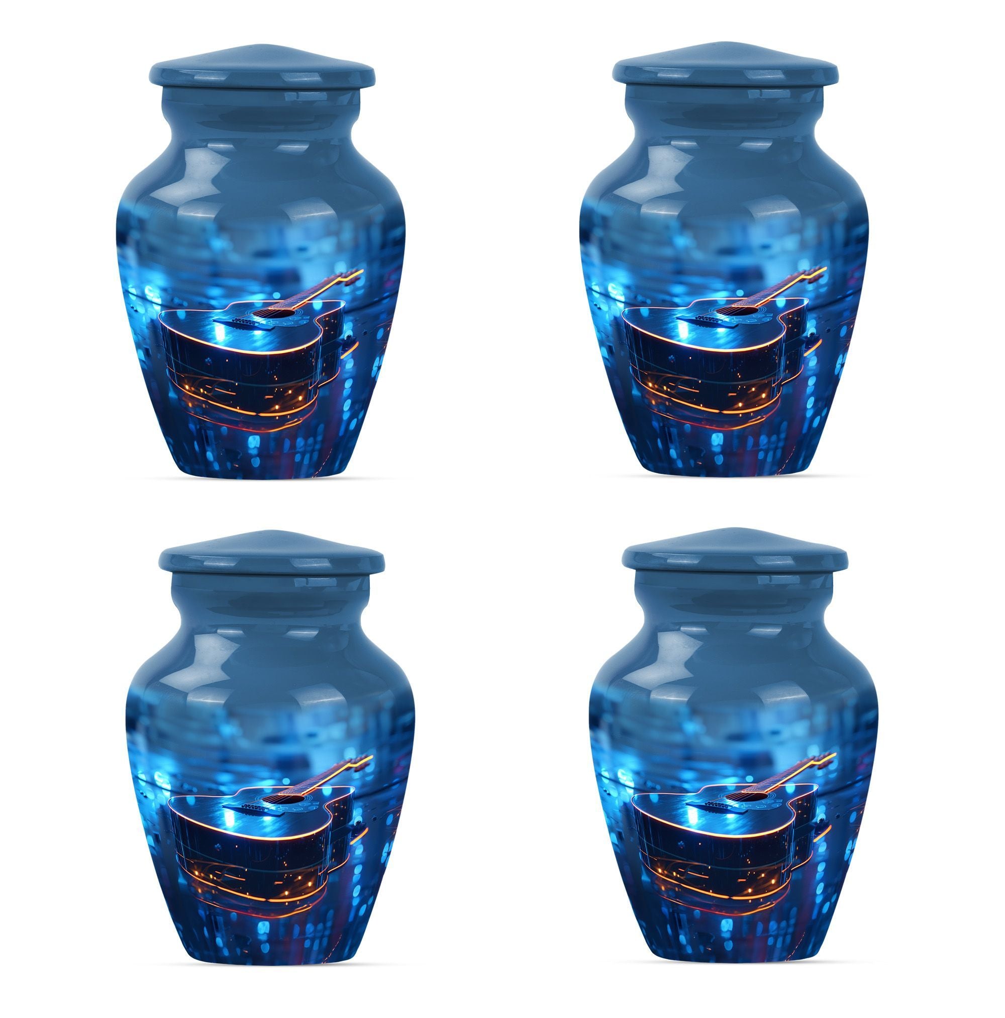 Pay tribute to your cherished loved one with our artfully crafted Guitar Urn, a striking interpretation of the timeless 'Classic Urn' silhouette. This uniquely abstract themed large urn is meticulously sculpted from high-quality aluminium, an affirmation of durability and longevity. Weighing at 3.3 pounds and standing tall at 10 inches, this memorial urn for men and women epitomizes a profound symbolic representation of your precious memories with your dearly departed. The urn boasts a generous capacity of 200 cubic inches, substantial enough to securely contain adult human ashes. Reflecting an aura of personal touch, this cremation urn lets you customize with engraved names, connecting you more truly with your beloveth's memoir. Packaged with a velvet pouch for containment of ashes, this product prolongs an intimate, silent conversation with the departed soul . Our 10-inch Guitar Urn is not just a metal urn for human ashes; it is a promise of permanence and a testament to a life beautifully lived and profoundly missed.