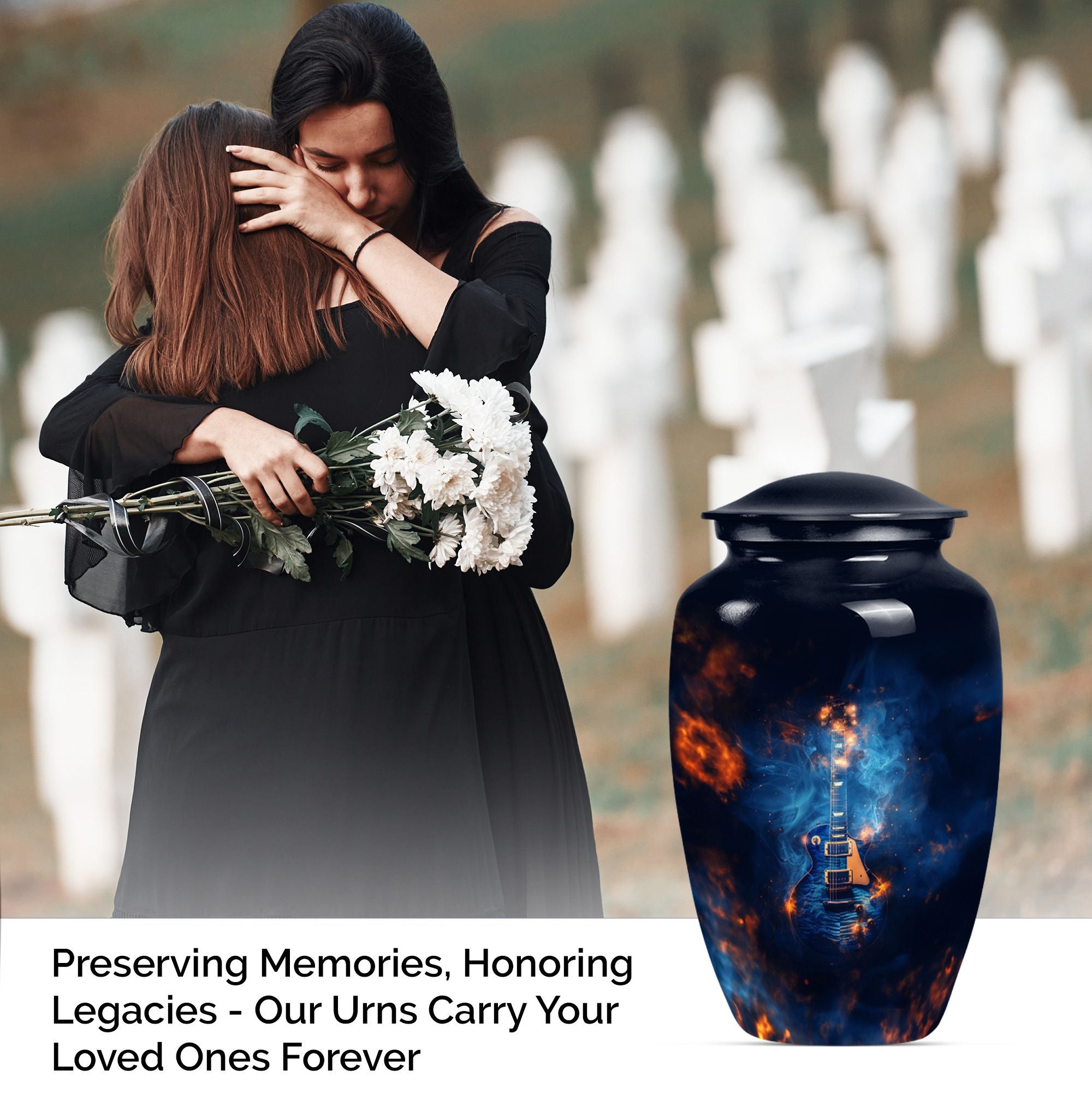 Crafted from high-quality aluminium, this urn reflects both durability and artistry. Its striking guitar-themed design symbolizes passion, creativity, and individuality, making it a special choice for music lovers. Designed as an urn for ashes adult male or a women adult urn, its secure screw-top lid ensures ashes remain safely preserved. This versatile design also makes it meaningful for those seeking urns women human ashes or urn ashes men, blending beauty with functionality.