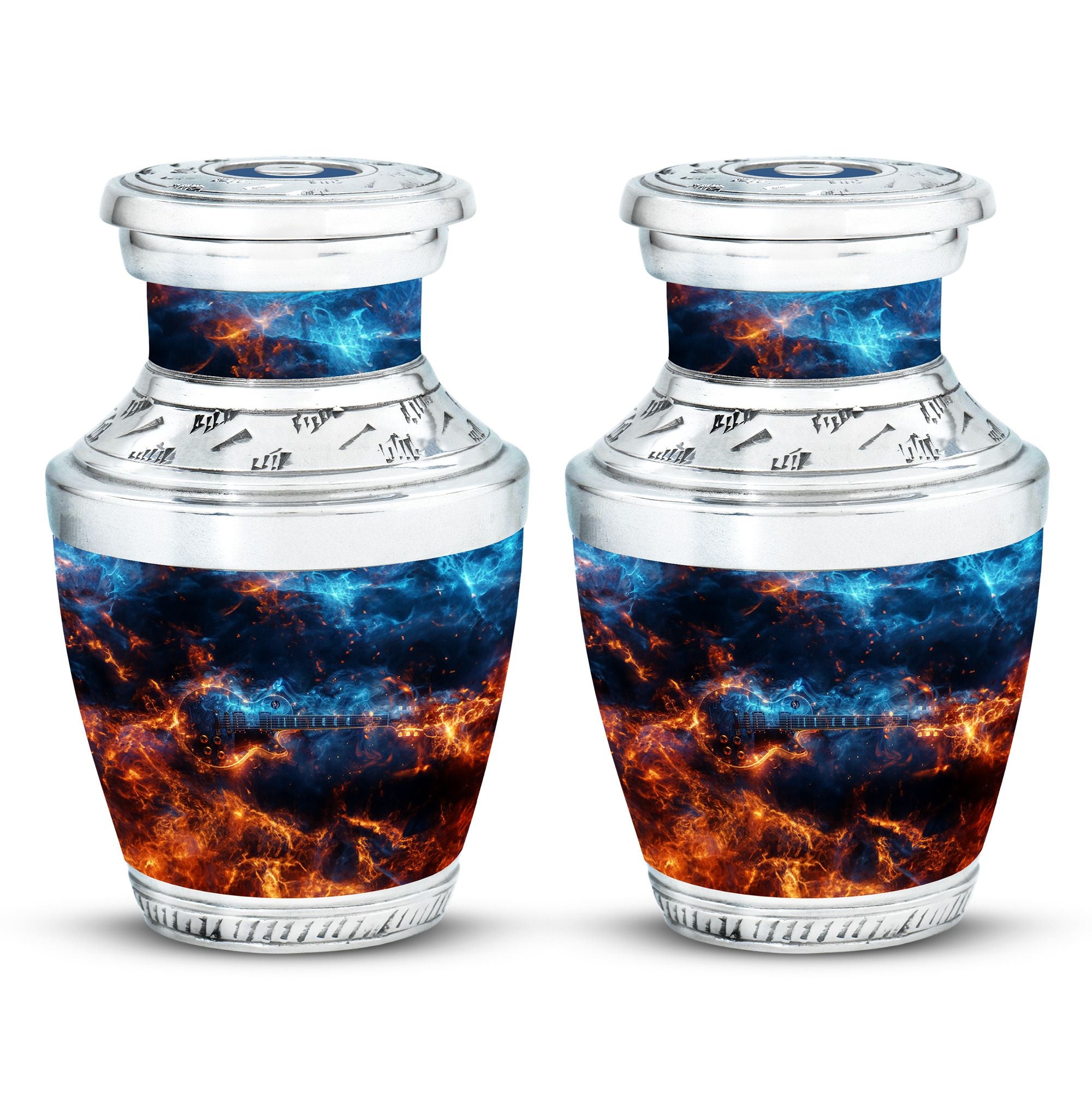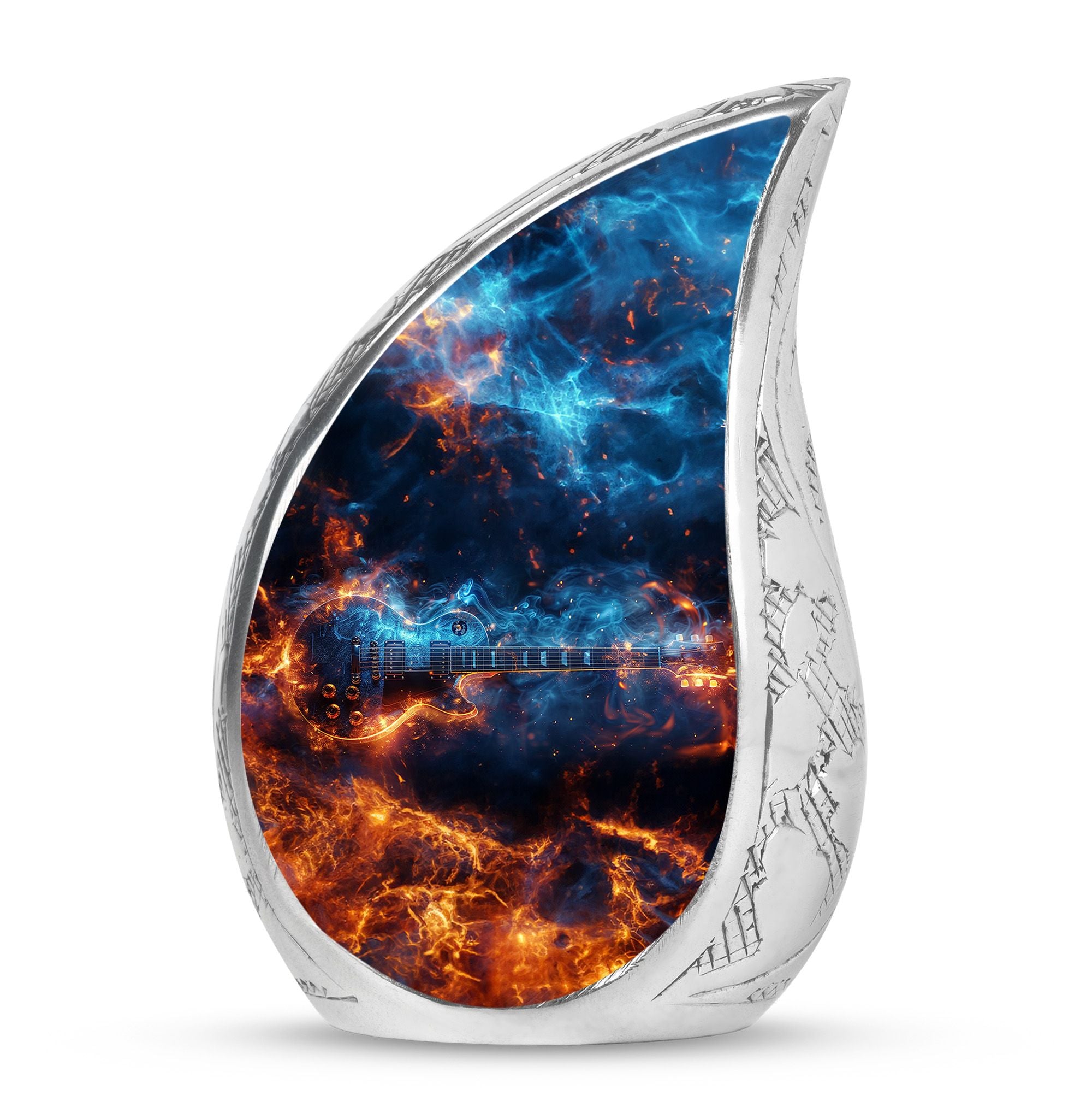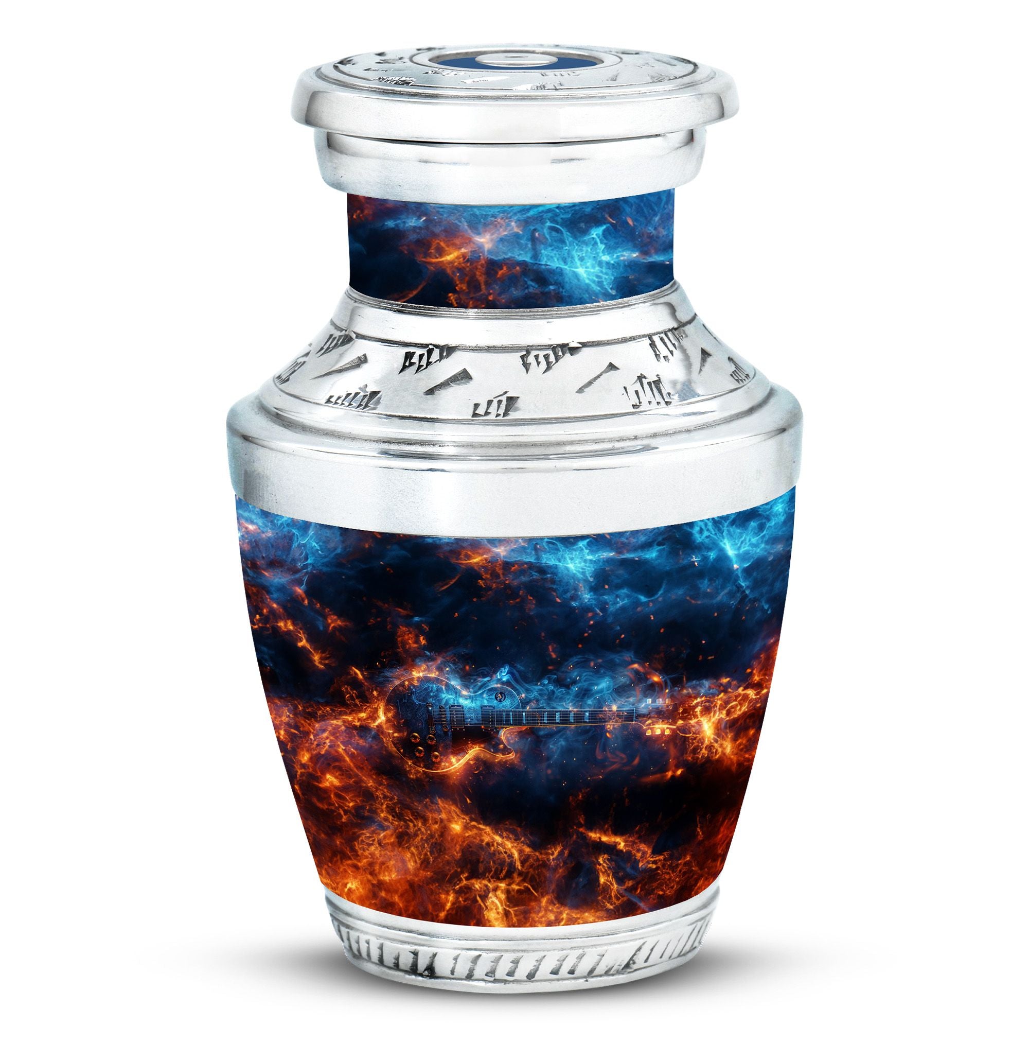 This **cremation urn for human ashes** **preserves the memory of a musician, reflecting their passion for melodies and rhythm**.