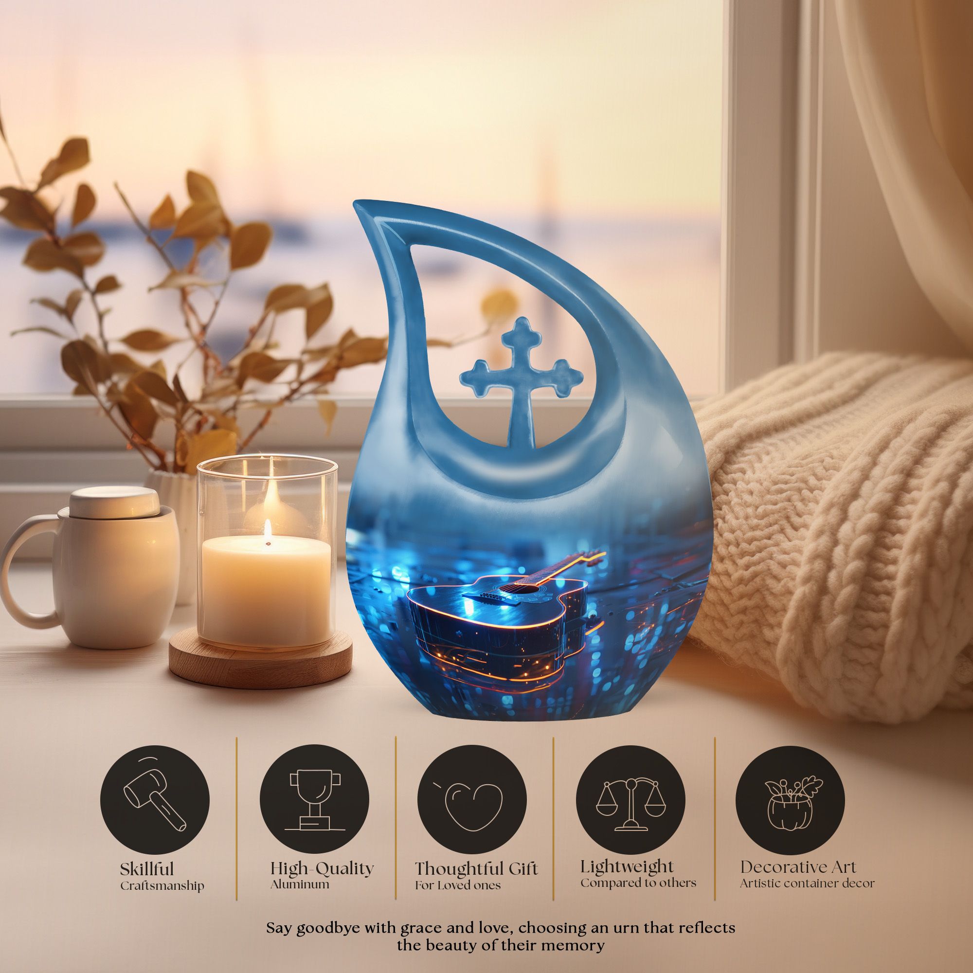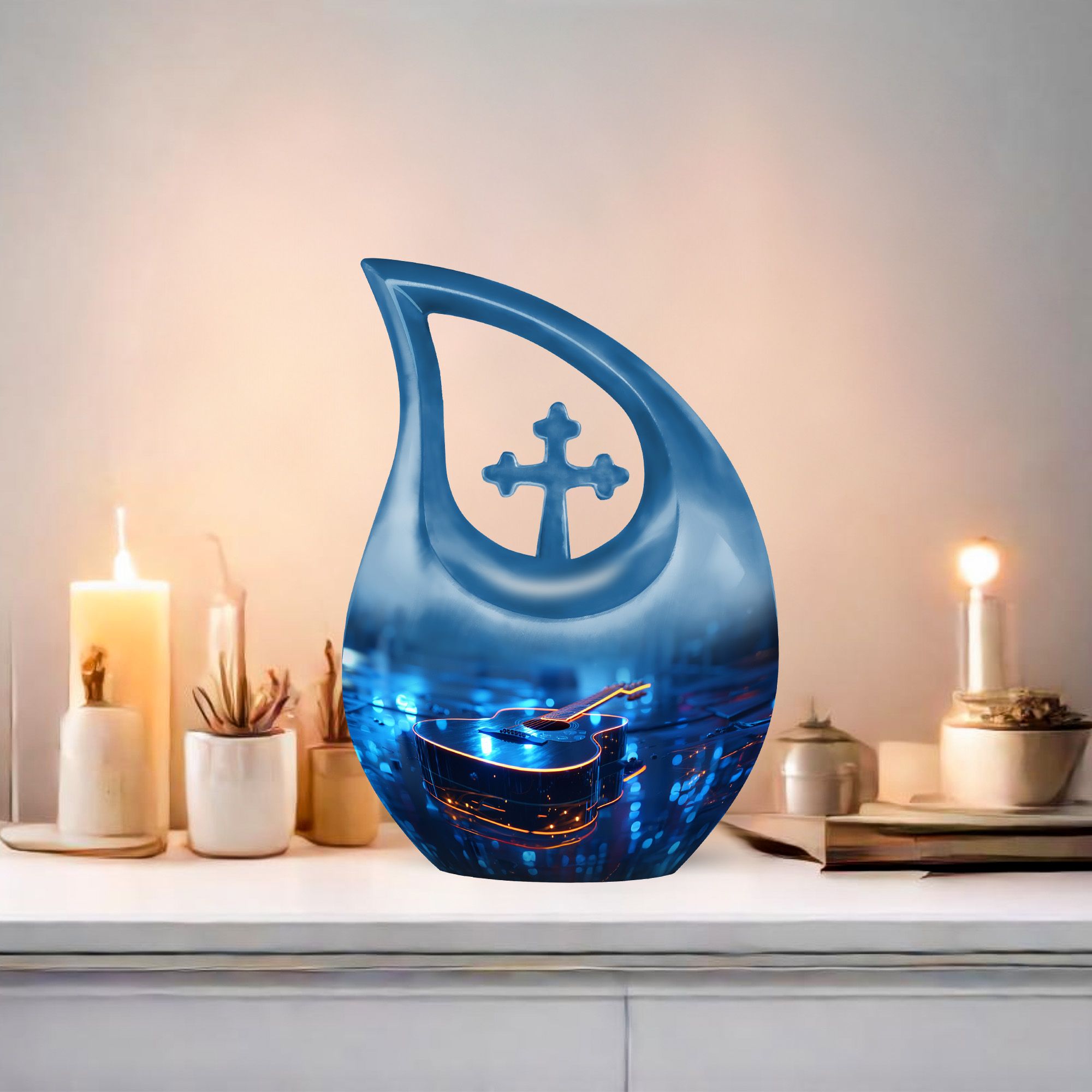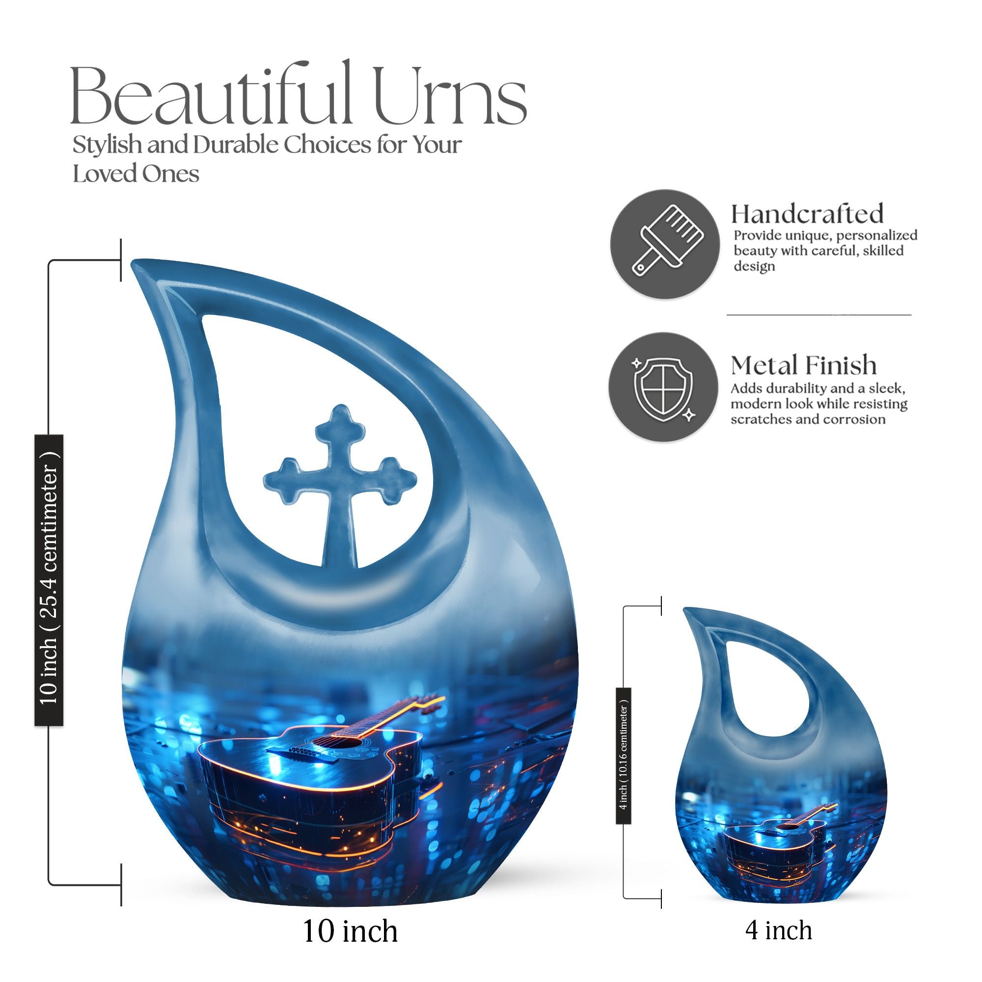 Encapsulate your loved one's eternal melody with our Guitar Urn, designed to pay tribute to their beautiful soul. With an alluring 'Cross Drop' theme, this fascinating piece amongst memorial urns combines a deep emotional connection with resolute durability, thanks to its robust aluminium construction. Sized at a substantial 10-inch height and with a weight of 3.3 pounds, it assures a significant presence of remembrance. It impressively accommodates up to 200 cubic inches of ashes, making it ideal for adults. Along with the urn, there is a complimentary velvet pouch included, ensuring tender protection for the precious remains it secures. One of the most enduring personalized urns currently available, you can customize it with engraved names, consolidating a truly unique homage for your dearest. Perfect for those in search of customized urns for ashes for adults, but also makes for a unique urn for dad or any loved one keen on tuning the eternal strings of love and memories.
