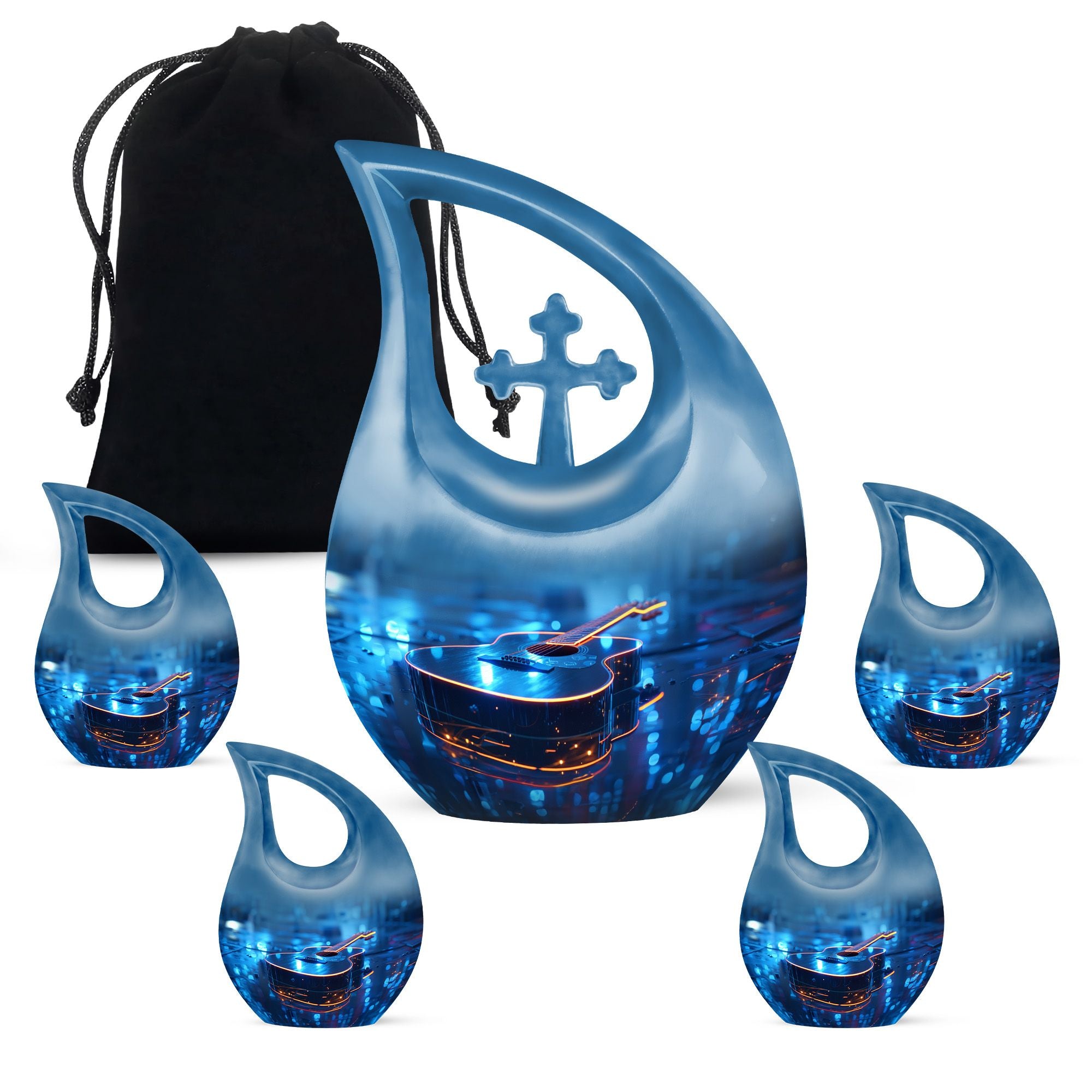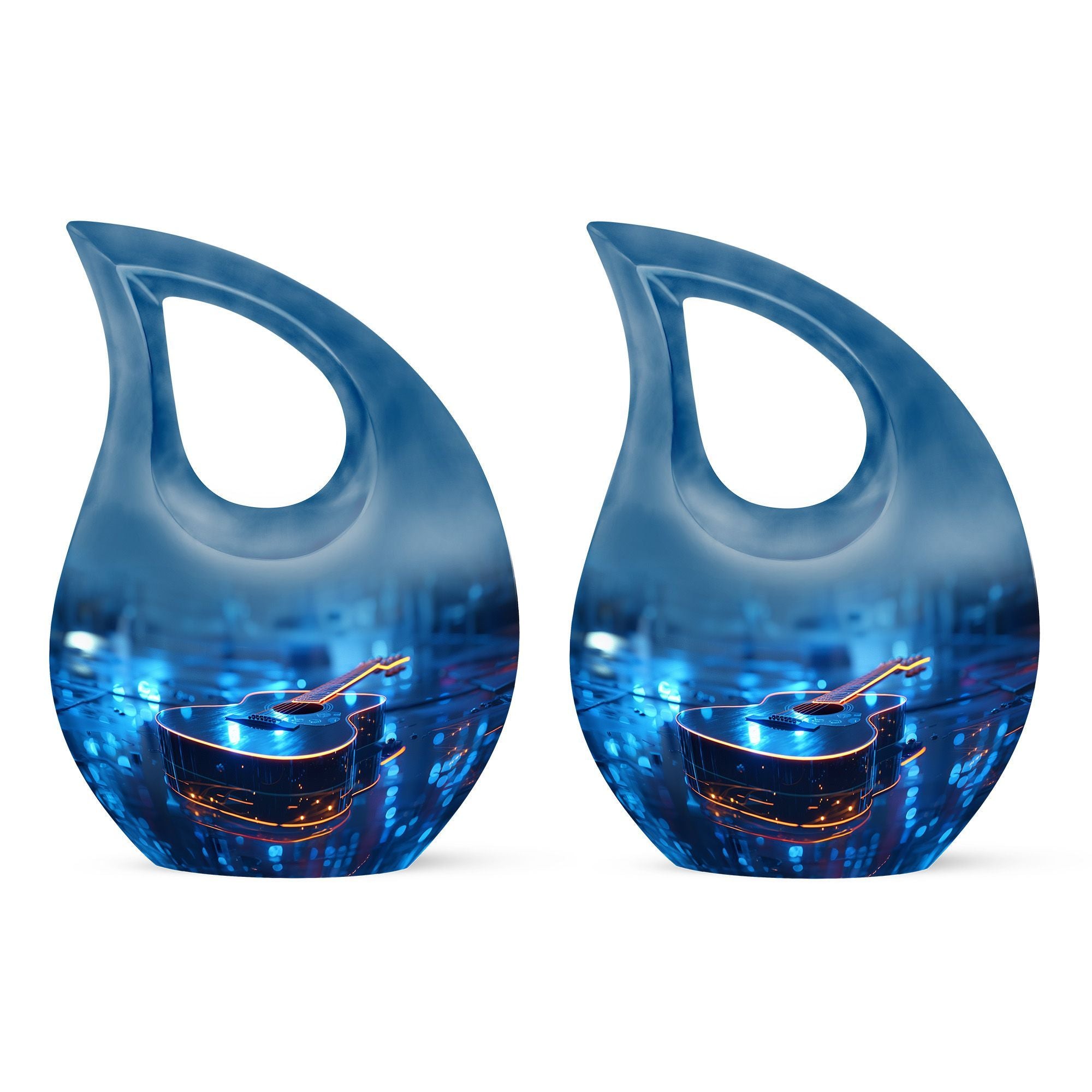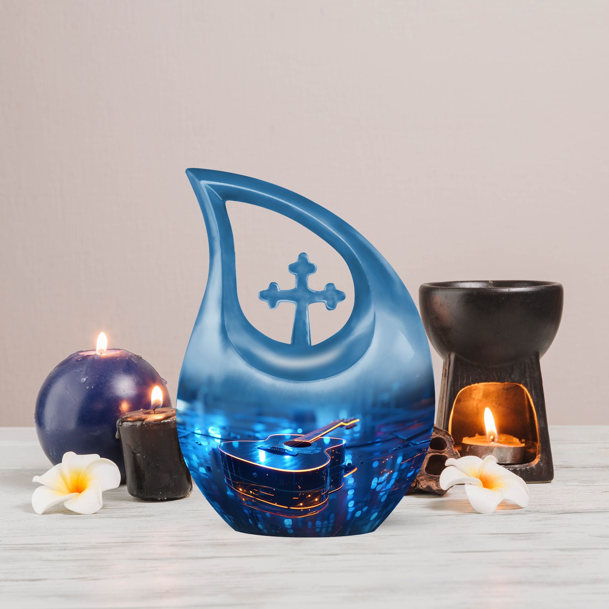 Encapsulate your loved one's eternal melody with our Guitar Urn, designed to pay tribute to their beautiful soul. With an alluring 'Cross Drop' theme, this fascinating piece amongst memorial urns combines a deep emotional connection with resolute durability, thanks to its robust aluminium construction. Sized at a substantial 10-inch height and with a weight of 3.3 pounds, it assures a significant presence of remembrance. It impressively accommodates up to 200 cubic inches of ashes, making it ideal for adults. Along with the urn, there is a complimentary velvet pouch included, ensuring tender protection for the precious remains it secures. One of the most enduring personalized urns currently available, you can customize it with engraved names, consolidating a truly unique homage for your dearest. Perfect for those in search of customized urns for ashes for adults, but also makes for a unique urn for dad or any loved one keen on tuning the eternal strings of love and memories.