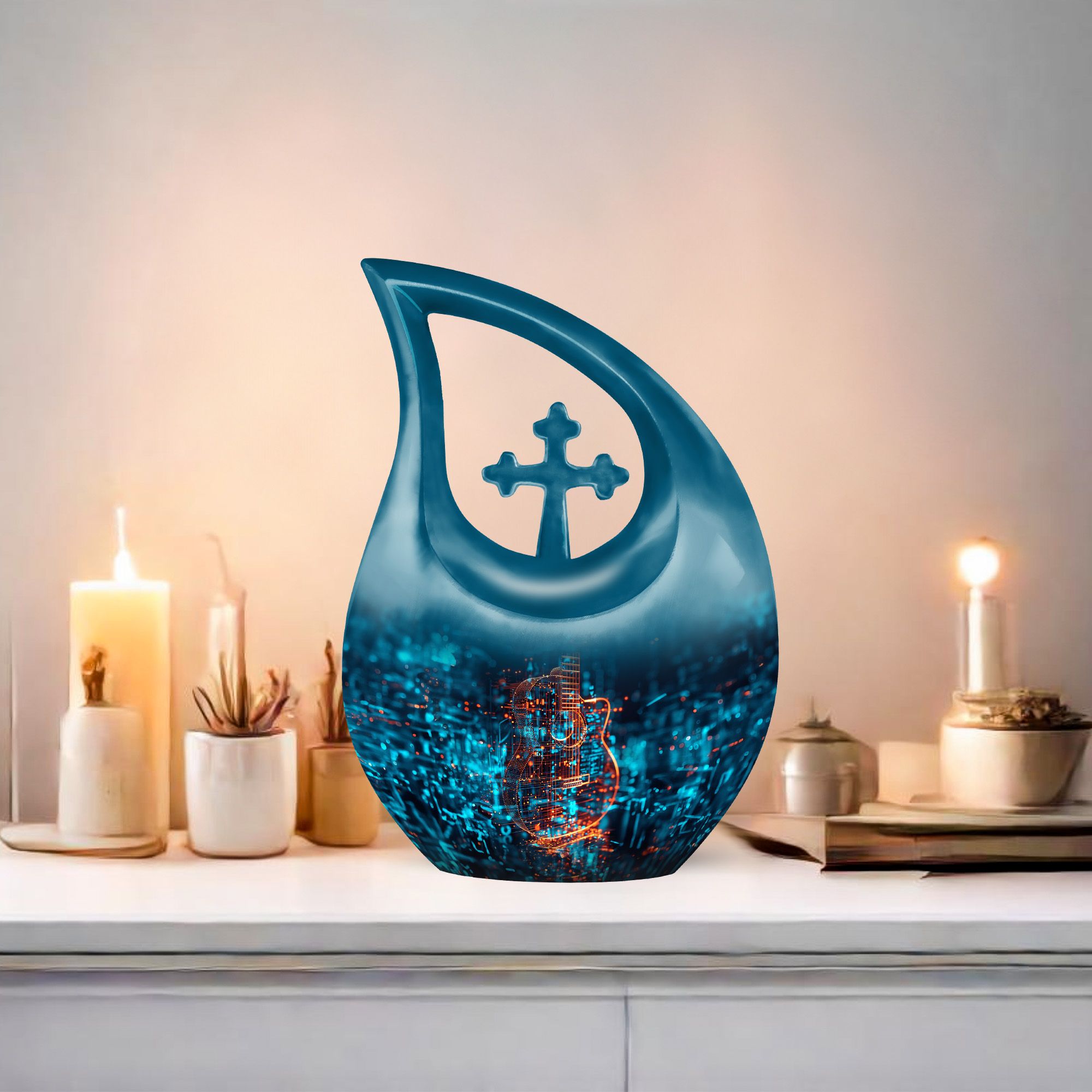 Experience peace of mind with our remarkable Guitar Urn, a must-have memento from our selection of Memorial Ceremony Supplies. Designed with a distinctive 'Cross Drop' theme, this Large Urn captures the essence of your loved ones. Crafted to perfection from high-quality Aluminium, it showcases an eye-catching guitar theme that will touch the hearts of anyone who sees it. Its size is quite considerable, standing 10 Inches tall, capable of holding up to 200 cubic inches in capacity, and balancing carefully at 3.3 pounds in weight. The urn also comes with an option for personalization, where engraved names can be etched in the gloriously perfected metal. Each purchase also contains a soft velvet pouch, a perfect containment solution for the ashes of your loved one. As far as Metal Cremation Urns go, this item resonates with tenderness and beauty, staying faithful to the spirit of your departed loved one. Search terms other customers used: 'Miniature Urns for Ashes', 'Blue Urn for Ashes', 'Ashes Urns for Sale', 'Garden Urns for Ashes'.