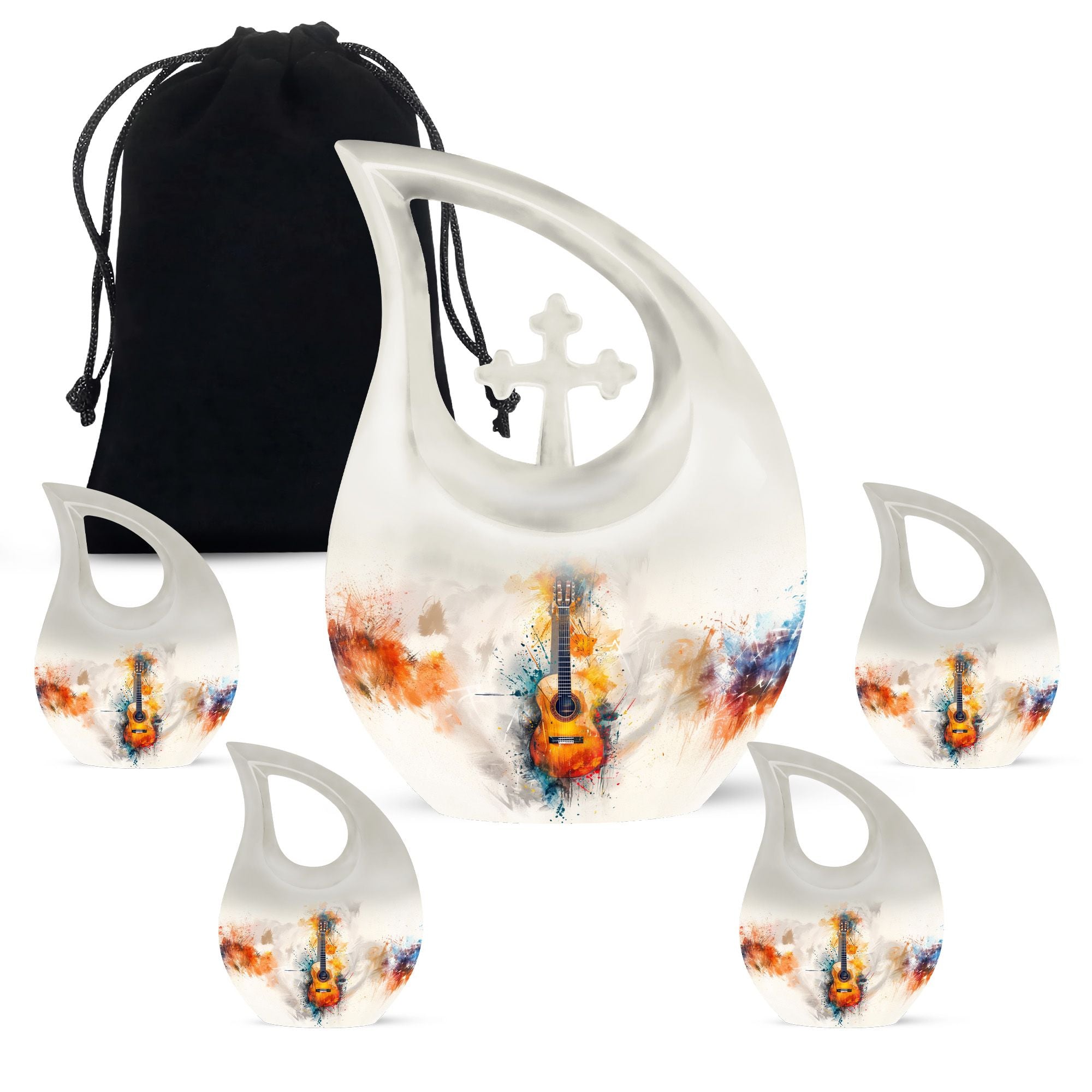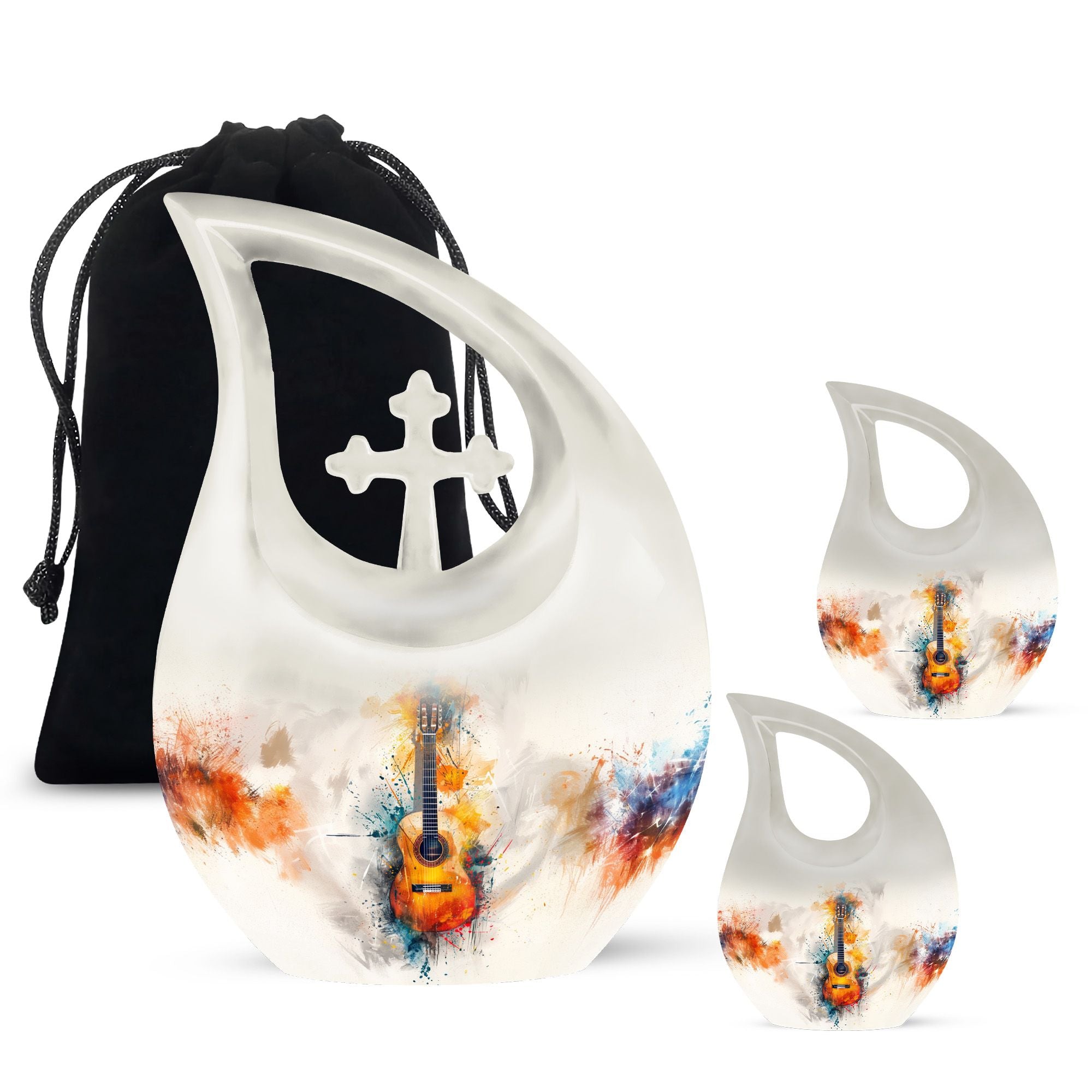 Immerse in profound serenity as you honor your loved one with our Cross Drop Guitar Urn. As one of our distinguishing large urns for men's ashes, this piece adds a unique spin to memorial urns, celebrating a passion for music. The masterfully crafted aluminium urn stands 10 inches tall, with an accommodating size of 200 cubic inches, making it capable of housing the ashes of an adult. For a weight of 3.3 pounds, it features a 'Cross Drop' theme, subtly interweaving faith with a love for the guitar. This specialty item comes complete with a velvet pouch providing a respectful repository for the ashes of your loved one. For an added touch of intimacy, we offer personalization, allowing for engraved names. If you seek tribute items beyond the customary, such as extra large cremation urns or keepers for ashes for a man, our Cross Drop Guitar Urn stands as a soulful alternative. Elevate your memorial ritual with this unique urn, a sublime blend of comfort, creativity, and reverence.
