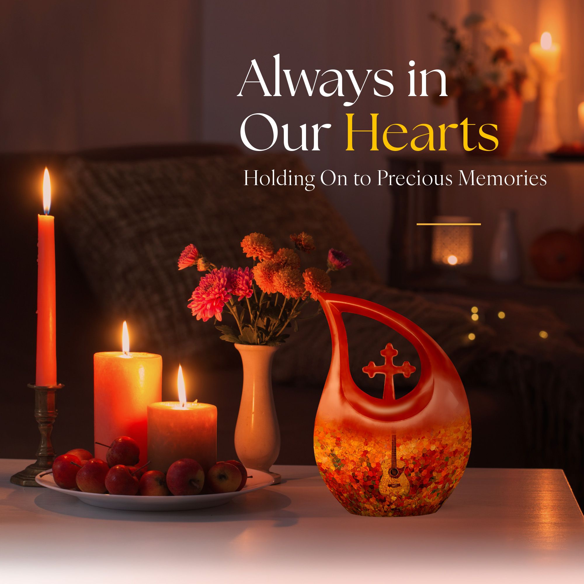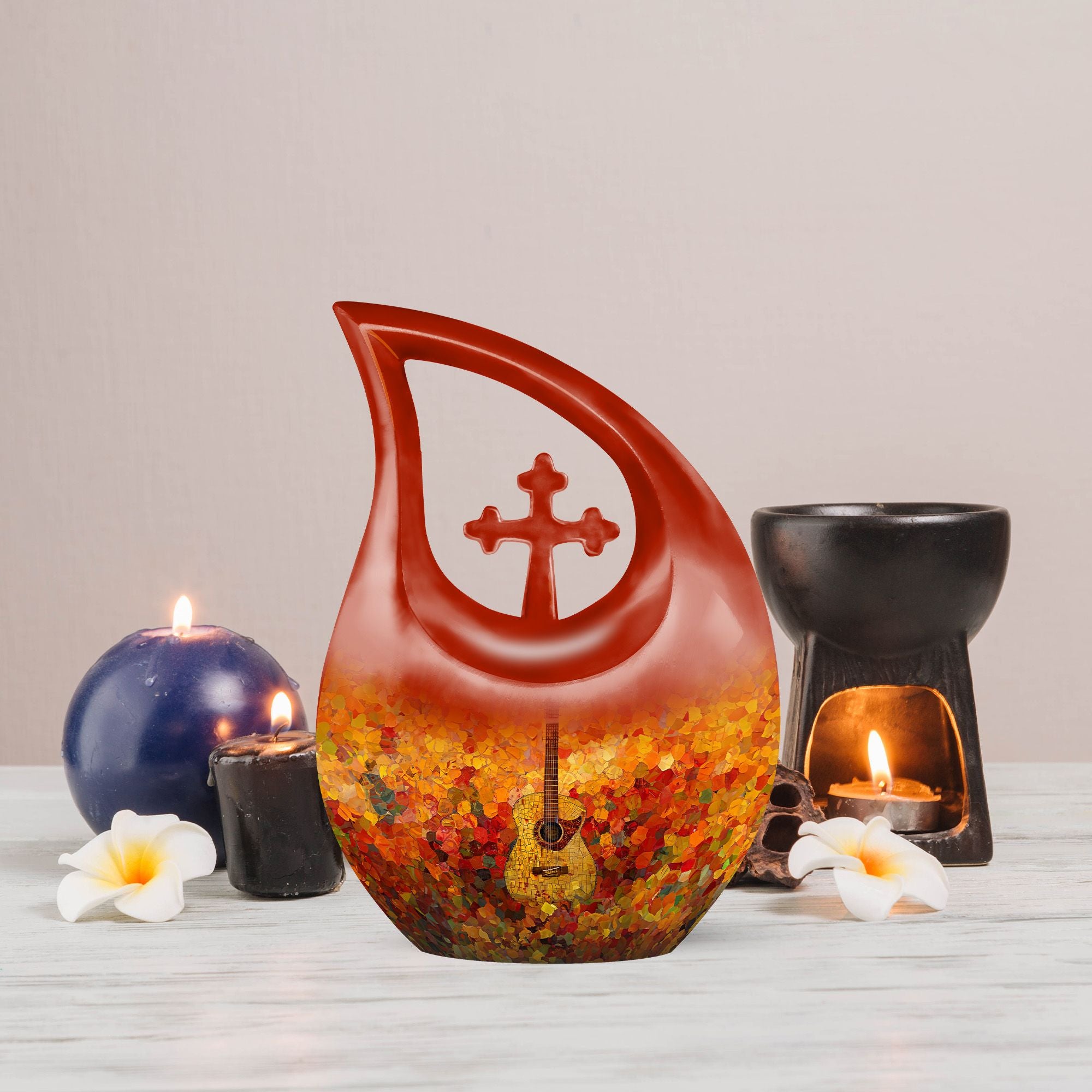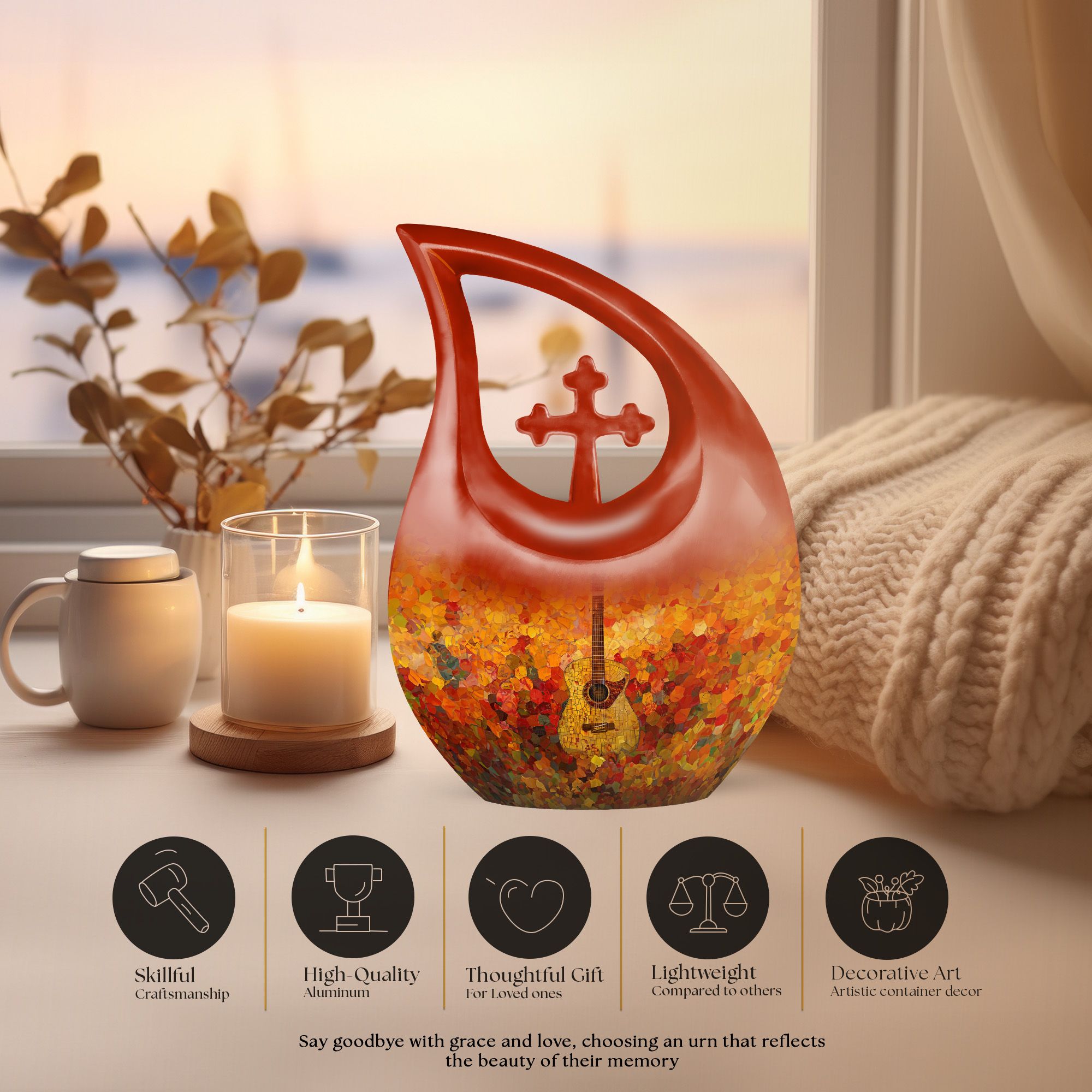 Preserve cherished memories with this authentic 10-inch Guitar Urn, a noteworthy tribute for music-lovers. Meticulously crafted from superior-quality Aluminium, this Large Cremation Urn is indeed an emblem of durability, ensuring a long-lasting remembrance. Adorned with an intricate 'Cross Drop' theme, it exudes a sense of tranquility and grace, upholding the spirit of your departed loved one. This urn can securely hold up to 200 cubic inches of ashes, providing sufficient space for most adults. Weighing 3.3 pounds, it is manageable and can be conveniently positioned in your beloved place. The urn offers customization options; you can personalize it with engraved names, adding an intrinsic touch of fond recollections. It comes with a velvet pouch to tactfully contain the ashes. Widely sought after for its affordability, this Guitar Urn makes for a considerate choice amongst memorial urns, ashes urns for sale, and cremation boxes medium urns.