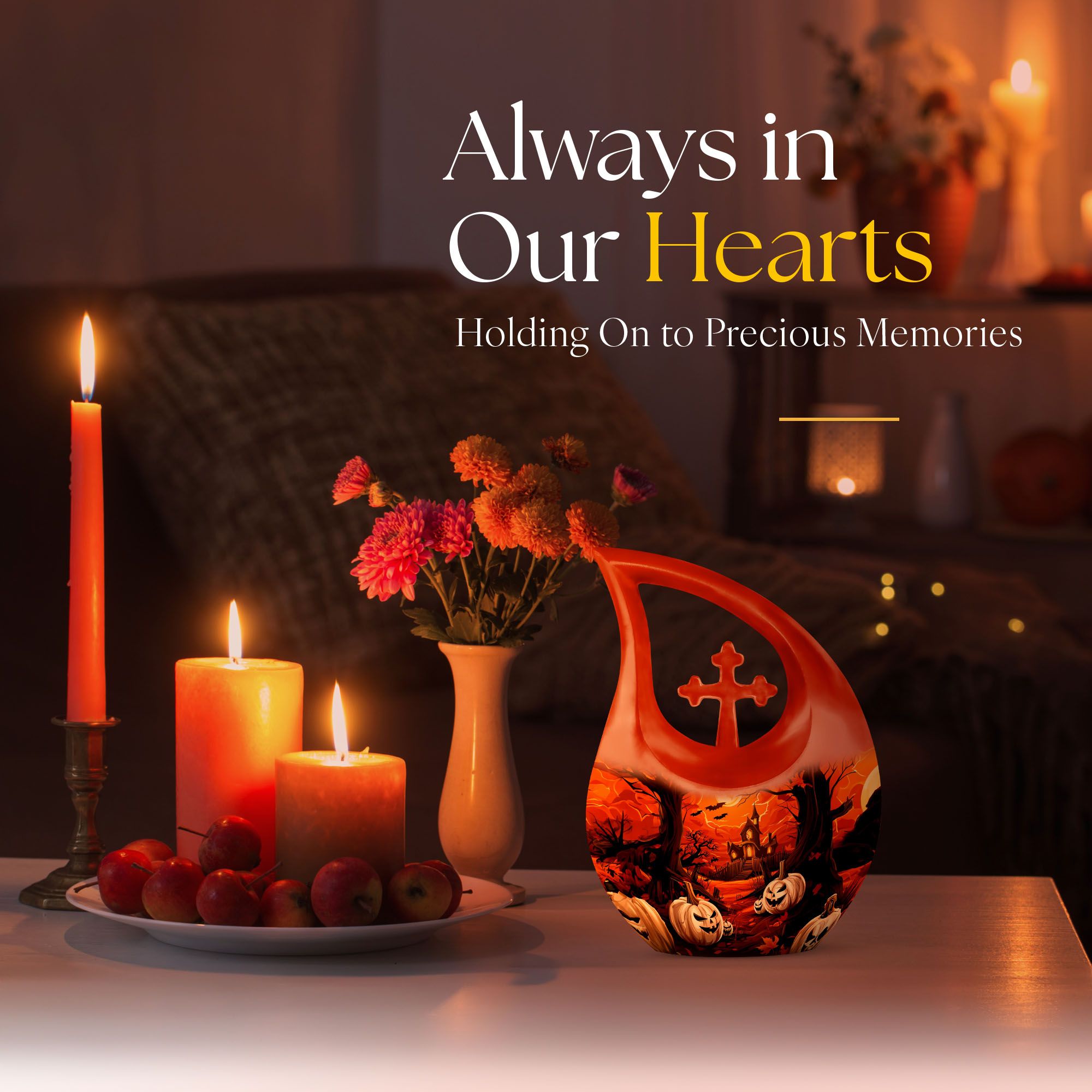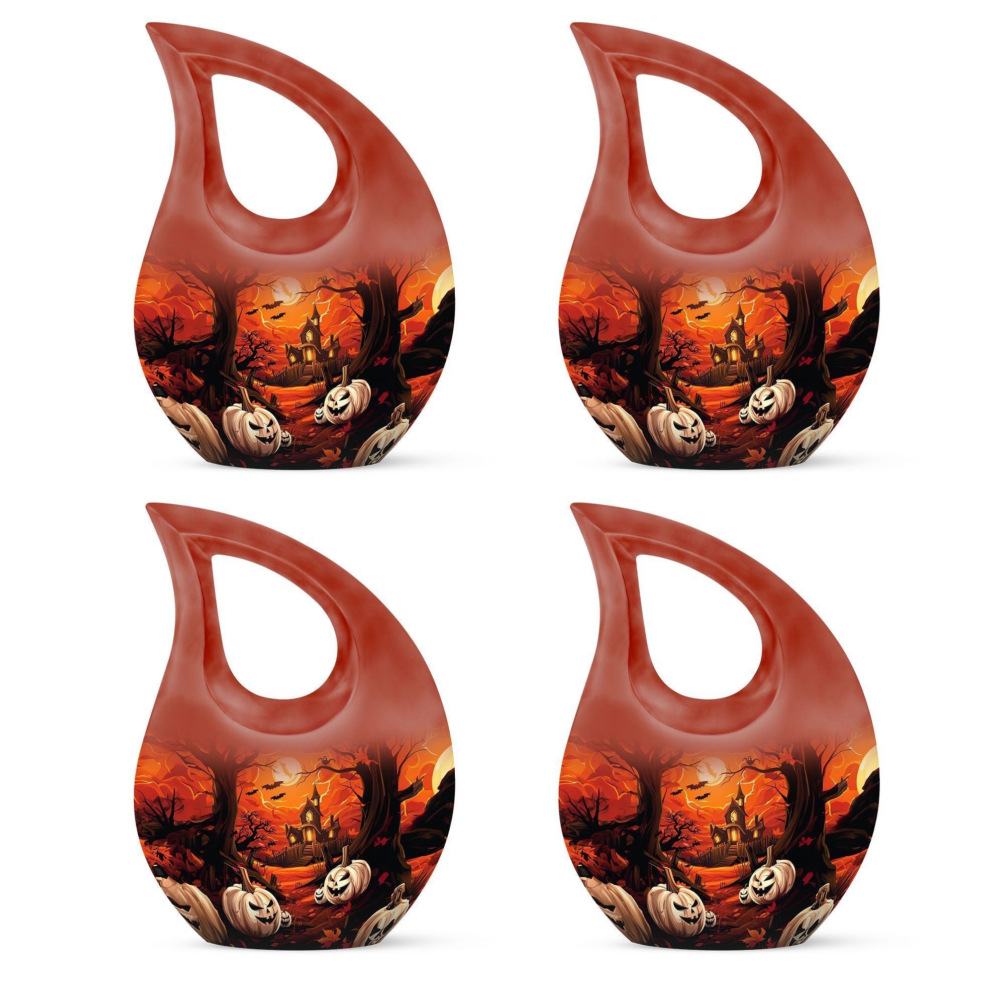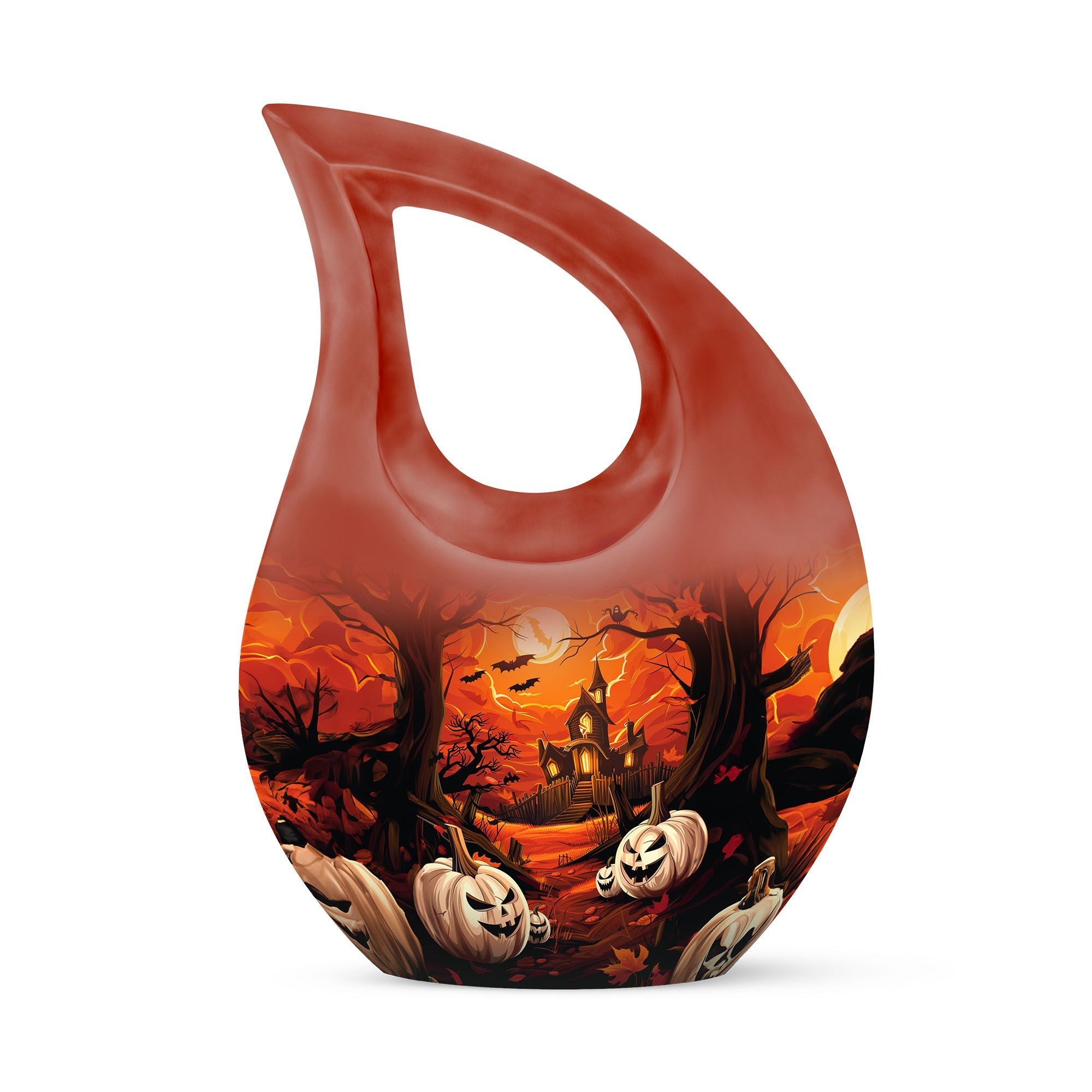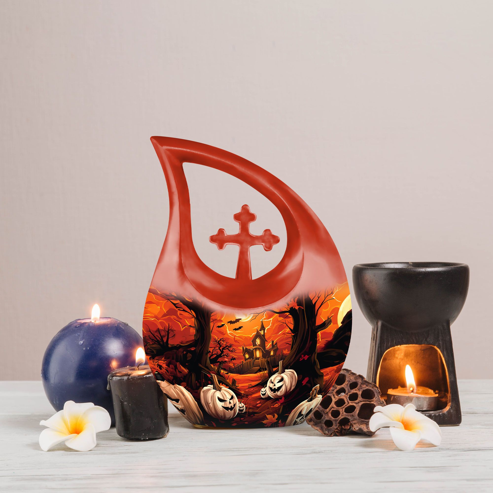 Presenting our unique 'Halloween Urn' for those in search of distinctive 'memorial urns'. A quintessential piece, it is one of our finest 'Miniature Urns For Ashes'. Measuring a substantial 10 inches in height, this 'Large Urn' strikes a perfect balance between convenience and capacity with its generous 200 cubic inches volume. Constructed from premium quality aluminium, it assures lasting durability. Additional to the package is a velvet pouch, ensuring secure containment of the cherished ashes. As a special characteristic, the urn endorses a unique 'Cross Drop' without signage of a marketplace. An added feature of this 'Blue Urn For Ashes' is that it can be personalized with engraved names, choosing to honor your loved ones in a style that is significant to you. Weighing at a practical 3.3 pounds, this urn is easy to handle. This urn, from the category of 'Large Urns For Human Ashes', gives a nod to the Halloween theme, promising to be a staple within the 'Metal Cremation Urns' selection.