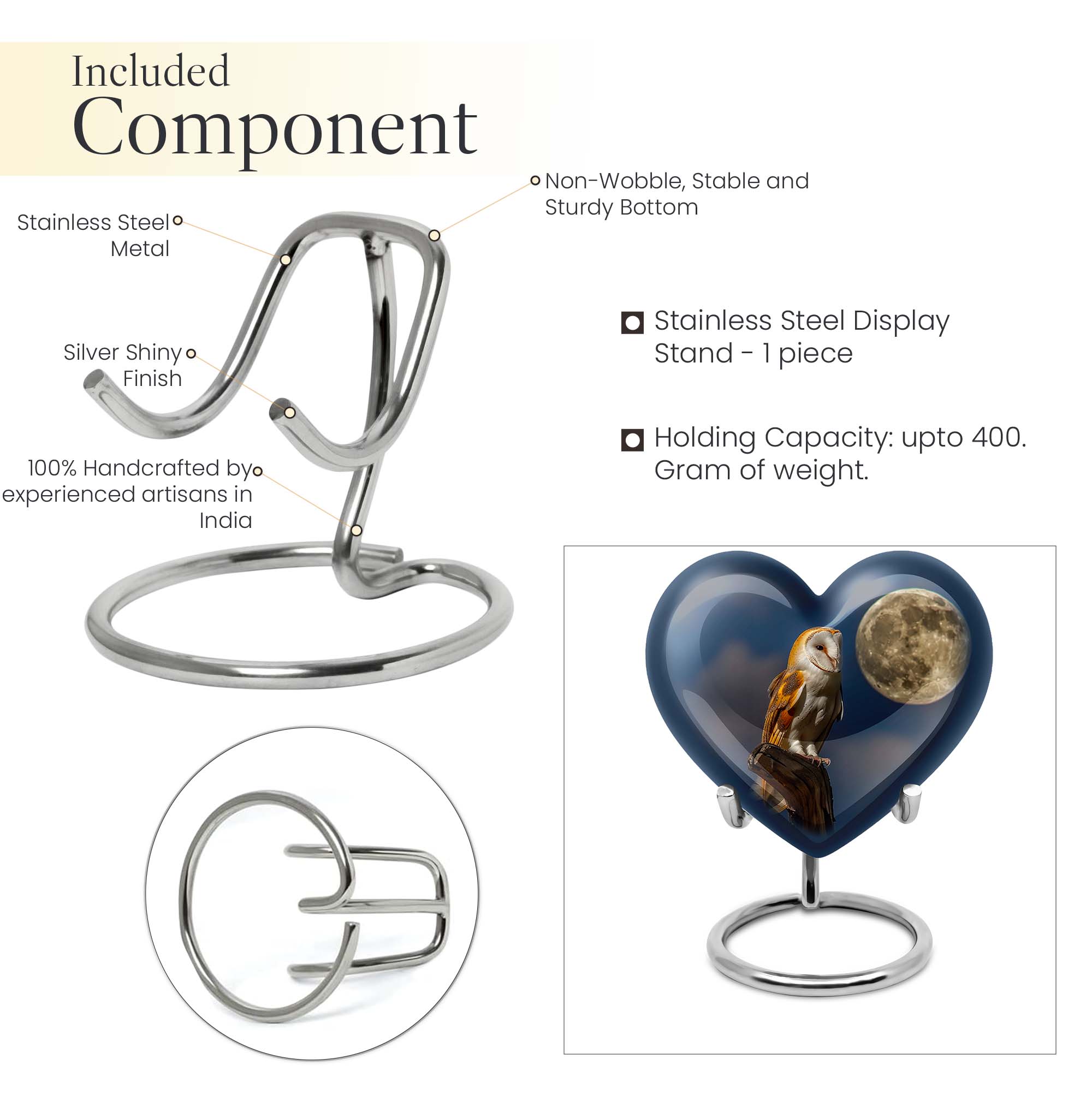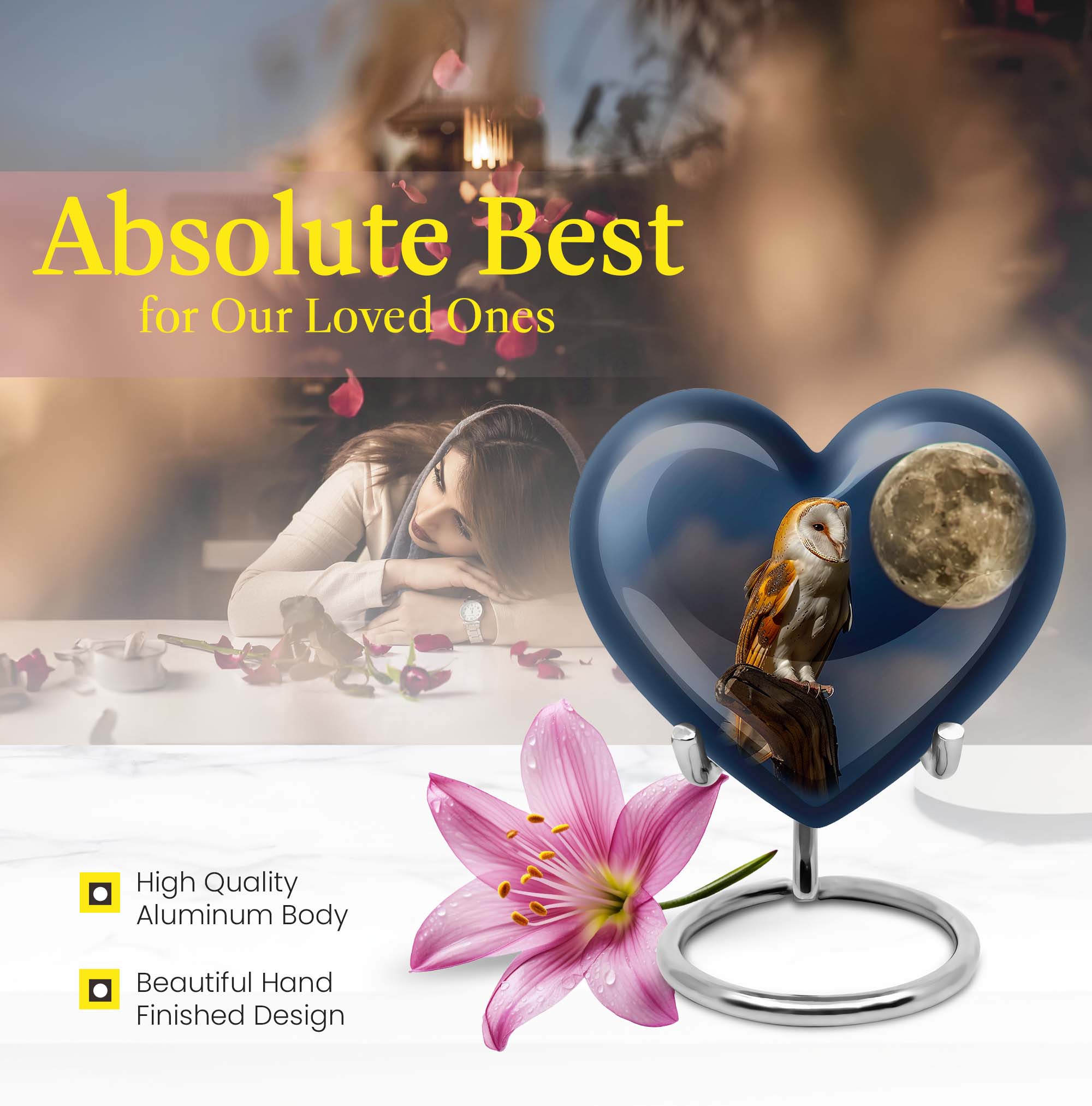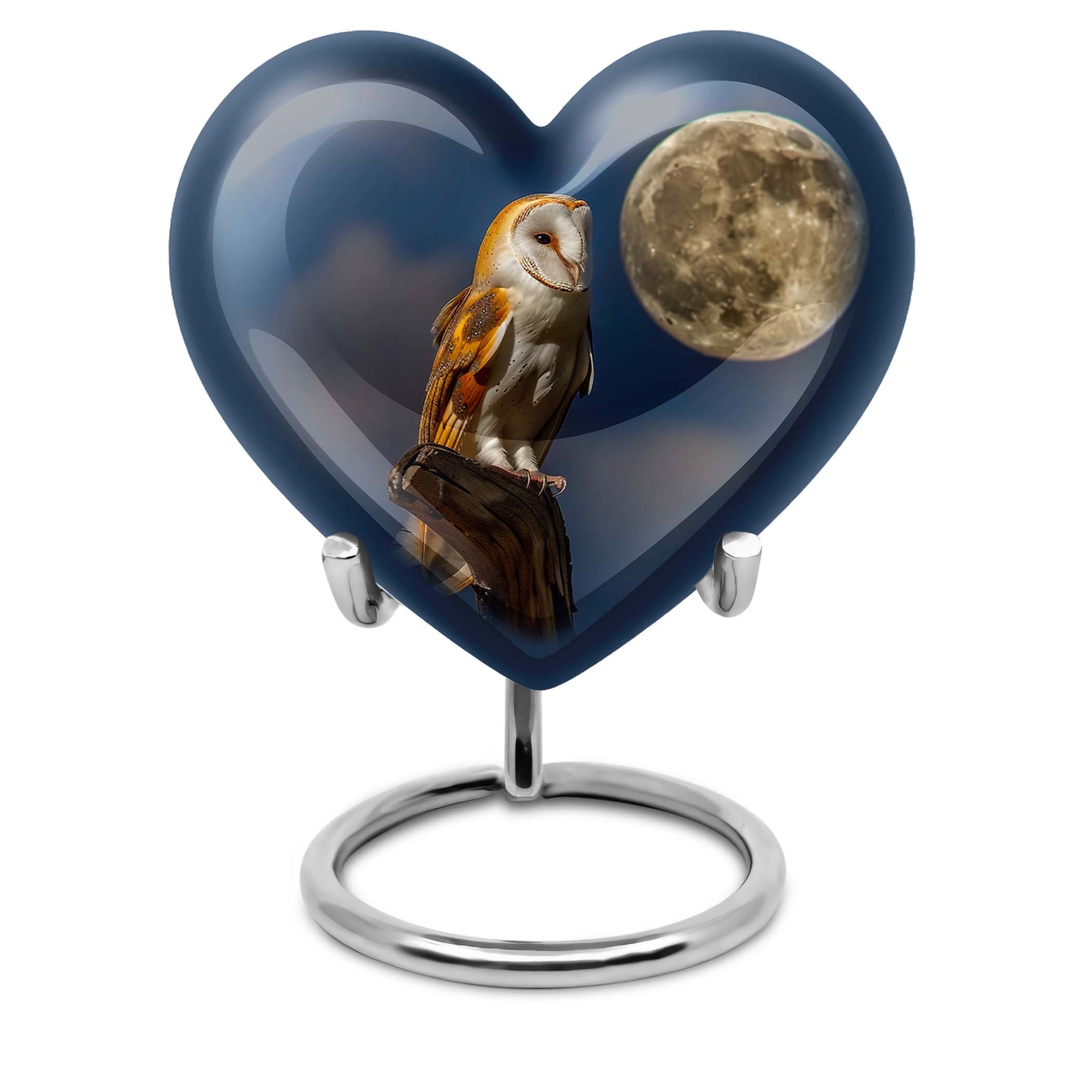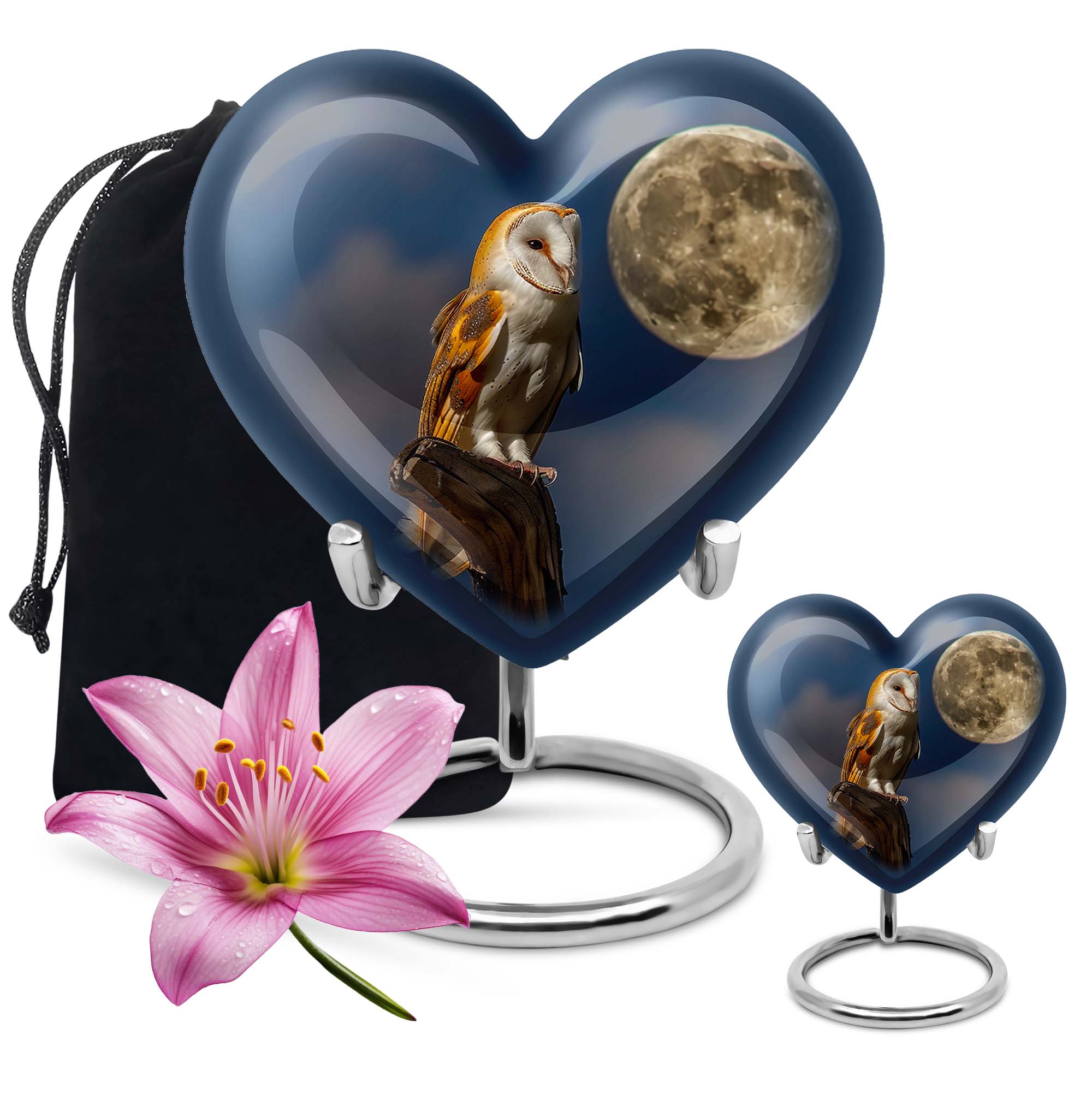 Honor your loved ones with our elegant 10-inch barn owl Urn comprising of a heartfelt Heart Urn design, distinctive in the memorial urns realm. It is a mesmerizing blend of artistry and sentiment, with an abstract theme coursing through its material makeup of sturdy and enduring Aluminium. This cremation medium urn effectively tackles the solemn task of storage, offering a considerable capacity of 200 cubic inches. Furthermore, it balances evocative emotionality with practical functionality, coming with a velvet pouch intended for containment of ashes. Despite its robustness, this large urn is very light, weighing just 3.3 pounds. It also provides the distinct possibility of customization where names can be personally engraved, making it a unique tribute to those whose memories we cherish. This urn stands as a beautiful testament if you are searching for burial urns for adult human ashes or companion cremation urns.