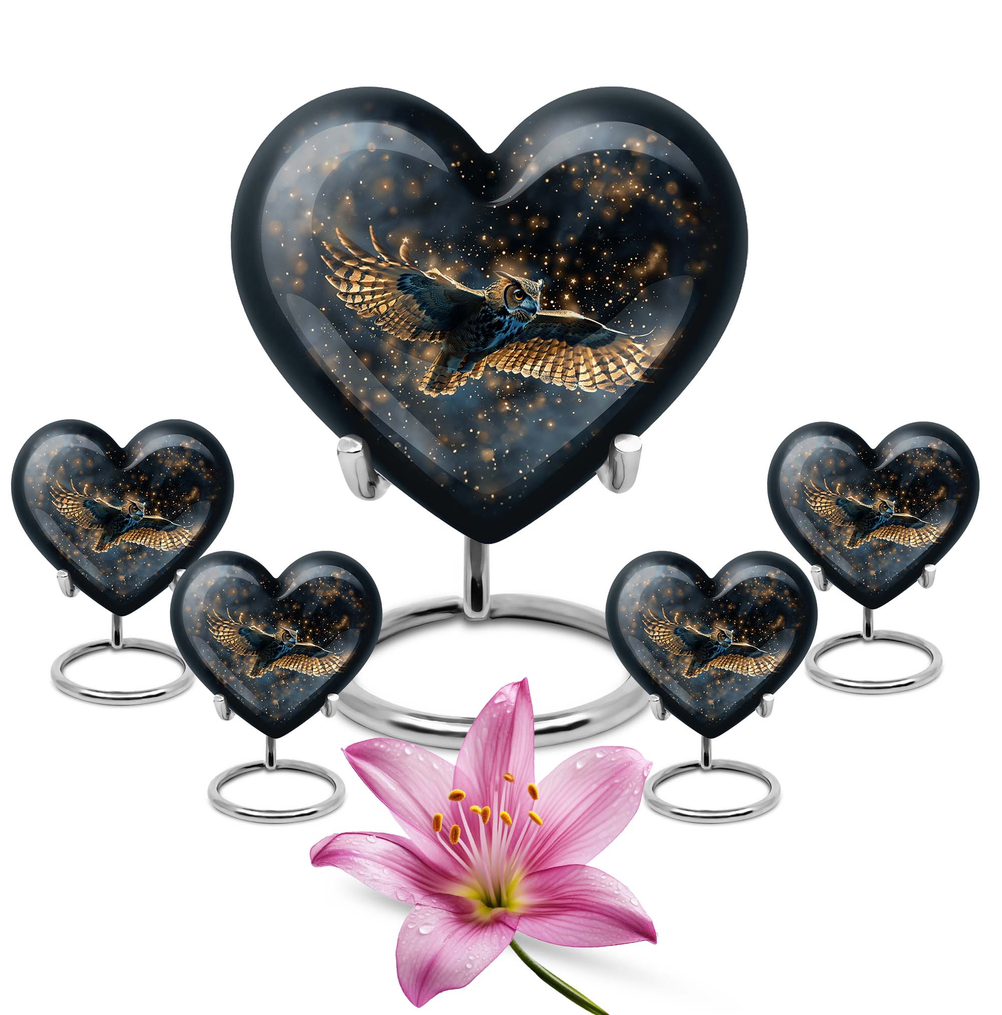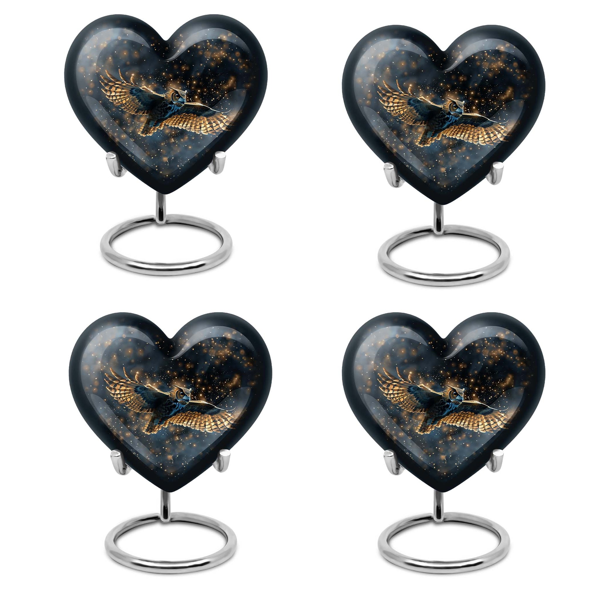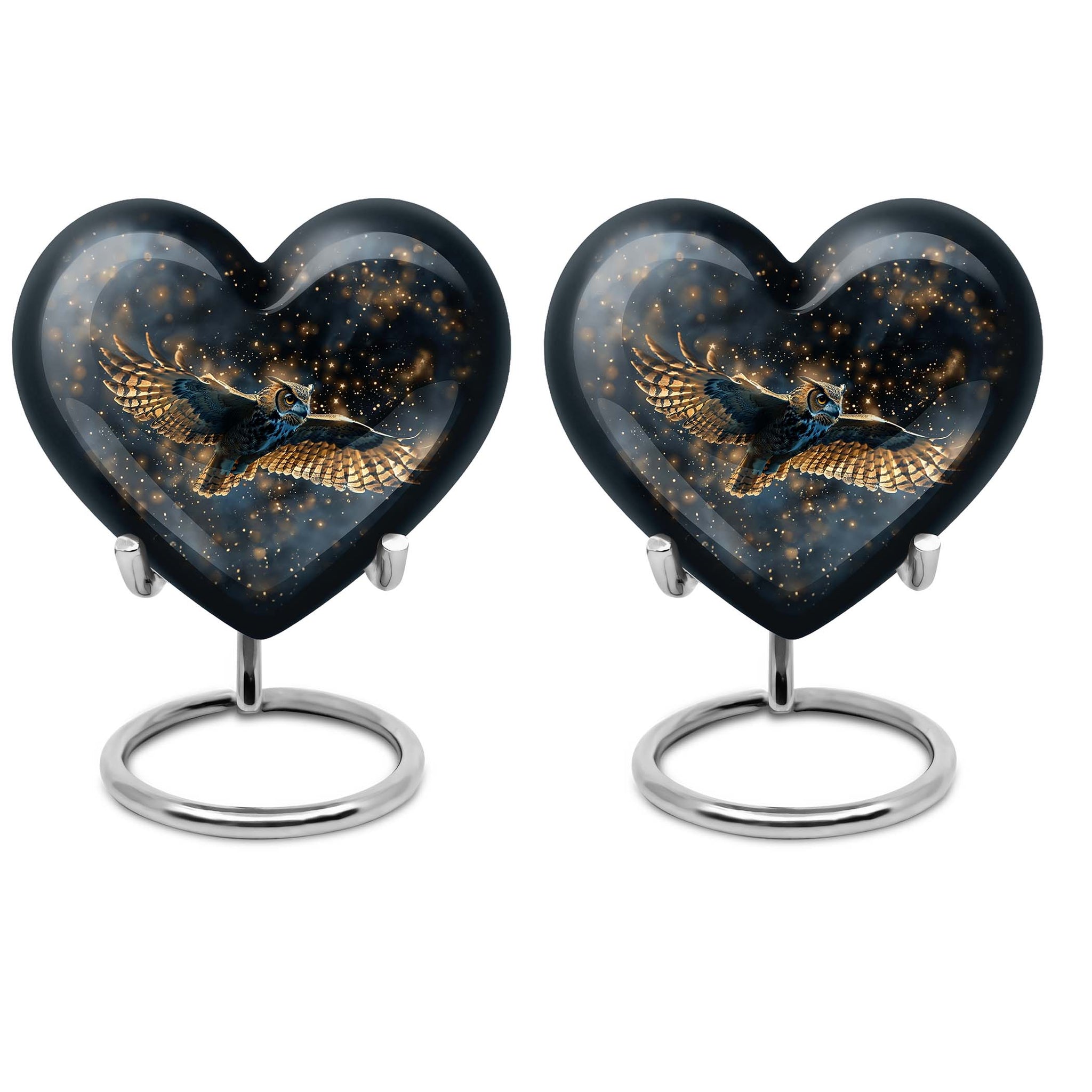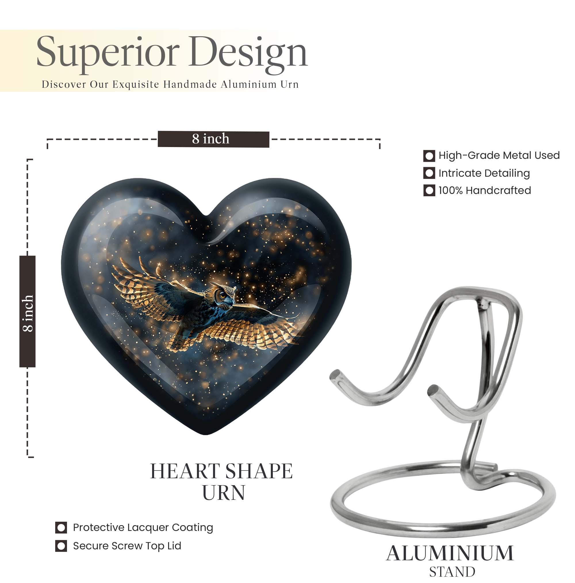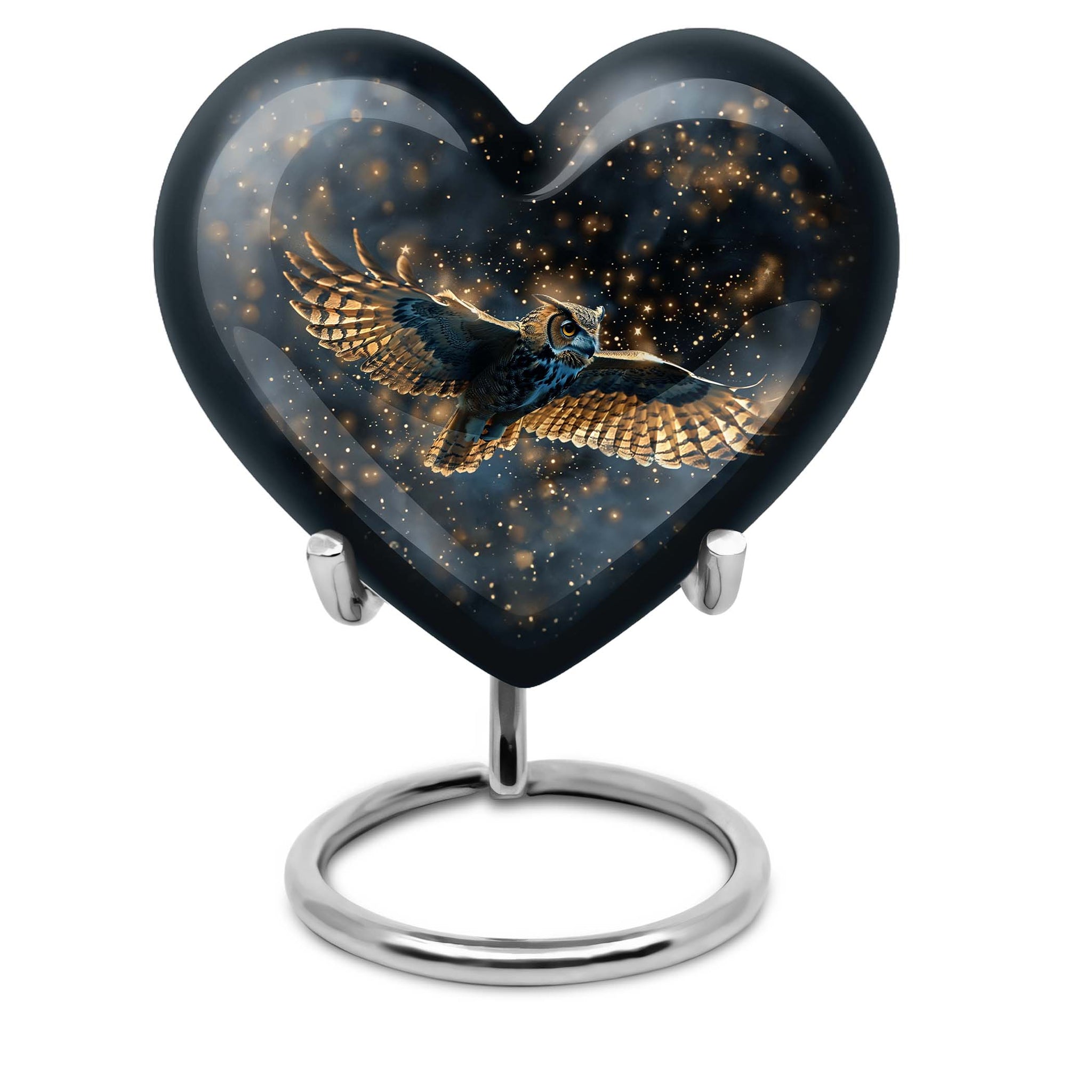 Our meticulously sculpted 10-inch Owl Urn, an epitome of transcendental memorial ceremony supplies, brings a distinctive aura of remembrance. Crafted from durable aluminium, this large and versatile urn weighs a mere 3.3 pounds for comfortable handling, while its abstract theme adds a philosophical undertone. This funeral urn integrates a capacity of 200 cubic inches, large enough to hold the ashes of your loved one reverently. Personalize this cremation urn with engraved names to keep the memories of your loved one alive. It comes with a luxurious velvet pouch for containment of ashes. An owl urn this unique serves as an elegant adult cremation urn, skillfully resonating with both female and male aesthetics. The heart urn features an intricately shaped urn stand, adding to its appeal and stability. This exquisite urn forms a notable addition to your memorial ceremony supplies, standing as a testament to a life well lived.