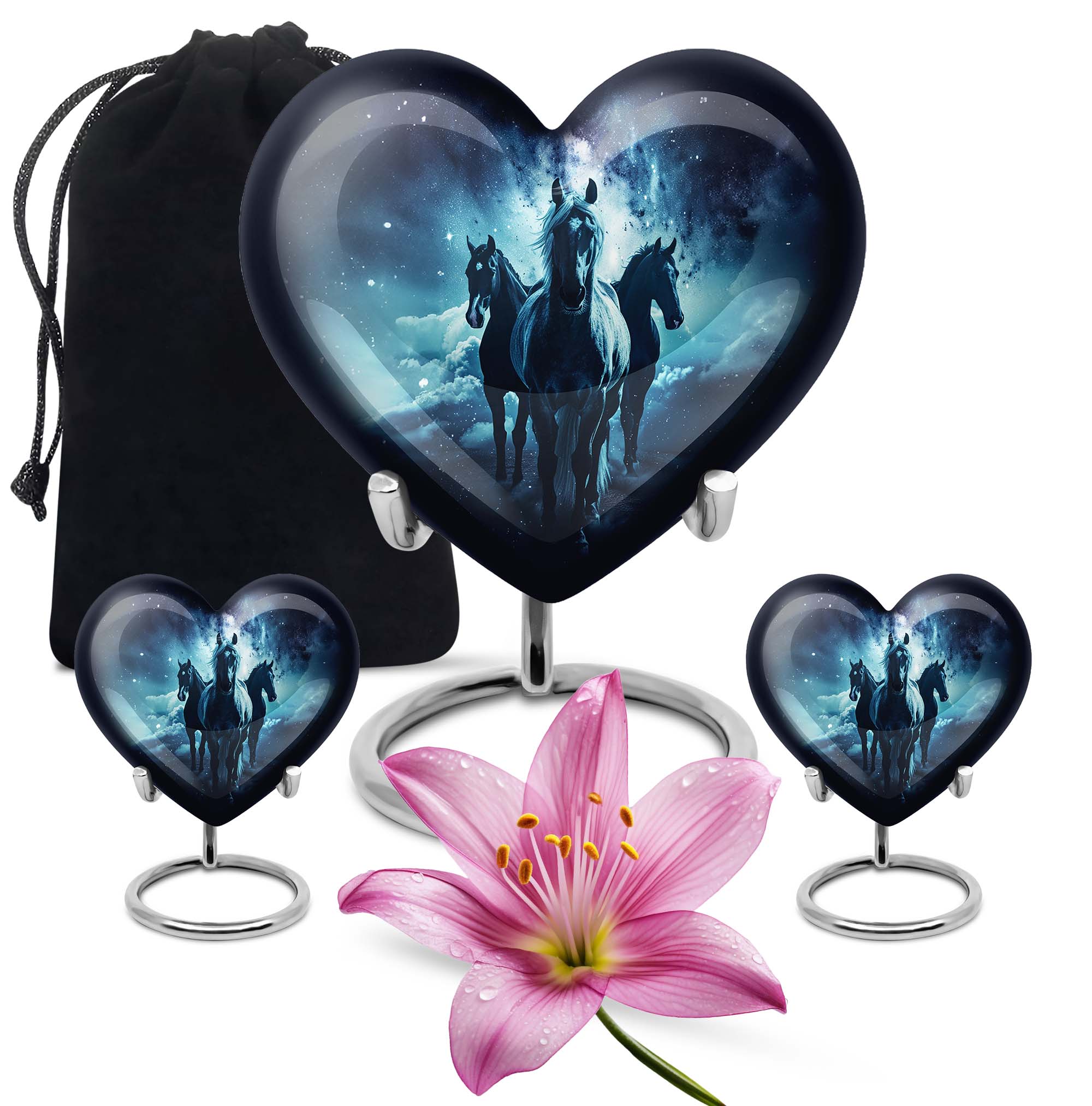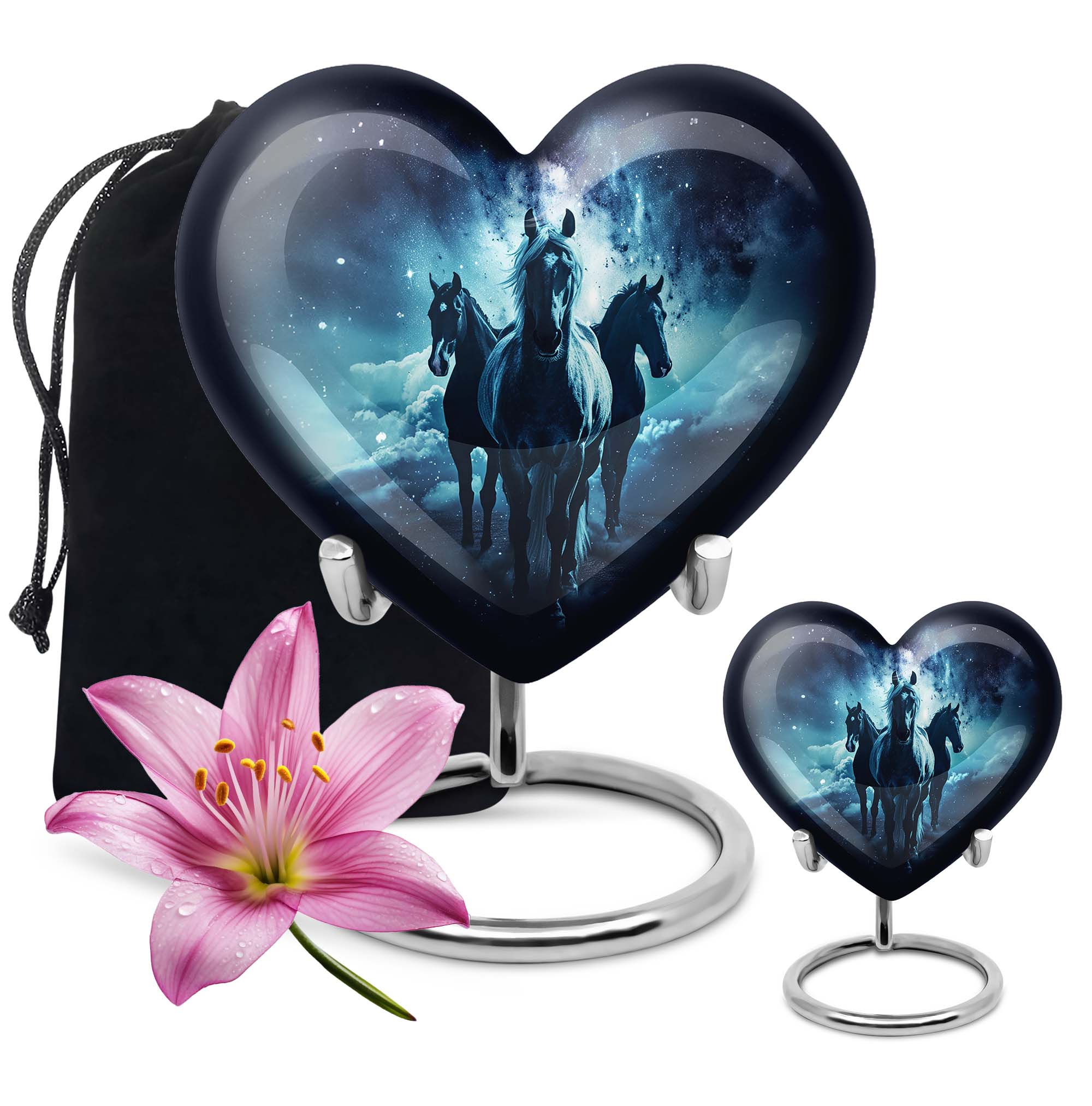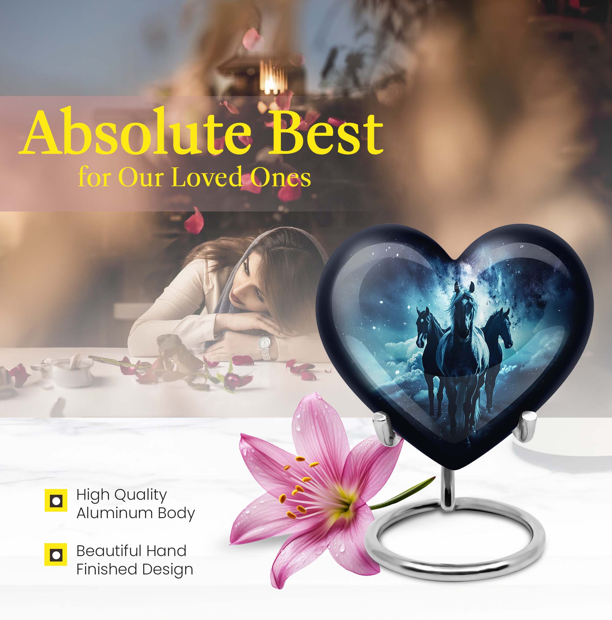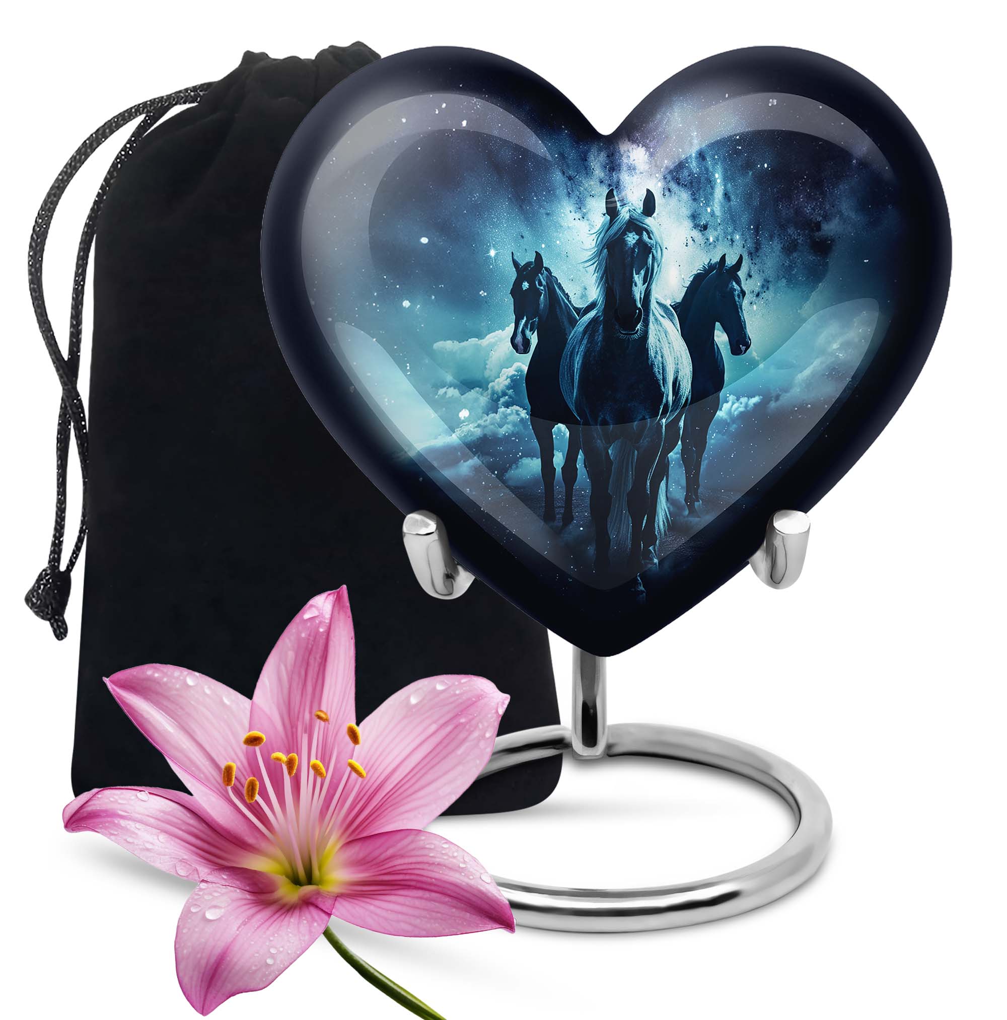Commemorate your loved one with this unique, abstract-themed Horse Urn that speaks to the heart. This large urn, with a tasteful abstract theme, meticulously crafted from robust aluminium, stands 10 inches tall and possesses a notable capacity of 200 cubic inches - a fitting receptacle for memorial ashes. Weighing at a substantial 3.3 pounds, it's a tangible testament to the presence your loved one had in your life. Sized at perfection, this 10-Inch Cremation Urn promises to safely harbor the ashes, with a complimentary velvet pouch that provides an additional layer of containment. Offering personal touch, add engraved names to customize the urn and make it uniquely yours. Search phrases such as 'Funeral Urn for Men's ashes, Adult Ashes Men, Elegant Urns, Memorial Urns,' make this item particularly easy to locate. Honor your beloved with an urn that resonates with the love held for them.
