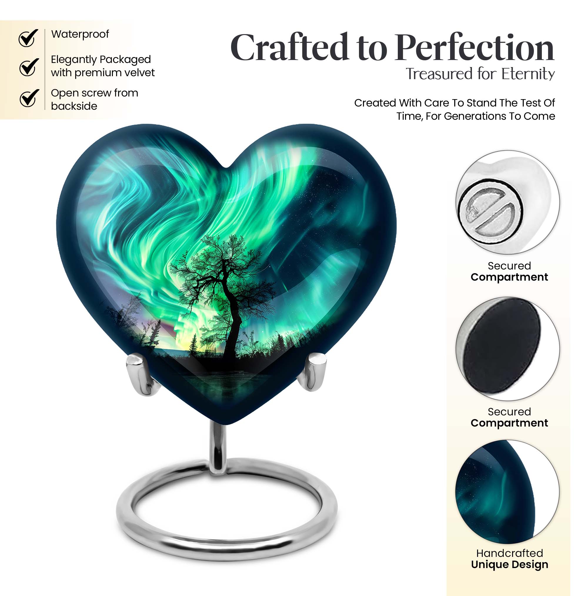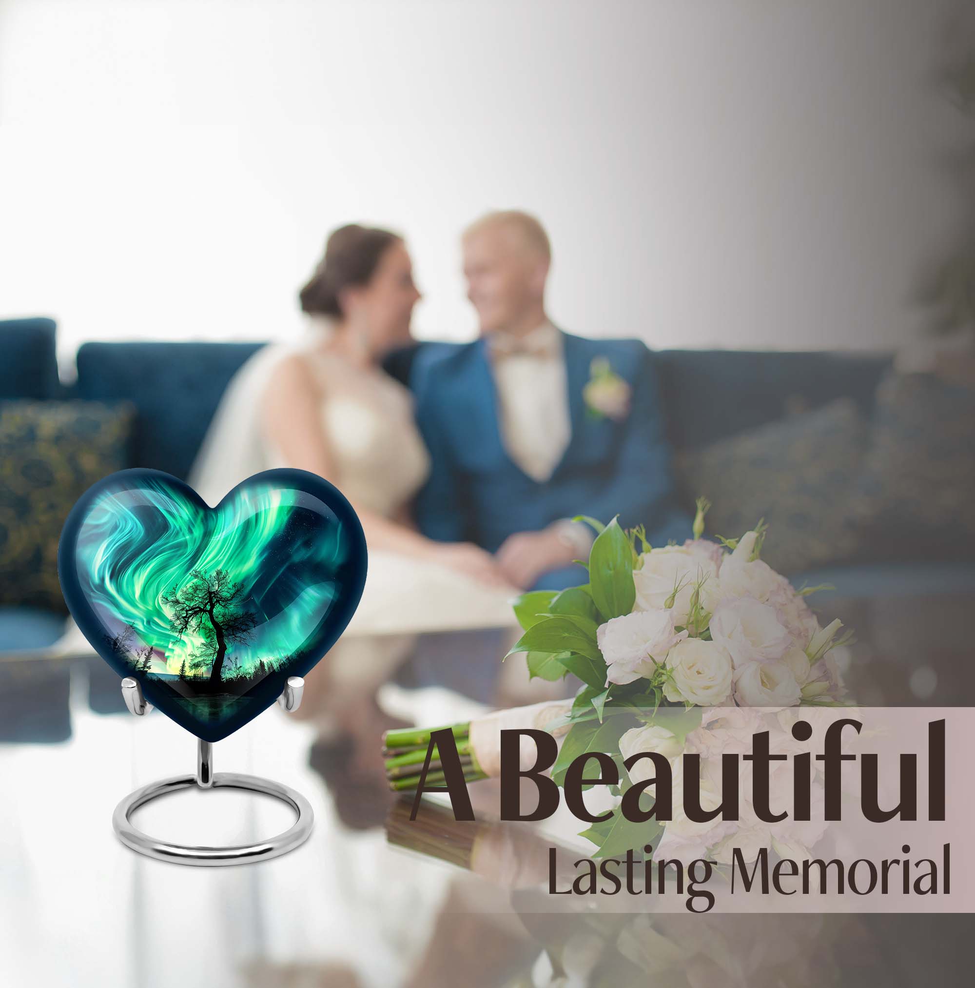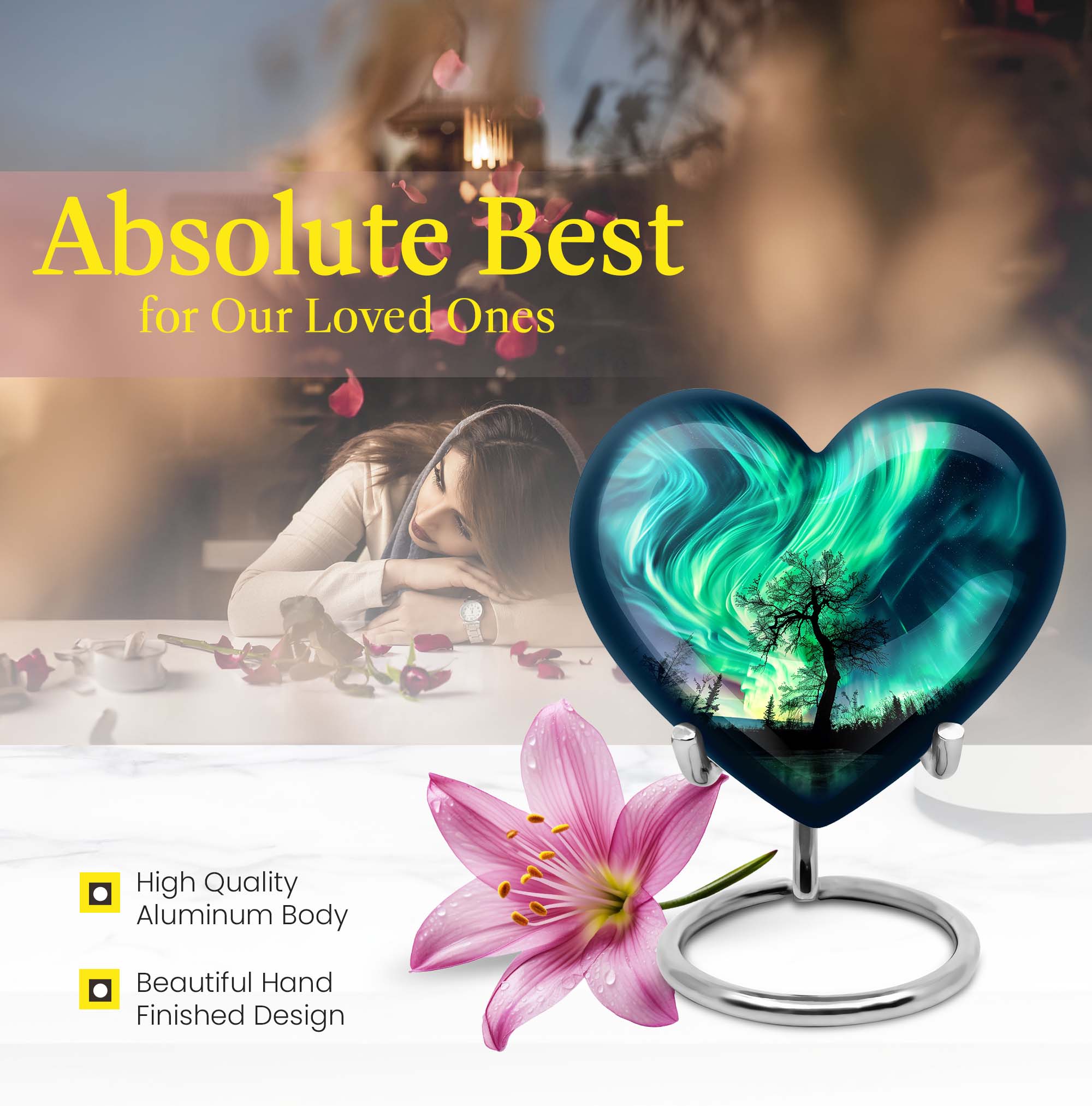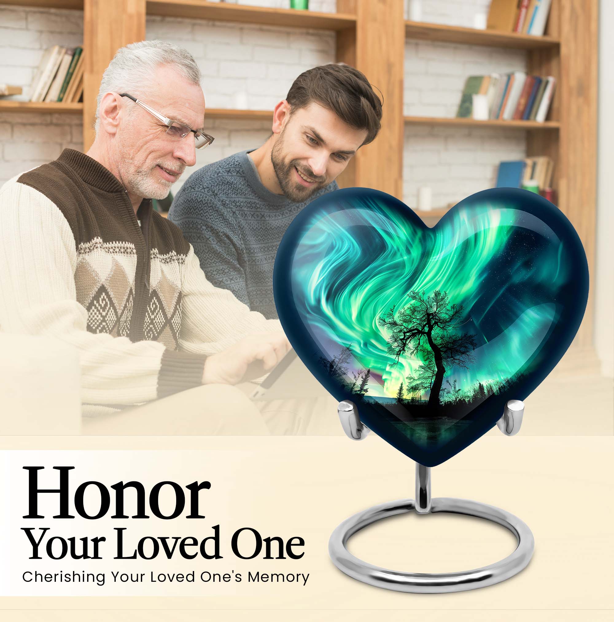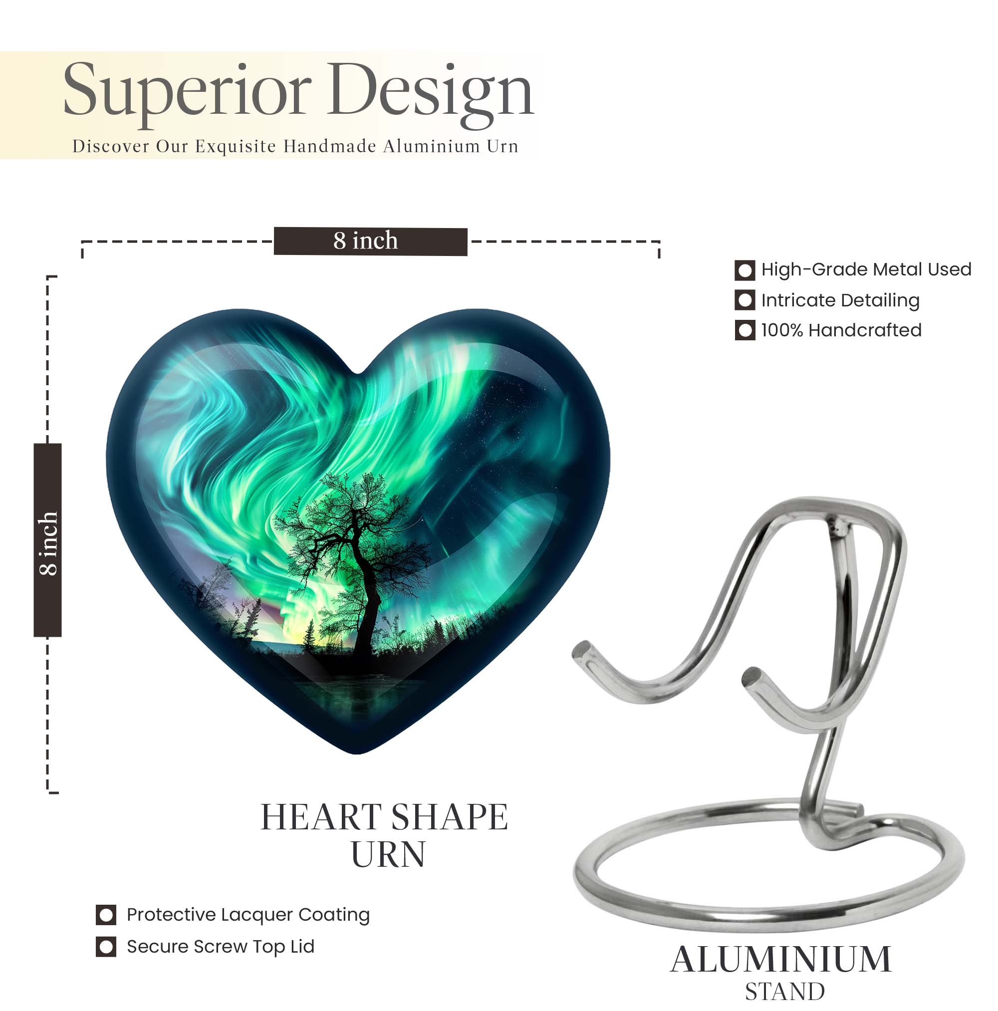 Immerse yourself in the serene solace of our Northern Lights Urn, an ideal cremation solution for an adult male seeking a meaningful final resting place. This exquisite heart-shaped large urn, in the soothing hues of a 'Purple Meadow', captures the beauty of the celestial aurora borealis and is a striking tribute to a loved one’s memory. Measuring 10 inches in height, the urn is crafted from durable aluminium and can contain up to 200 cubic inches of ashes. Weighing 3.3 pounds, it lends a sturdy, substantial feel, accentuating its skilled craftsmanship. This cremation urn takes customization a step further, allowing you to personalize it with engraved names which further adds an intimate touch. Along with the urn, our package includes a luxurious velvet pouch for dignified containment and carrying of ashes. Whether for burial in ground or use as a funeral metal urn, this distinctive piece is a testament to enduring love. Searches such as 'burial urns for men & women ashes', 'large urn for man adults' will lead you to our unique creation. A touching homage, this cremation urn becomes a cherished focal point in the journey of remembrance.