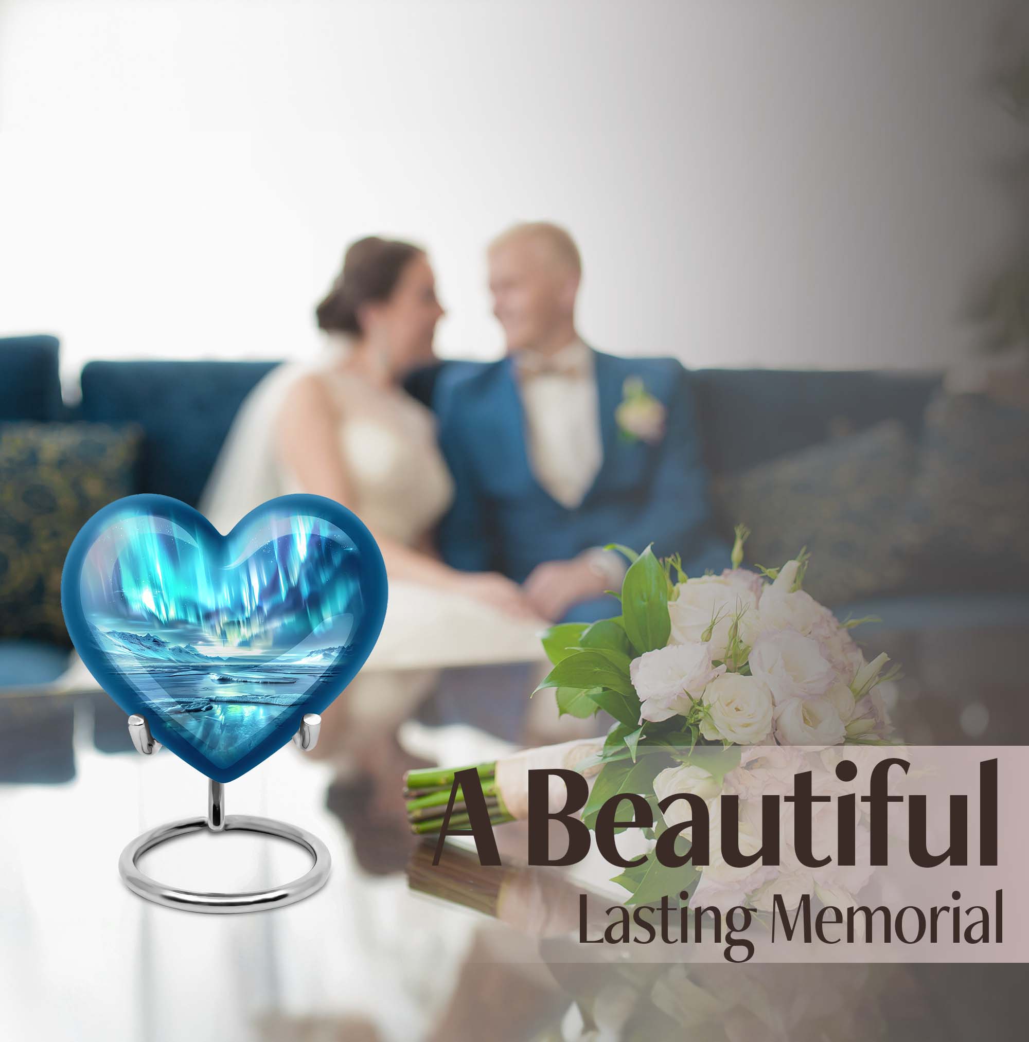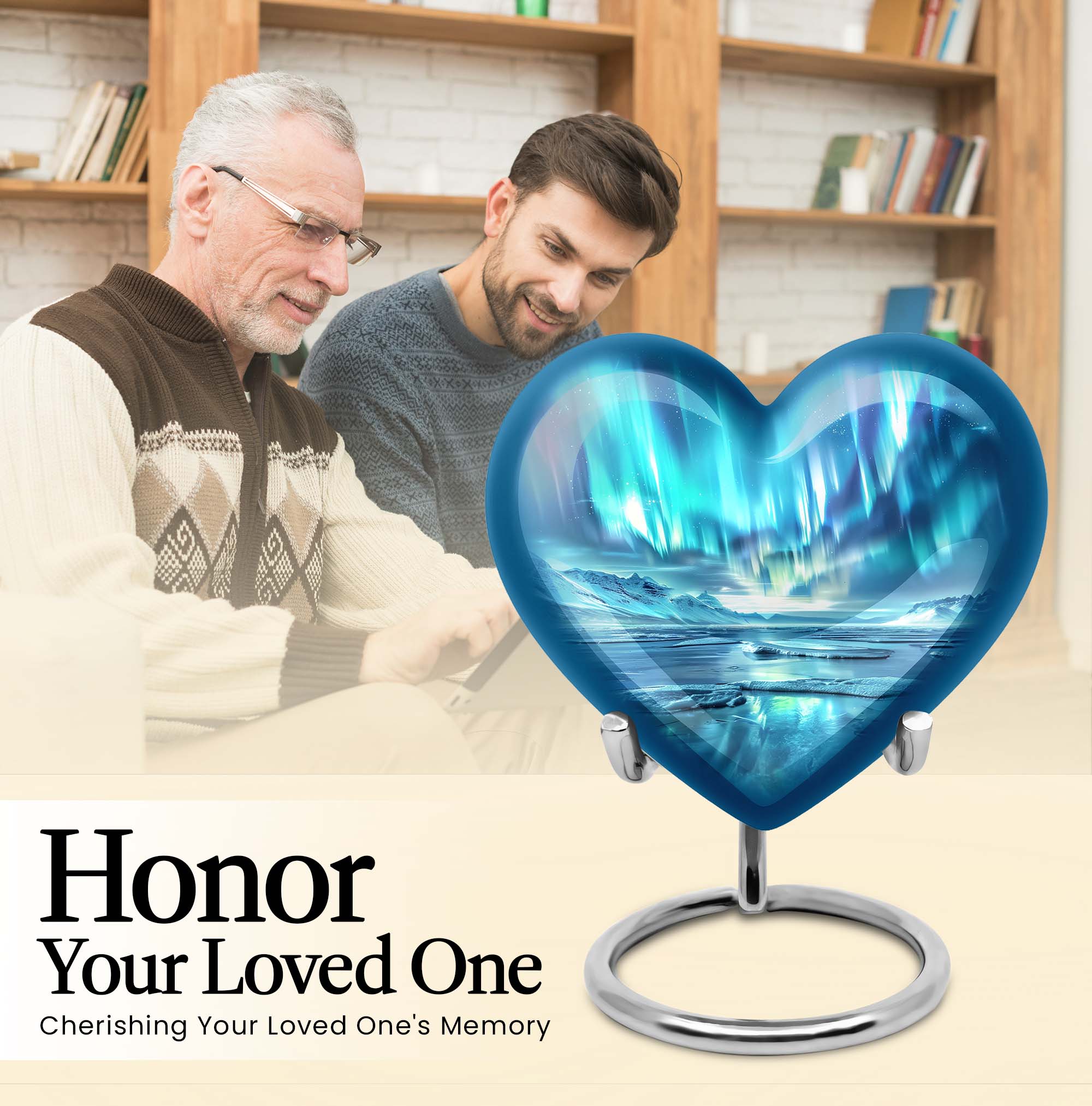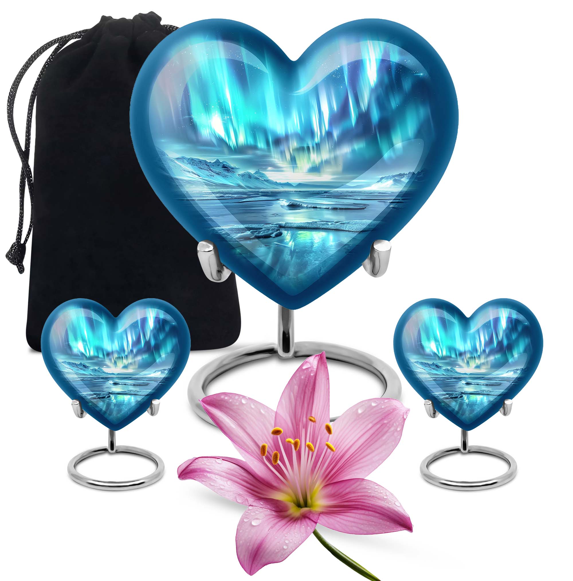 Embrace the tranquillity and serene beauty of our 10-inch 'Northern Lights Urn', a unique addition to our Large Urns collection. Conveying a heartwarming tribute to your loved ones, this aluminum Funeral Urn for females and males is adorned with the peaceful theme of a 'Purple Meadow', evoking the serene calm of nature's beauty. It weighs a mere 3.3 pounds, enabling its effortless positioning at your preferred location. The urn is not just about profound aesthetic value, as its impressive capacity of 200 cubic inches makes it an ideal repository for memorial ashes. For added convenience and careful containment of ashes, a velvet pouch is included in the package. To make the memory more personal, we also provide the opportunity for customization by engraving names on it, creating a lasting tribute to the departed soul. Our creation stands out as a serene and elegant adult cremation urn, resonating love, respect, and cherished memories.