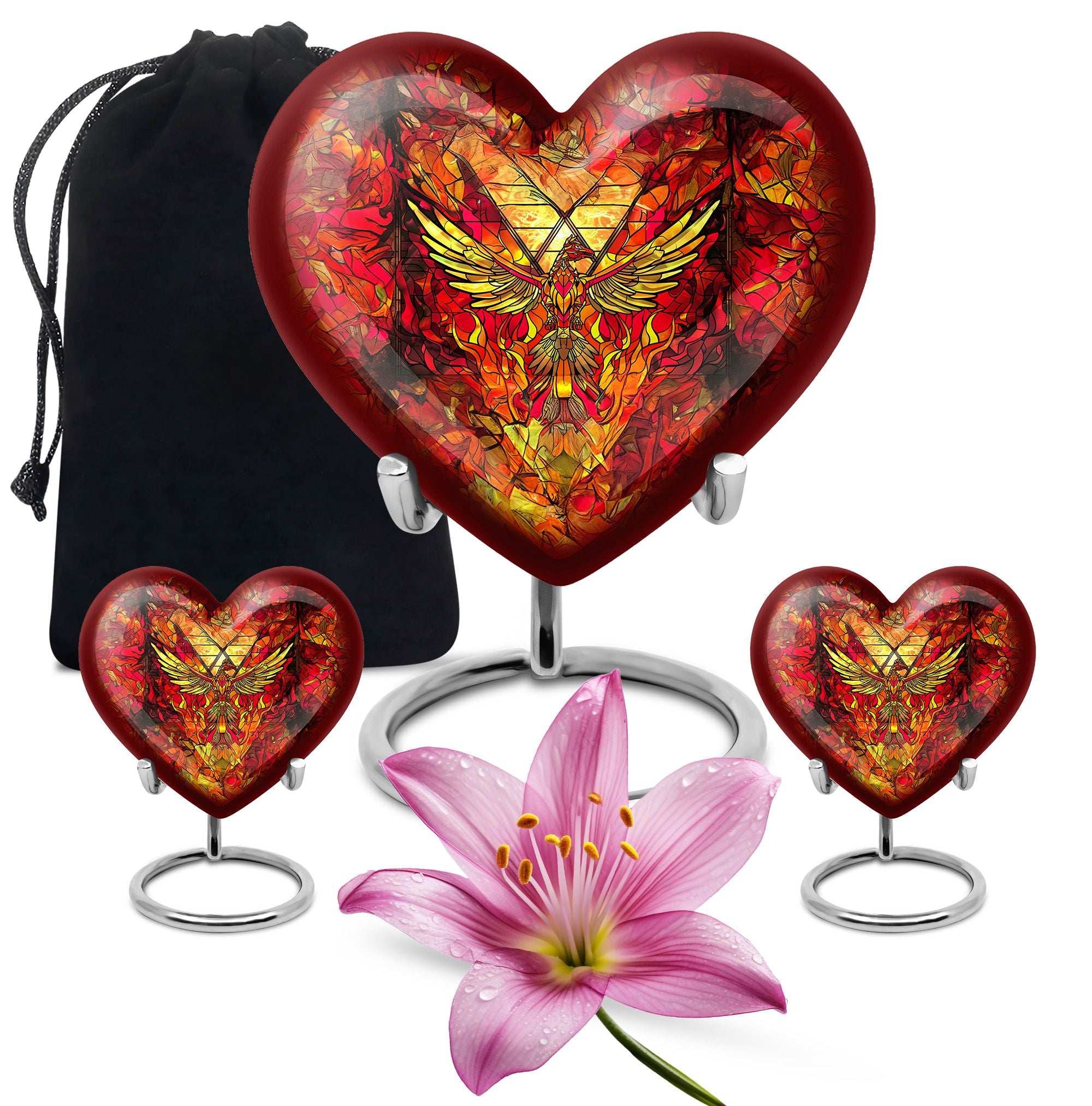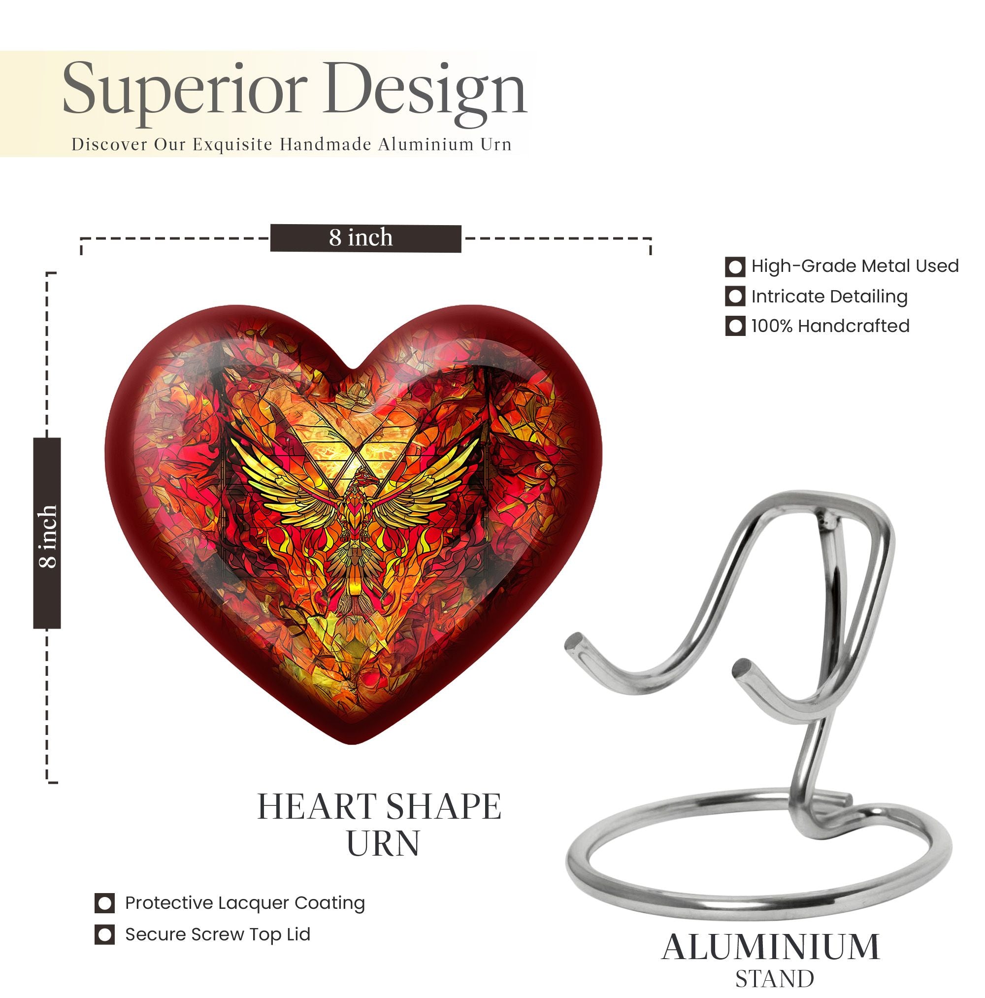 Preserve precious memories with our symbolic Phoenix Urn. A large burial urn for ashes, this memorial piece is expertly crafted from sturdy aluminium, resulting in a weight of 3.3 pounds. This robust cremation urn has been meticulously shaped to a 10-inch size to accommodate up to 200 cubic inches of ashes comfortably. Its abstract theme renders it not only a functional urn but also a significant piece of art. The urn comes complete with a plush velvet pouch for the respectful containment of ashes. Our offering allows for a personalized touch - you can etch the names on the urn, adding an extra layer of intimacy to this stand-out piece. A memento that perfectly encapsulates love, our Phoenix urn is an enduring emblem of memorialization. It combines the aspects of memorial adult urns, adult burial, urns for adults' ashes, and cremation urns for a loved one. This heart urn is an exceptional way to pay homage and secure the ashes of your loved ones.