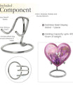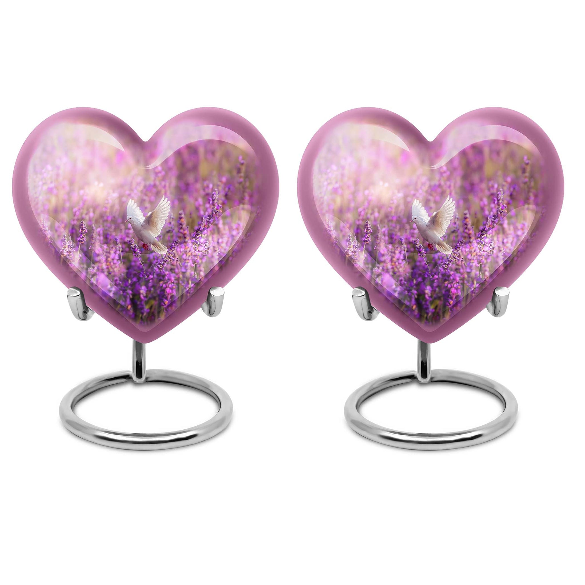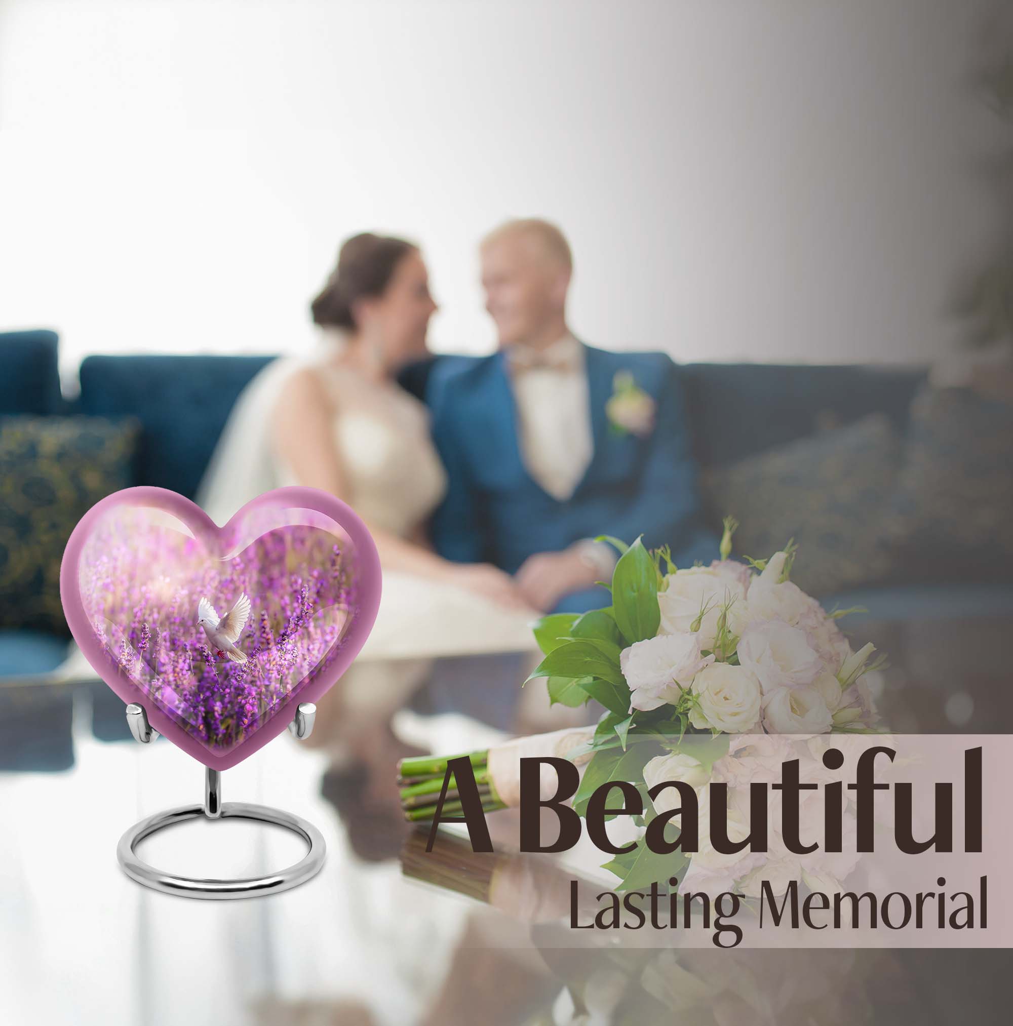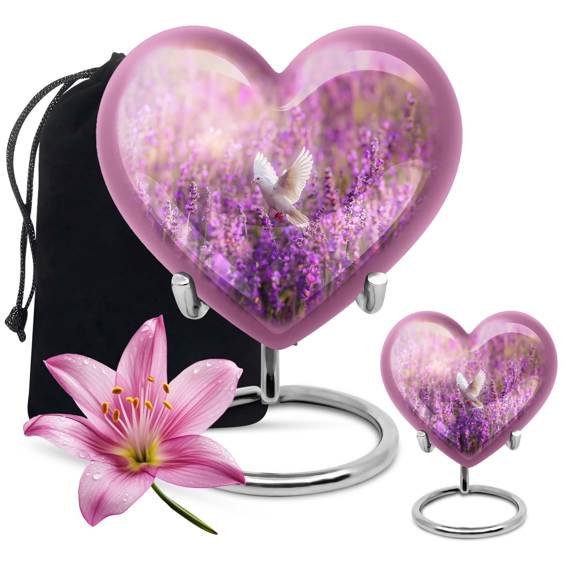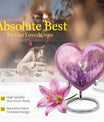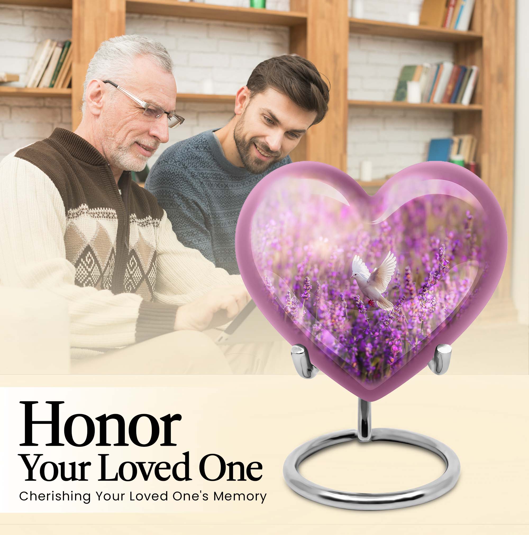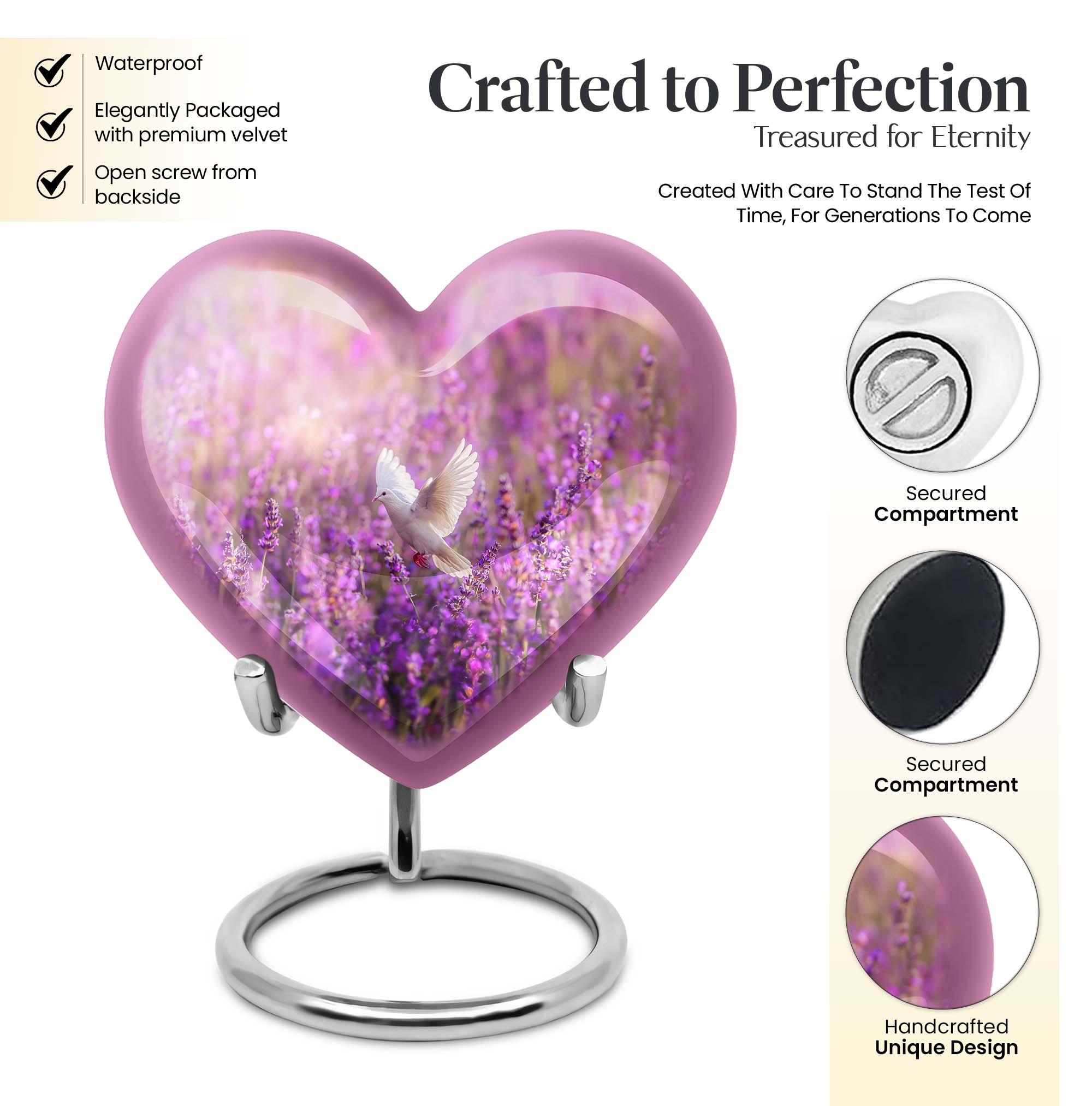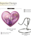 Meticulously crafted, our beautiful heart urn offers a unique resting place for your dear ones' cherished memories. The intricate design of the white dove on the purple theme accentuates its aesthetic appeal while effectively providing a holding capacity of 200 cubic inches. Measuring 10 inches in height and weighing 3.3 pounds, this aluminium urn is substantial and sturdy, ensuring a long-lasting tribute to your loved one. The urn comes with a velvet pouch for safe containment of the precious ashes. Our memorial urns are ideal for personalizing by engraving names, making them the perfect sentiment in memory of those you hold dear. With a 10 Inch size, this urn can easily accommodate the ashes of adult women and men alike. The urns feature a butterfly theme, resonating with the concept of freedom and transformation in the afterlife. These large urns are more than a mere container - they represent love, respect, and an enduring bond. Great detail is given to the material, finish, and design, making it a dignified choice for a final resting place.