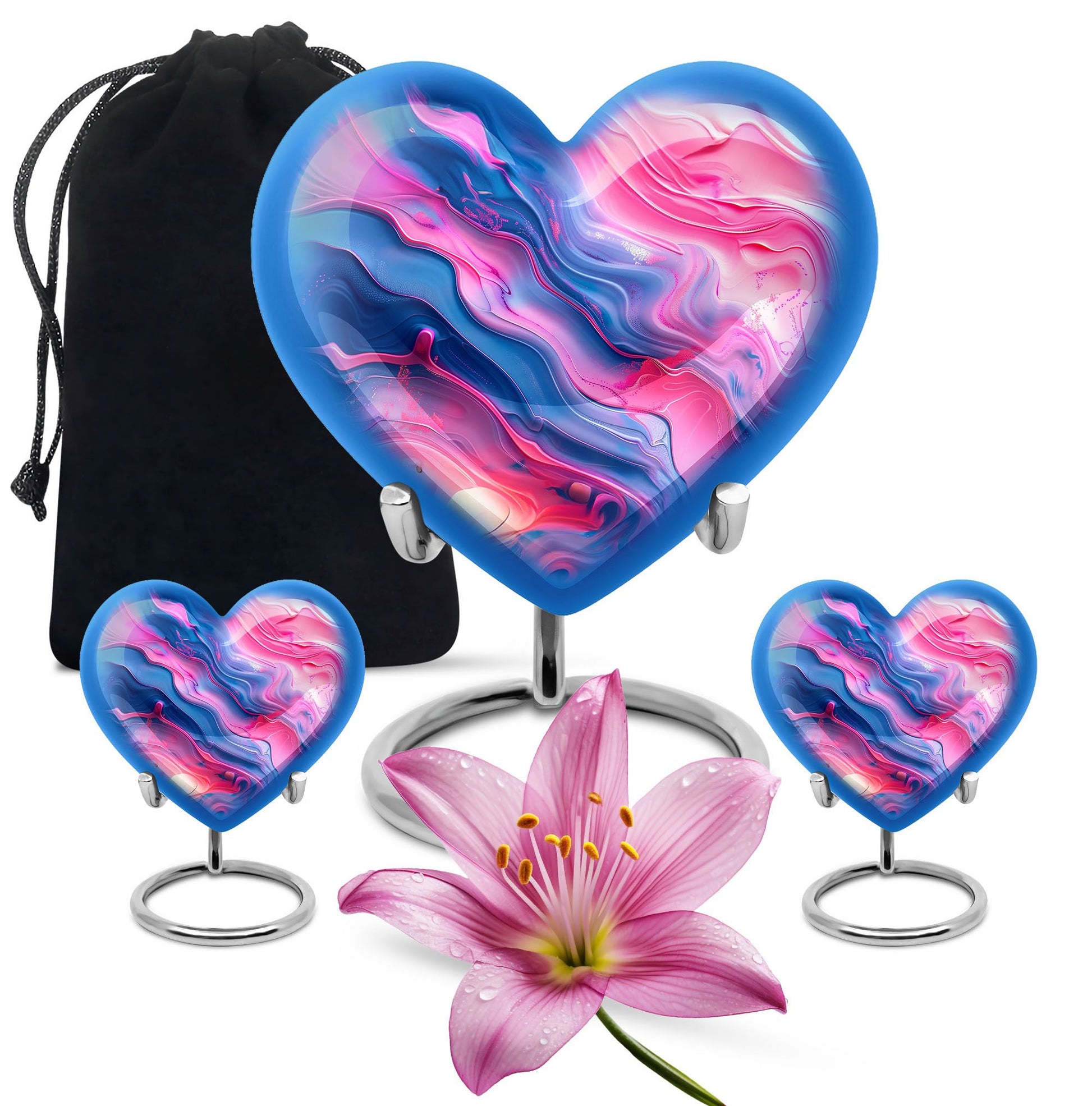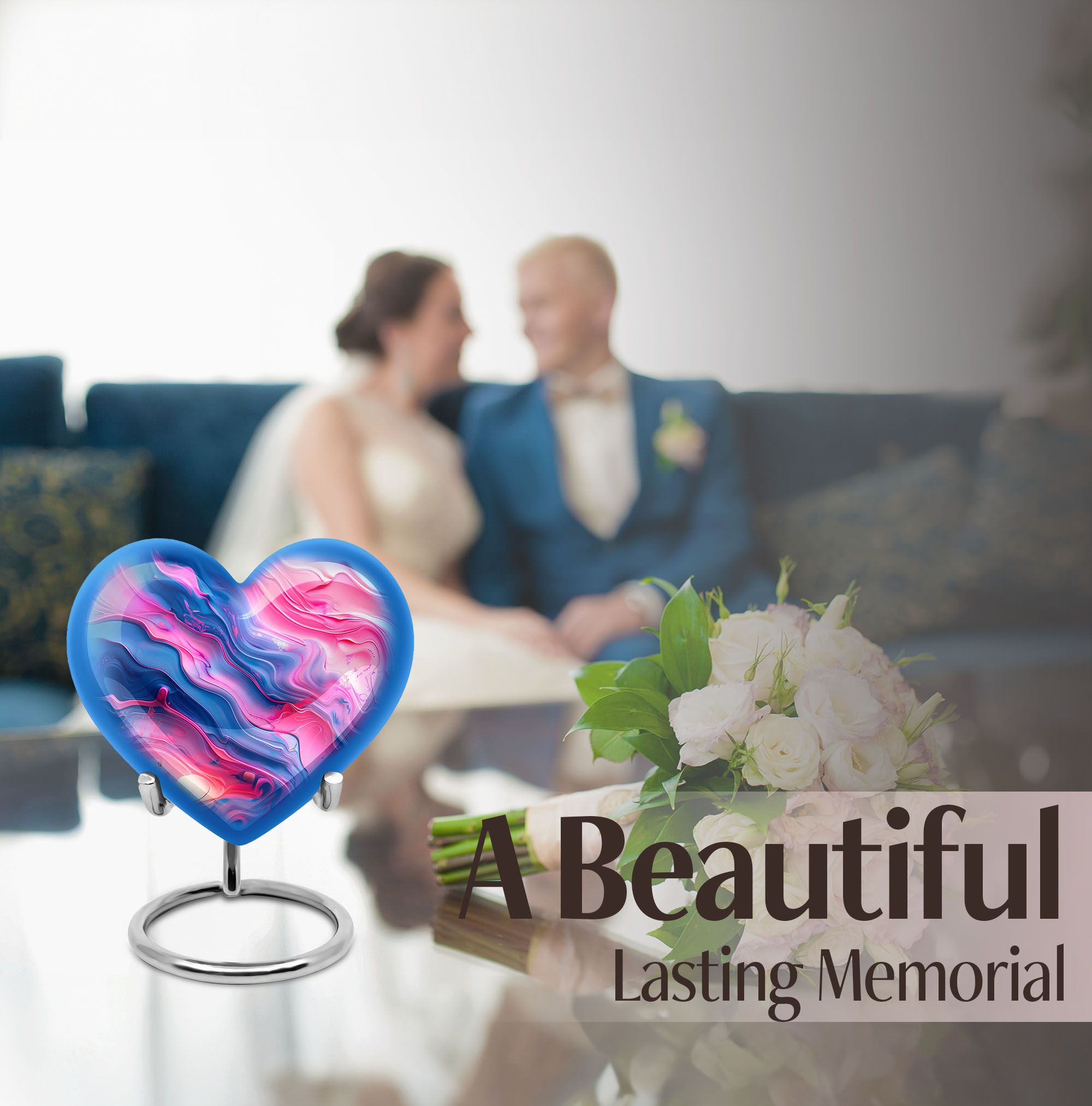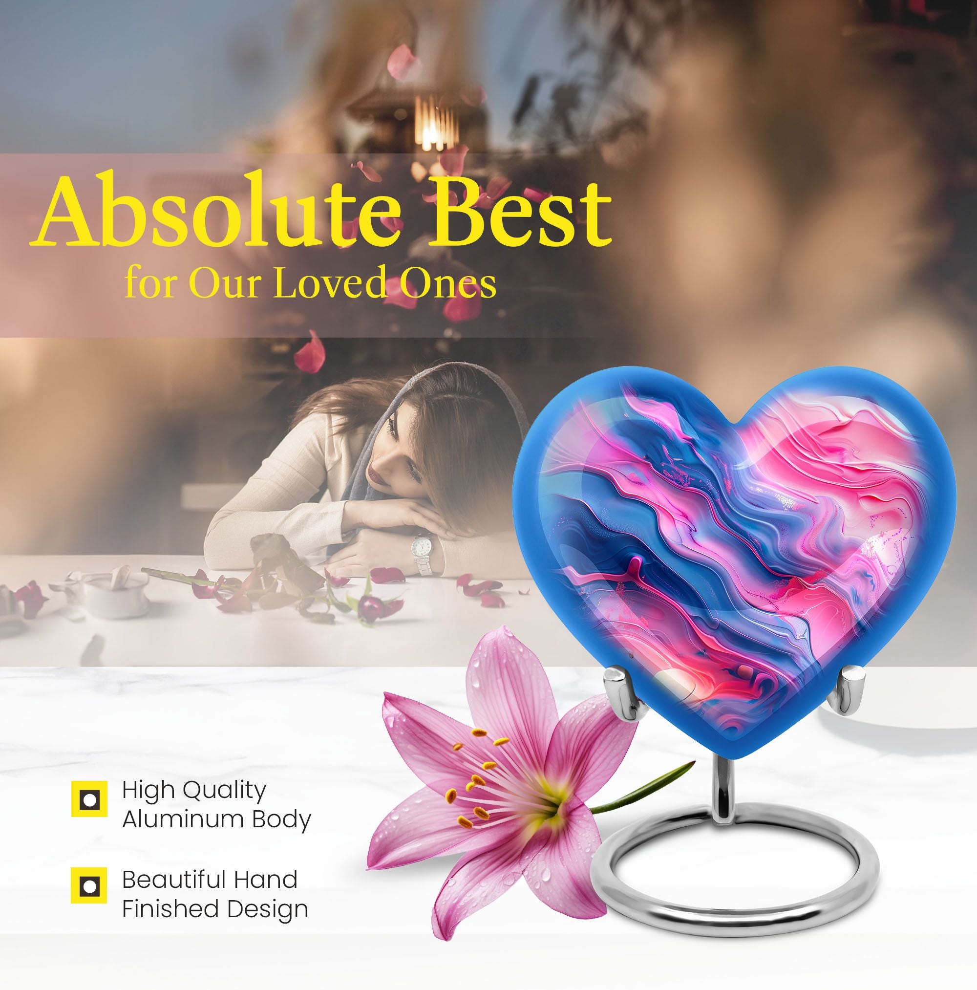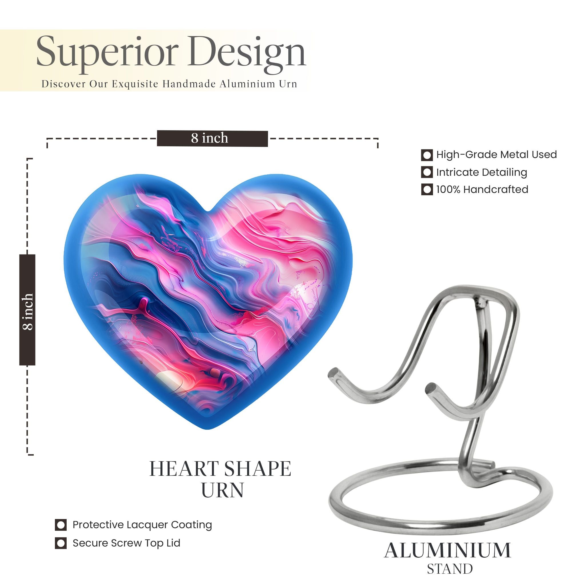 Paying tribute to the loved ones with our 'Abstract Urn', an exceptional selection from our range of 'memorial urns'. Crafted in the shape of a heart from high-quality Aluminium, it creates a timeless remembrance. Perfect for adult female ashes, this large urn is a dignified and unique piece, standing at a height of 10 inches, with a generous capacity of 200 cubic inches. Weighing just 3.3 pounds, it is dignified and substantial. This urn comes with the added benefit of personalization where you can engrave names, adding a deeper touch of personal sentiment. Your purchase includes a velvet pouch for safeguarding the contents, imparting the utmost respect for your loved one. Its abstract theme creates an ethereal feel, apt for a serenely beautiful memorial. It's an elegant shrine that subtly encapsulates the warm memories of the departed soul. Explore more such 'Cremation medium urns for human ashes', 'shape boxes for gifts', and 'funeral cremation urns' in our collection.