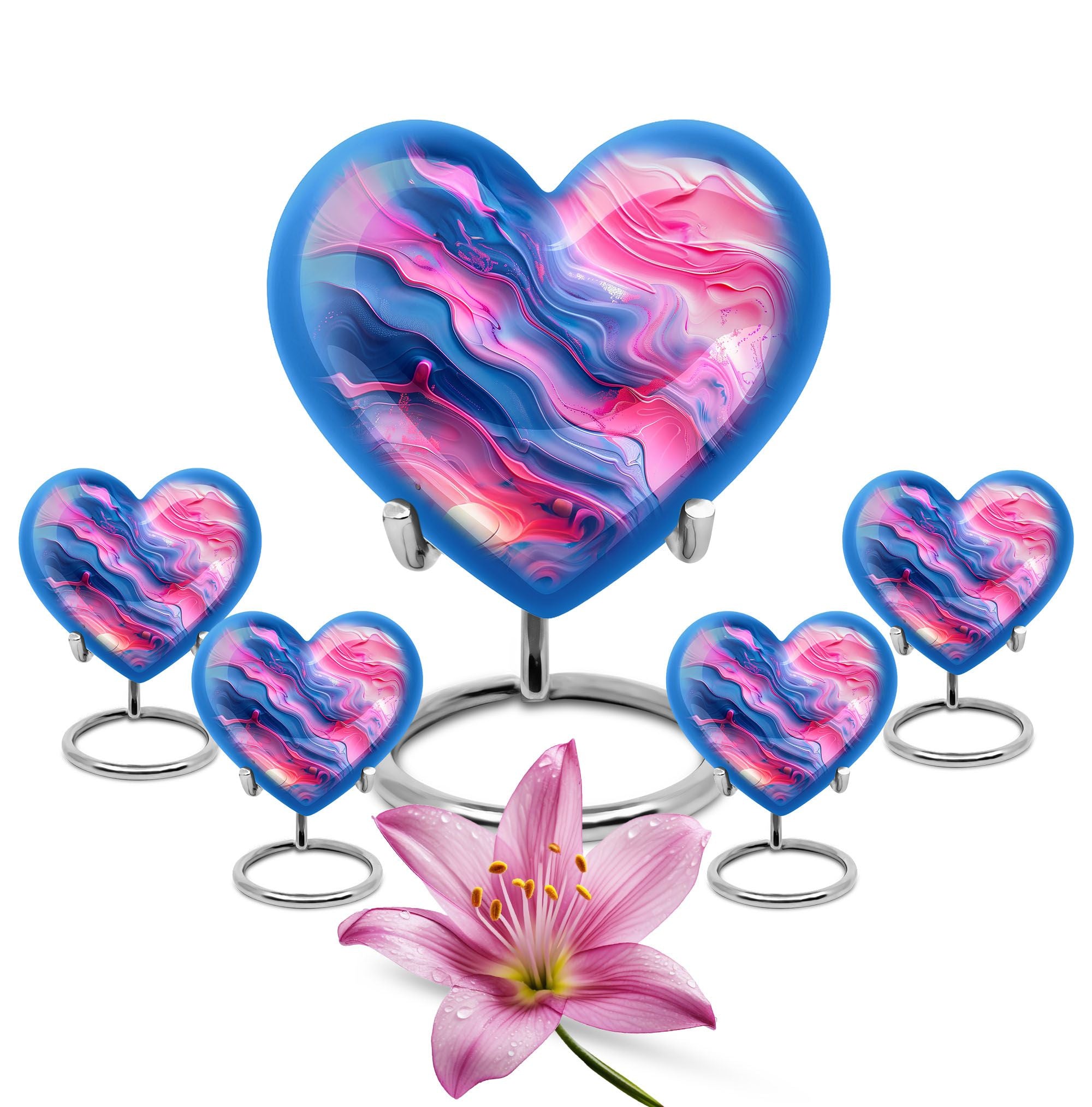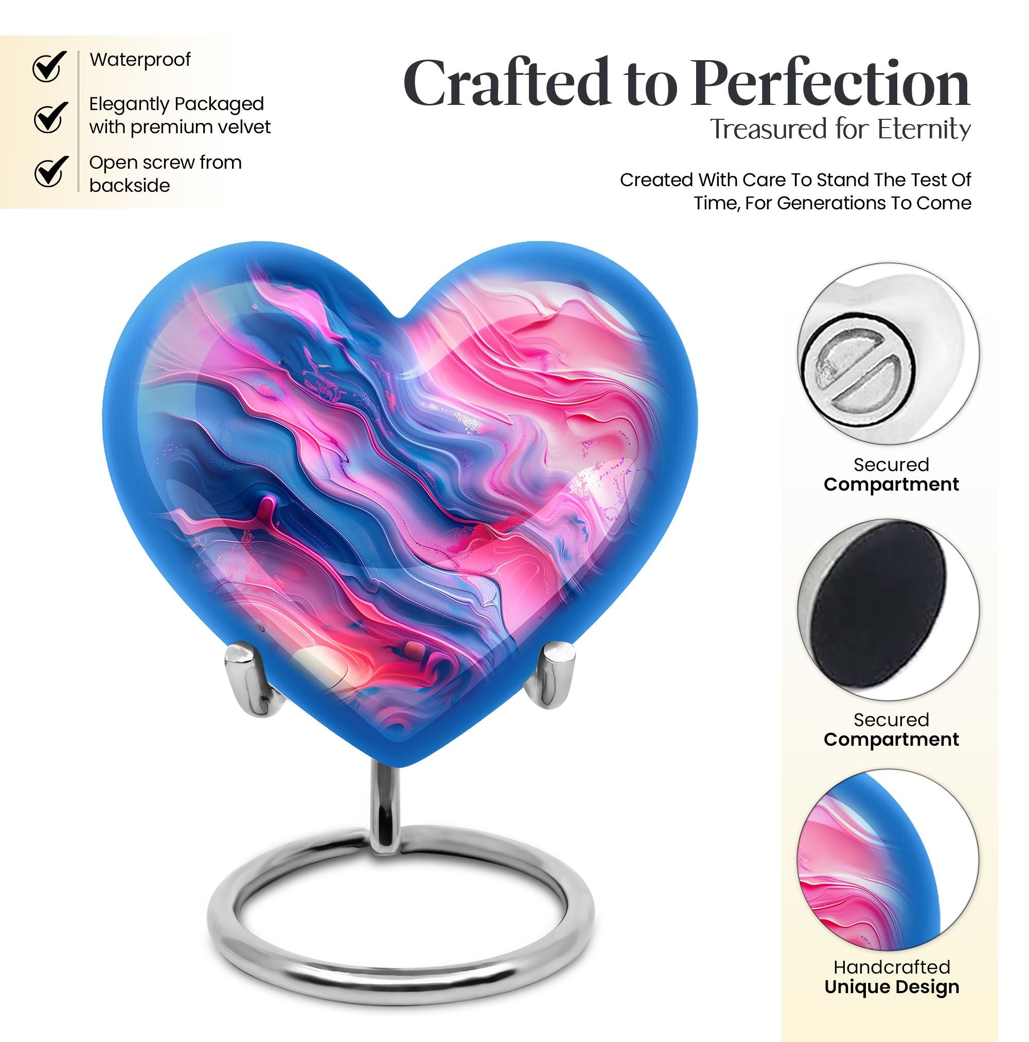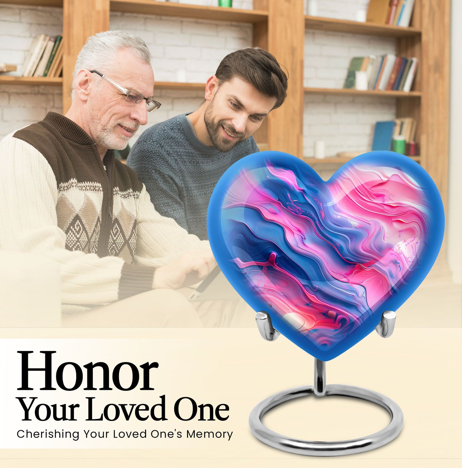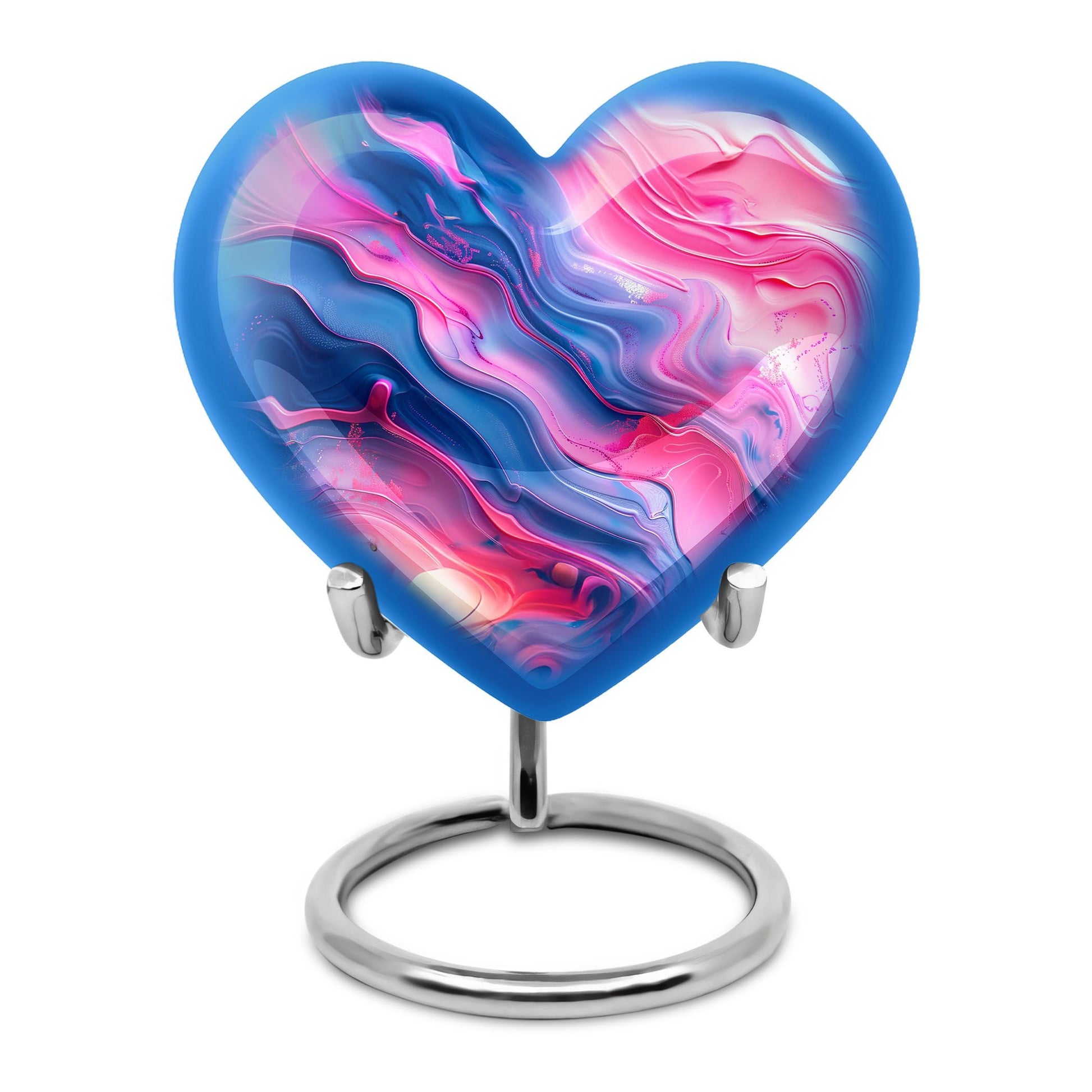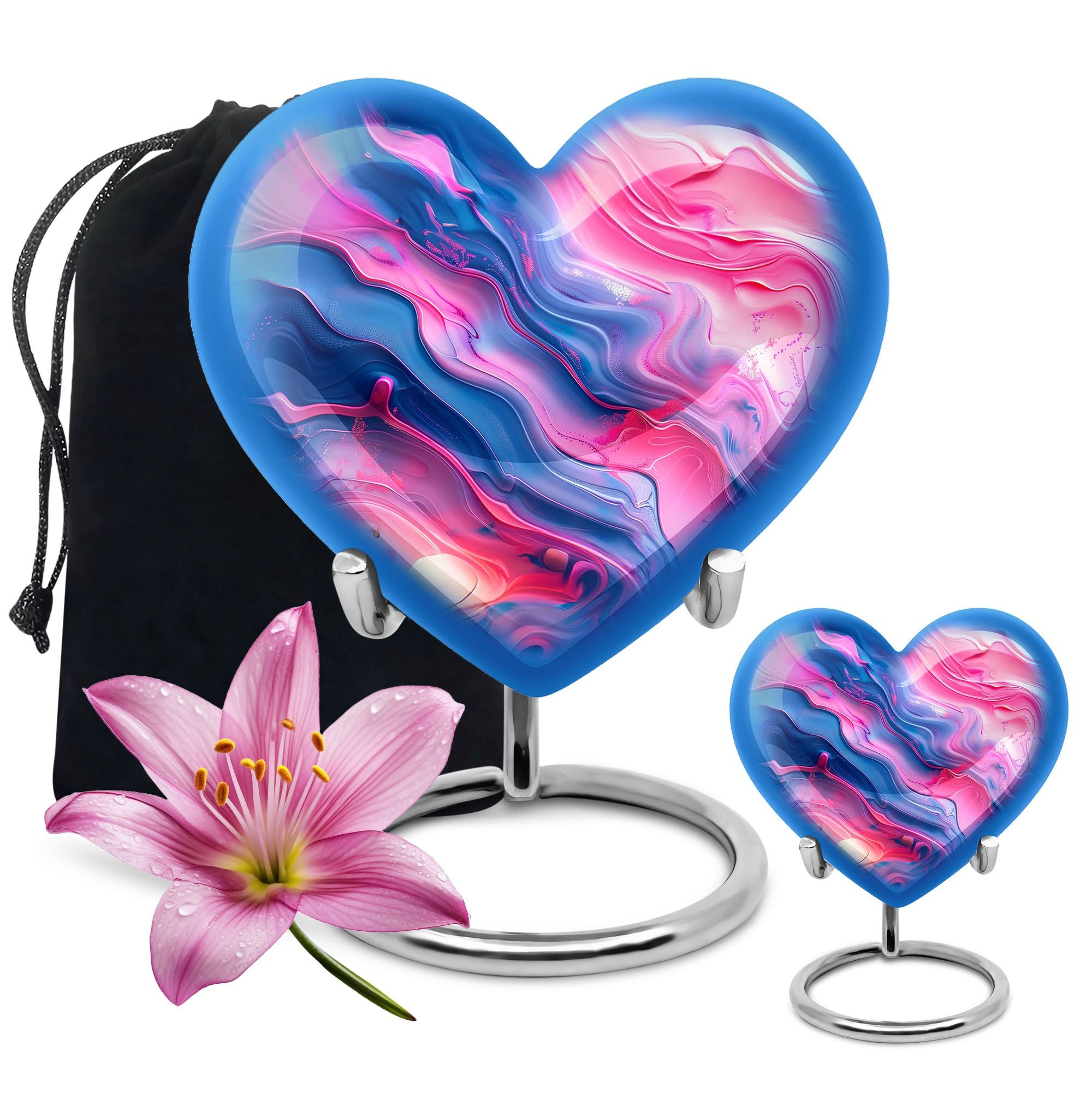 Paying tribute to the loved ones with our 'Abstract Urn', an exceptional selection from our range of 'memorial urns'. Crafted in the shape of a heart from high-quality Aluminium, it creates a timeless remembrance. Perfect for adult female ashes, this large urn is a dignified and unique piece, standing at a height of 10 inches, with a generous capacity of 200 cubic inches. Weighing just 3.3 pounds, it is dignified and substantial. This urn comes with the added benefit of personalization where you can engrave names, adding a deeper touch of personal sentiment. Your purchase includes a velvet pouch for safeguarding the contents, imparting the utmost respect for your loved one. Its abstract theme creates an ethereal feel, apt for a serenely beautiful memorial. It's an elegant shrine that subtly encapsulates the warm memories of the departed soul. Explore more such 'Cremation medium urns for human ashes', 'shape boxes for gifts', and 'funeral cremation urns' in our collection.