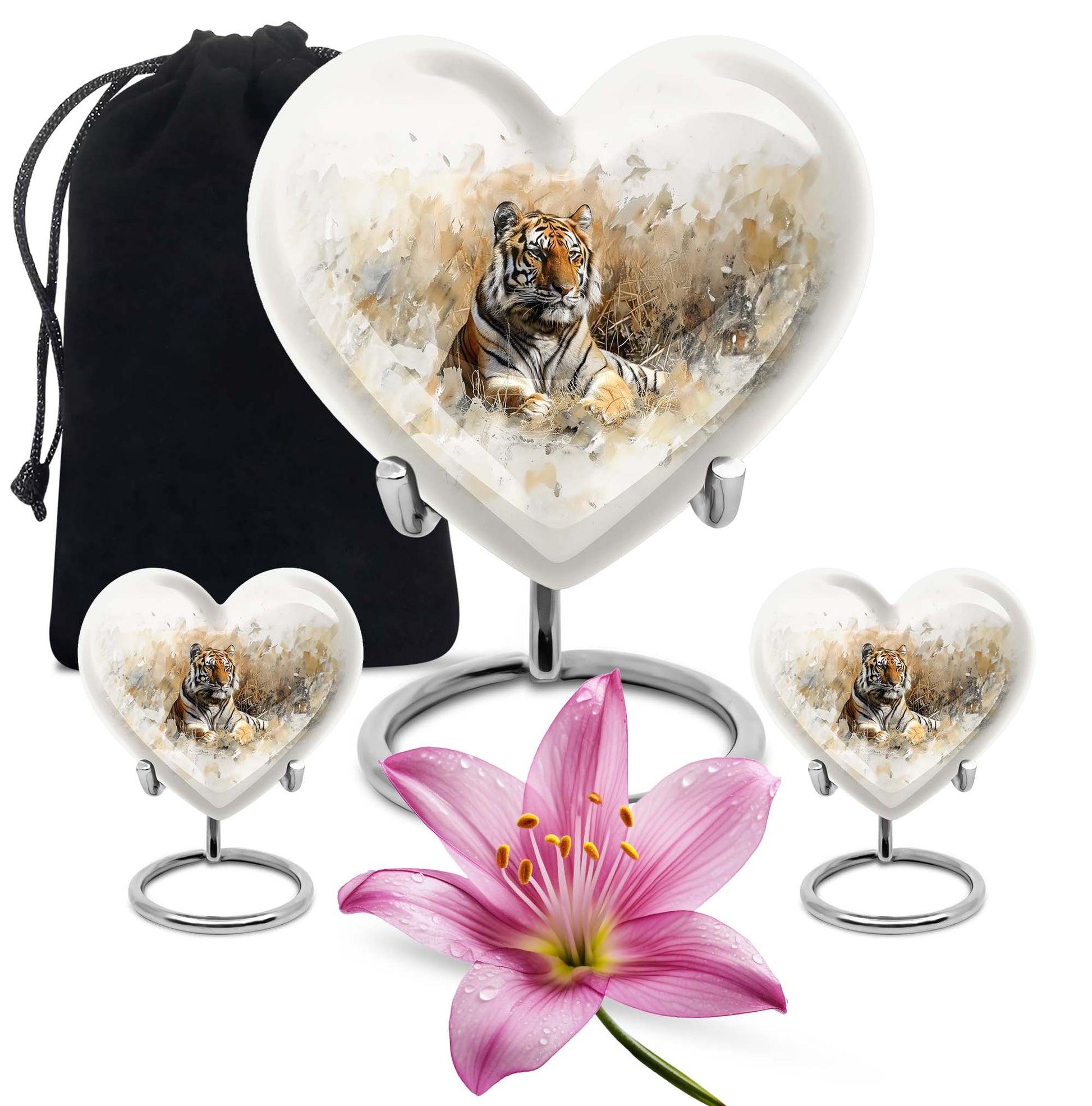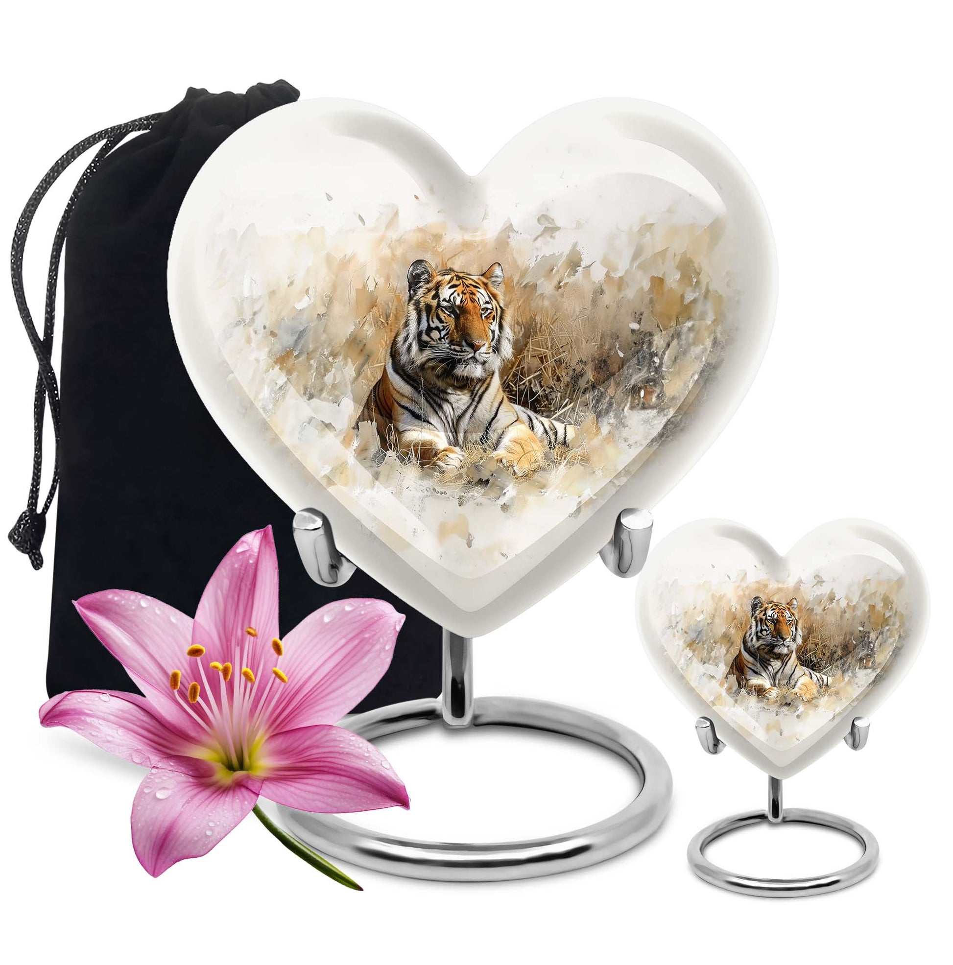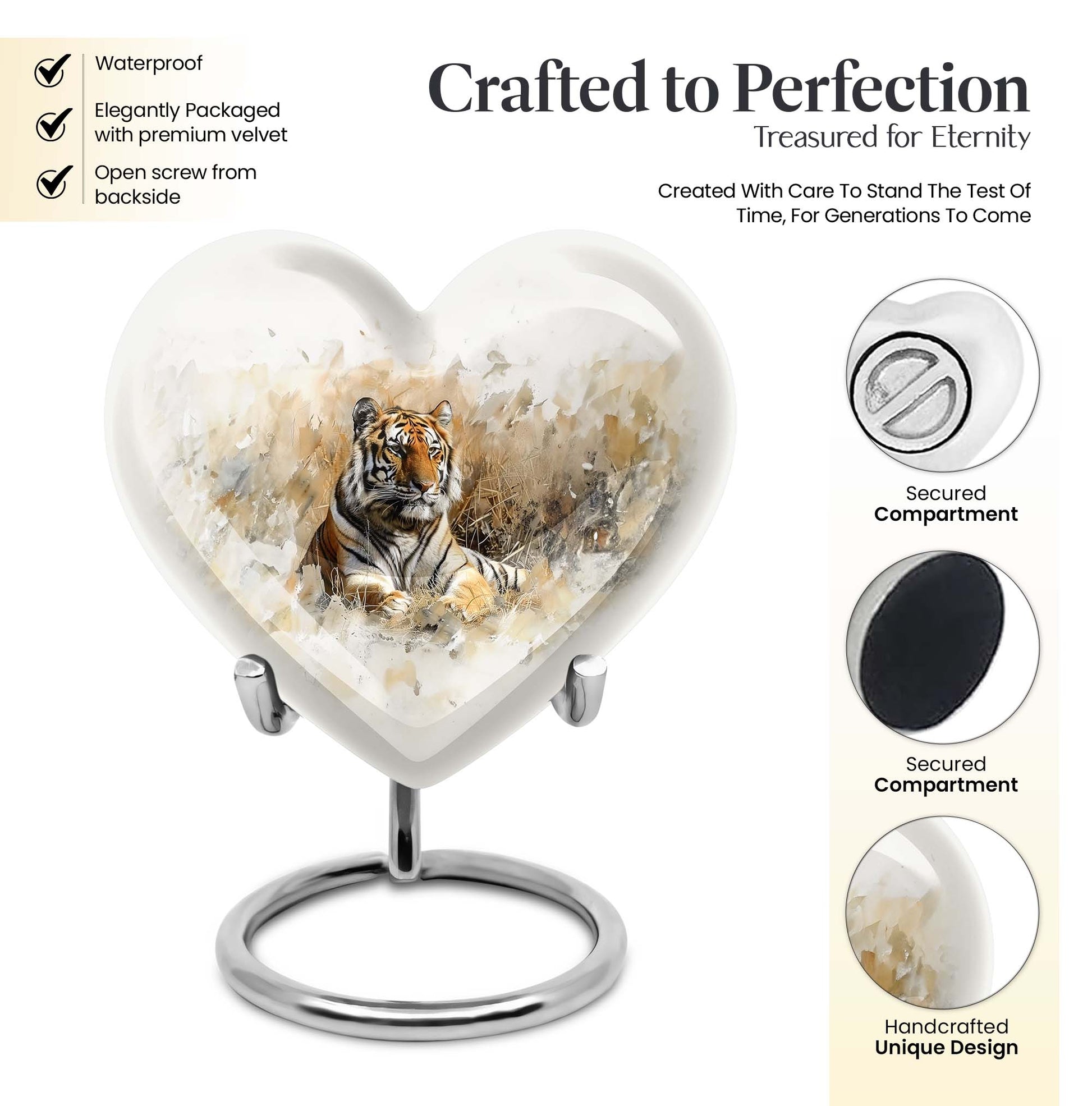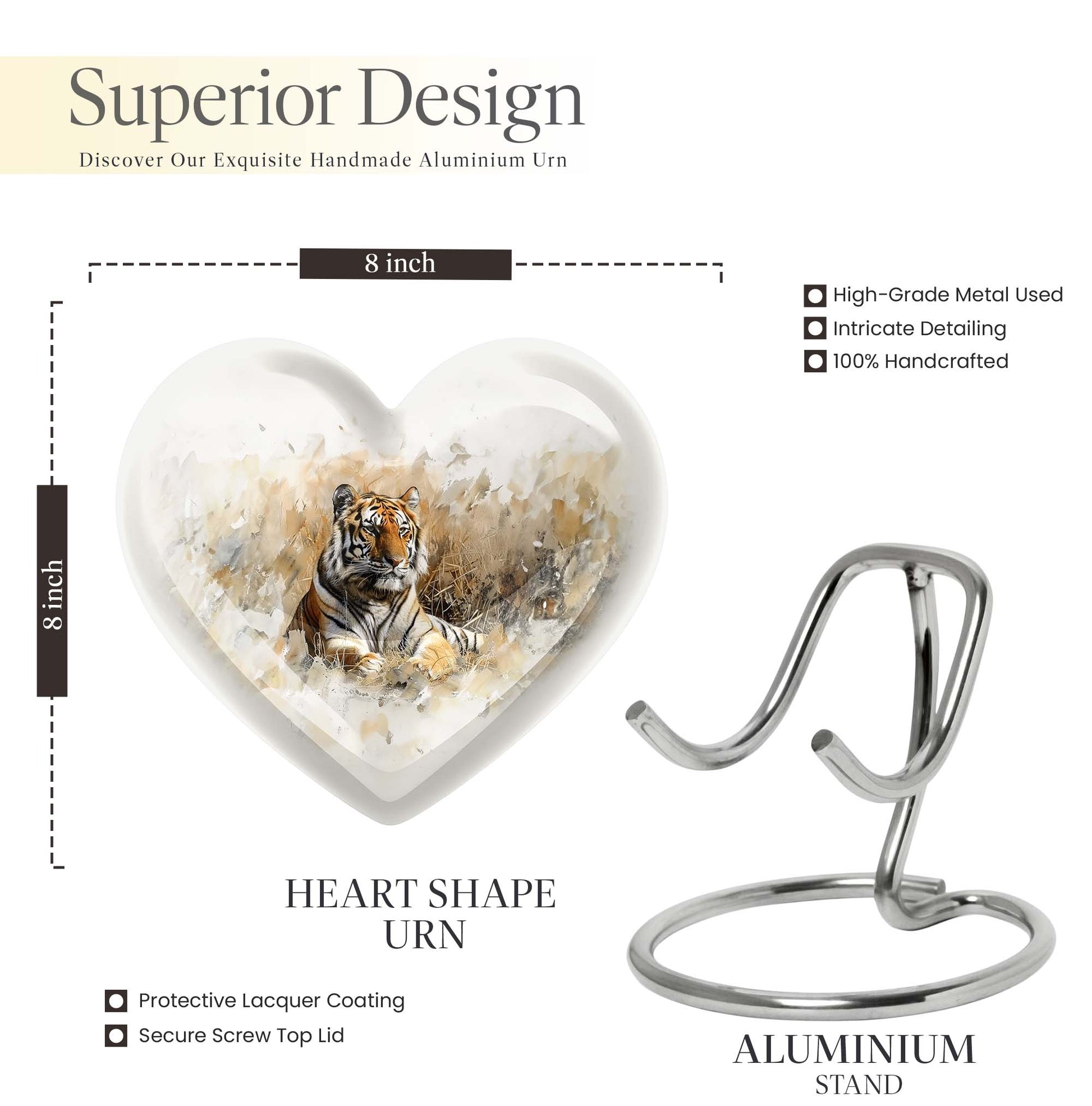 Explore the superior quality, uniquely crafted tiger urns, an essential piece in Memorial Ceremony Supplies. Sized at 10 inches, this large burial urn is perfect for keeping the remembrances of your loved ones close to you. The urn's design mimics the beauty and tranquility of nature with an engraved floral theme, offering peace and solace. Surface made from durable aluminium, it weighs 3.3 pounds, promises longevity and has a holding capacity of 200 cubic inches. Personalization is available, allowing you to engrave a name, adding that personal touch. This cremation urn for men comes with an elegant velvet pouch for containing and safeguarding ashes. Adorned in every detail, it reminds us of the undying spirit and love for our dear departed ones. Ideal for those in need of funeral cremation urns or urn ash funeral urn box, this heart-shaped urn box stands as the embodiment of never-ending love and memory.