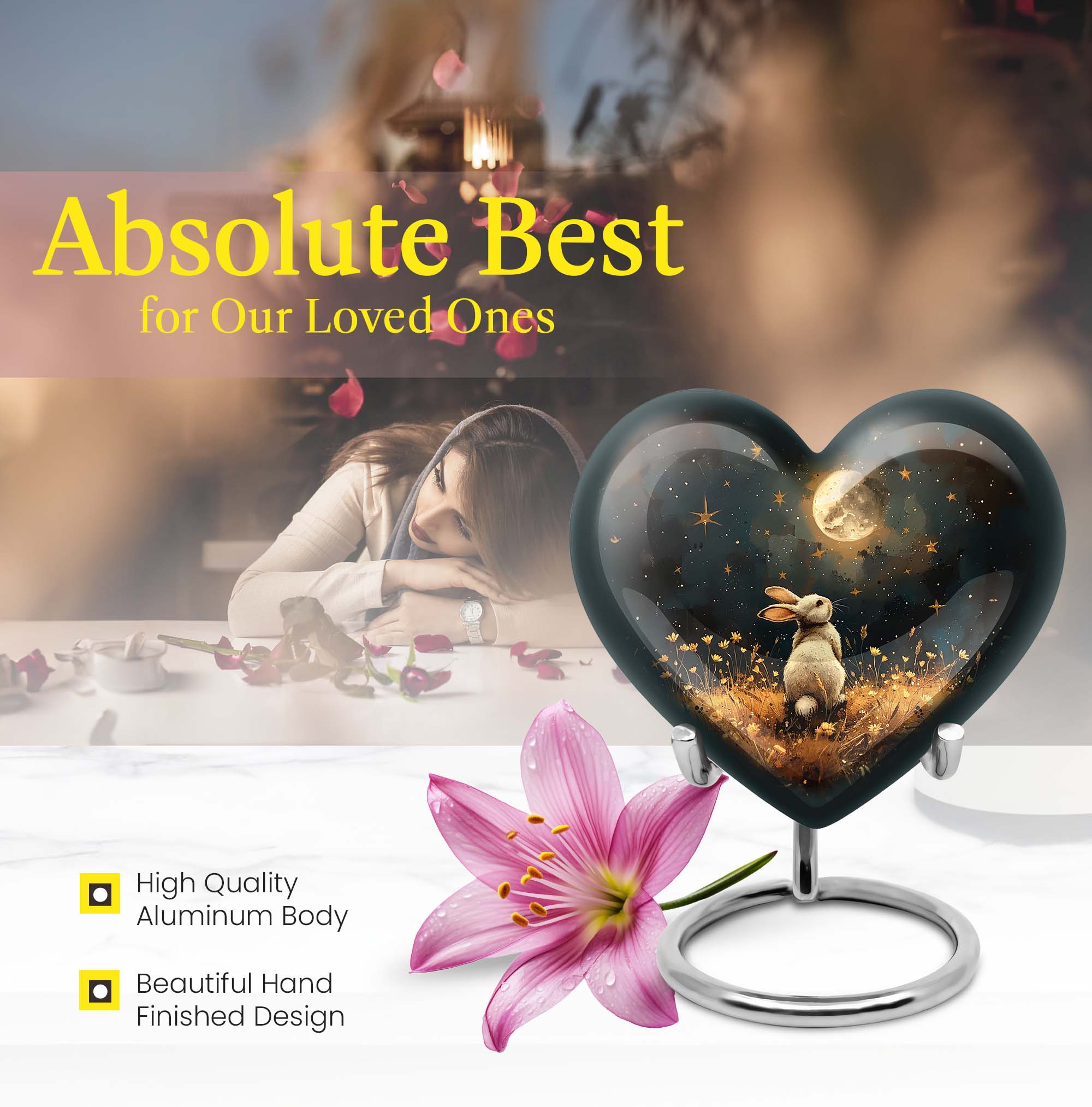 Discover a revered remembrance for your dearly departed one with the White Bunny Moon Urn. This large, 10-inch masterpiece pays homage to the celestial beauty, in an abstract theme, entirely crafted from sturdy aluminium. With a weight of just 3.3 pounds, the urn is both durable and has a thoughtful capacity of 200 cubic inches, permitting you to respectfully preserve the ashes of an adult. Harmoniously blend this memorial urn into your home decor, its unique heart design echoing a timeless connection. The urn additionally comes with a velvet pouch, providing a dignified containment for the treasured remains. Personalize this burial funeral cremation urn with an engraved name, enhancing its sentimental value. Its magnificent appeal positions it as an exquisite choice for man metal cremation or as an urn for human ashes for an adult woman. Cherish the beauty of memory with this distinctive urn.