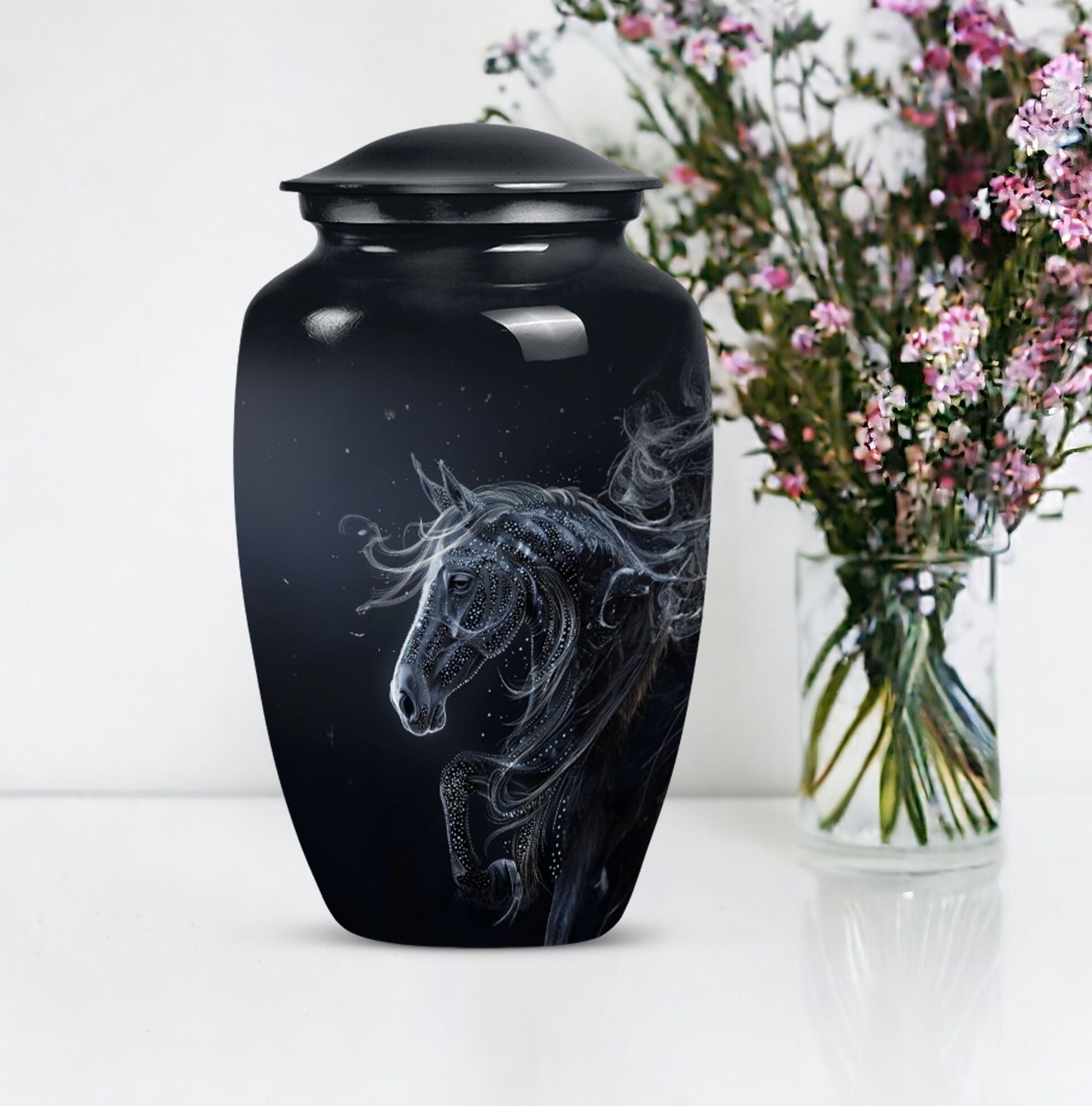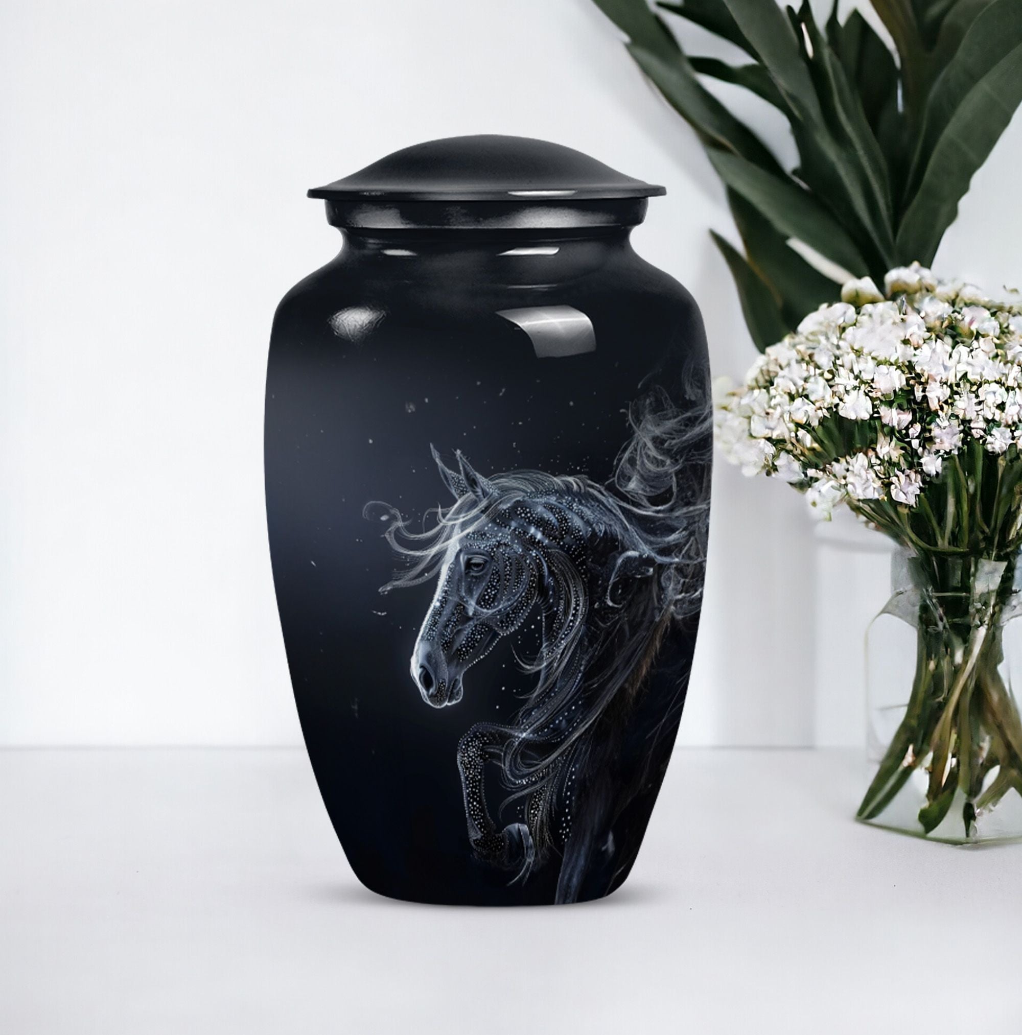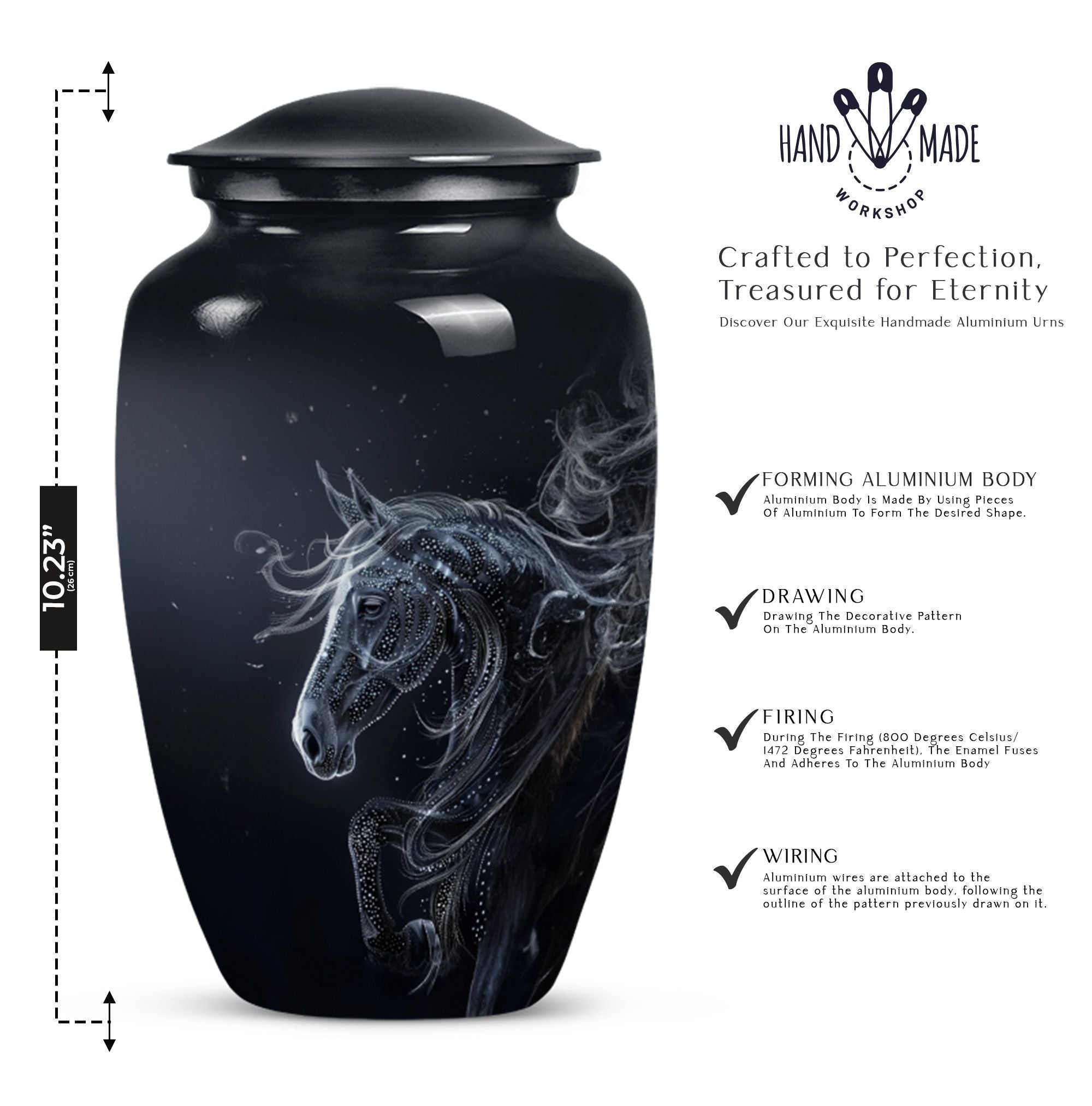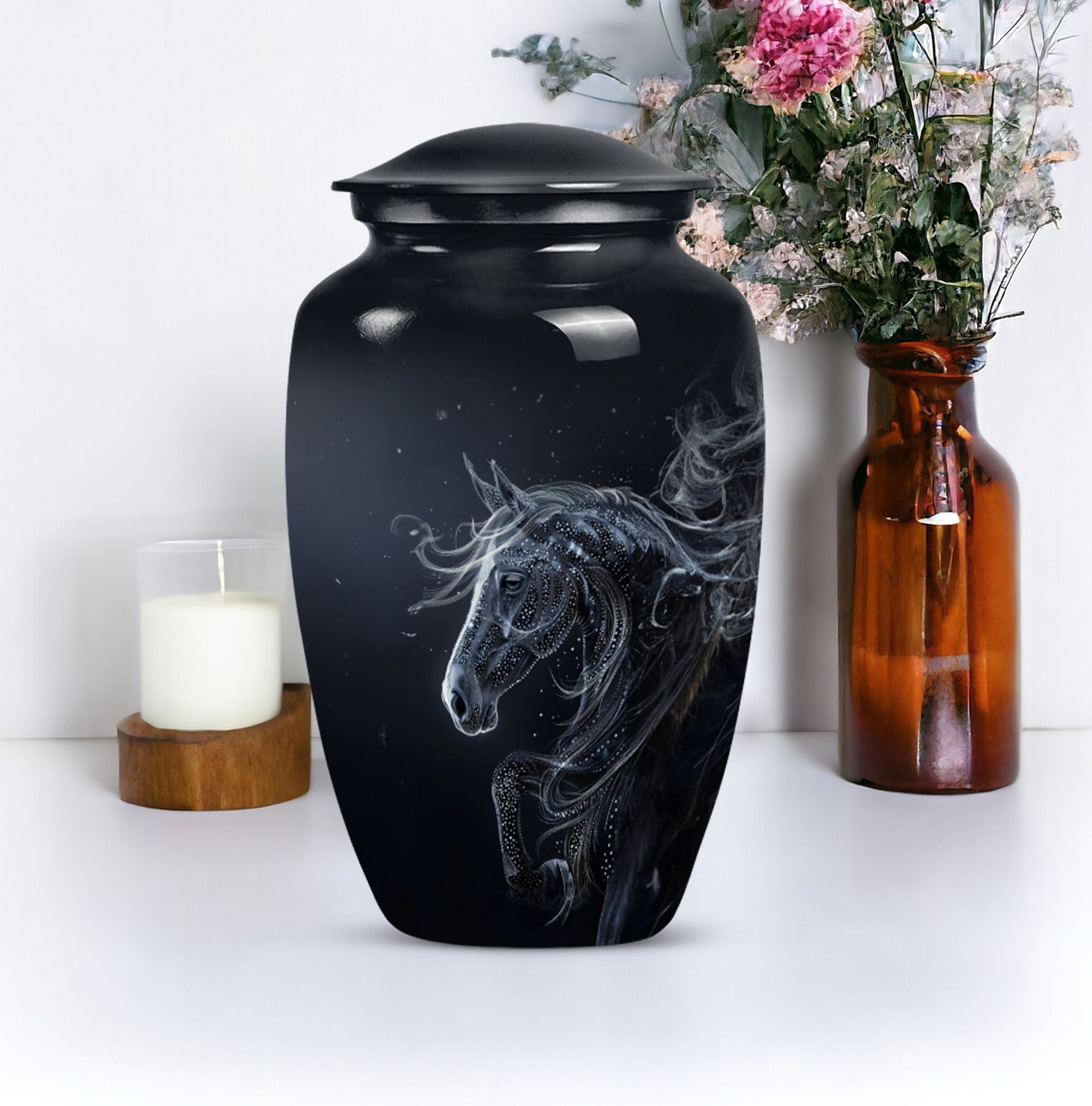 Embark on a tranquil and serene journey towards peaceful remembrance with our Large Urn for Ashes. Perfect for those seeking a Horse Urn or a cremation urn for an adult male, our product fuses reliability and tranquility in a single, seamless experience. Its robust physique, weighing in at 3.3 pounds, and towering 10 inches tall, is a testament to our commitment for quality memorial urns that stand the test of time. Enveloped in a stylish Aluminium exterior, our urn highlights an enchanting abstract theme that connects the departed with the divine. Prepared to hold 200 cubic inches securely, the urn's ample capacity accommodates most needs. For a personalised touch, engrave names on the urn to make it unique. The urn boasts portability, making it an ideal travelling companion for those cherished moments of remembrance on-the-go. Finally, it comes complete with a lovely velvet pouch, offering an undemanding containment solution for the pioneers of the voyage. This urn is not just a product; it is a tribute to life's fleeting yet beautiful moments.