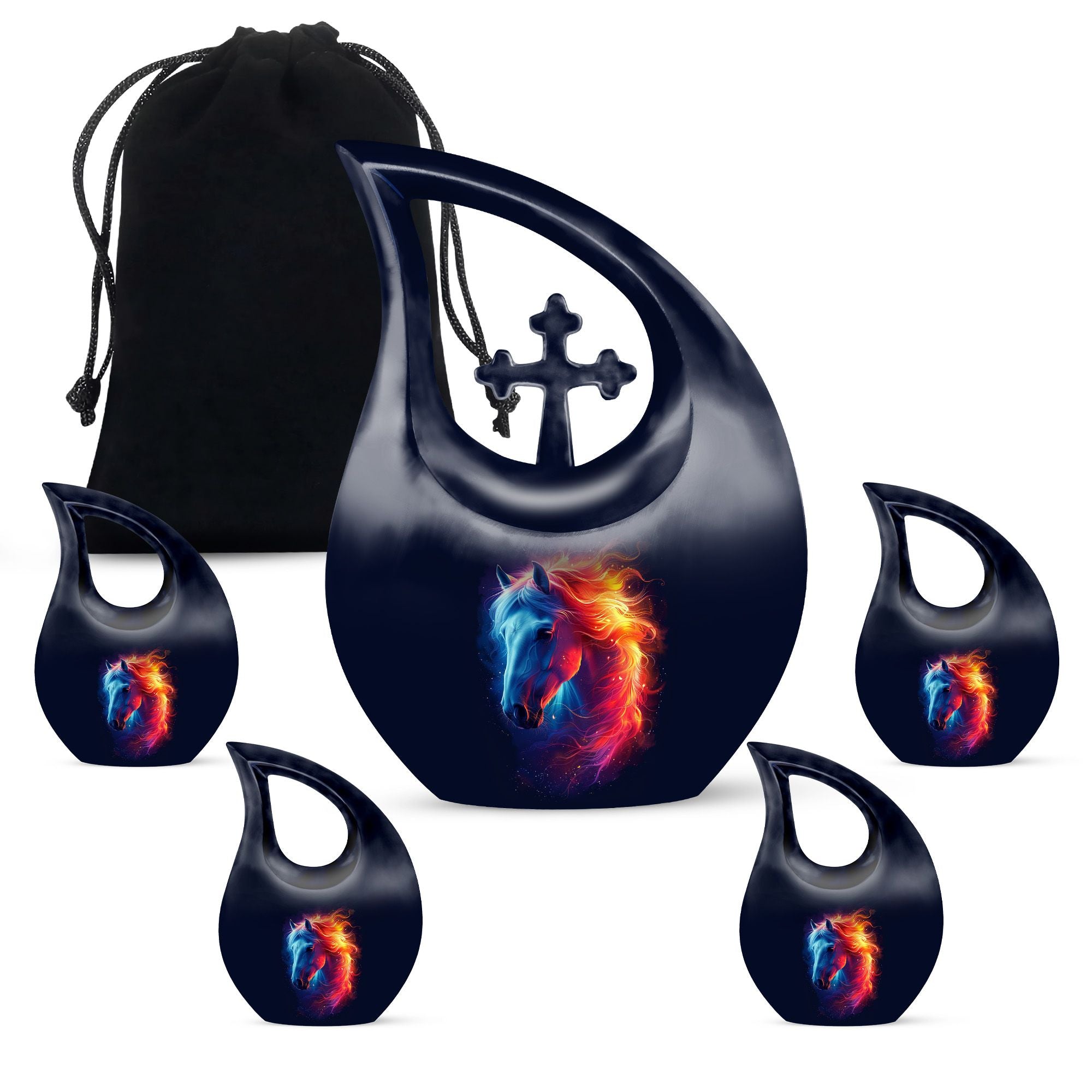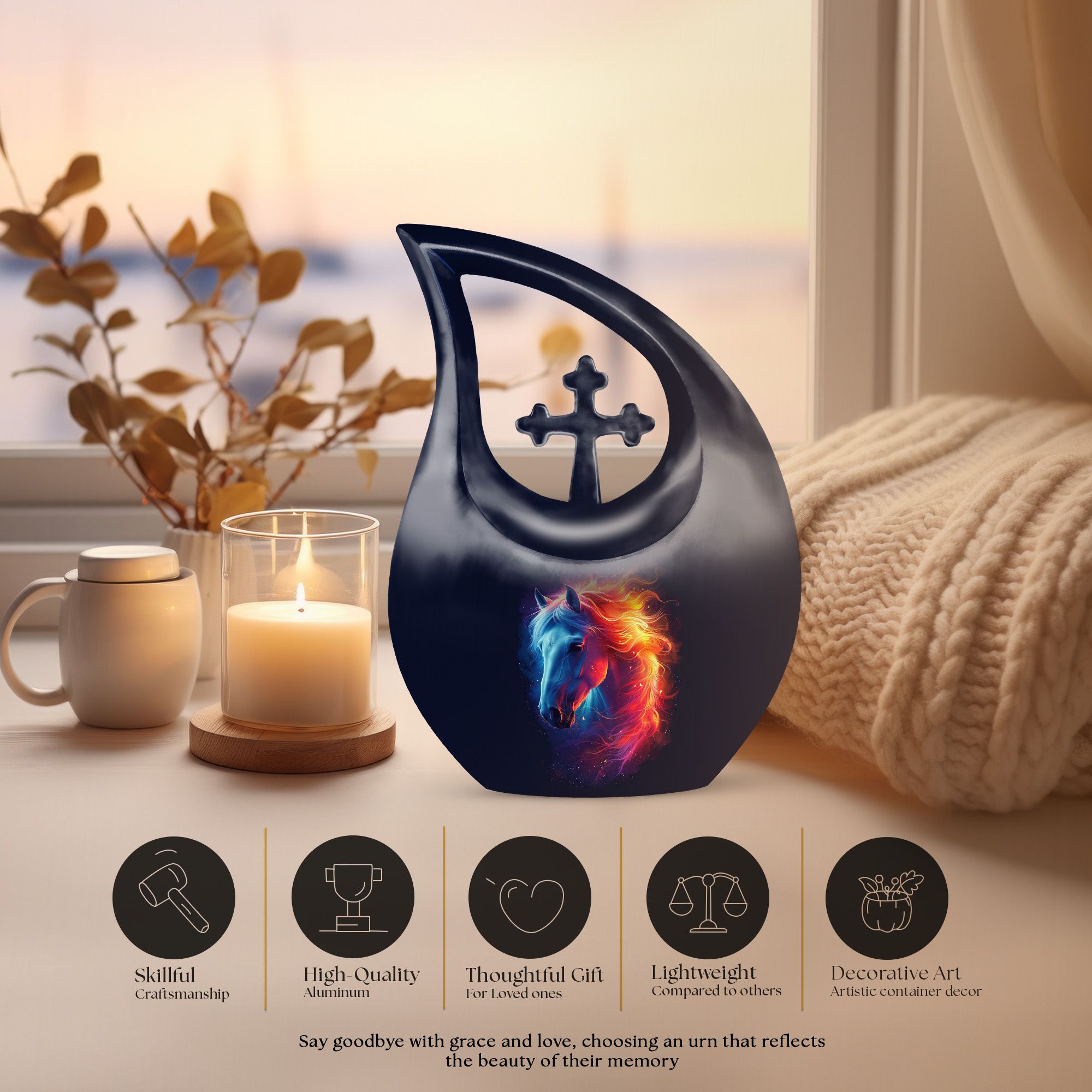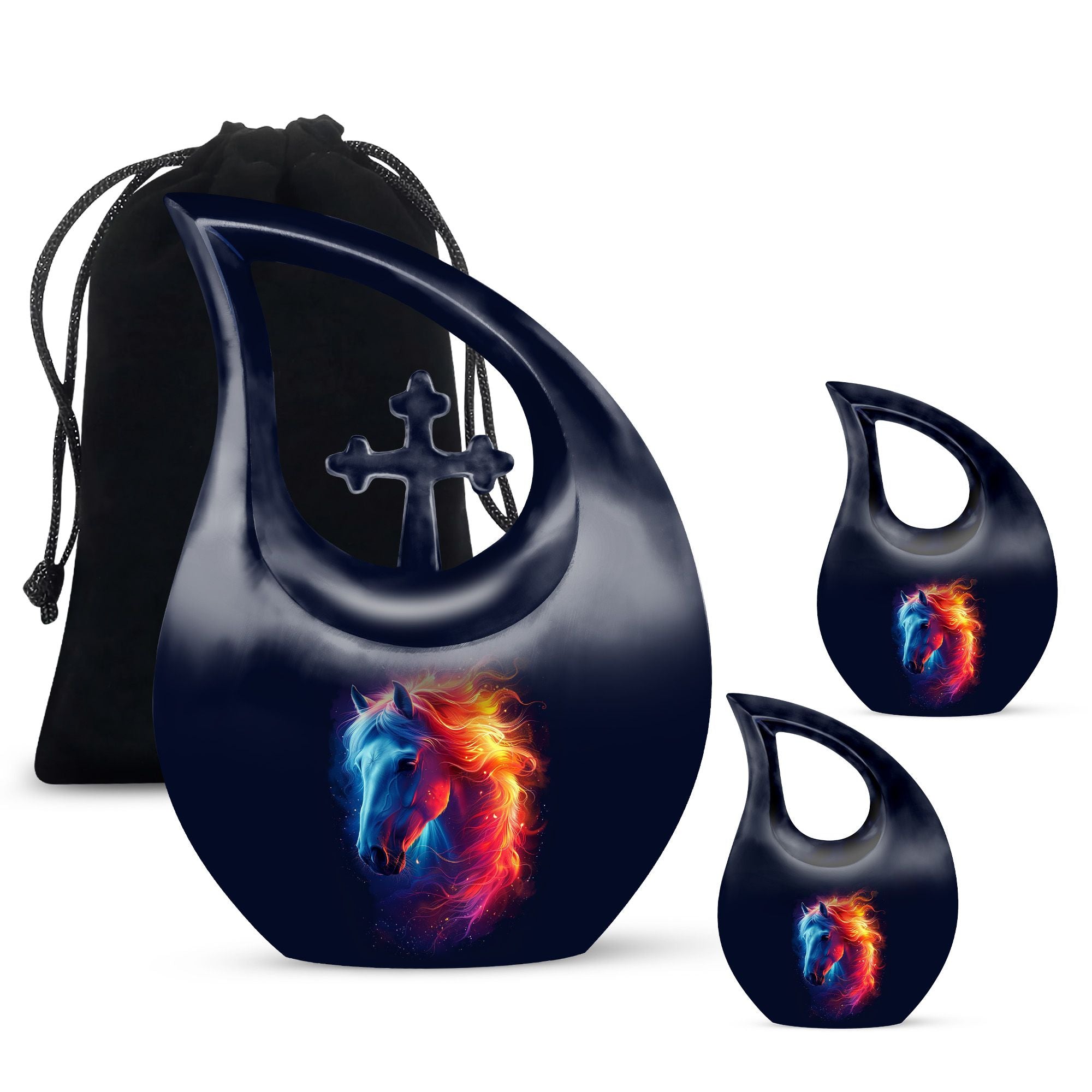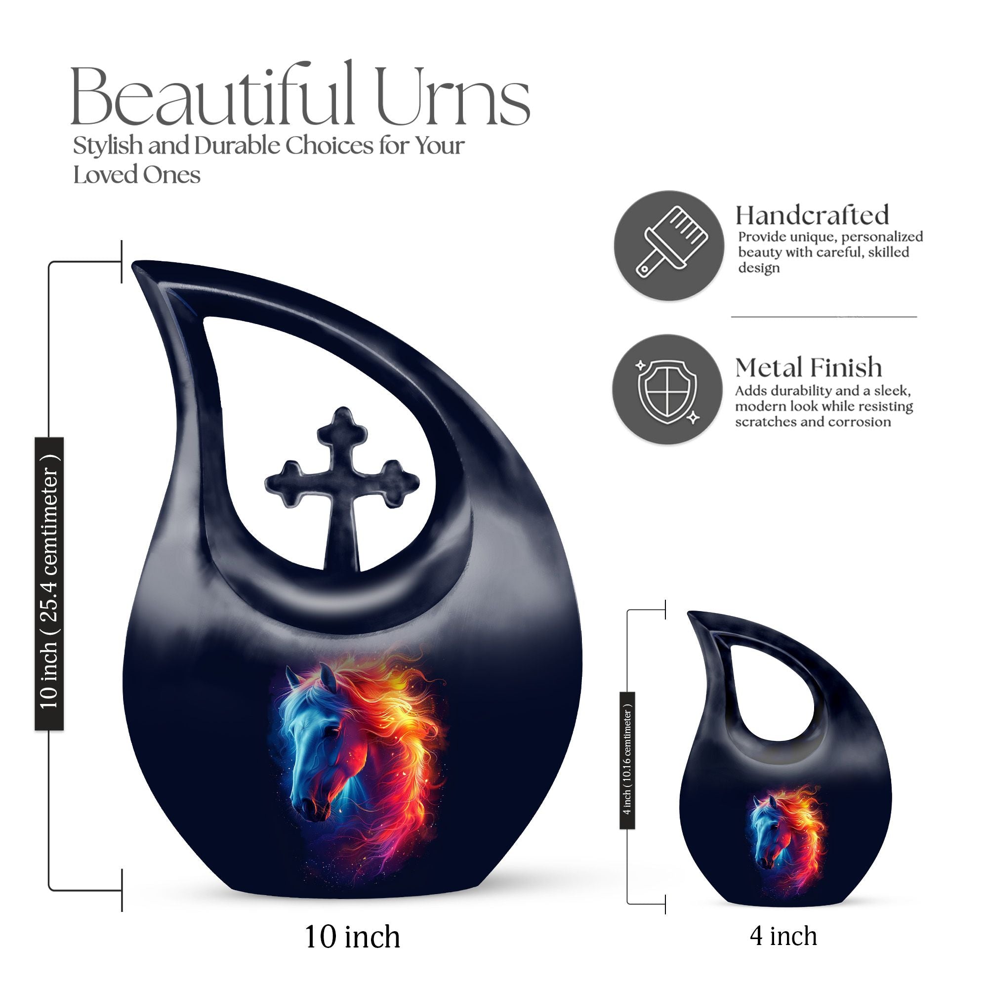 Cherish the memory of your beloved Dad or equine friend with this truly regal Horse Urn. Crafted from top-grade aluminium, this Large Urn weighs 3.3 pounds, ensuring substantial durability and a long-lasting memento. Measuring 10 inches in height, a size that comfortably accommodates up to 200 cubic inches of treasured ashes. The finest detail comes in an elegant Cross Drop design, adding a touch of grace to this noble memorial urn. Each Urn For Dad or horse comes with a velvet pouch, carefully chosen to provide a dignified containment for the ashes. Moreover, this urn brings the option of personalization by allowing names to be engraved, further enhancing this monumental tribute to the departed. Ranging from 'Cremation Containers' to 'Miniature Urns' and 'Box Urns For Human Ashes', our vast offering brings a choice suitable for every bereaved heart. Settle for nothing less than this distinctive memorial urn for a valued representation of a cherished life lived.