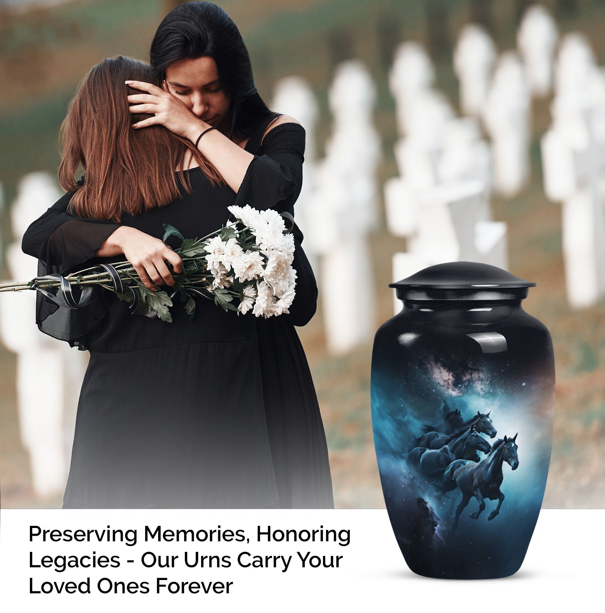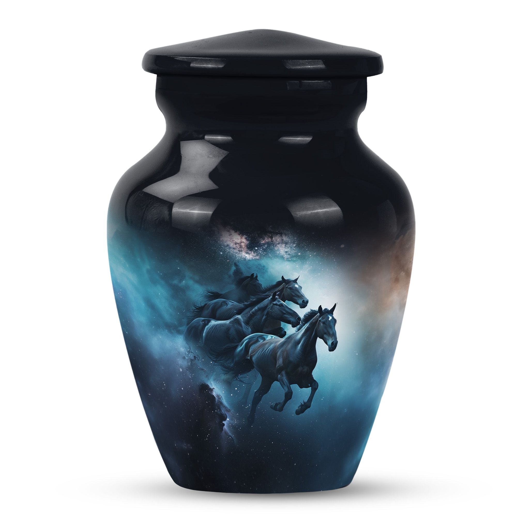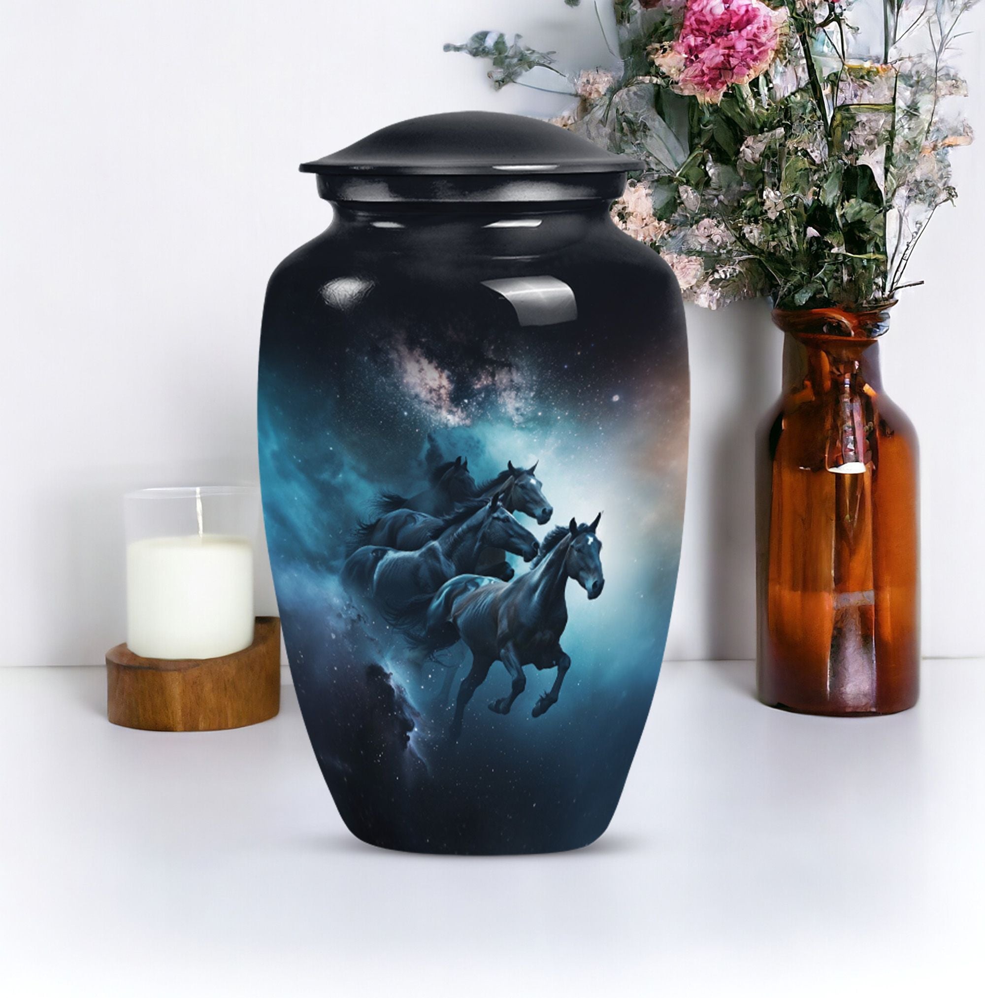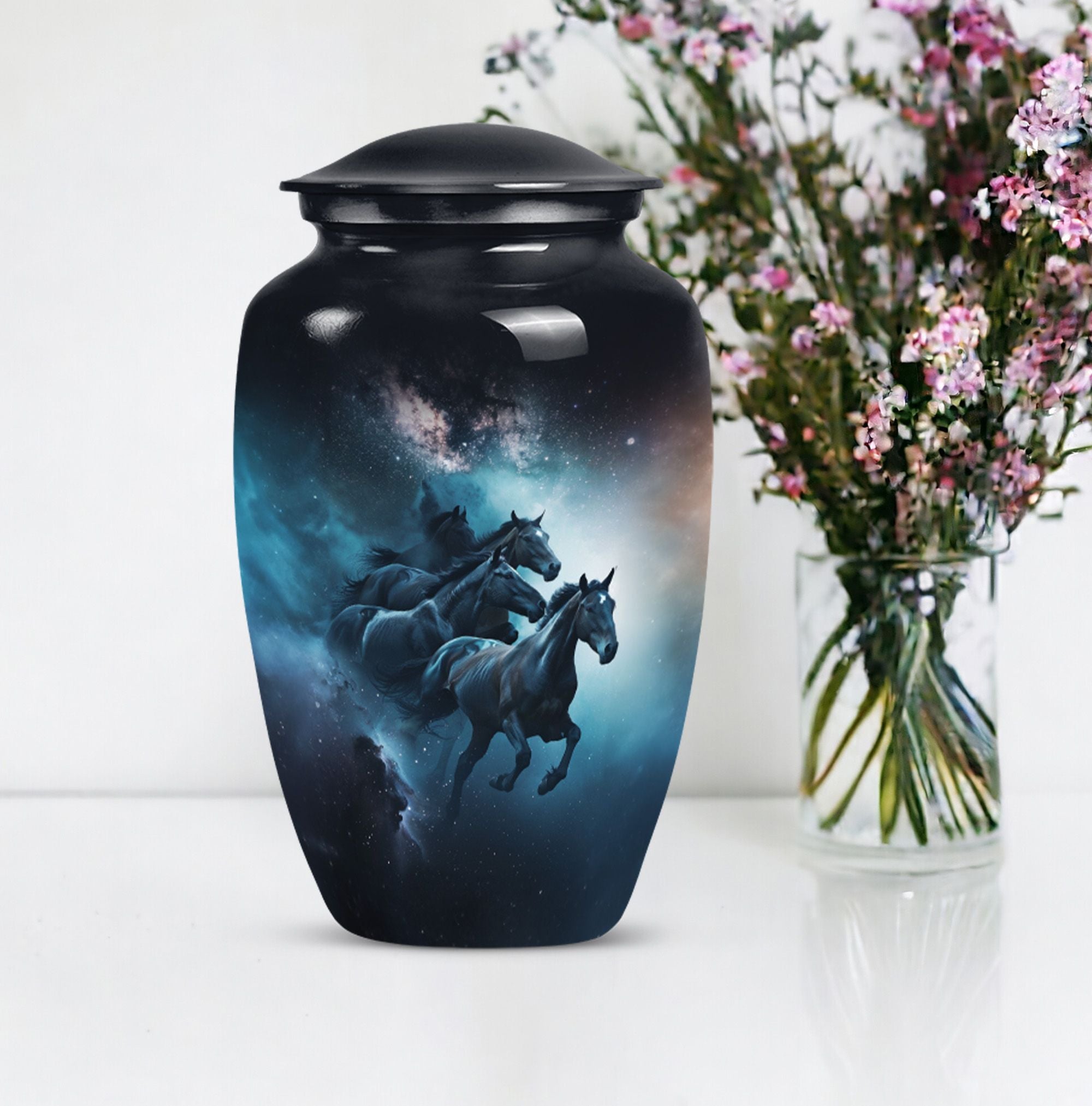 Capture a timeless tribute to a loved one with our meticulously crafted Horse Urn. This Large Urn, fabricated from premium quality Aluminum, spans 10 inches in height and weighs 3.3 pounds. The abstract theme strikes an ideal balance between artistry and symbolism, invoking meaningful reflection. Its robust construction and size of 10 inches can securely hold up to 200 cubic inches of ashes, making it suitable for adult men. This urn is not all about function but conveys an emotional connection through its Classic Urn representation. Other than its prominent aesthetic, we offer an added layer of personal sentiments by allowing customization - engrave names on it to make it even more special. Furthermore, each purchase comes with a velvet pouch, ensuring respectful containment of ashes. Ideal for those seeking affordable, quality, and heart-touching memorial urns. Perfect for capturing the essence of love and honor, our Horse Urn serves as an authentic homage to your dad, becoming a family treasure for years to come.
