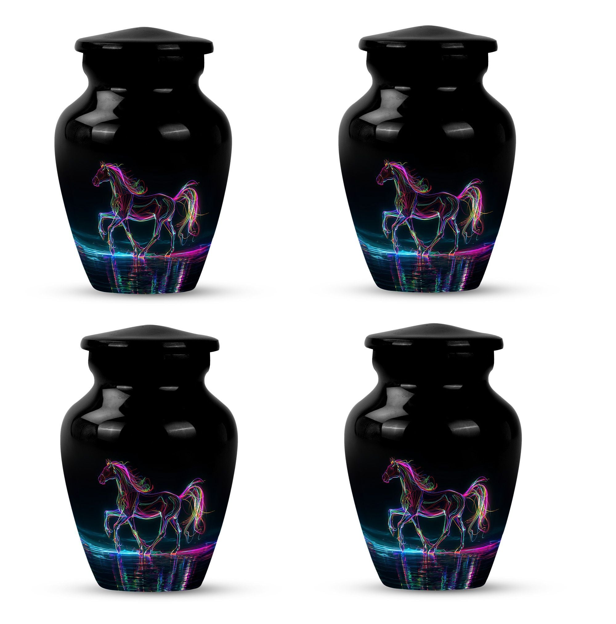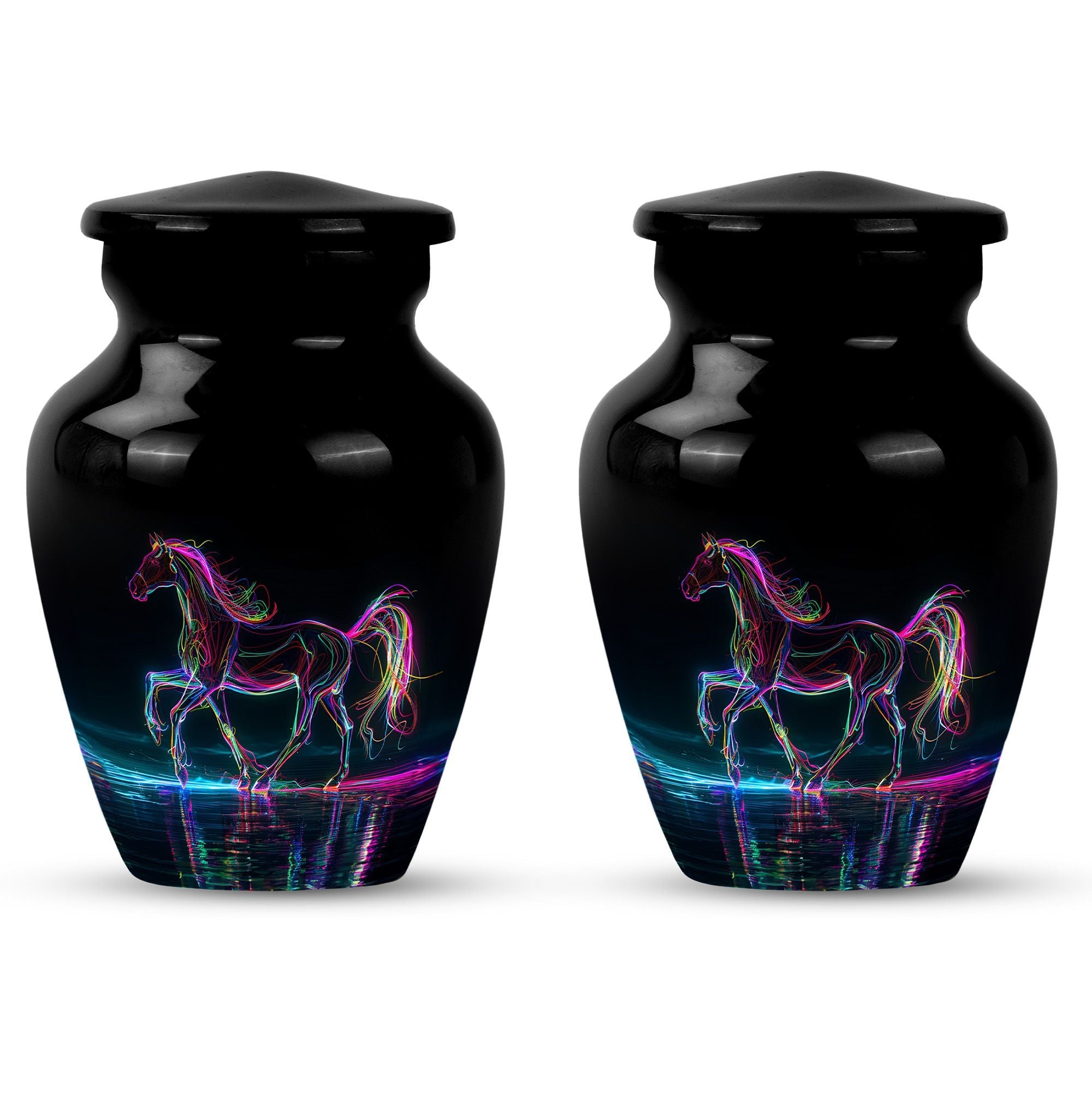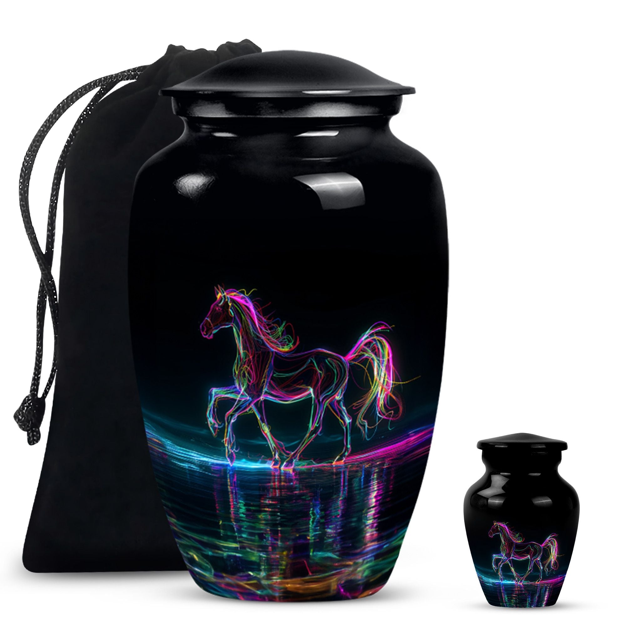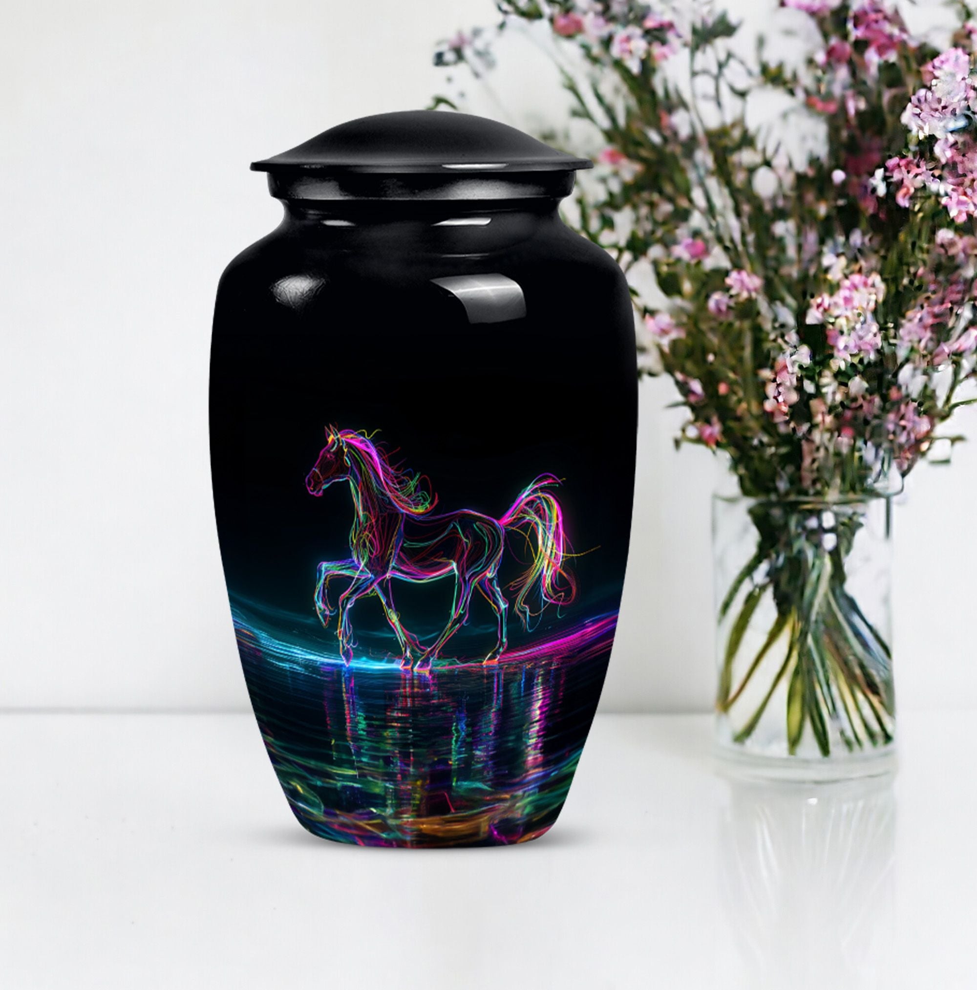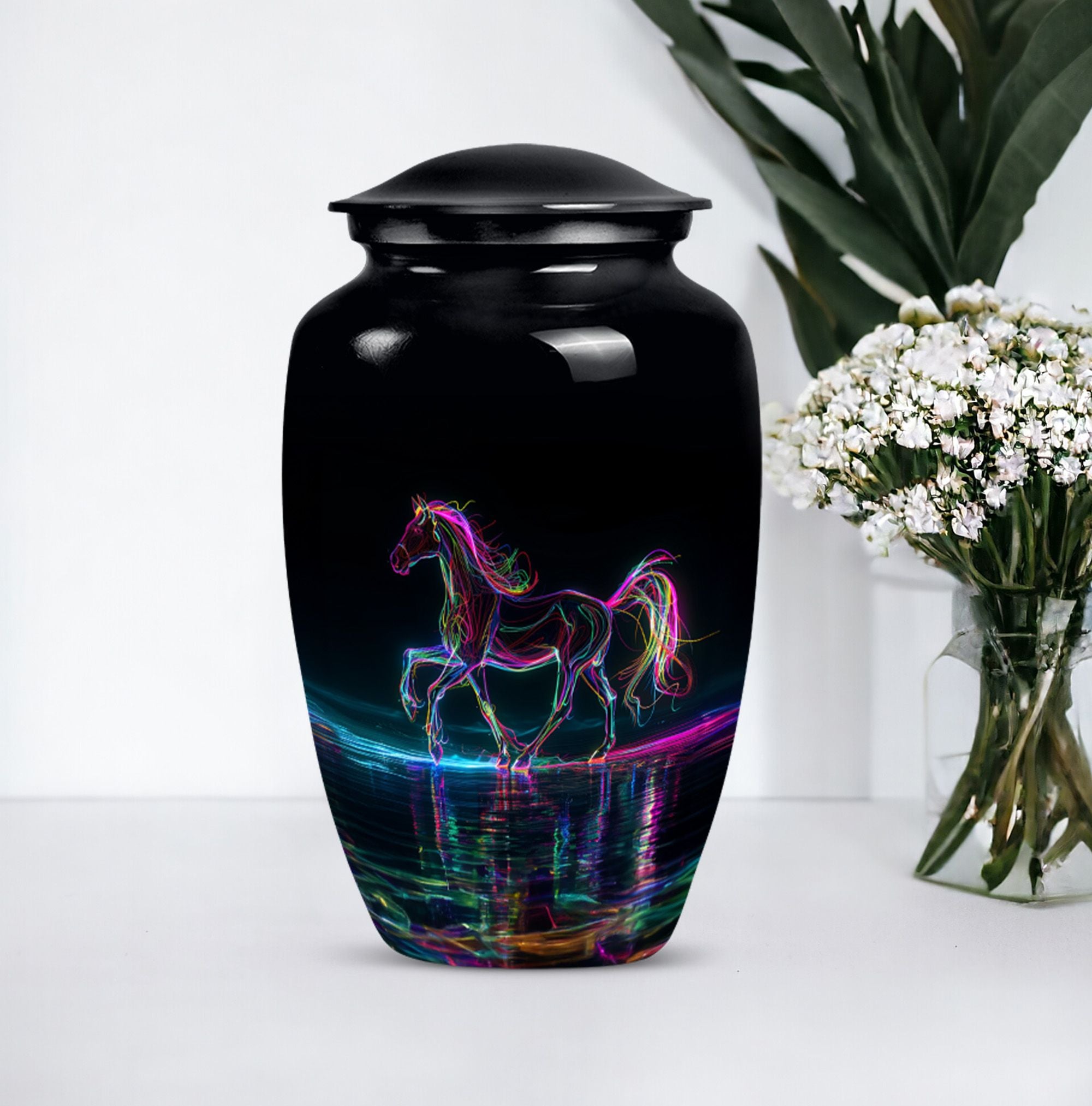 Presenting a uniquely crafted Horse Urn for the ones beloved. This specially designed classic urn, measuring 10 inches in stature and weighing just 3.3 pounds, is the epitome of elegance and thoughtfulness. It's constructed with durable aluminium, ensuring long-lasting resilience. The urn offers a substantial capacity of 200 cubic inches, ample space to hold the ashes of an adult male. Going beyond its practical aspect, this cherished keepsake is graced with an intriguing abstract theme. Making this urn even more special is the offering of personalized engraving, allowing for intimate customization. With purchase, you'll also receive a plush velvet pouch perfect for the containment of the ashes. This Horse Urn is an adored choic within the categories of 'Burial medium size urns', 'urn human ash cremation urn', and 'funeral urns for adult ashes women'. Honor your loved one with this beautifully designed, large-size cremation urn.