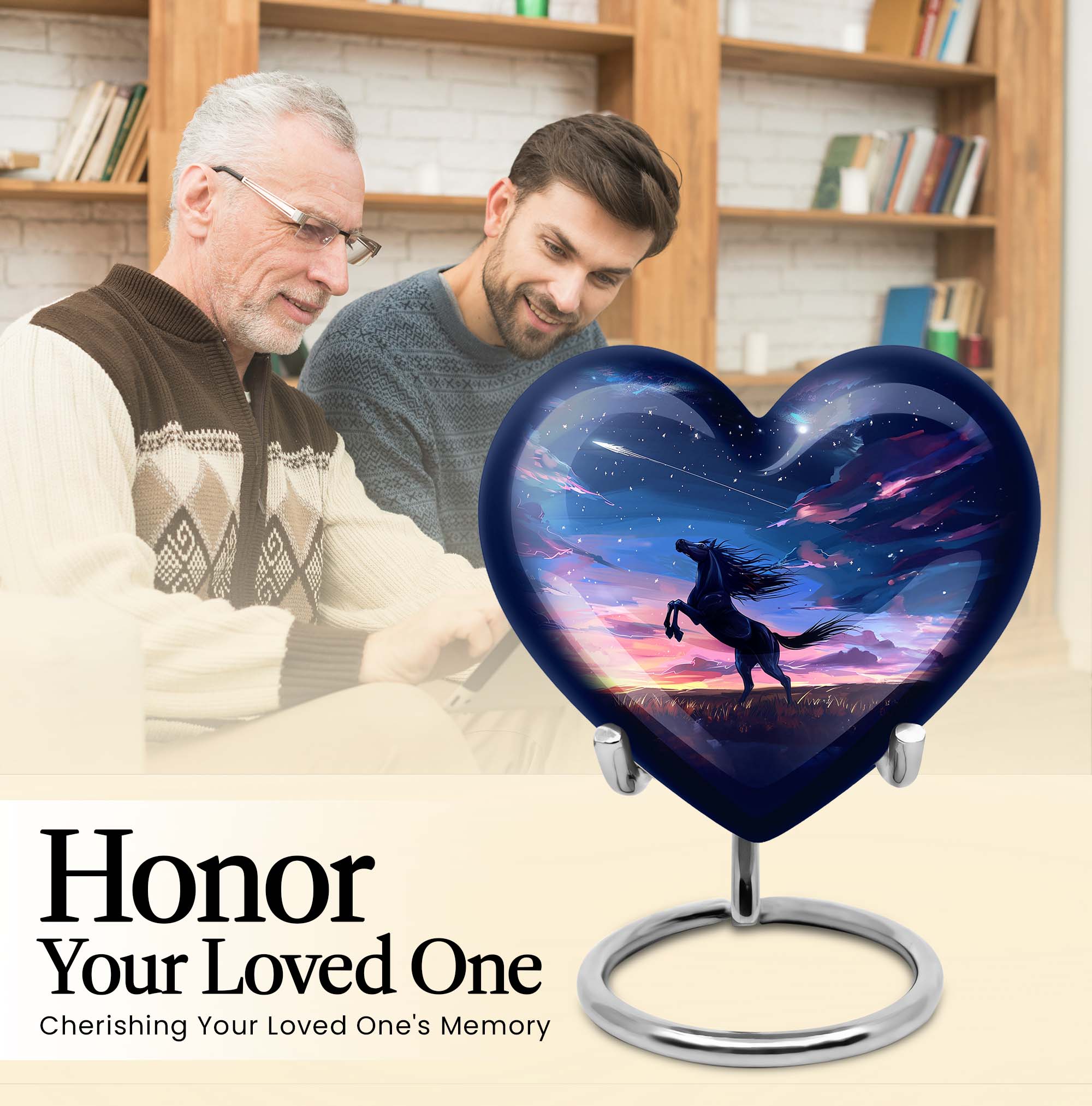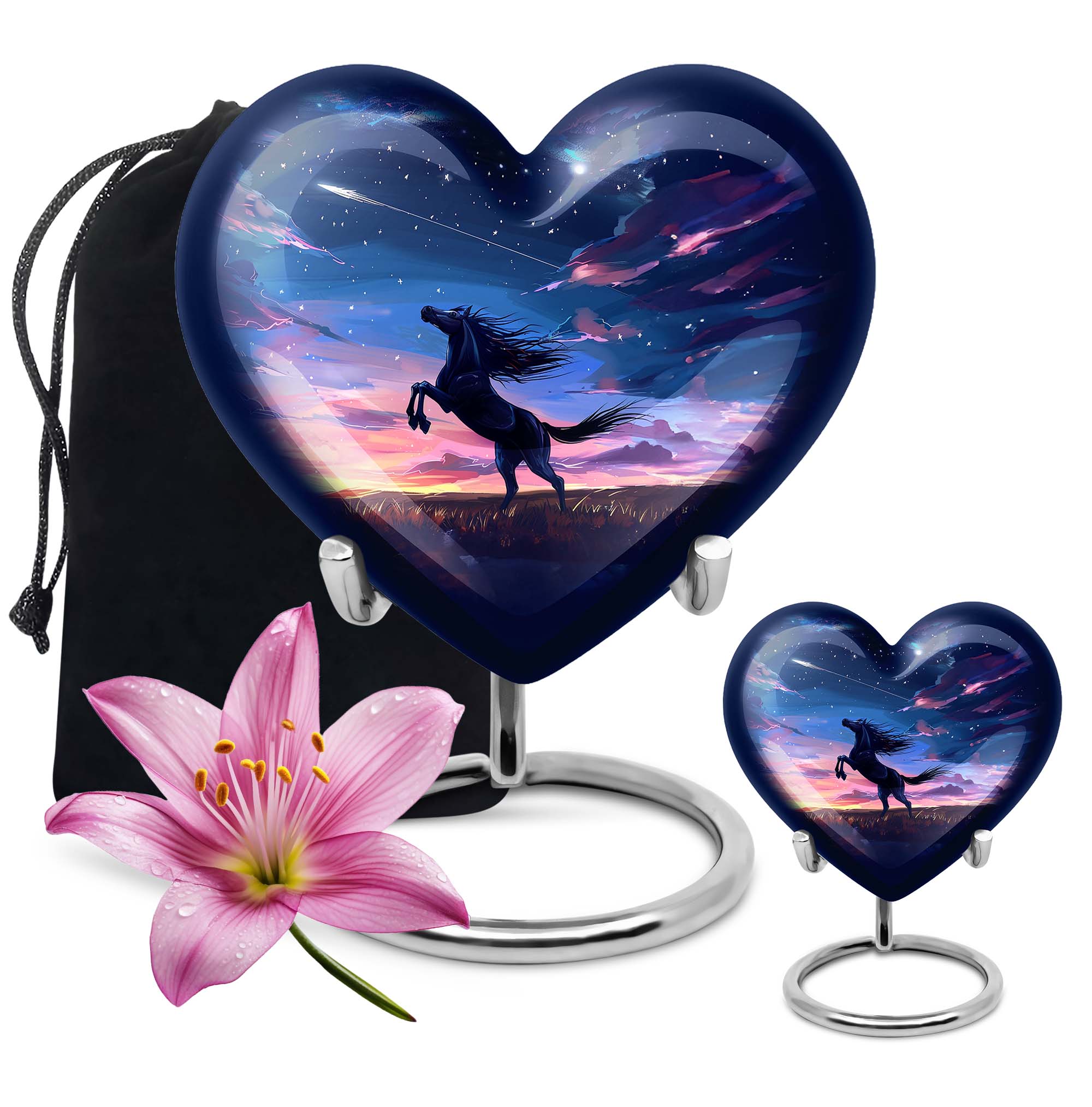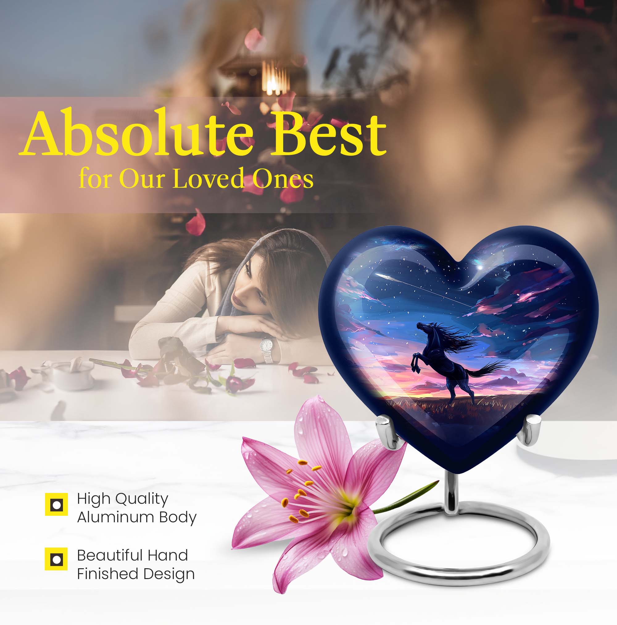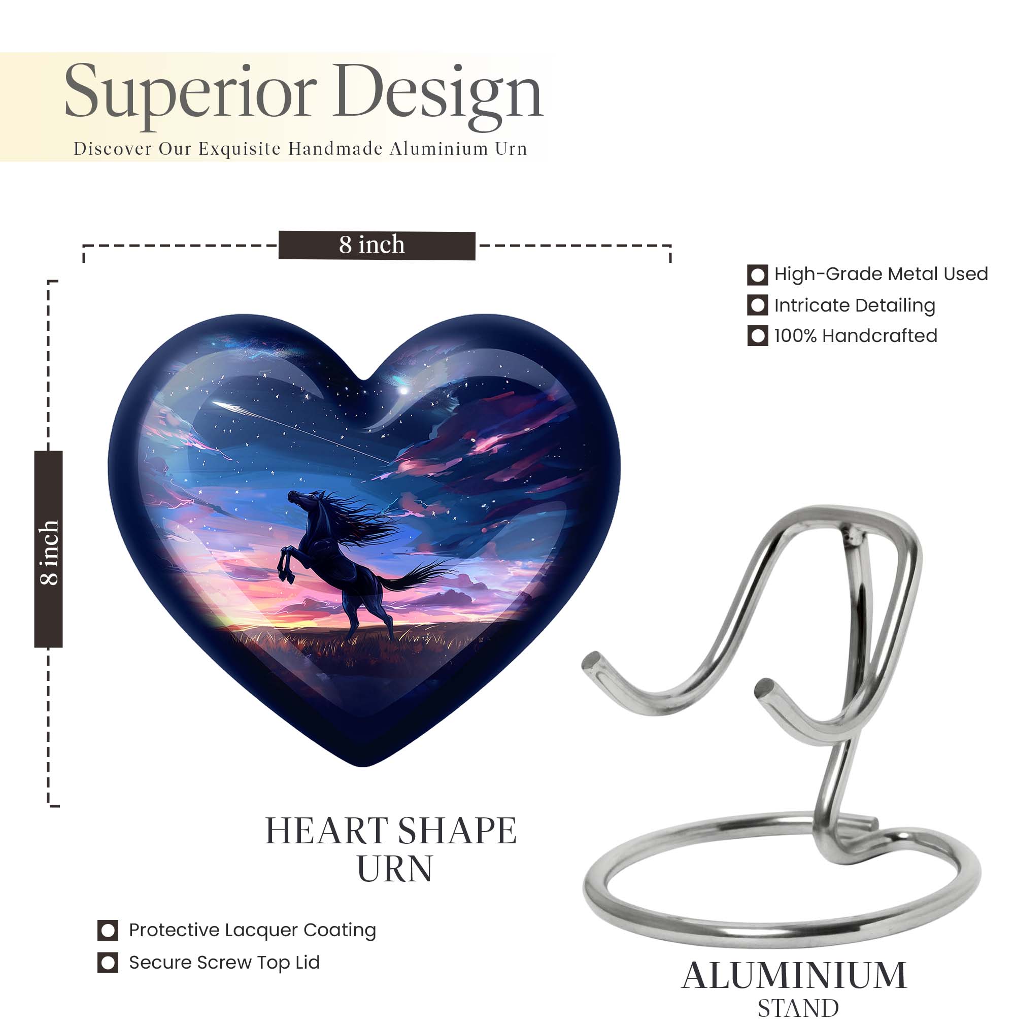 Honor your loved ones with the Abstract-themed Large Horse Urn, a tragic yet touching tribute to the reverence of life and the serenity of death. Measuring 10-inch in stature, this memorial urn is conscientiously crafted from robust aluminium, weighing a modest 3.3 pounds. Its distinct heart design, excluding its inherent charm, manifests its capacity to harbor a generous 200 cubic inches of precious ashes. The funeral ash urn comes with a personalization option, permitting you to etch the names of your dearly departed, further sealing their memory in this mortal realm. As part of the package, a soft velvet pouch is made available, aiding in the safe storage of the remaining ashes and ensuring their respectful containment. This breathtaking horse urn emphasizes on both functionality and sentiment, stepping away from conventional memorial urns. Ideal for mom's ashes, this heartfelt keepsake makes a stoic statement. Unique and profound, it transcends the usual metal urns for adult human ashes, embracing loss with dignity and grace.