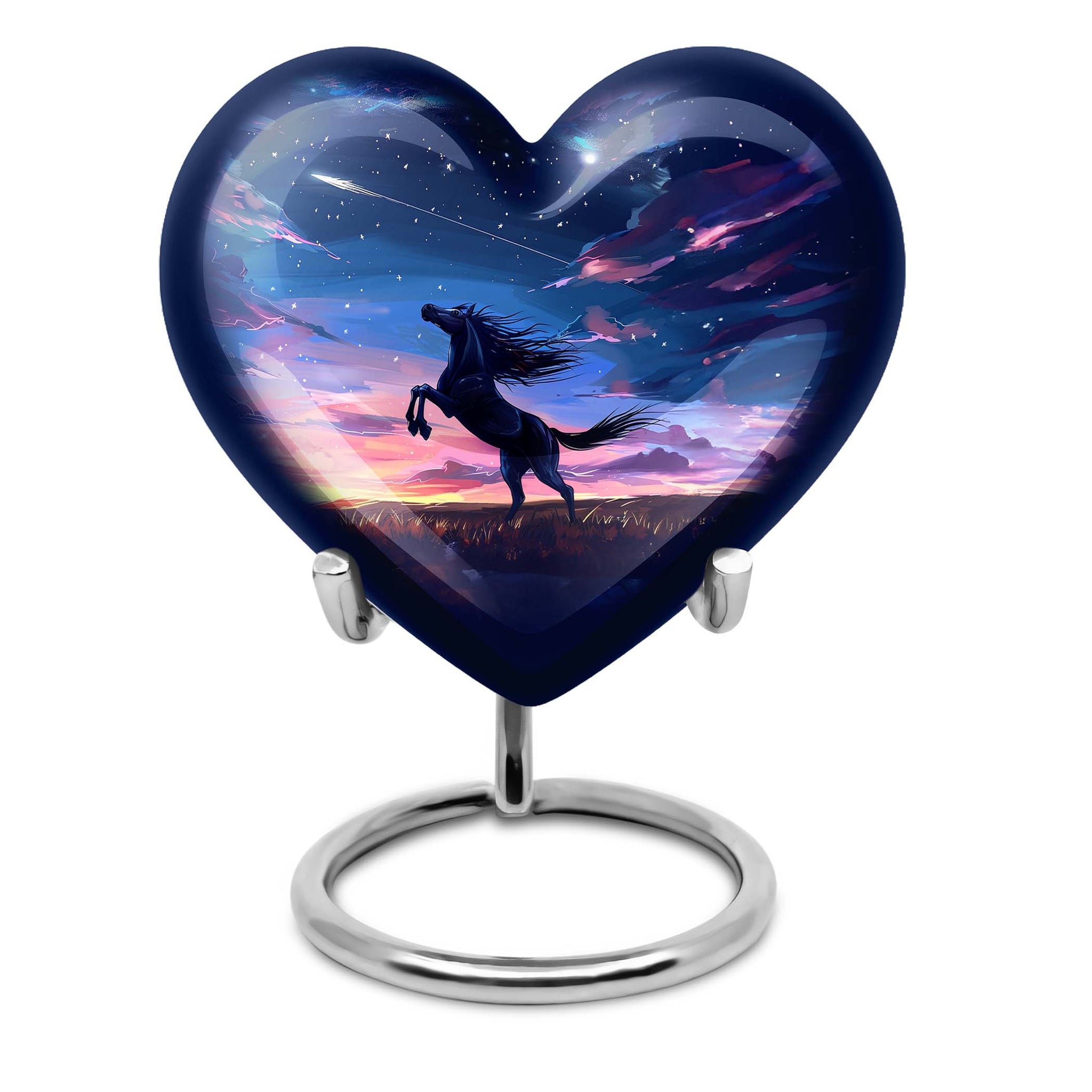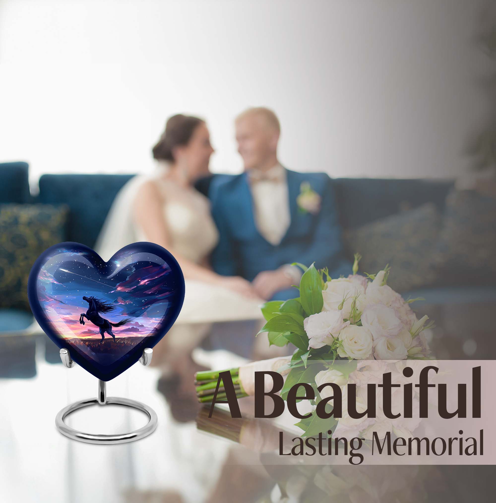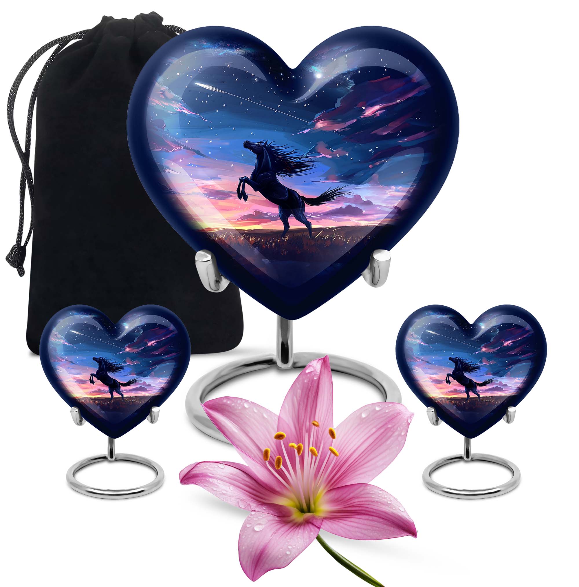 Honor your loved ones with the Abstract-themed Large Horse Urn, a tragic yet touching tribute to the reverence of life and the serenity of death. Measuring 10-inch in stature, this memorial urn is conscientiously crafted from robust aluminium, weighing a modest 3.3 pounds. Its distinct heart design, excluding its inherent charm, manifests its capacity to harbor a generous 200 cubic inches of precious ashes. The funeral ash urn comes with a personalization option, permitting you to etch the names of your dearly departed, further sealing their memory in this mortal realm. As part of the package, a soft velvet pouch is made available, aiding in the safe storage of the remaining ashes and ensuring their respectful containment. This breathtaking horse urn emphasizes on both functionality and sentiment, stepping away from conventional memorial urns. Ideal for mom's ashes, this heartfelt keepsake makes a stoic statement. Unique and profound, it transcends the usual metal urns for adult human ashes, embracing loss with dignity and grace.