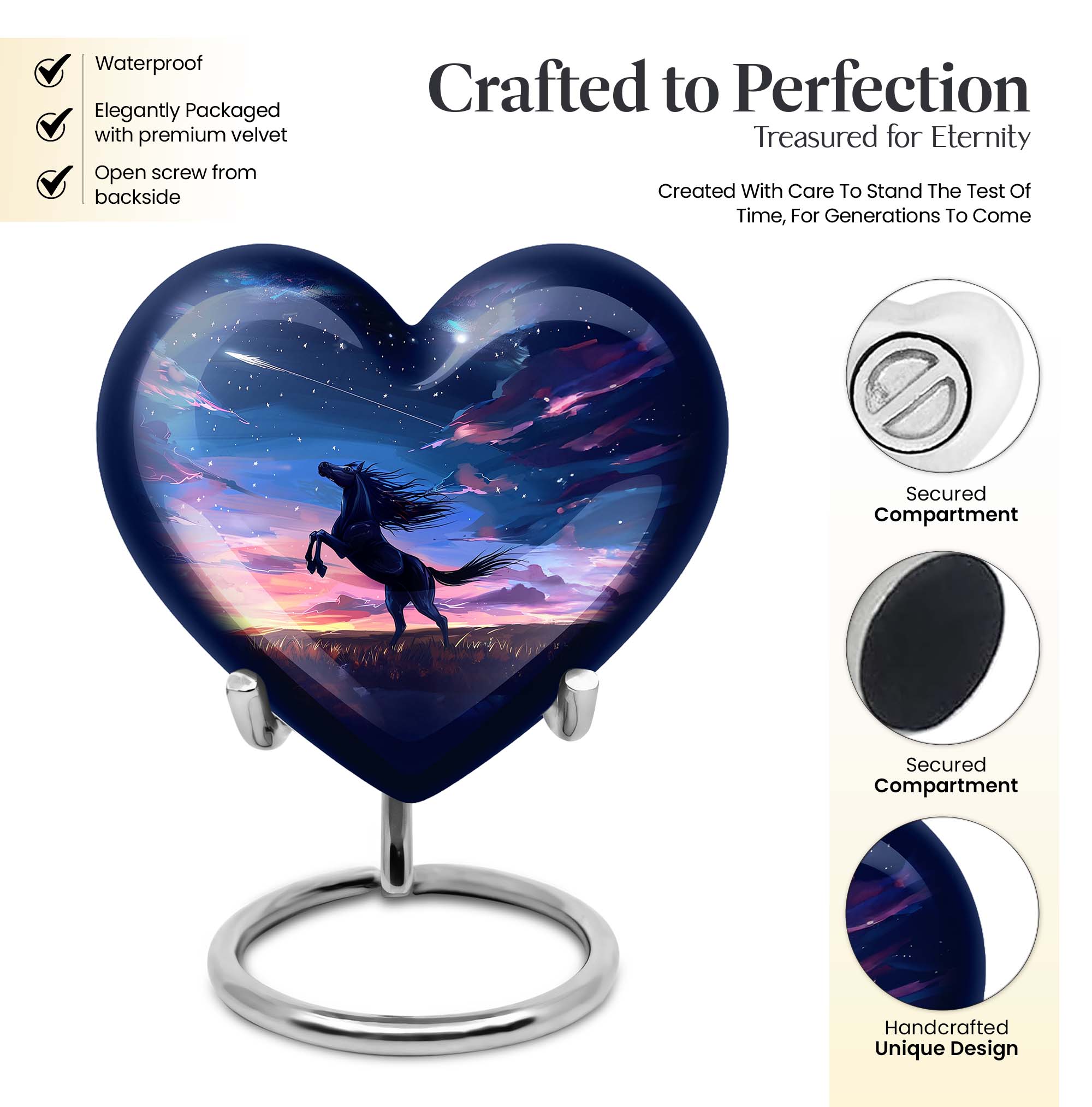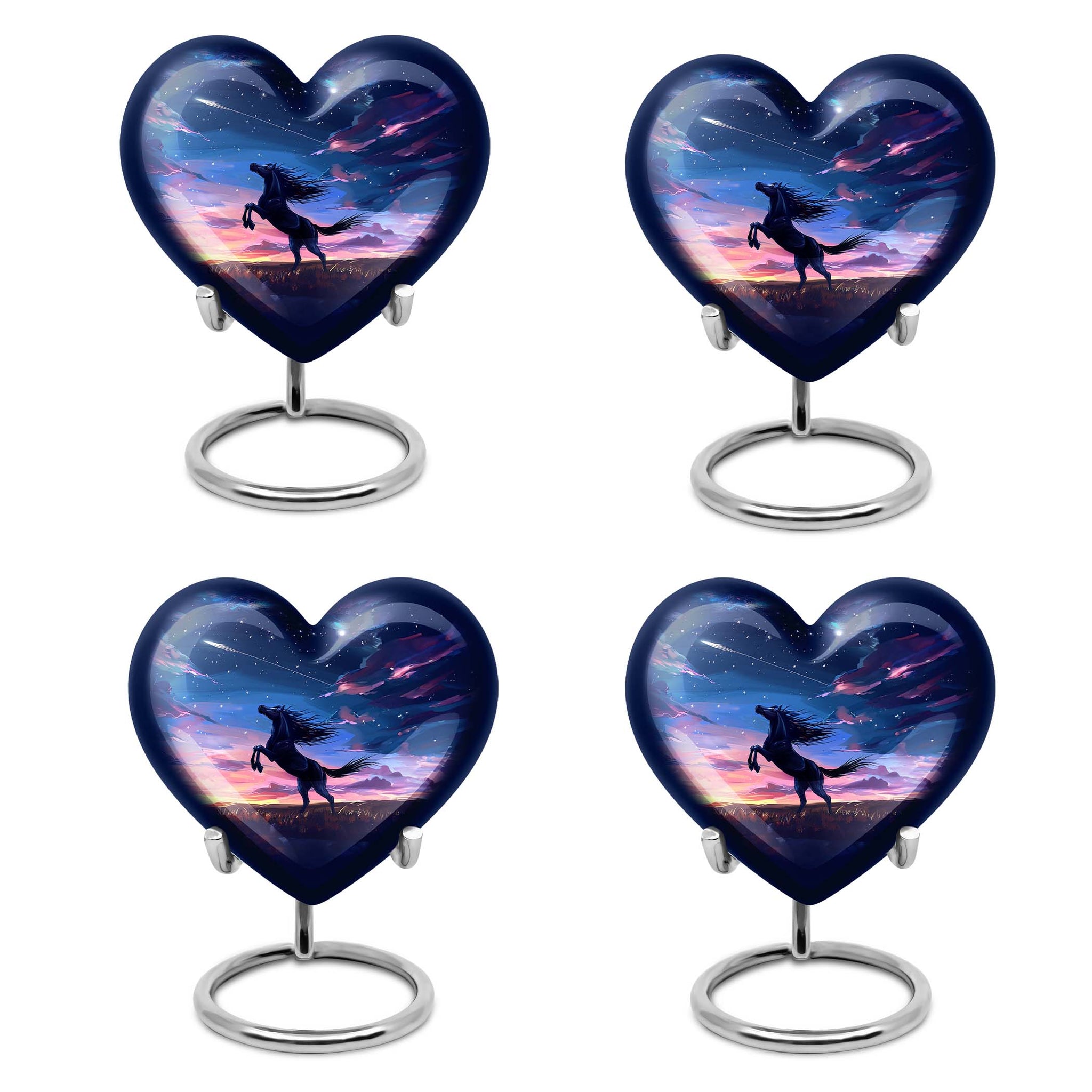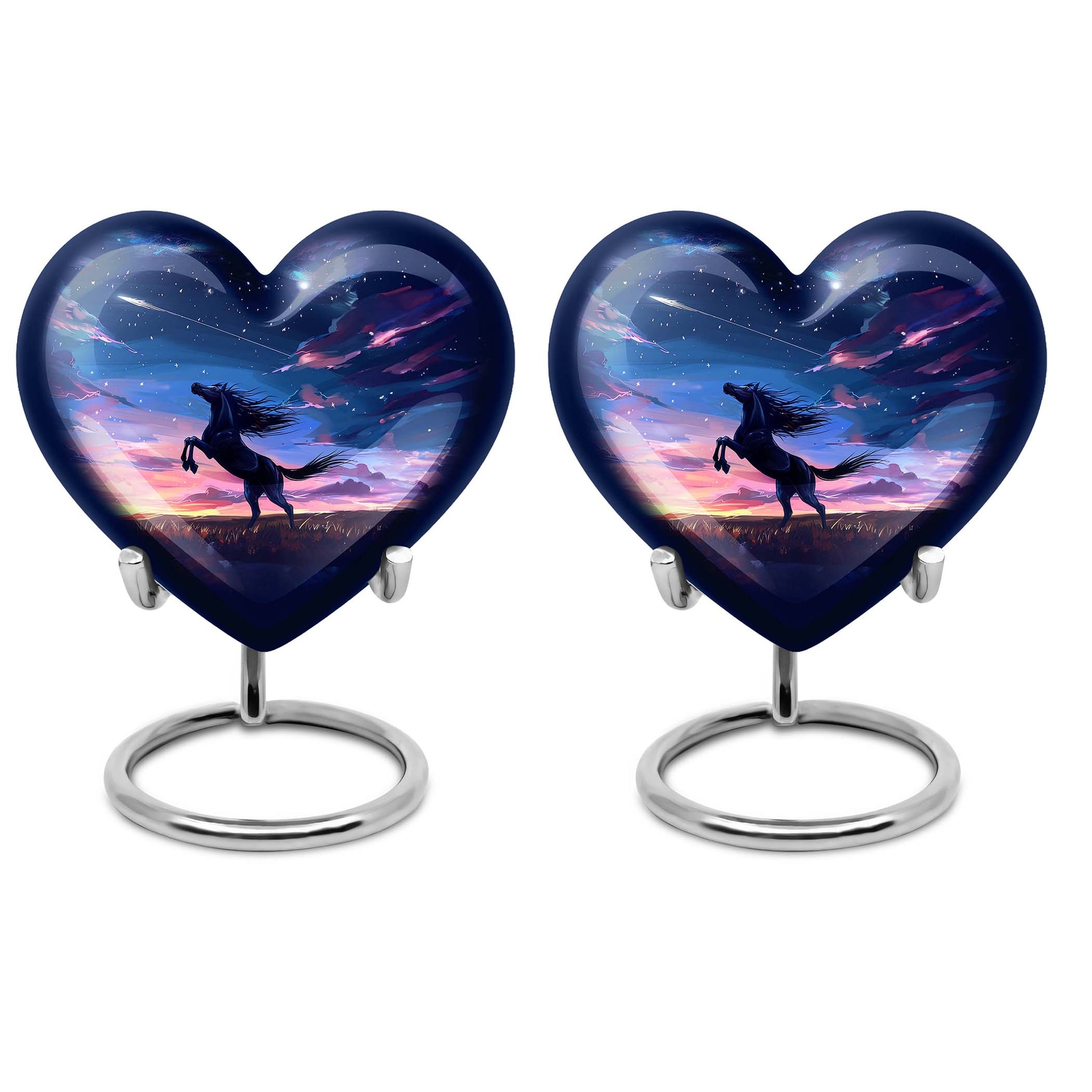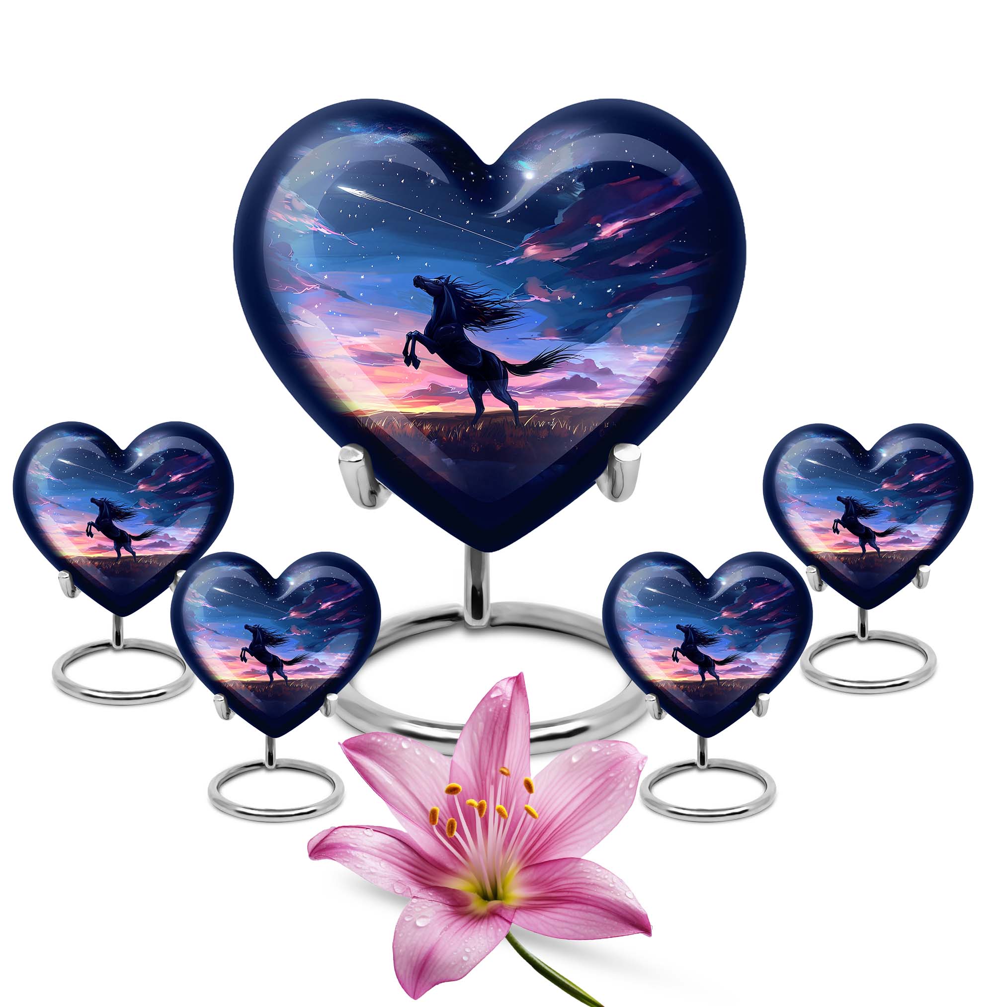 Honor your loved ones with the Abstract-themed Large Horse Urn, a tragic yet touching tribute to the reverence of life and the serenity of death. Measuring 10-inch in stature, this memorial urn is conscientiously crafted from robust aluminium, weighing a modest 3.3 pounds. Its distinct heart design, excluding its inherent charm, manifests its capacity to harbor a generous 200 cubic inches of precious ashes. The funeral ash urn comes with a personalization option, permitting you to etch the names of your dearly departed, further sealing their memory in this mortal realm. As part of the package, a soft velvet pouch is made available, aiding in the safe storage of the remaining ashes and ensuring their respectful containment. This breathtaking horse urn emphasizes on both functionality and sentiment, stepping away from conventional memorial urns. Ideal for mom's ashes, this heartfelt keepsake makes a stoic statement. Unique and profound, it transcends the usual metal urns for adult human ashes, embracing loss with dignity and grace.
