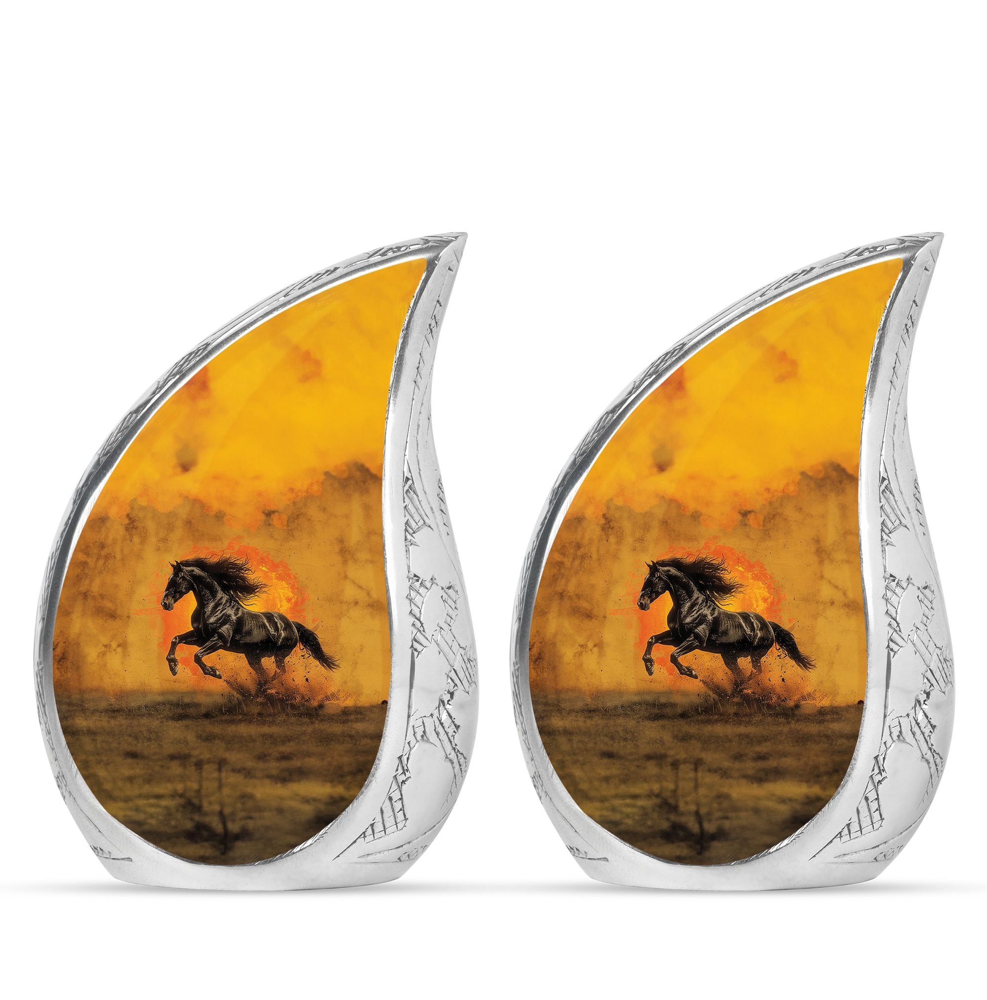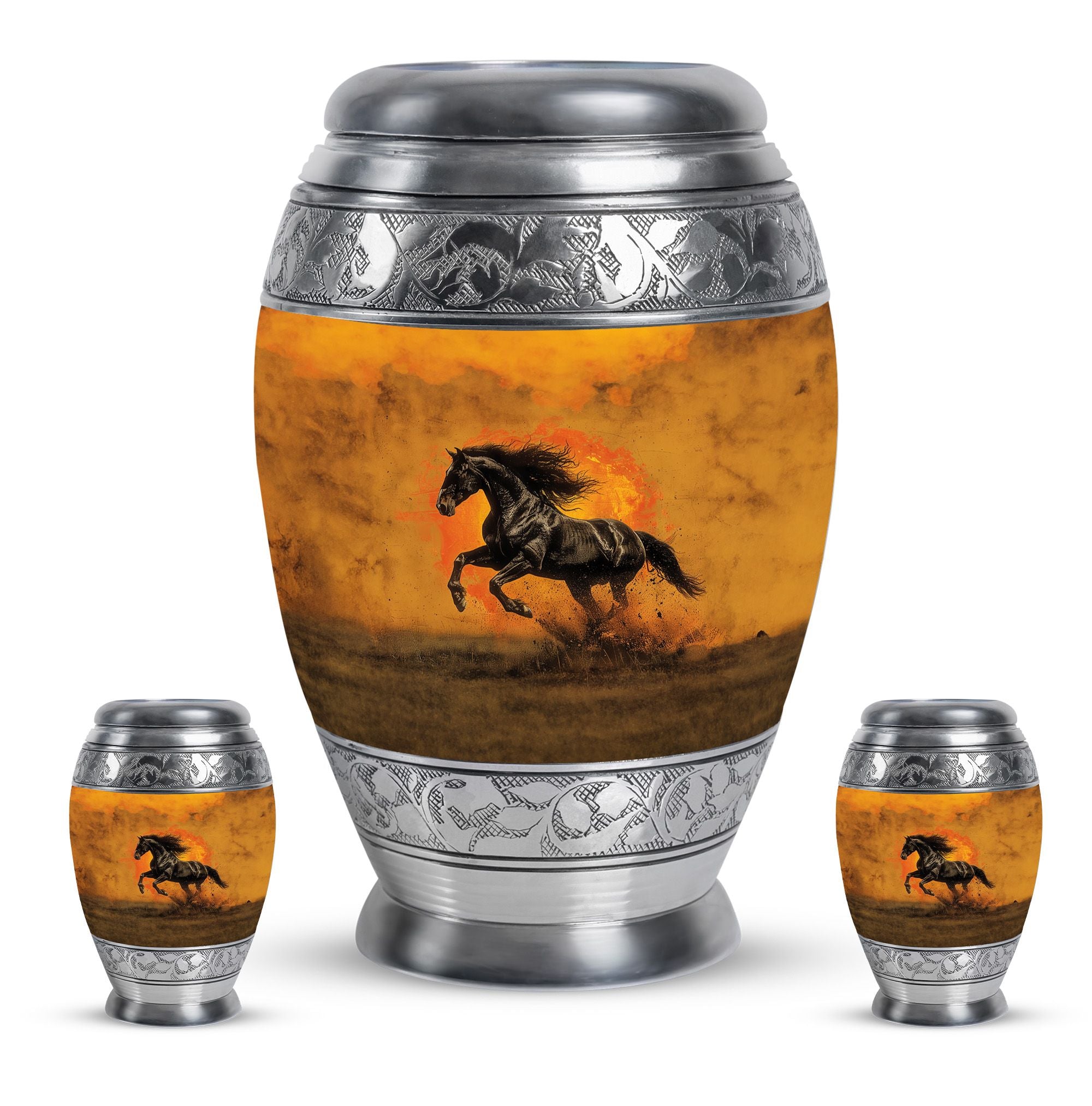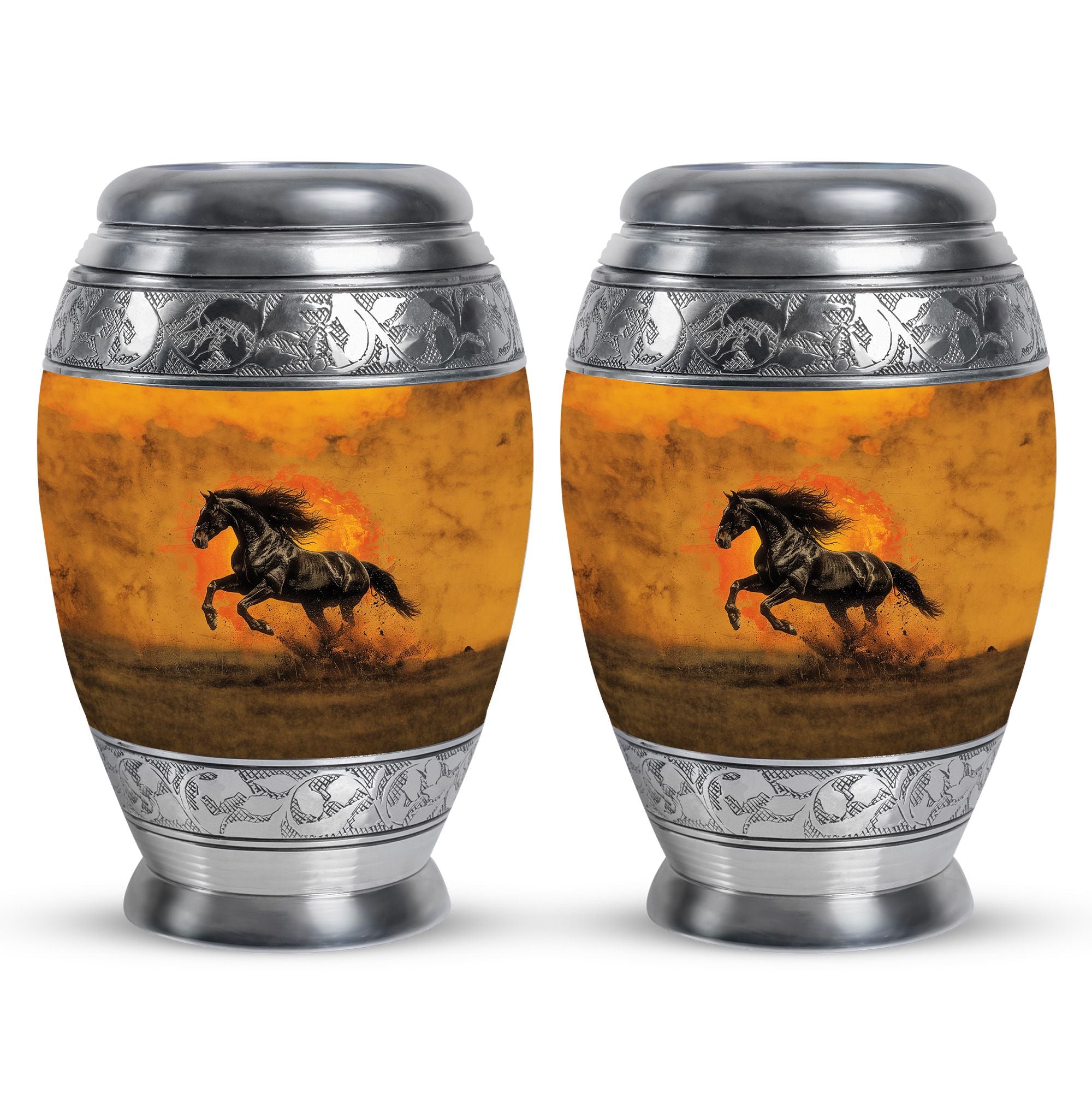 Crafted from durable aluminium, this urn features a striking black horse design with vibrant orange accents, combining elegance and lasting quality. Ideal as small urn for human ashes keepsake, mini urns for decor, or keepsake small urns, it offers a secure screw-top lid for safe storage. Its versatile design also makes it suitable as memorial keepsakes for ashes, small urns for ashes adult female, or mini urns for sharing ashes, keeping memories close to heart.