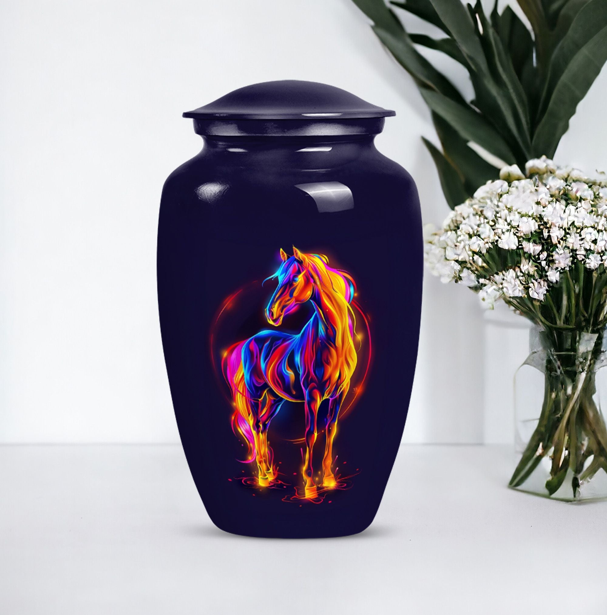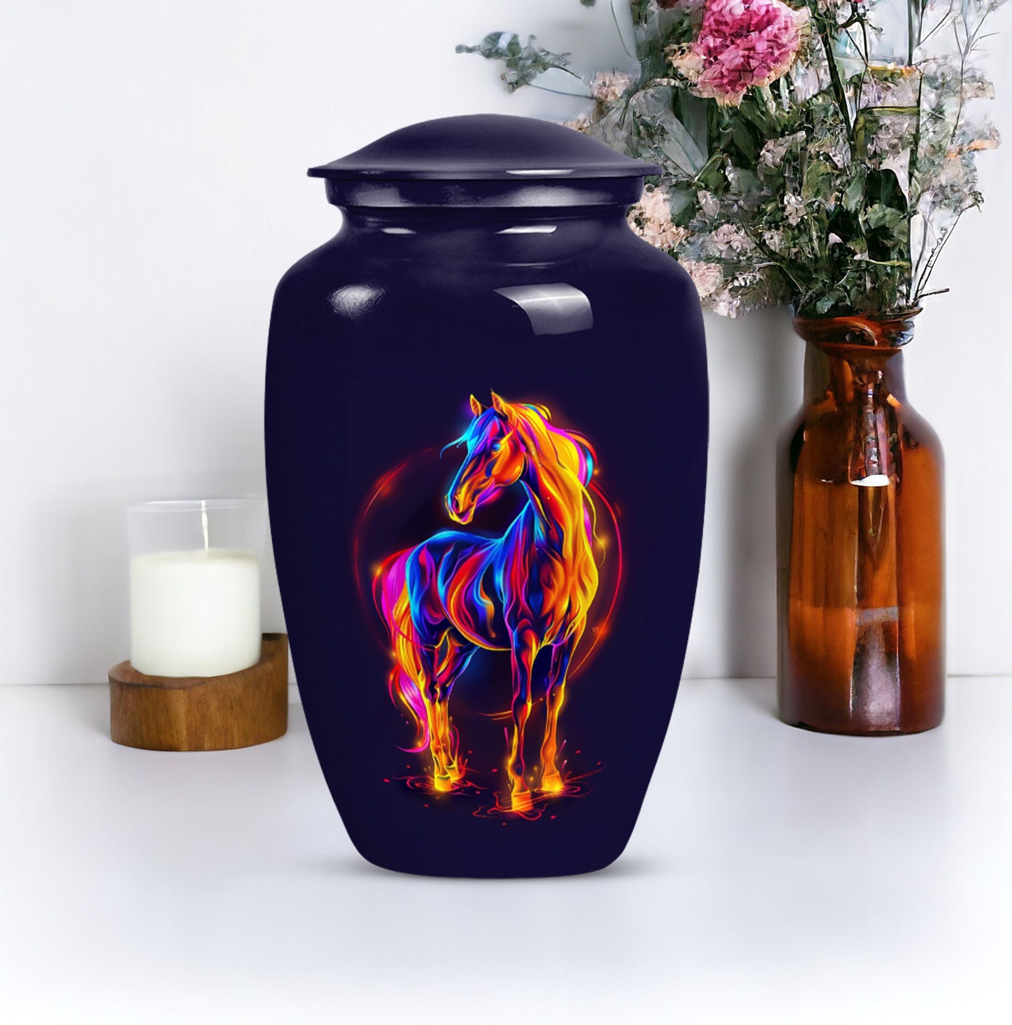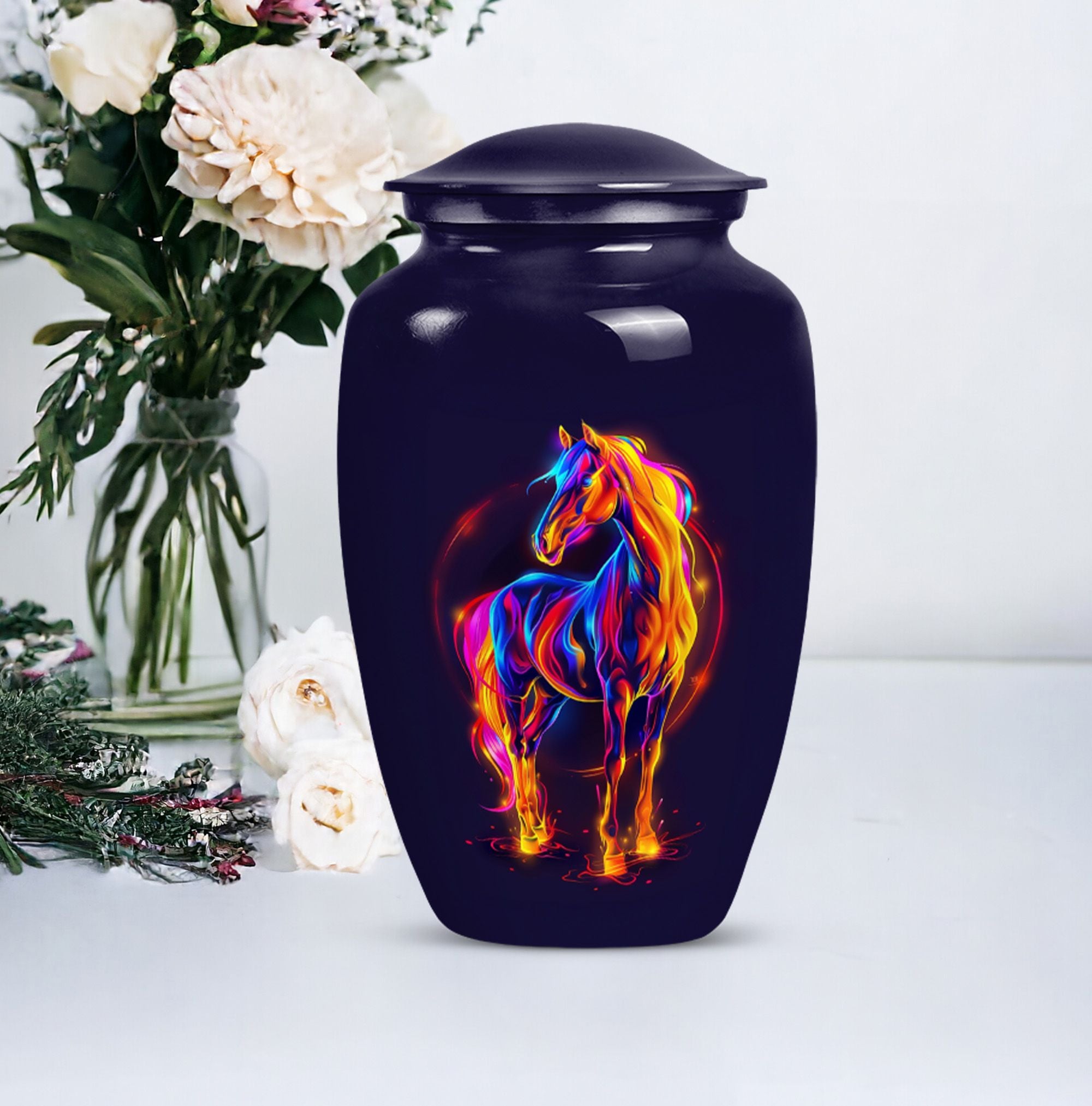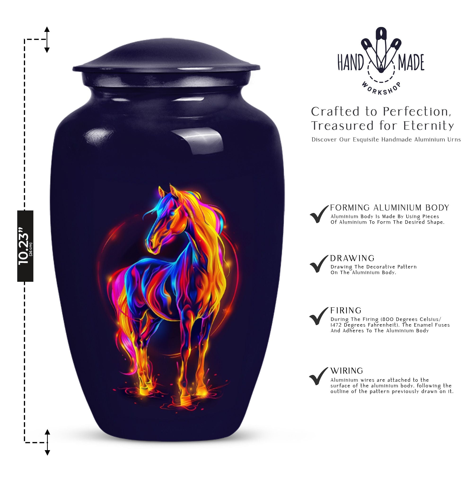 A stellar tribute to one's unbounded spirit, this Horse Urn strikes a balance between solemnity and elegance. Constructed from sturdy aluminium, this memorial urn for men stands proudly at 10 inches with a substantial weight of 3.3 pounds. Its size and bold Abstract theme make a demanding presence to honor your loved ones. The Large Urns variant of our collection, it can comfortably hold up to 200 cubic inches of ashes. The robust build ensures longevity, making it a fitting homage that stands the test of time. This urn comes with a gentle velvet pouch, thoughtfully provided for safe containment of the ashes. For a more intimate touch, the urn offers customization options. Personalize it with engraved names, imbuing a sense of identity and personal belonging. Its utilitarian design and thematic resonance make it an appealing choice for both men and women. The term 'cremation urn' does not adequately convey the unique charm and significance this horse-shaped urn promises to offer. More than just a metal urn for human ashes, it serves as a token of remembrance, an enduring emblem of love and appreciation.