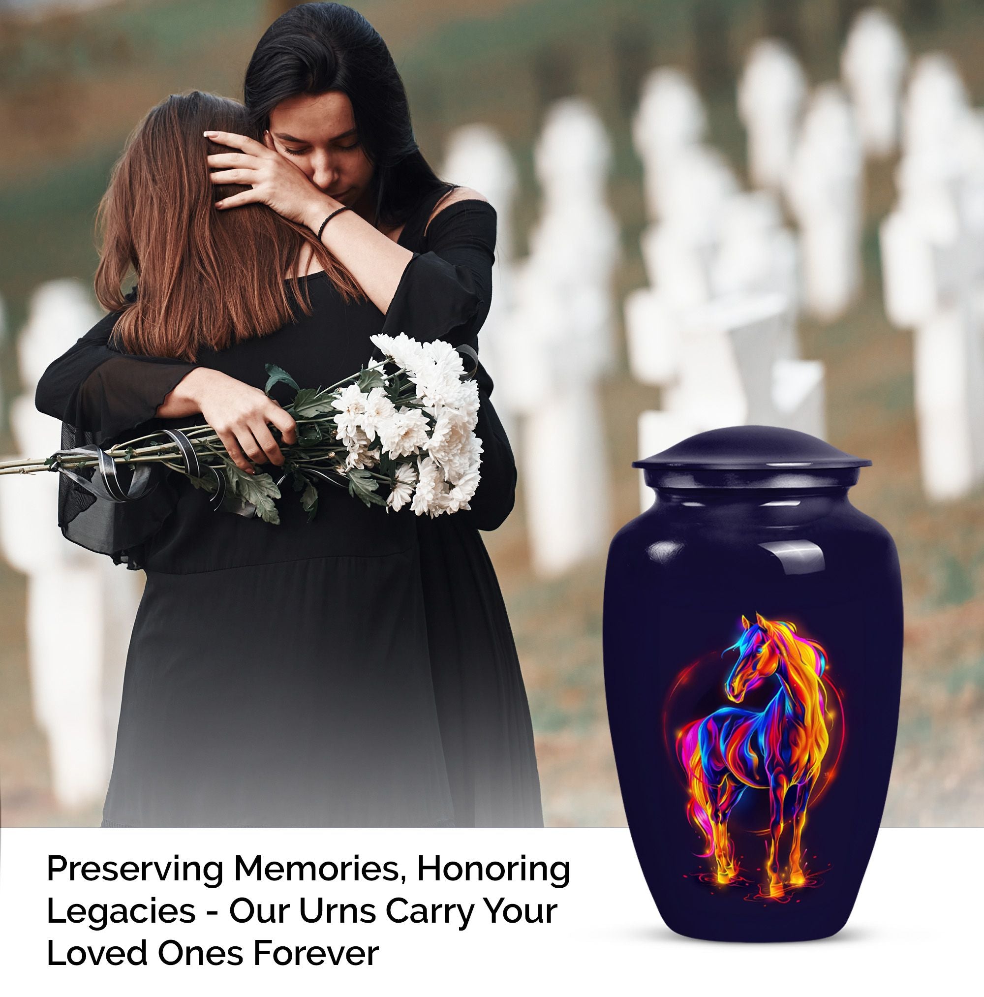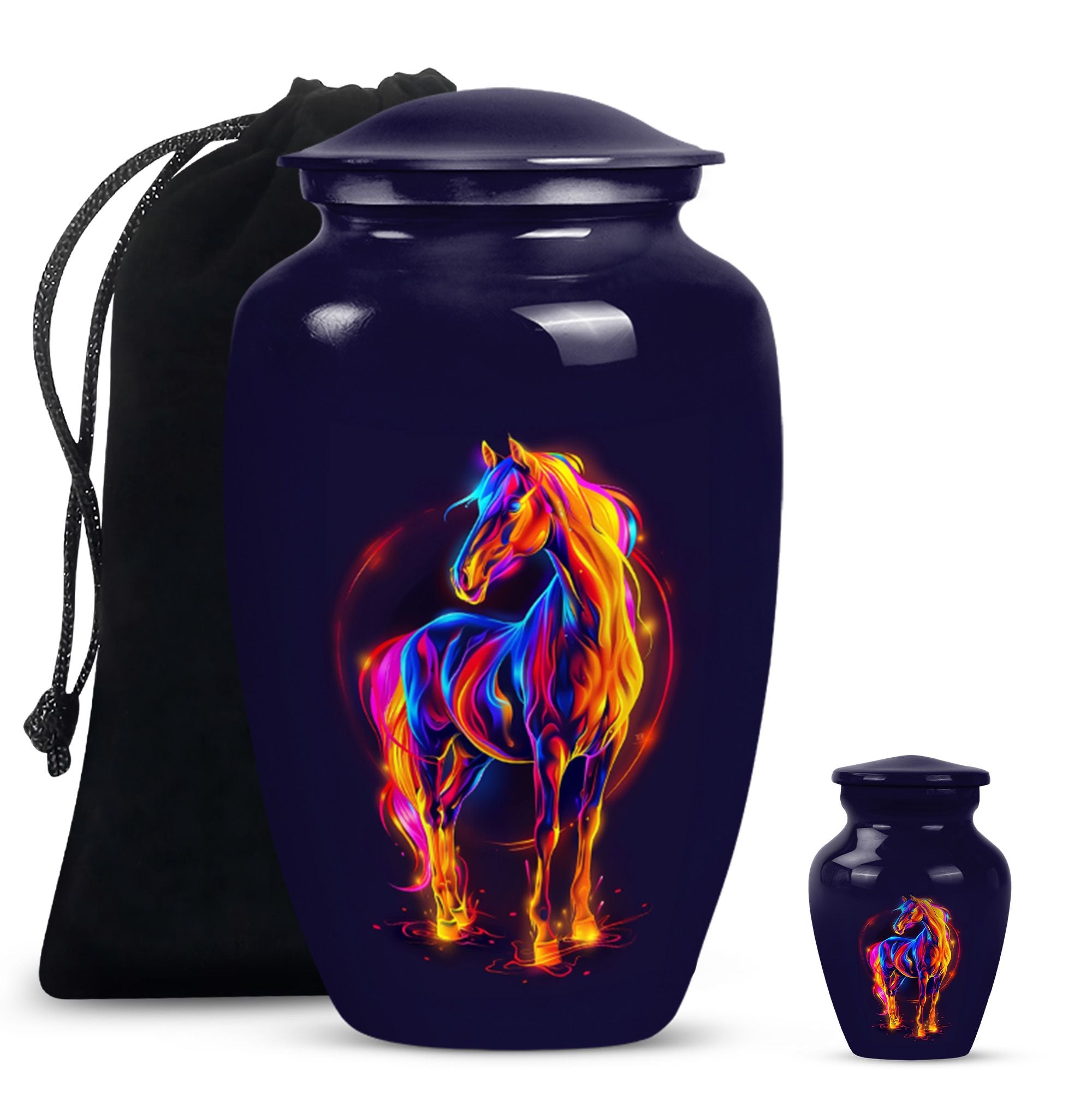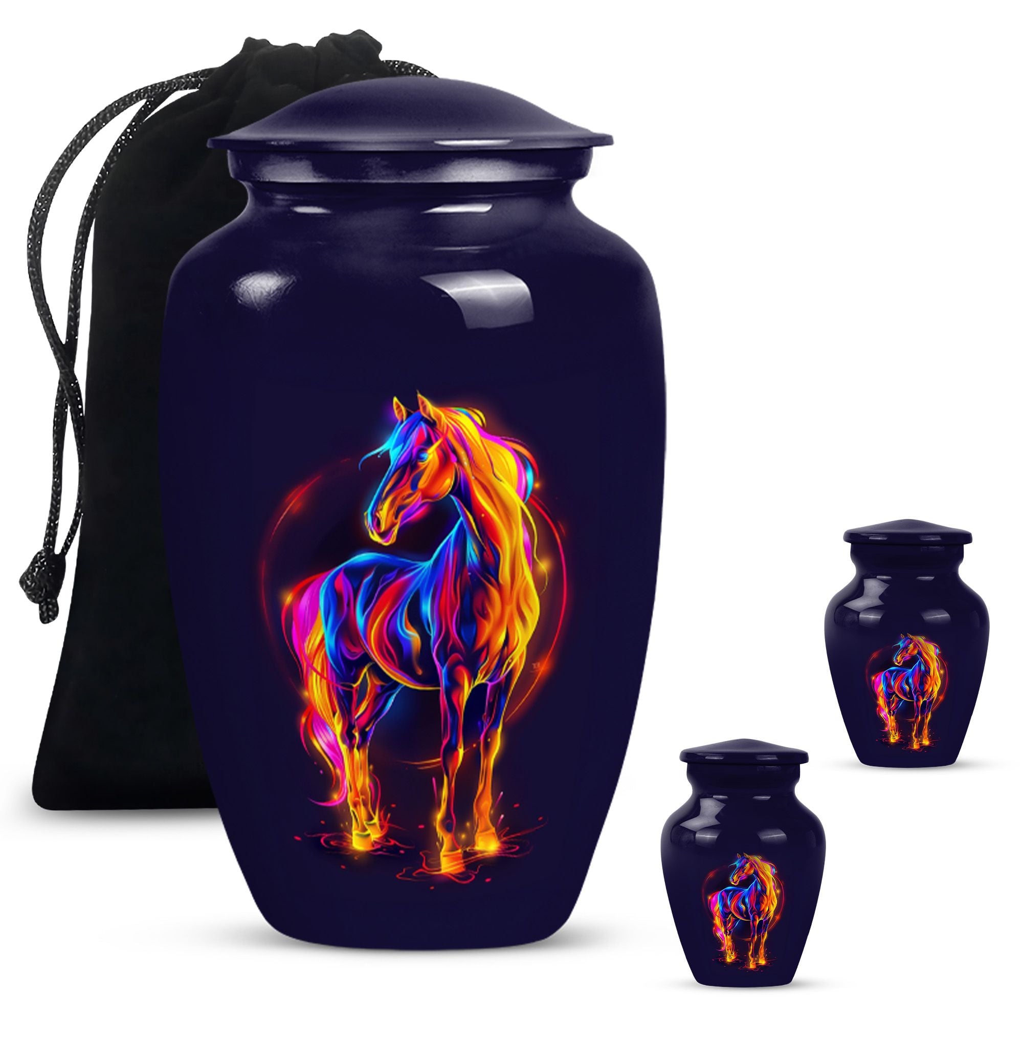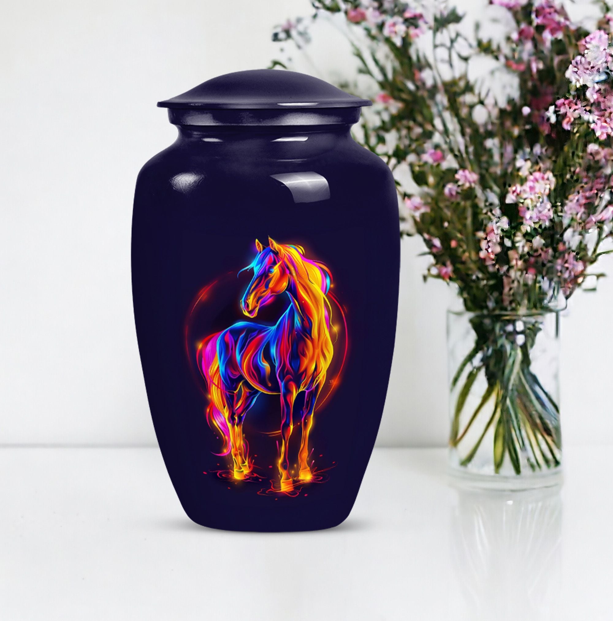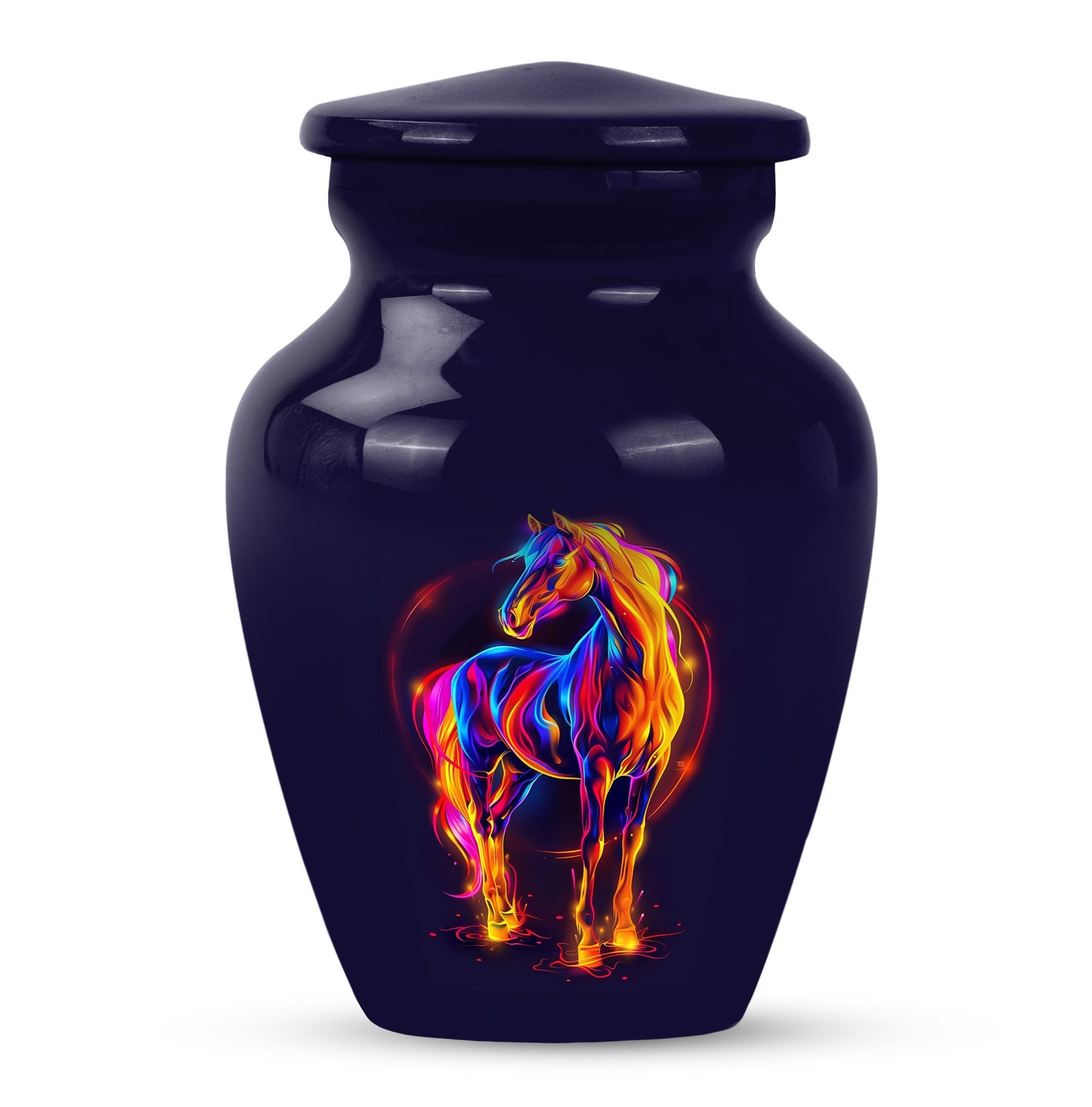 A stellar tribute to one's unbounded spirit, this Horse Urn strikes a balance between solemnity and elegance. Constructed from sturdy aluminium, this memorial urn for men stands proudly at 10 inches with a substantial weight of 3.3 pounds. Its size and bold Abstract theme make a demanding presence to honor your loved ones. The Large Urns variant of our collection, it can comfortably hold up to 200 cubic inches of ashes. The robust build ensures longevity, making it a fitting homage that stands the test of time. This urn comes with a gentle velvet pouch, thoughtfully provided for safe containment of the ashes. For a more intimate touch, the urn offers customization options. Personalize it with engraved names, imbuing a sense of identity and personal belonging. Its utilitarian design and thematic resonance make it an appealing choice for both men and women. The term 'cremation urn' does not adequately convey the unique charm and significance this horse-shaped urn promises to offer. More than just a metal urn for human ashes, it serves as a token of remembrance, an enduring emblem of love and appreciation.