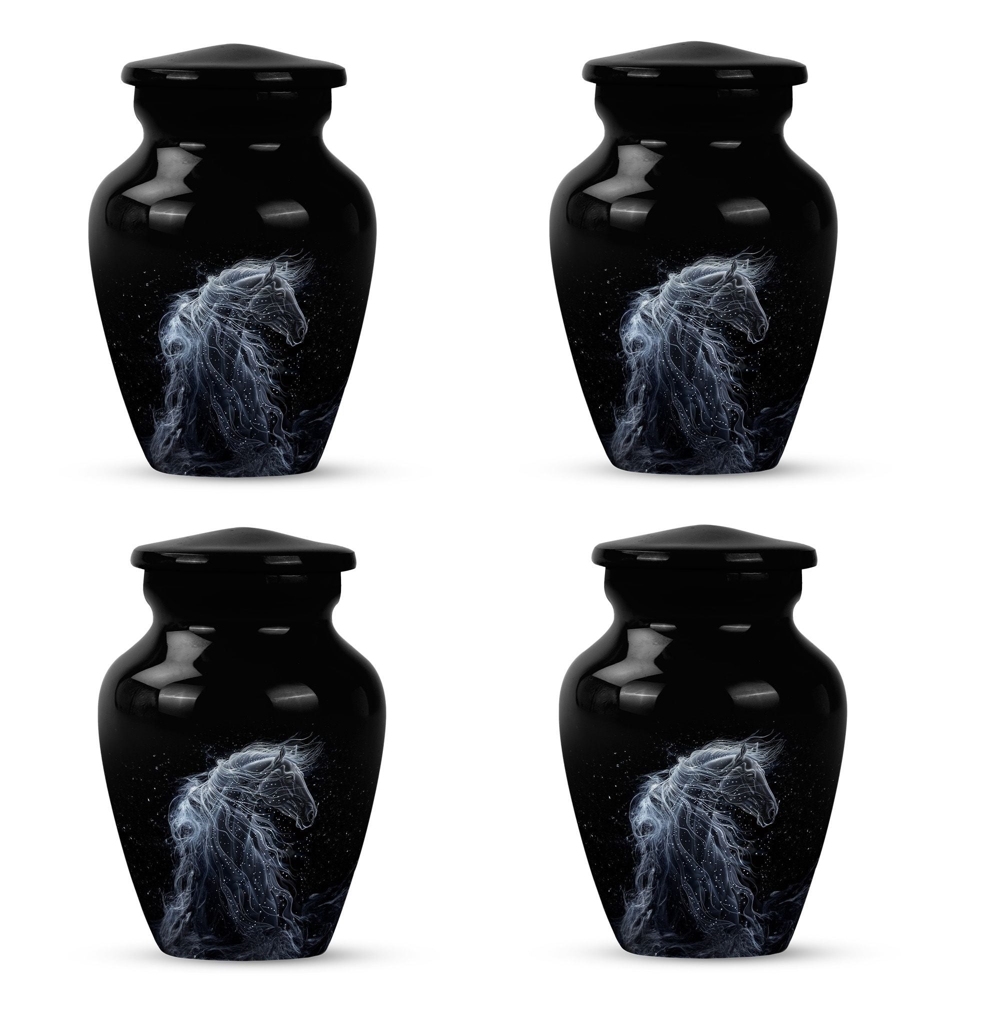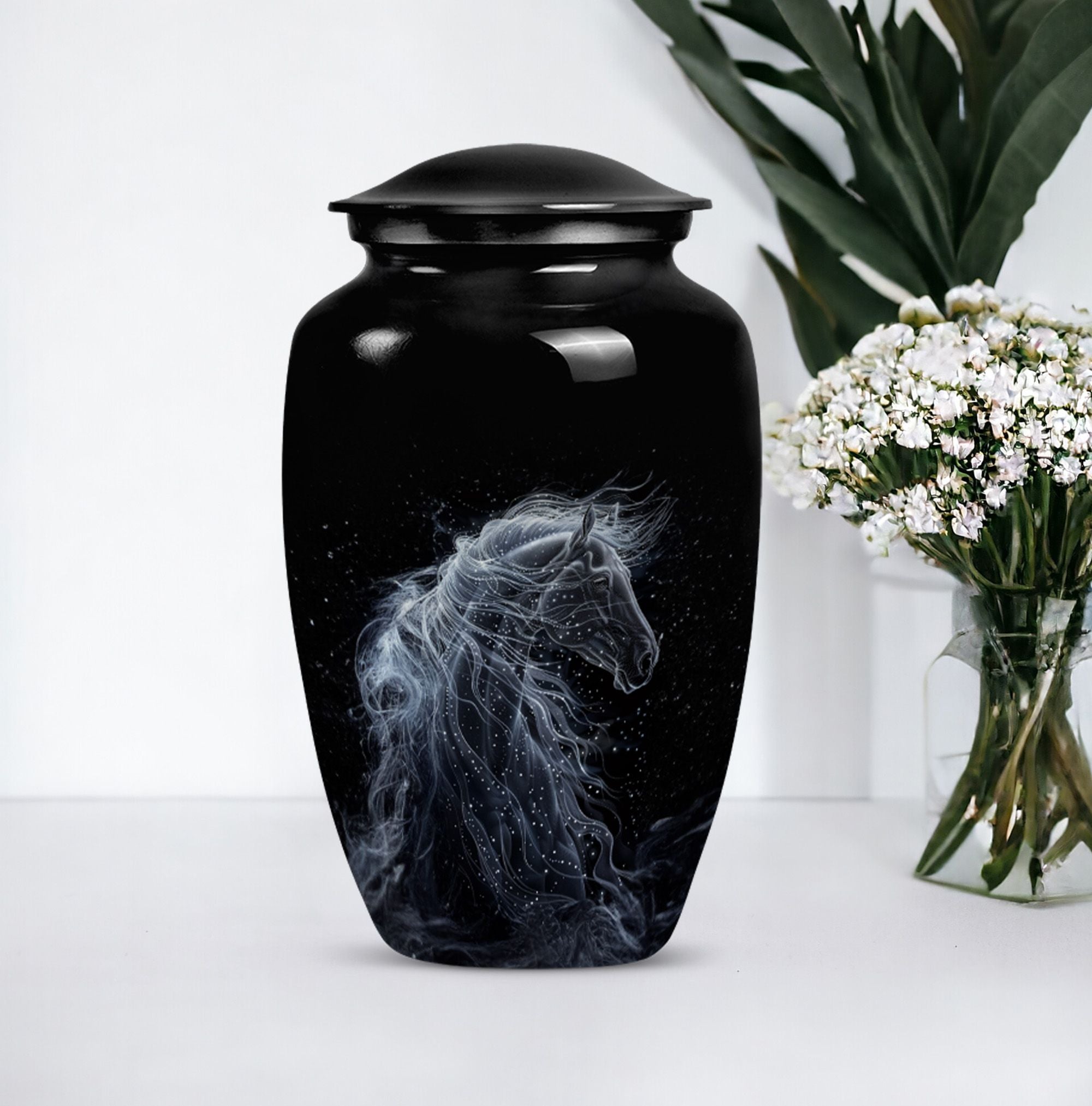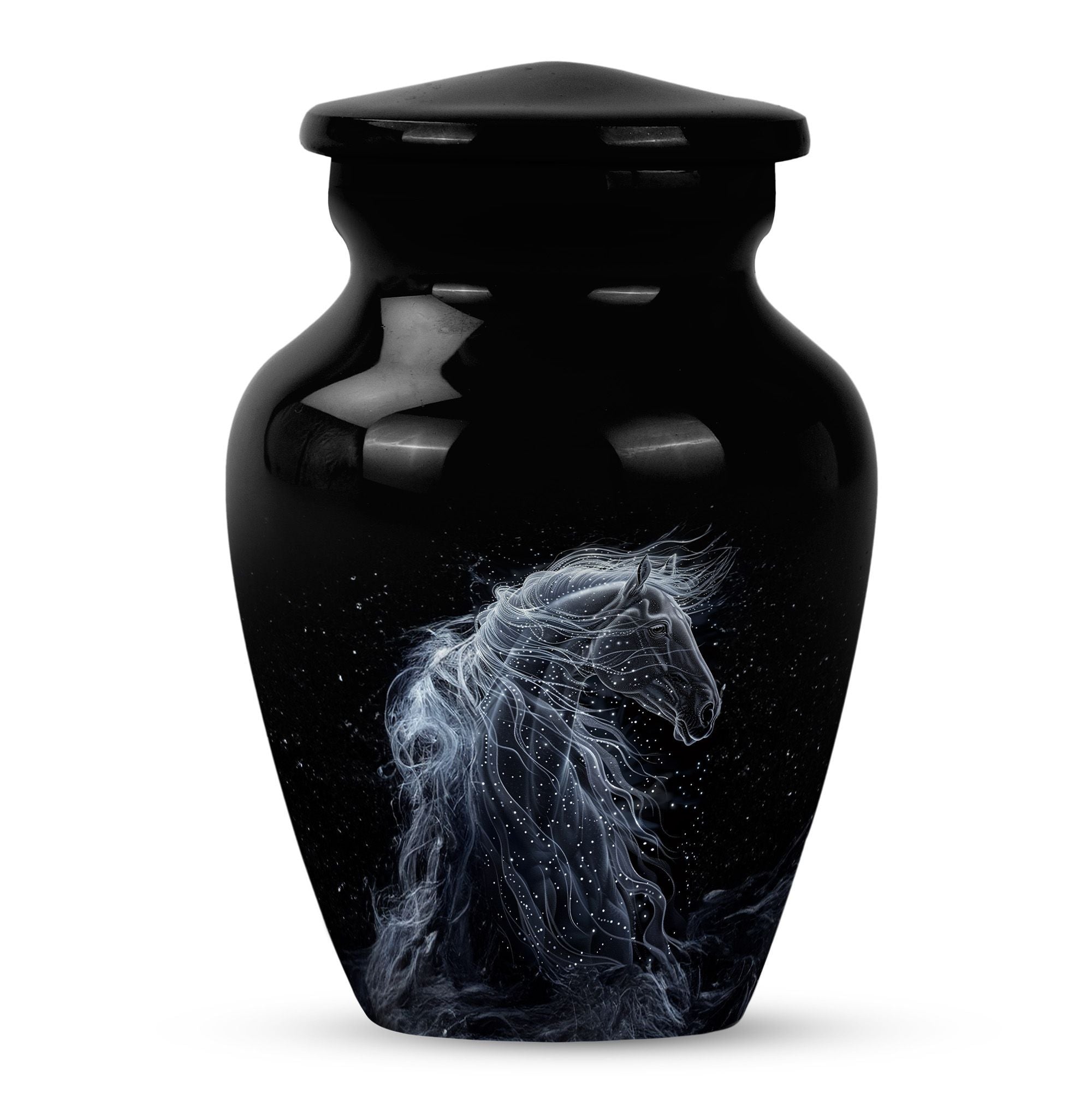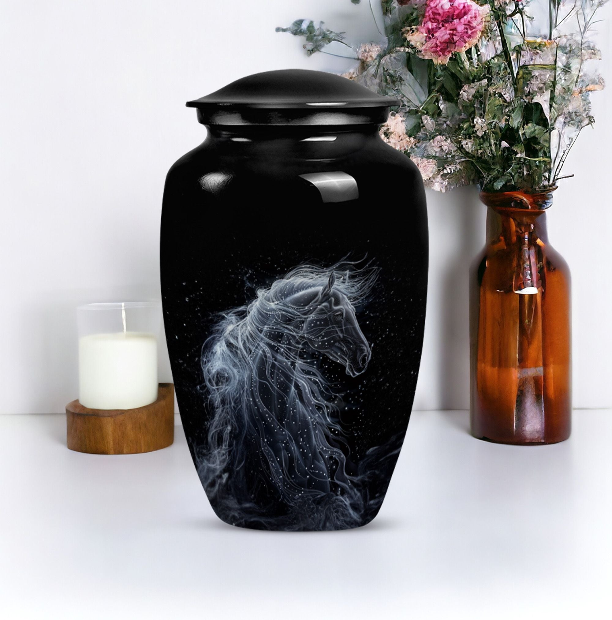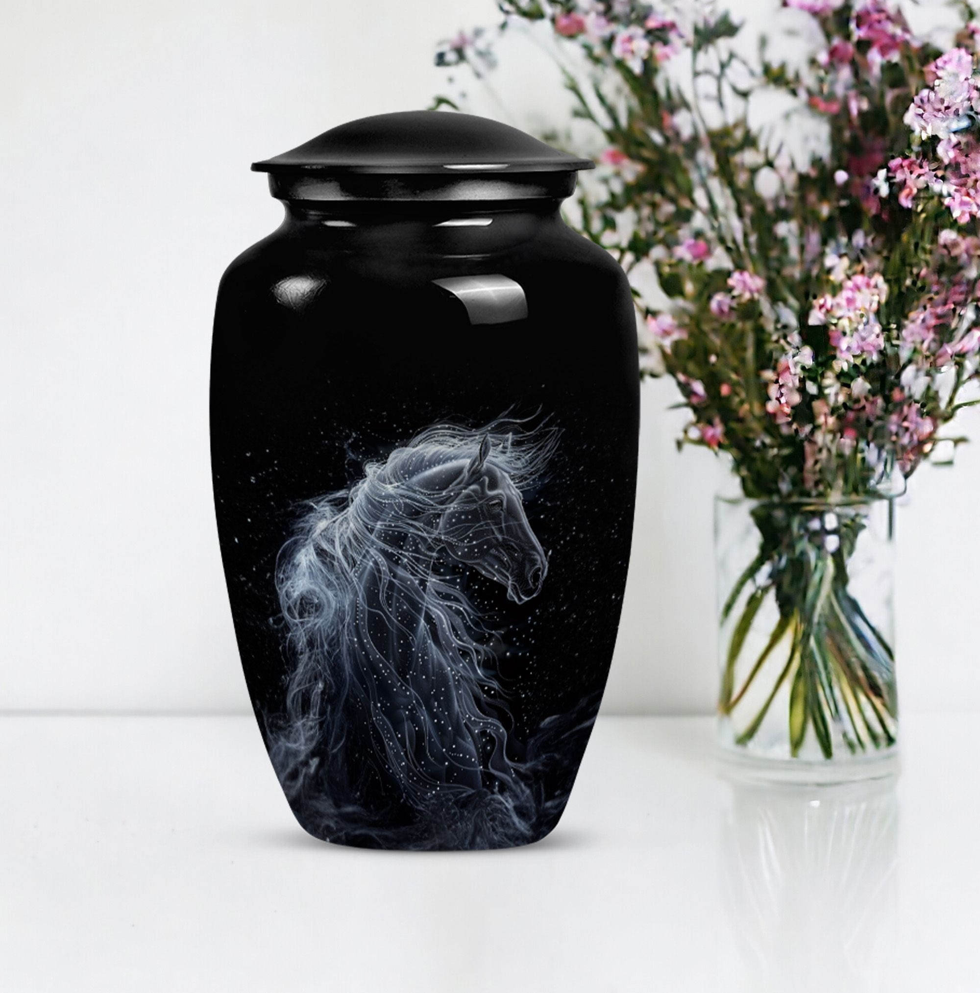 Discover a unique way to honor the memory of a loved one with our Horse Urn. Standing 10 inches tall and able to contain 200 cubic inches, this funeral urn for ashes is created for both women and men yearning for a distinctive method to safeguard the ashes of their beloved. Meticulously crafted from top-quality aluminium, this urn boasts an abstract theme, adding a layer of elegance and sophistication. With the ability to personalize with engraved names, it truly adds a personal touch to your memorial ceremony supplies. The urn comes complete with a velvet pouch, providing a dignified containment solution for the ashes. Weighing in at a manageable 3.3 pounds, this large urn is perfect for both burial urn needs or to serve as a poignant, respectful centerpiece in your home. A memorably lustrous, stylish, yet understated tribute to your cherished one. Search no further for 'urn for a mom' or 'urns for the adult male,' our classically designed Horse Urn is both a loving repository and a testament of a life well-lived.