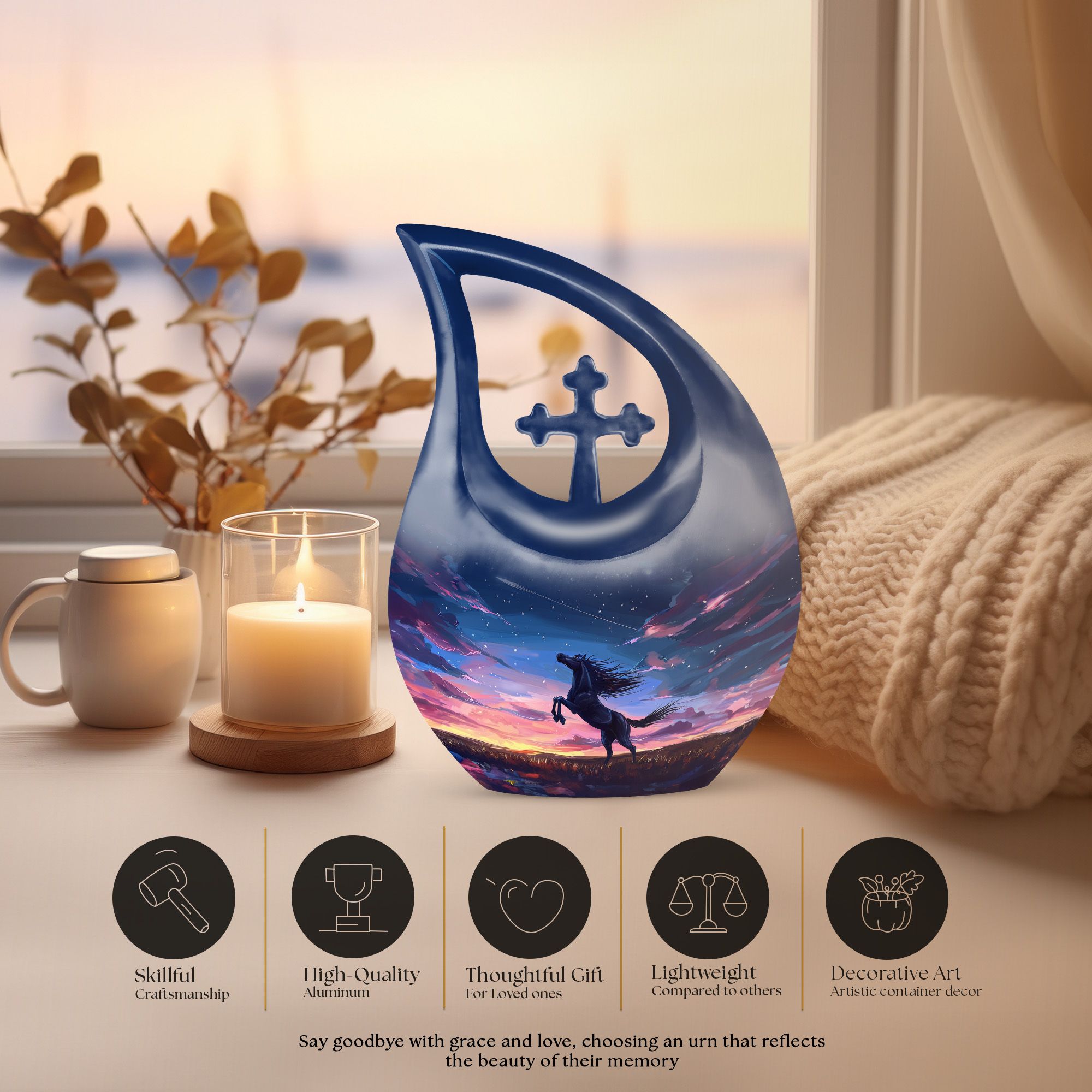 Cherish the memory of your loved one with this exquisitely crafted Horse Urn, designed specially as Large Urns. This unique Horse themed, 10-inch urn resonates with the free spirit of a galloping steed. Weighing 3.3 pounds, this aluminium urn is sturdy and lasting. Its cross drop detail is an elegant touch, symbolizing faith, courage, and eternal life. The urn offers a capacity of 200 cubic inches, sufficient to hold the ashes of adults. Along with the urn, the package includes a soft velvet pouch for safe retention of the ash. If you wish, choose to personalize this unique piece with engraved names as a special tribute. This undoubtedly makes our Horse Urn a standout among other memorial urns, companion urns for adults, or even box urns for human ashes. Rest assured, it's an authentic way to honor your loved one's journey, making it a valuable addition to your memorial ceremony supplies.