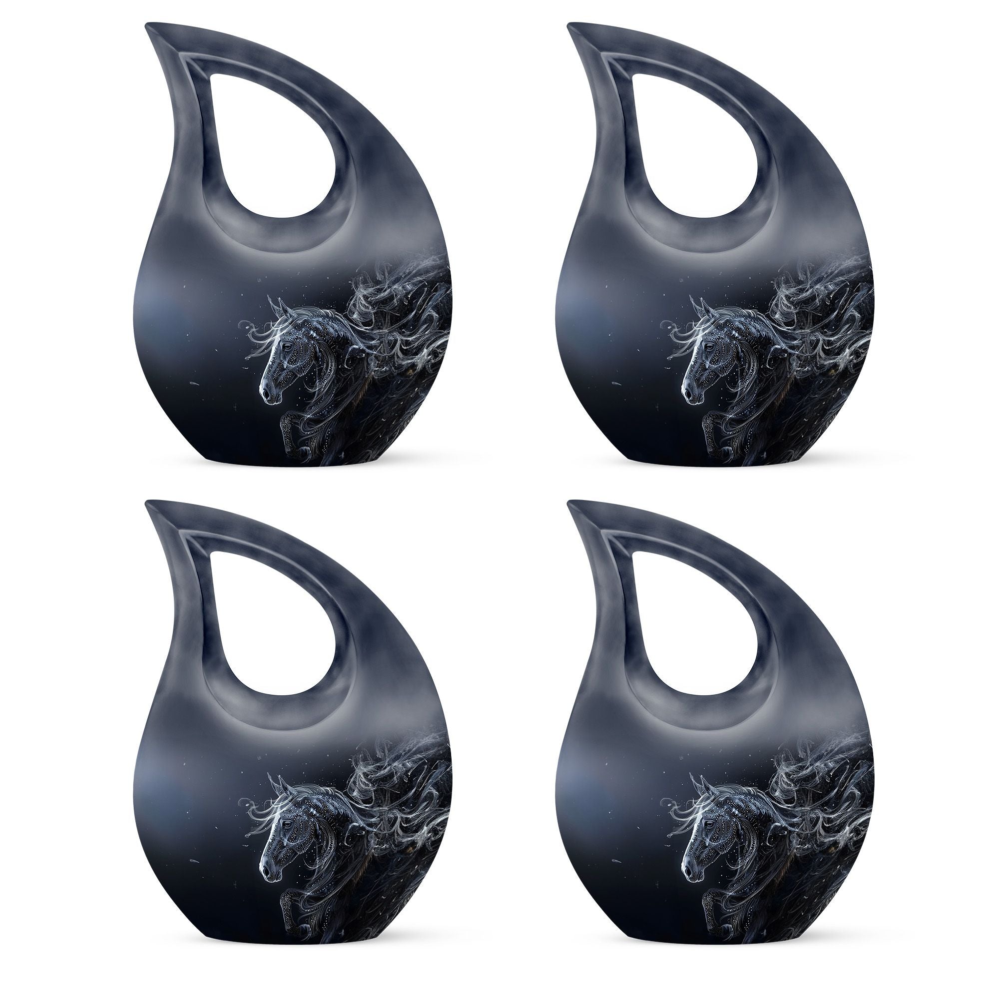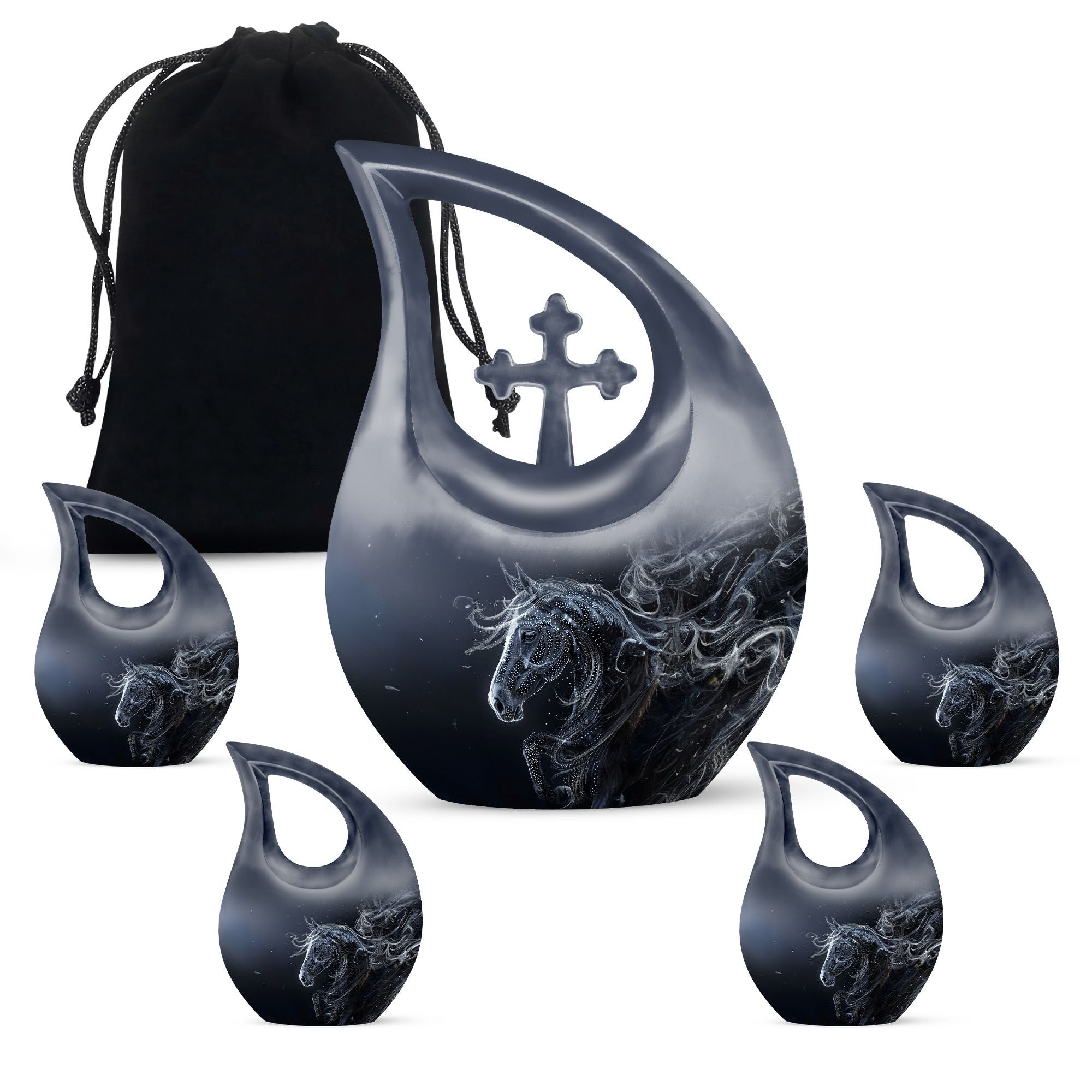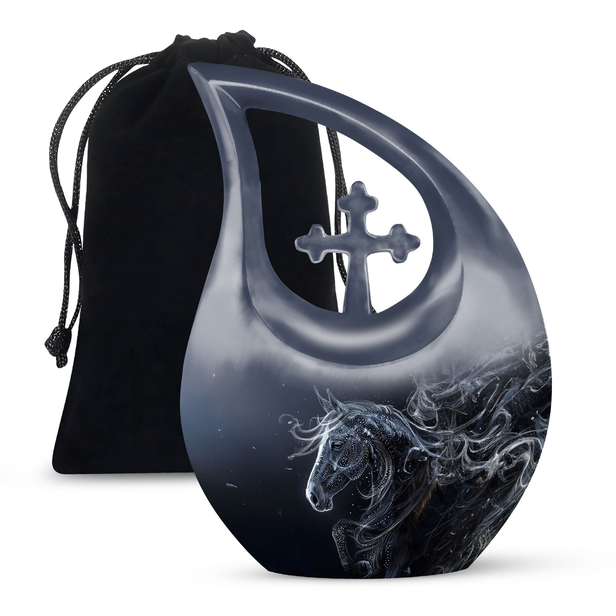 Create a lasting tribute to your beloved with our Horse Urn, a superior choice amongst Large Cremation Urns. This 10-inch memorial urn comes in an inspiring 'Cross Drop' theme, beautifully infusing spirituality and nature. Skilfully crafted from high-quality Aluminium, the urn weighs 3.3 pounds, with a sizeable capacity to hold up to 200 cubic inches. We offer you an opportunity to further honor your loved one by personalizing the urn with engraved names, transforming it into a profoundly meaningful keepsake. Upon purchase, your urn is presented in a plush velvet pouch, safeguarding the precious ashes contained within. Explore more from our carefully curated collection of Medium Urns and Cremation Boxes, providing affordable heart-touching memorials. Whether you're looking for Affordable Urns or Ashes Urns For Sale, our collection provides thoughtful pieces to cherish your memories.