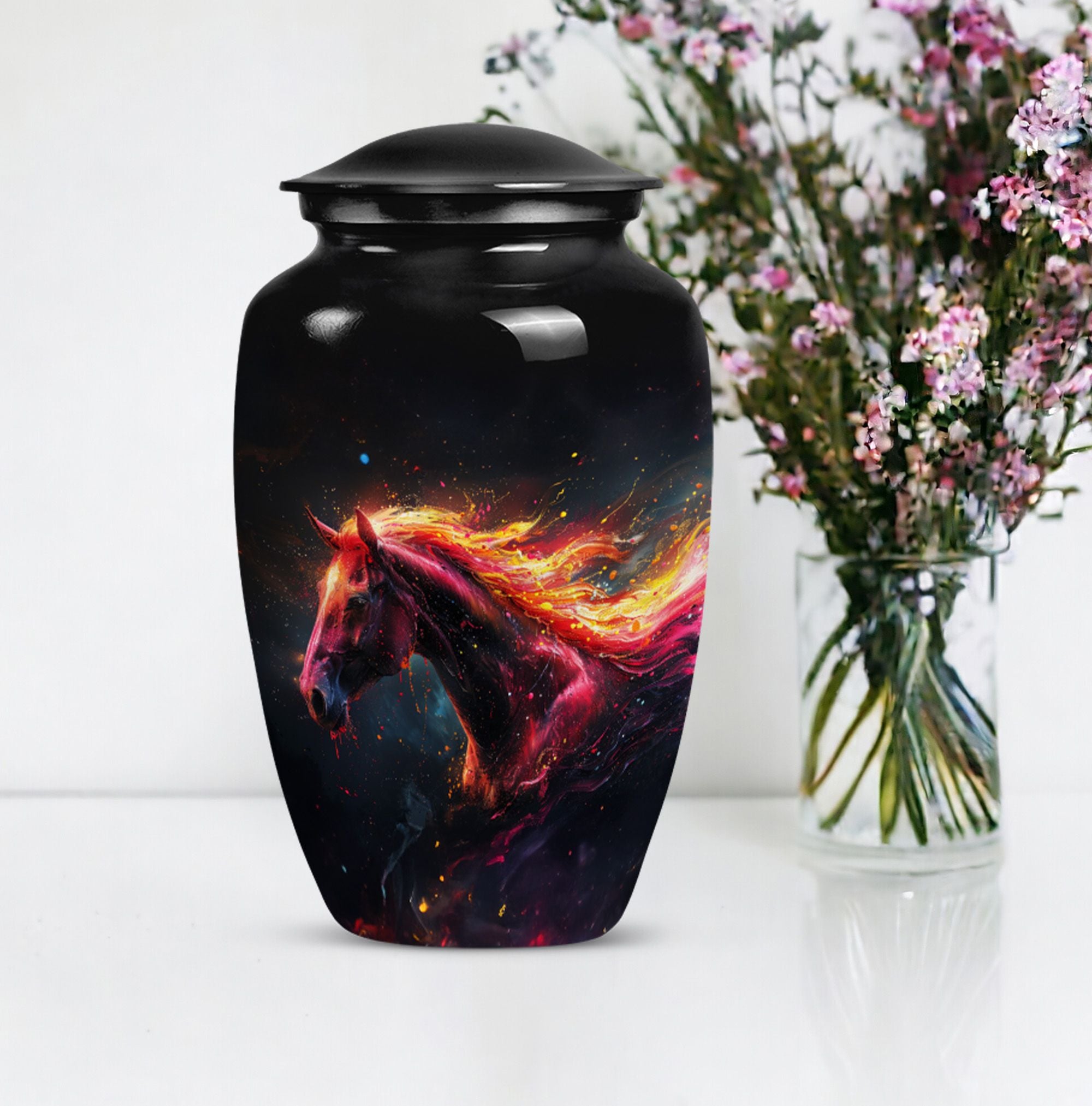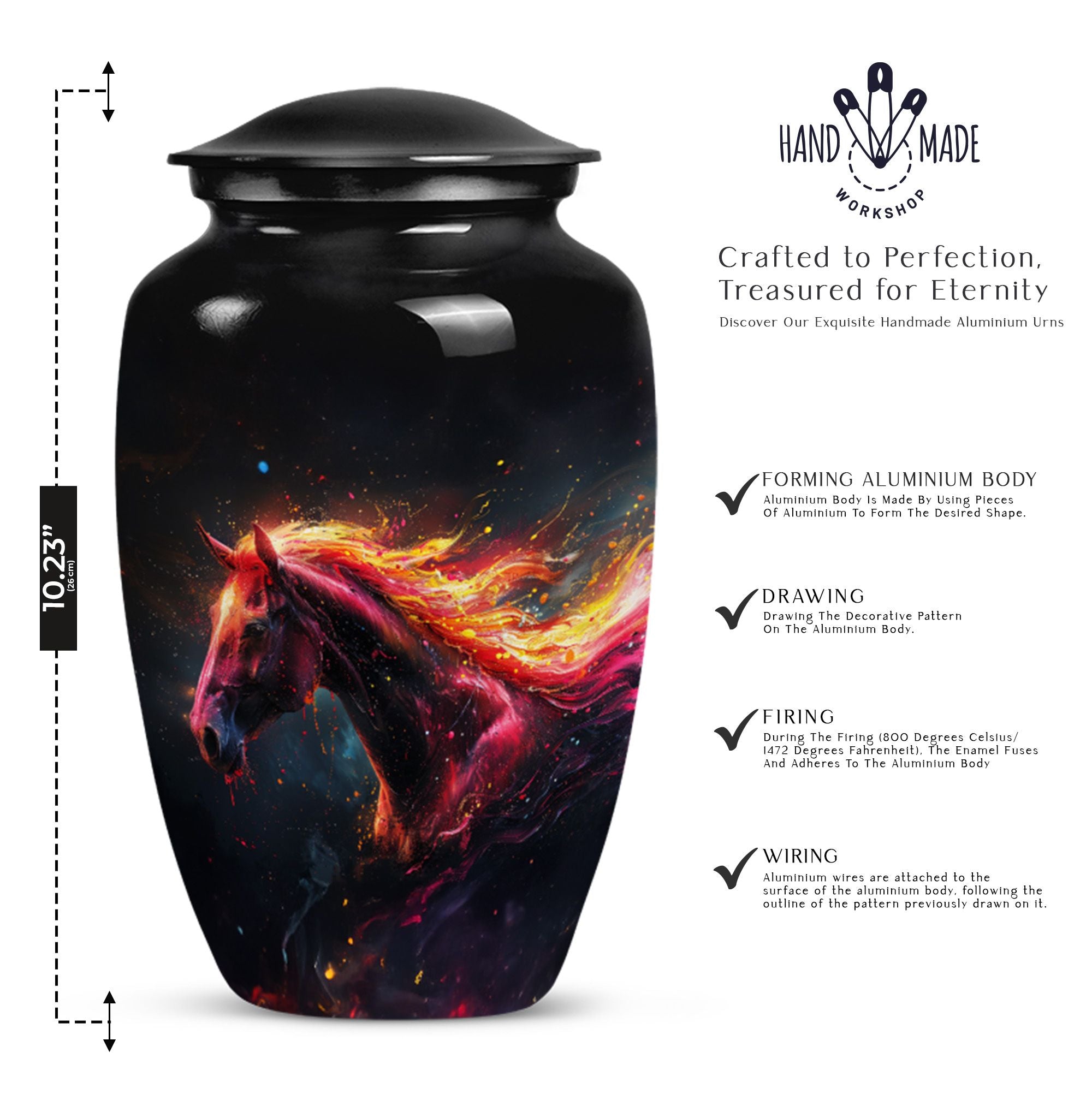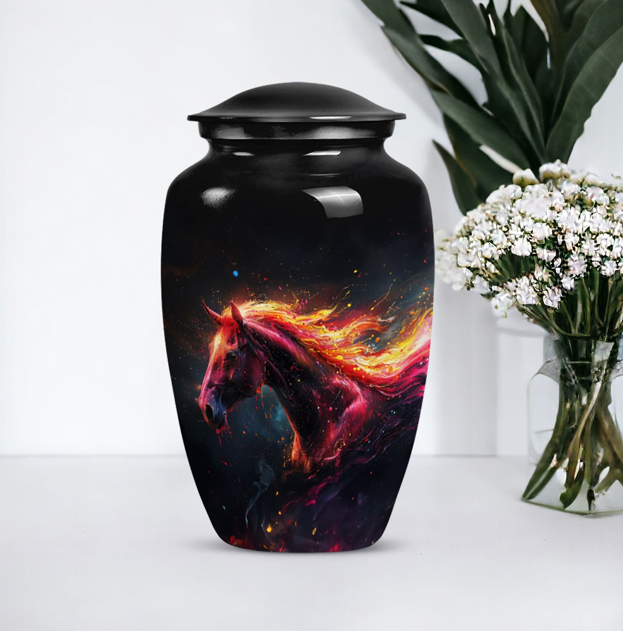 For those seeking closure and grandeur, this 10-inch Horse Urn is a touching and robust testament to your loved one's memories. Crafted from durable Aluminium, this 3.3 pound 'funeral urn for men ashes' provides a fitting vessel for honoring those who lived fully and loved with intensity. Boasting a capacity of 200 cubic inches, it impeccably infuses magnitude and meaning into the mourning process. The abstract theme adds a touch of timeless artistry, making it a stand-out among 'Large Urns.' Every package is complete with a tender velvet pouch to faithfully hold the ashes. We further offer personalized engravings to add a touch of individuality, ensuring every memory is immortalized caring. This 'cremation urn' strikes a sumptuous balance between mourning and celebration, making it an exceptional pick within our 'Adult Urns for Ashes' and 'Decorative Human Ashes Urns' collection. Unleash the freedom of loving memory with the Horse Urn.