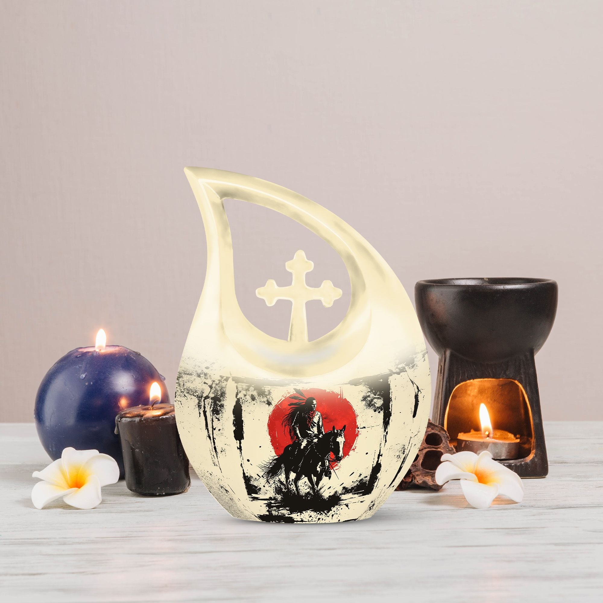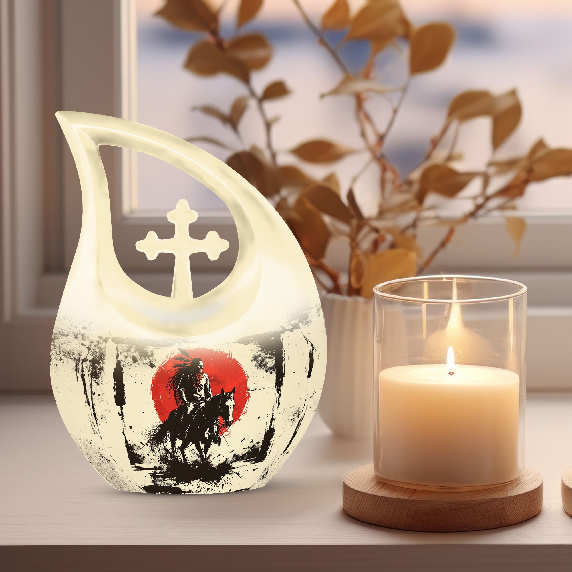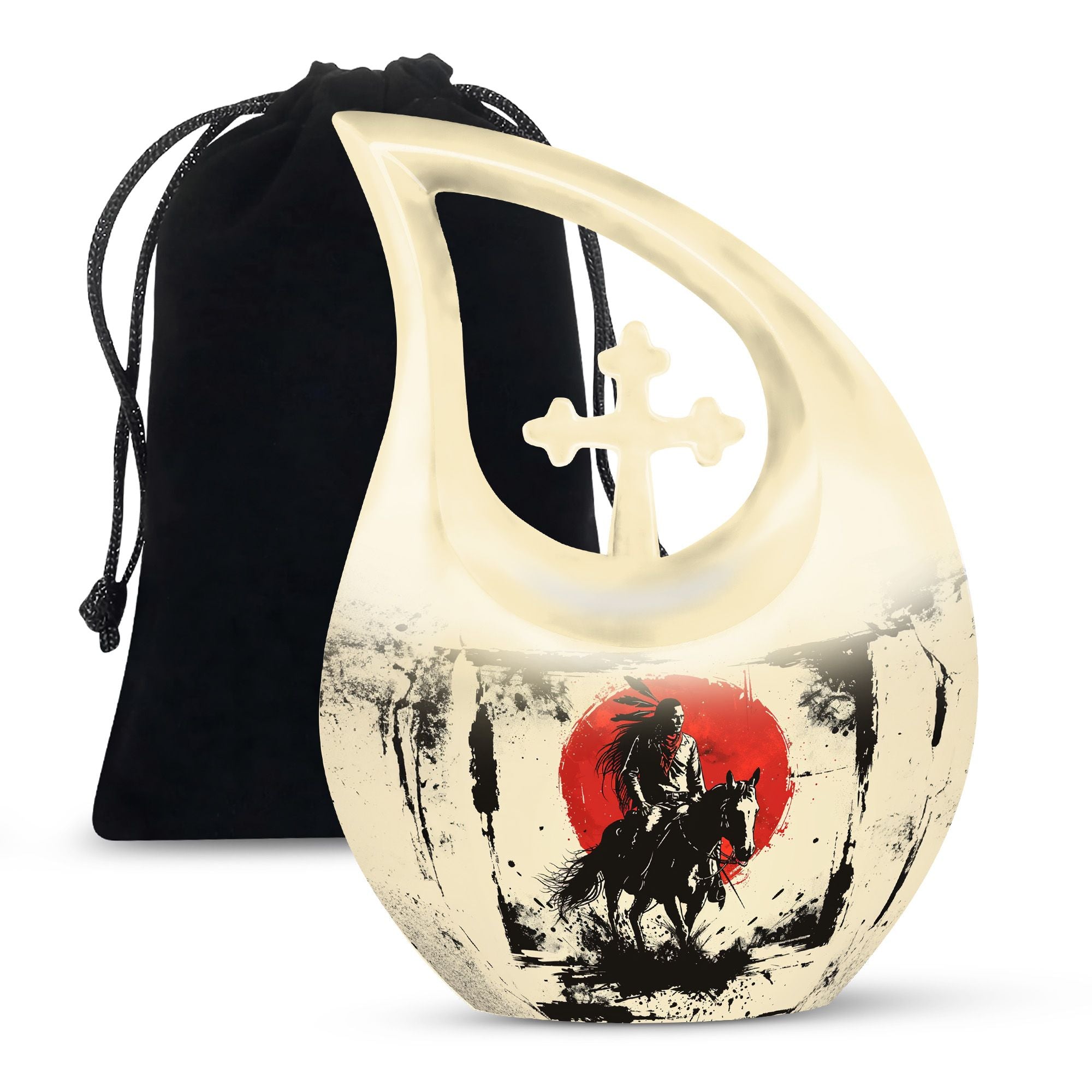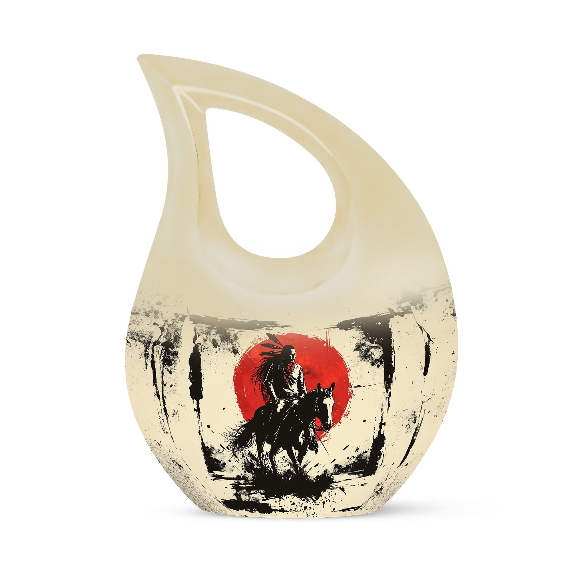 Honor the spirit and strength of your loved one with this Native American Horse Rider Cremation Urn, a meaningful tribute designed to offer peace and remembrance. Its powerful artwork makes it ideal for families seeking unique urns for human ashes or a beautifully detailed funeral ashes urn that reflects courage, heritage, and eternal connection.