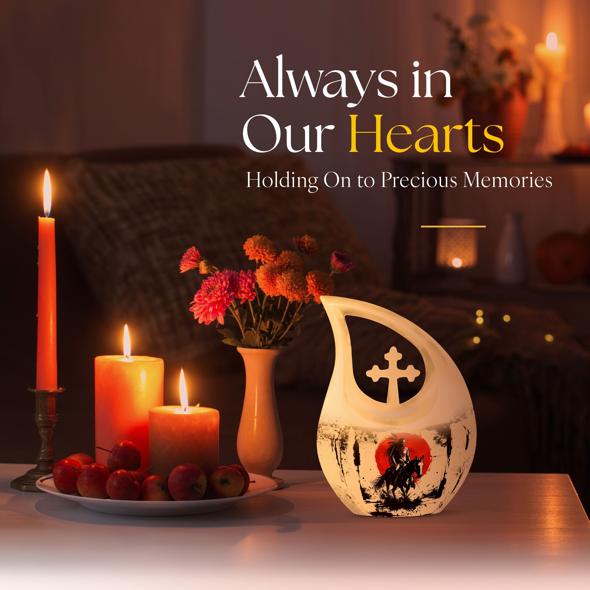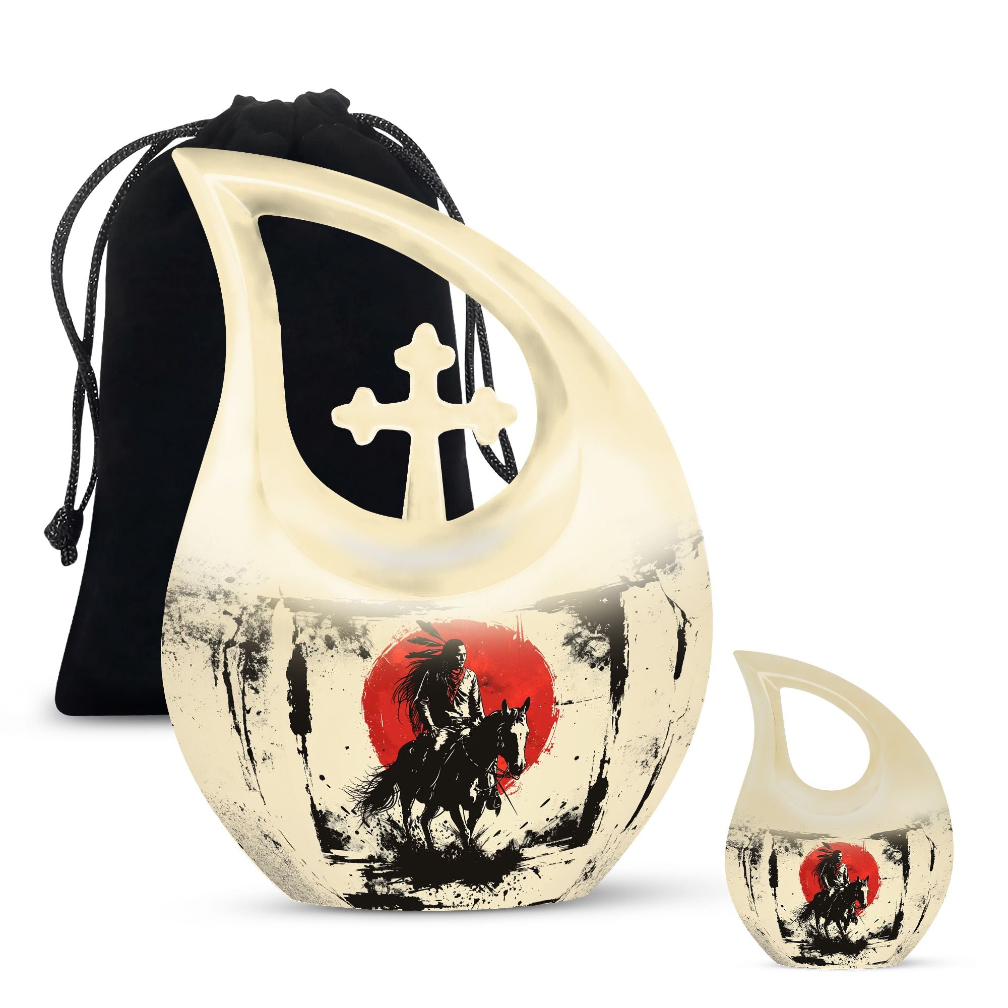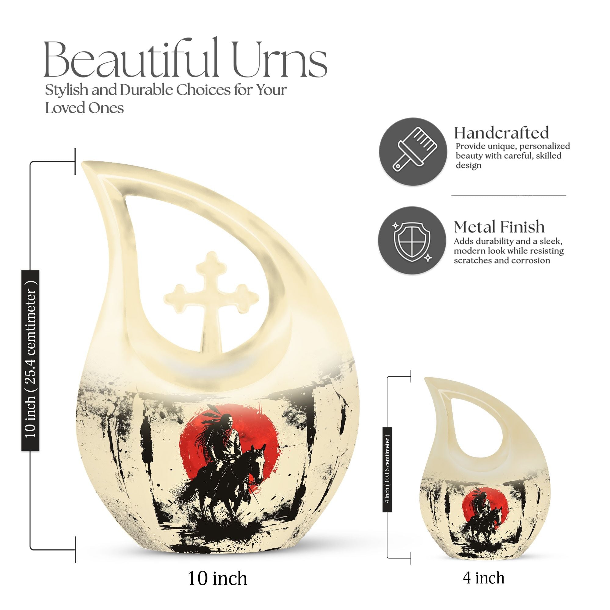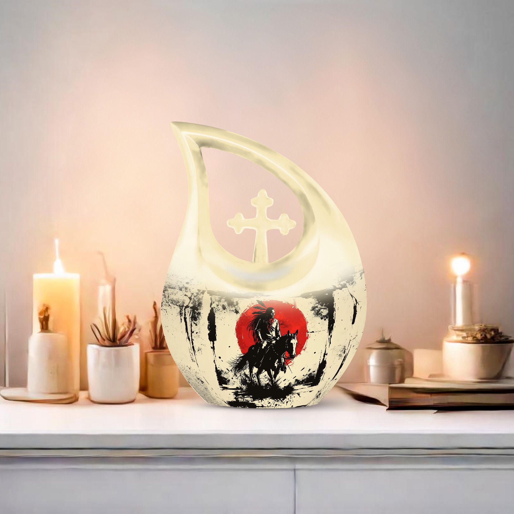 Honor the spirit and strength of your loved one with this Native American Horse Rider Cremation Urn, a meaningful tribute designed to offer peace and remembrance. Its powerful artwork makes it ideal for families seeking unique urns for human ashes or a beautifully detailed funeral ashes urn that reflects courage, heritage, and eternal connection.