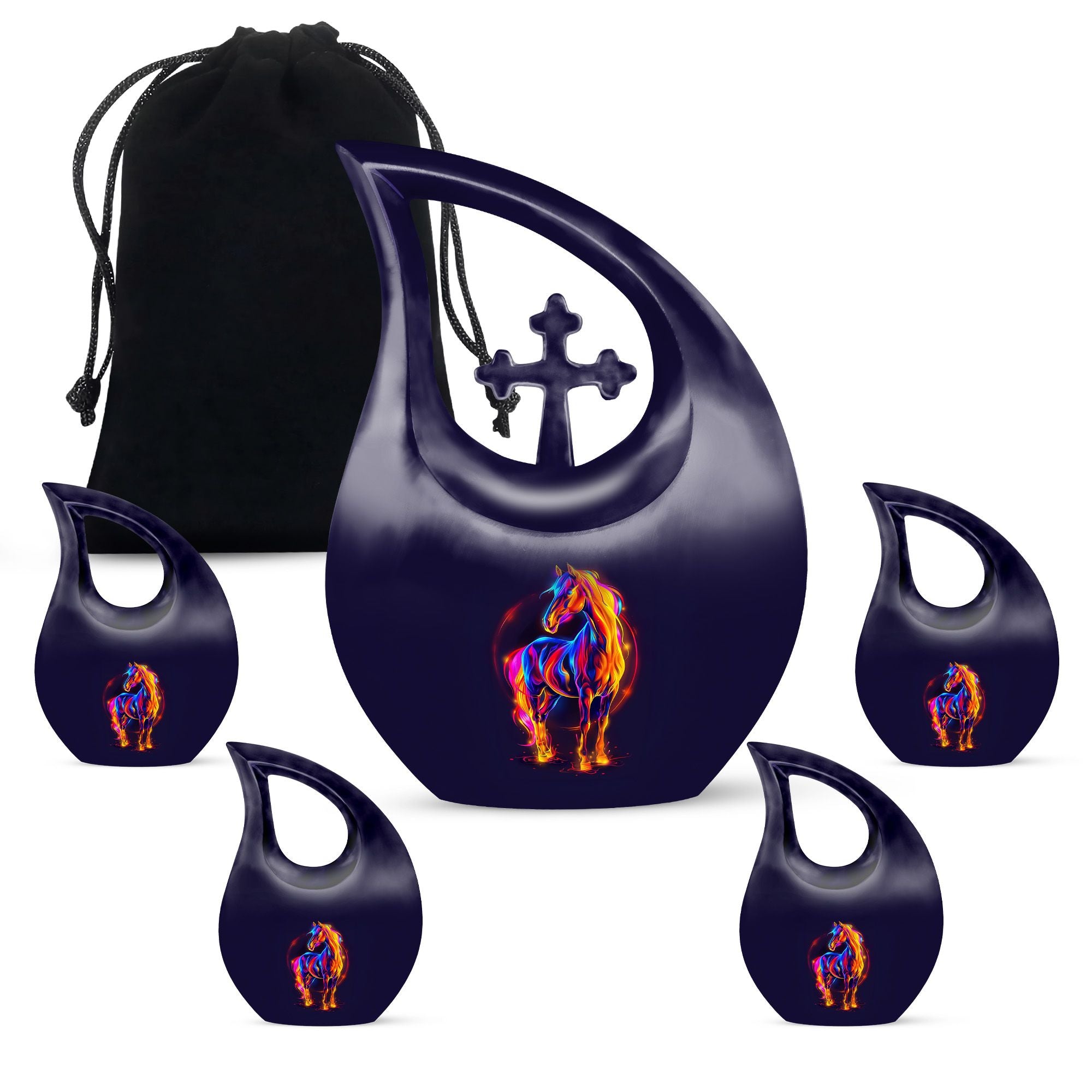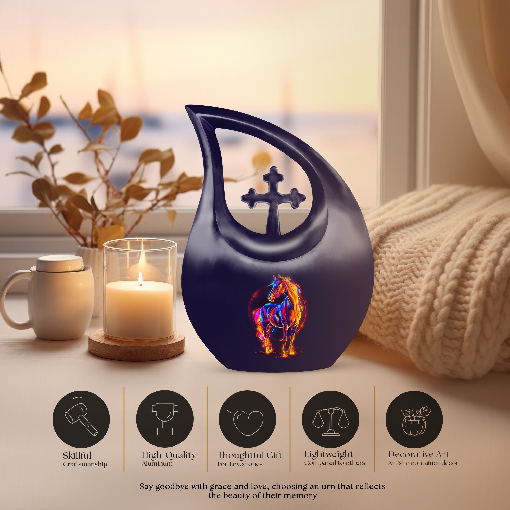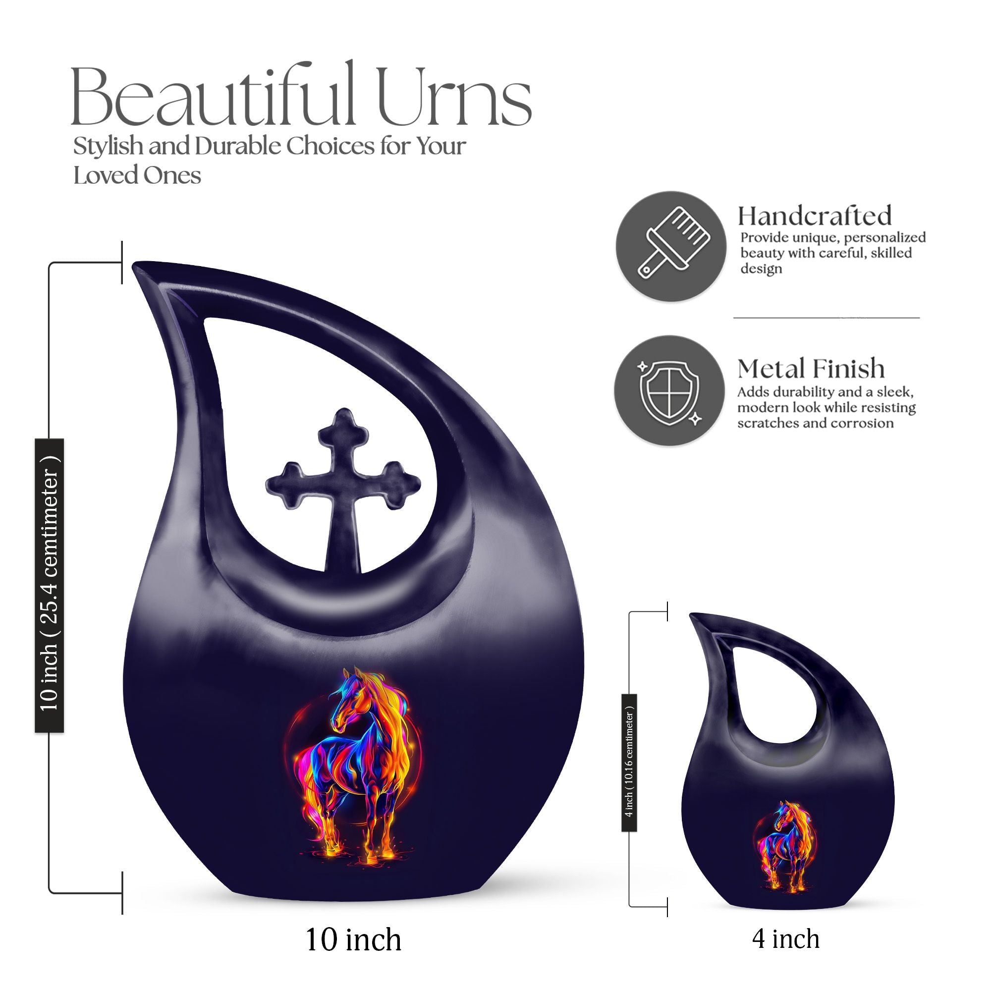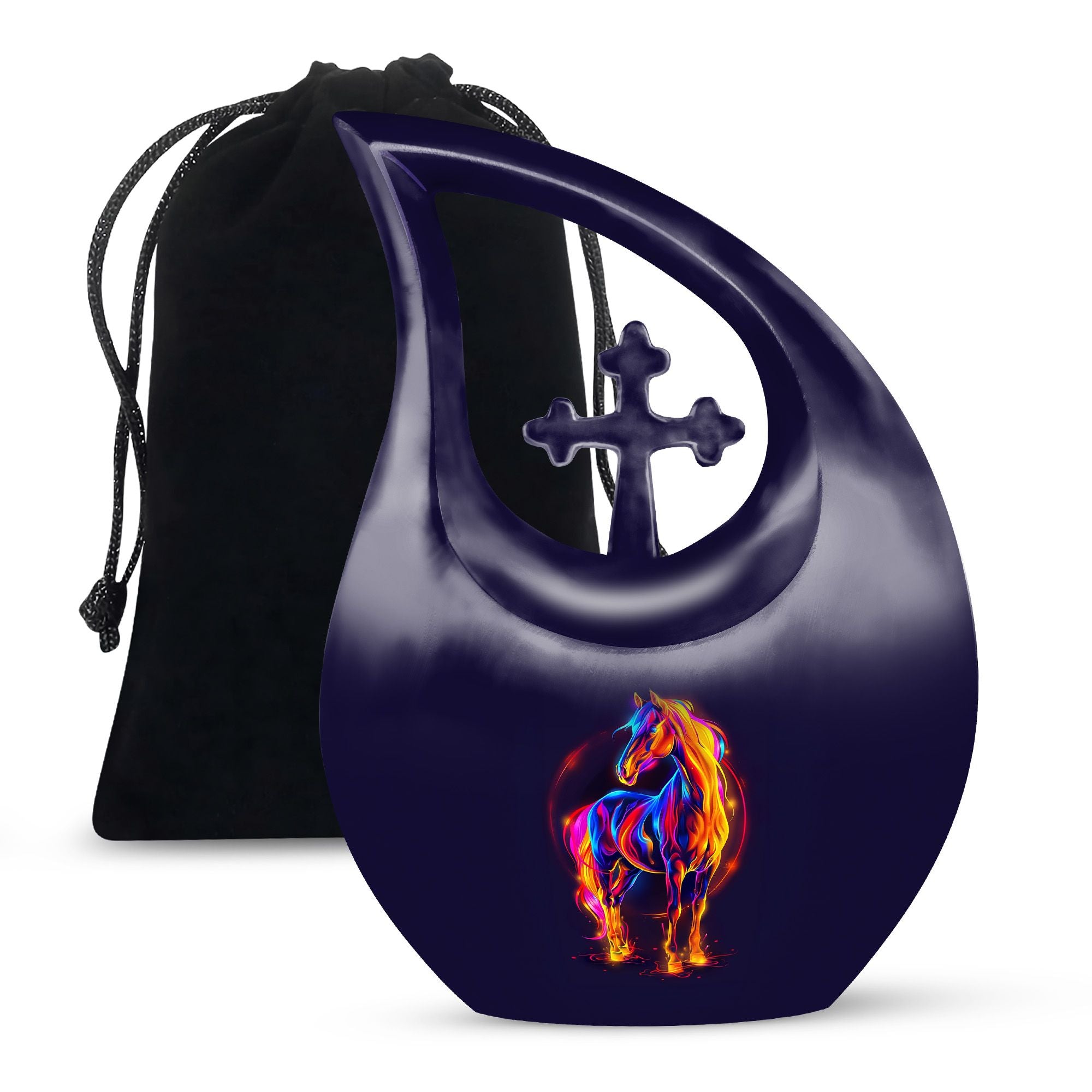Honor and cherish the memory of a departed loved one with this Large Horse Urn. Crafted from durable and high-quality aluminium, our memorial urn weighs a sturdy 3.3 pounds, stands at an impressive 10 inches in height, and has a capacity of 200 cubic inches. The urn features a unique 'Cross Drop' theme, deeply symbolic and a kind reminder of the enduring spirit of the departed. Included with the urn is a soft velvet pouch, providing a respectful and secure containment for the ashes. Personalize this Medium Size Urn with the engraved names of your loved one, ensuring their memories live on in a truly special way. This urn is more than just a keepsake, it's a testament of unending love and remembrance. It's not just another urn, it's a tribute to a life well-lived. Searching terms like 'Horse Urn', 'Medium Size Urns', 'Keepsake For Ashes For A Man', 'Customized Urns For Ashes For Adults', and 'Personal Urns' will lead you to this significant memorial piece.